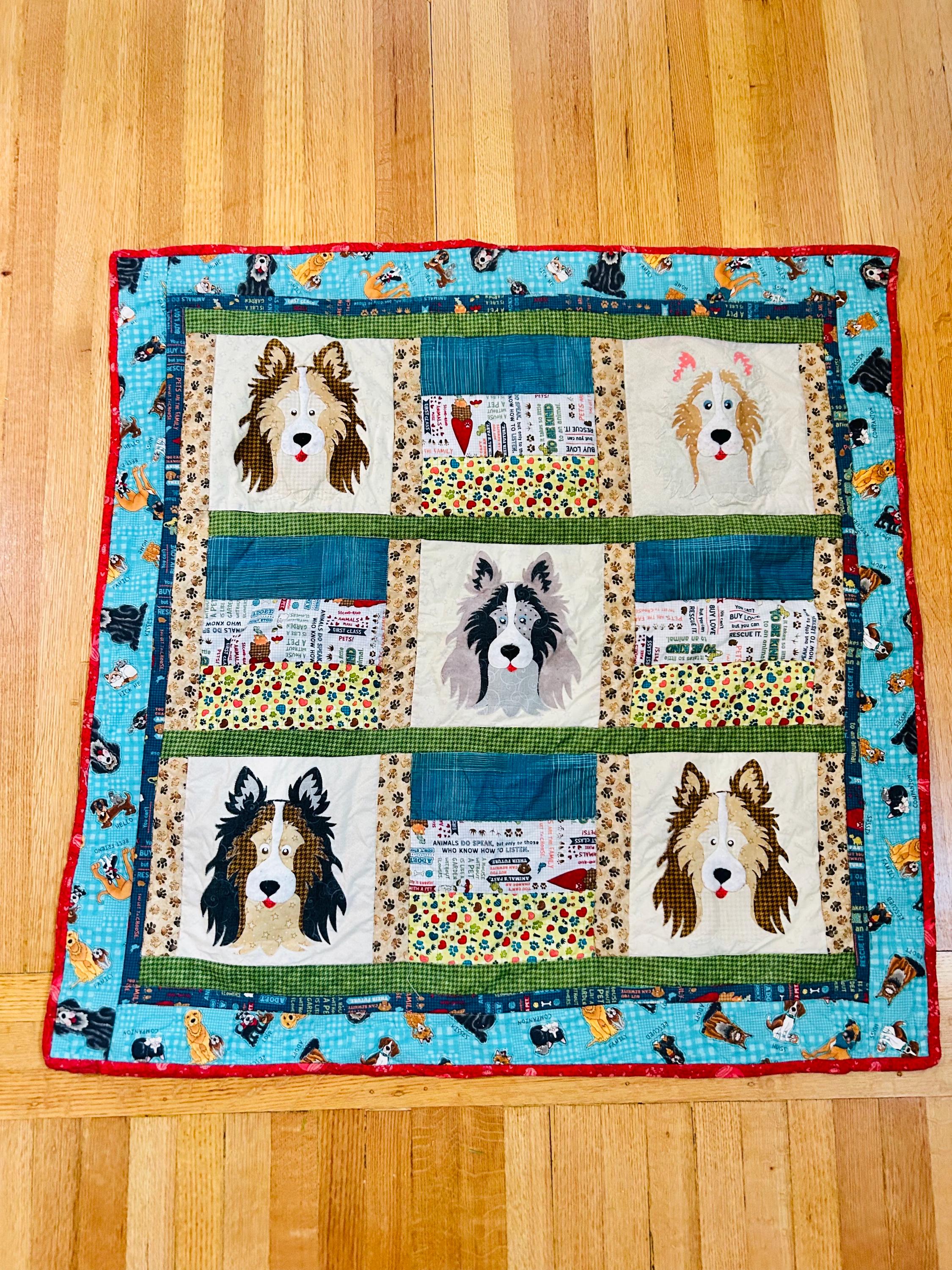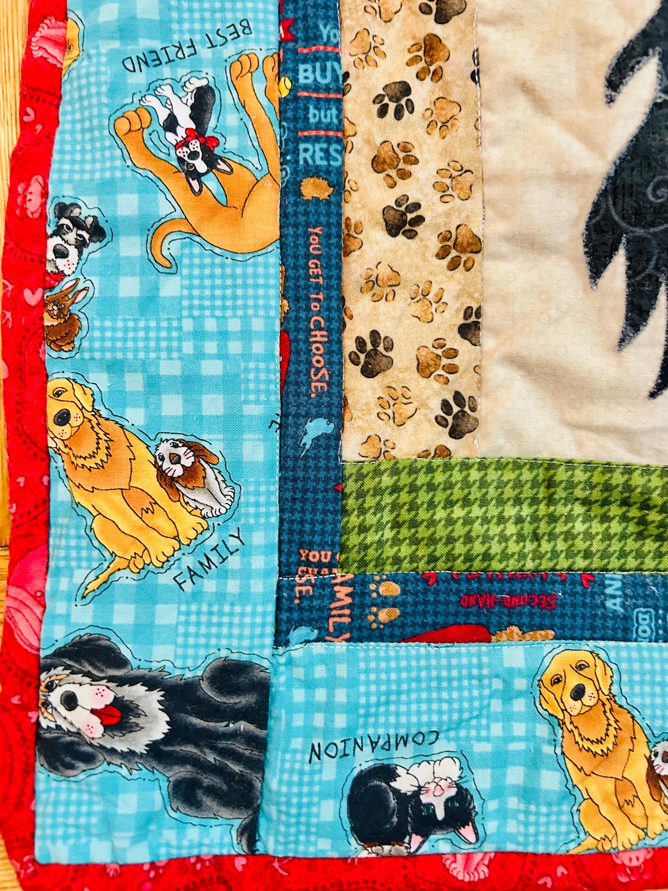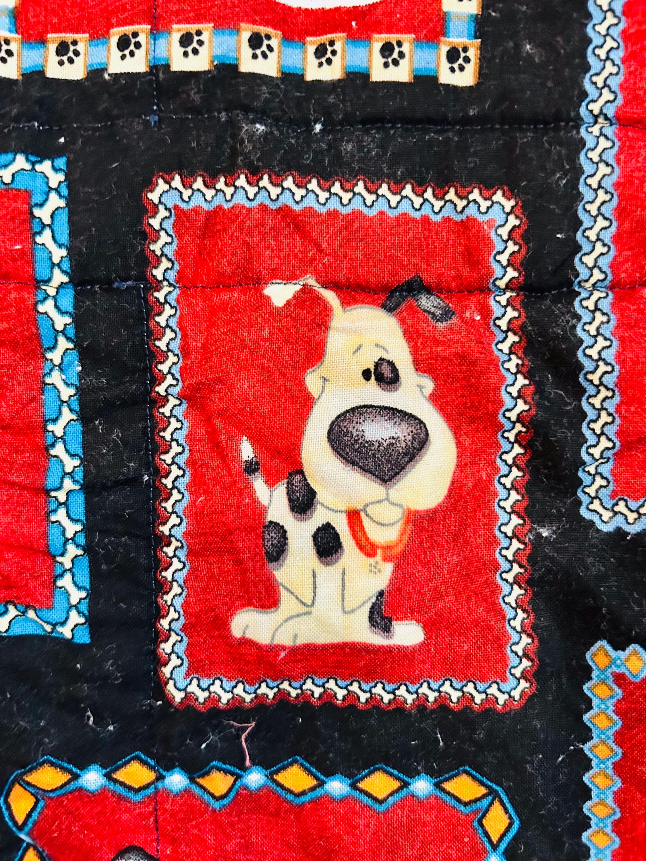 • Date: Early 2000s • Size: 39” x 39” • Materials: Cotton fabrics with appliqué details • Construction: Machine pieced and quilted • Colors: Red, black, turquoise, green, cream, multicolor novelty prints • Binding: Red binding • Backing: Coordinating dog novelty print