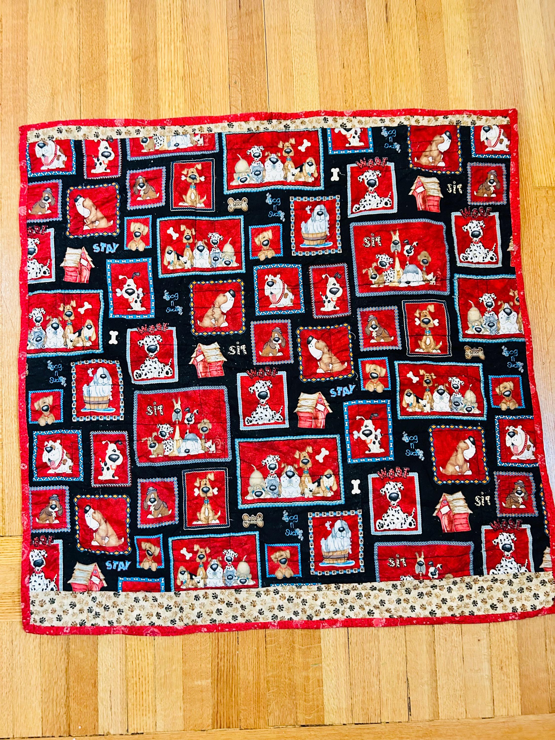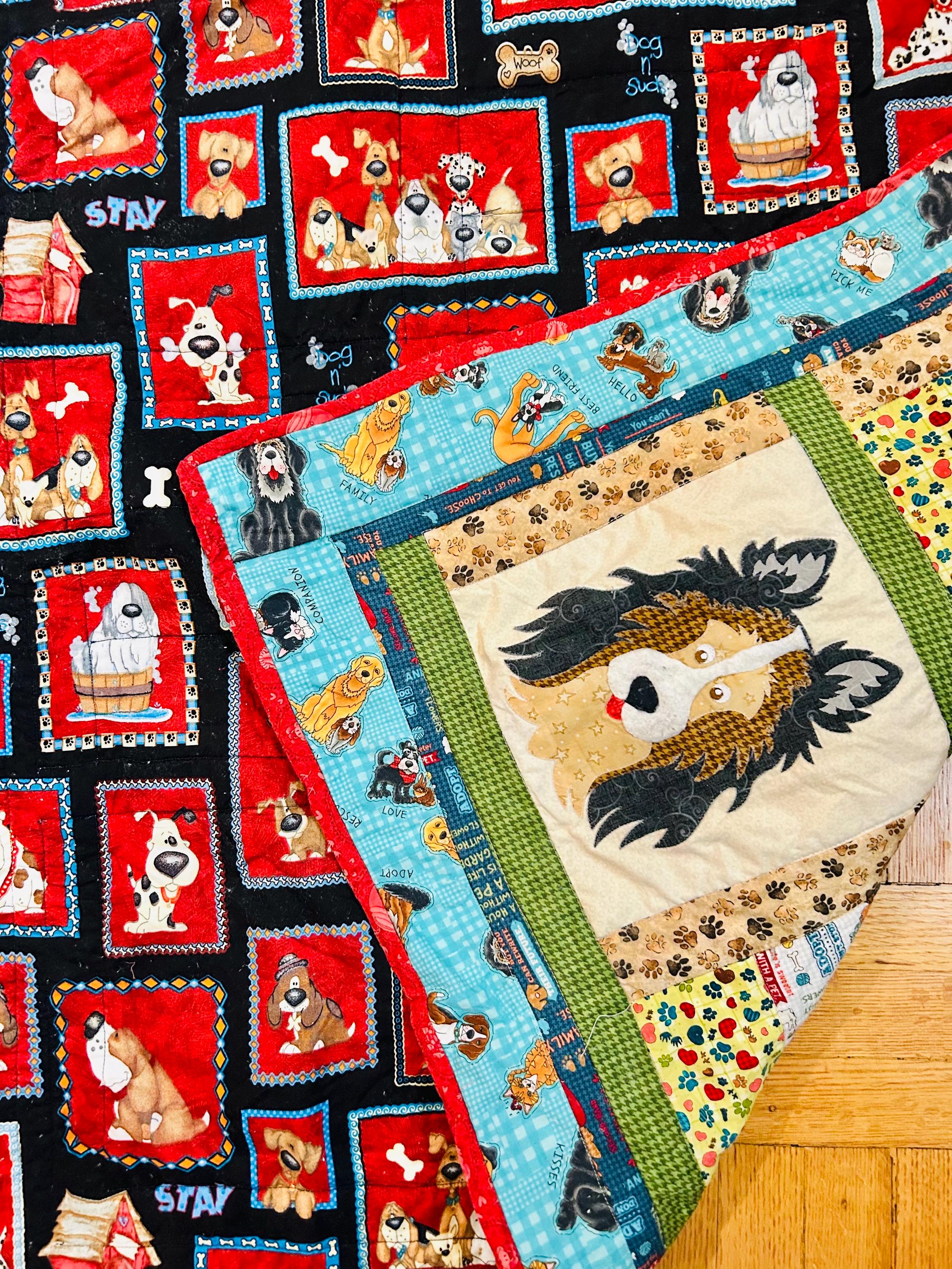 The back is a lively dog print framed in red binding, while the batting is very lightweight.