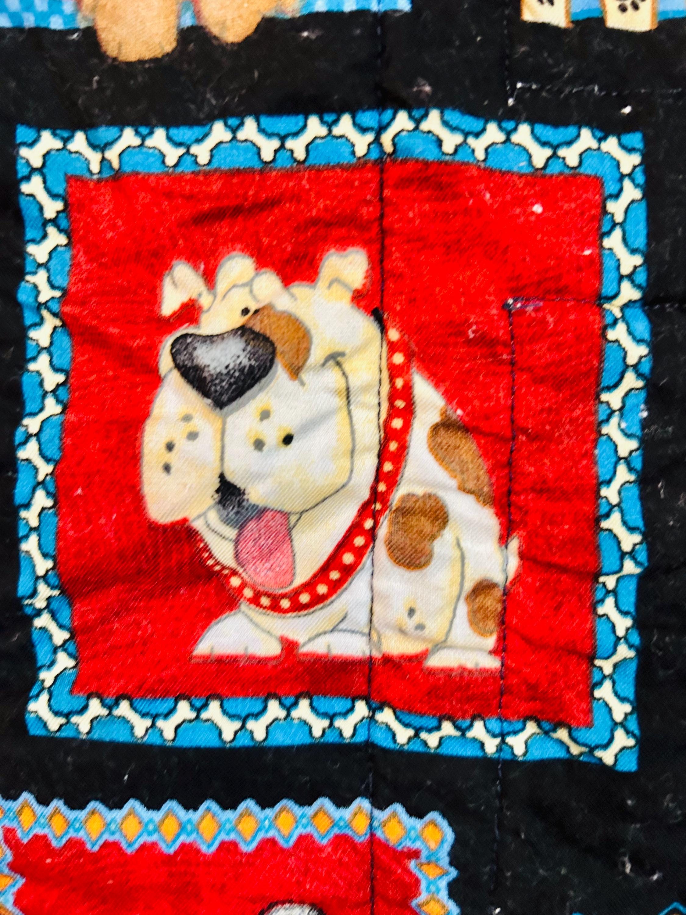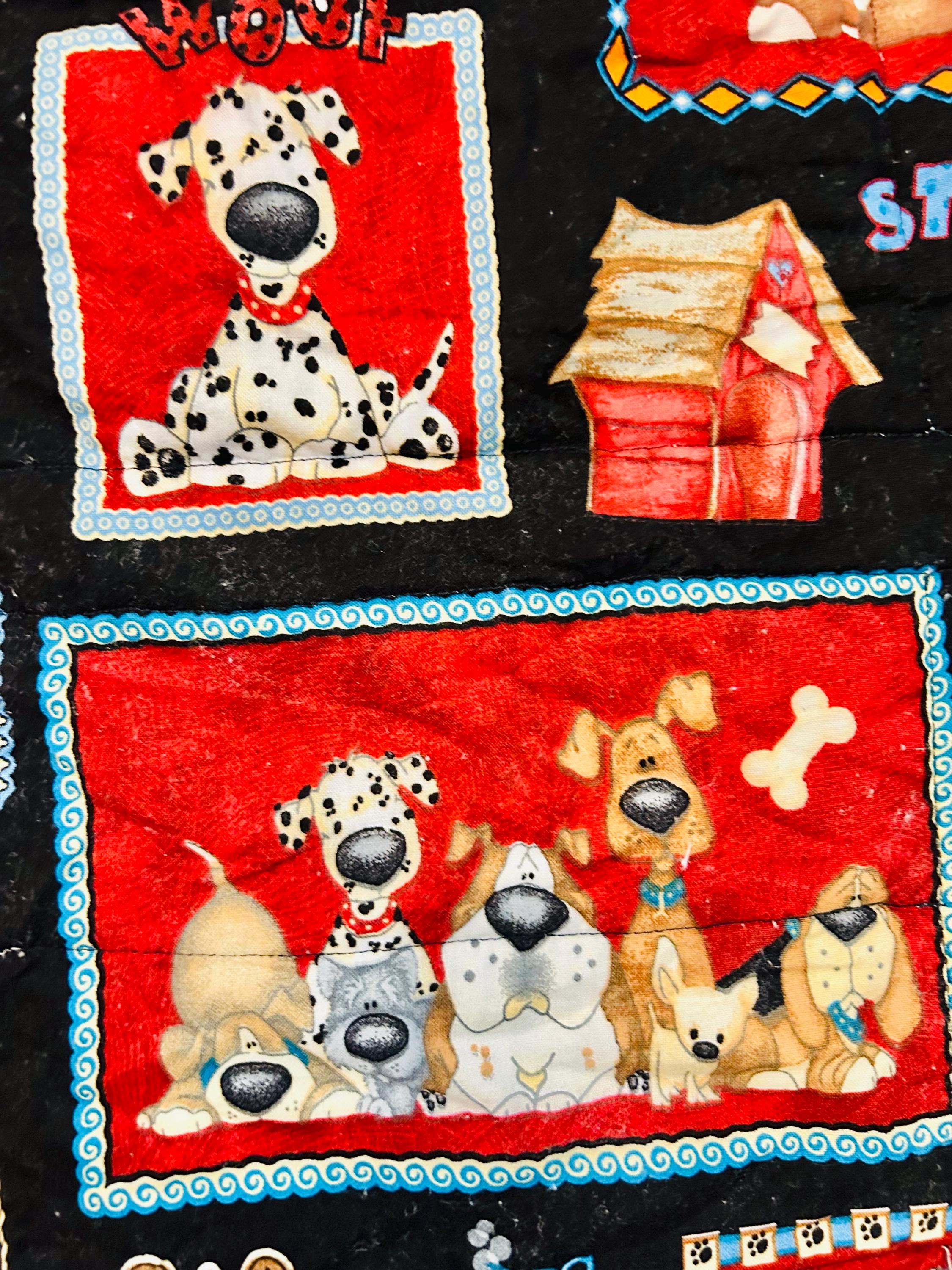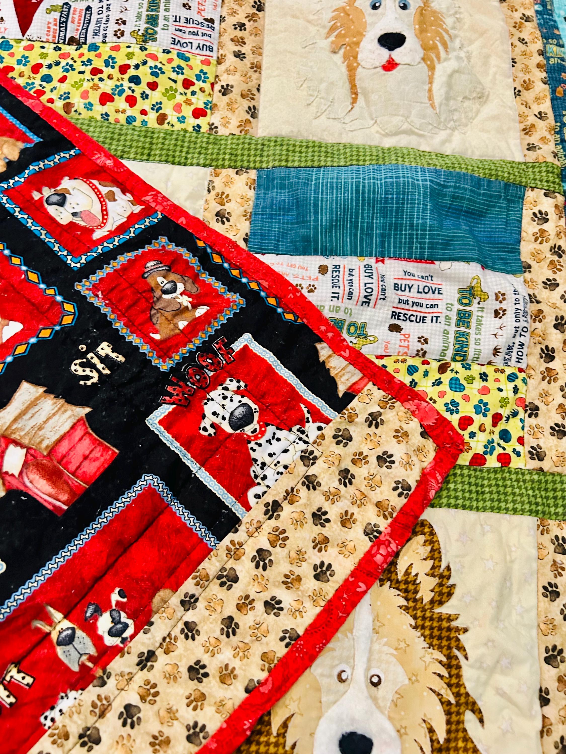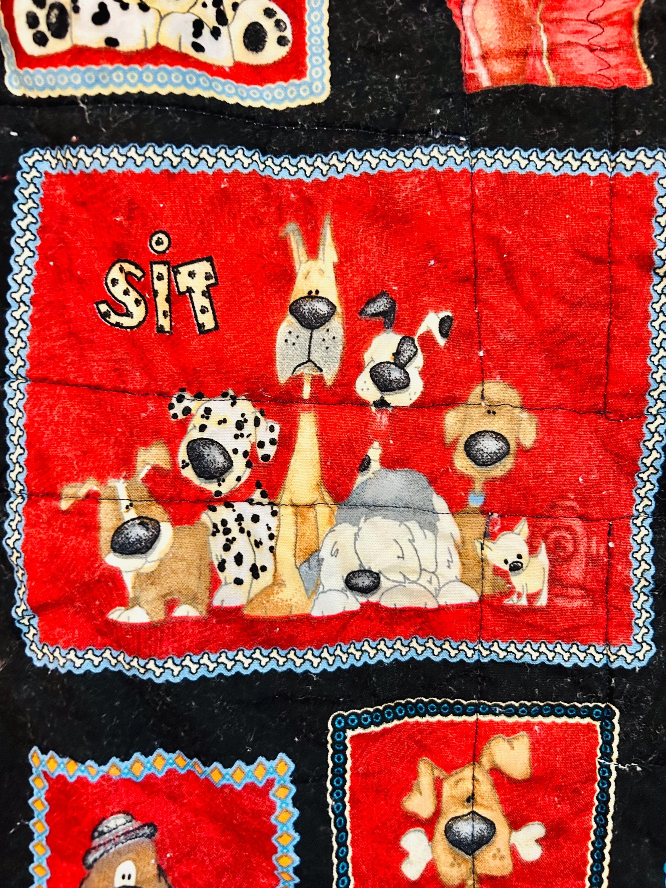 This delightful early 2000s dog-themed quilt features charming appliqué dog portraits with expressive faces and dimensional details, surrounded by coordinating novelty prints of cartoon dogs, paw prints, hearts, and playful phrases like “Sit,” “Woof,” and “Stay" along with Pet Rescue blocks. It has been sewing machine quilted in outlines of the blocks.