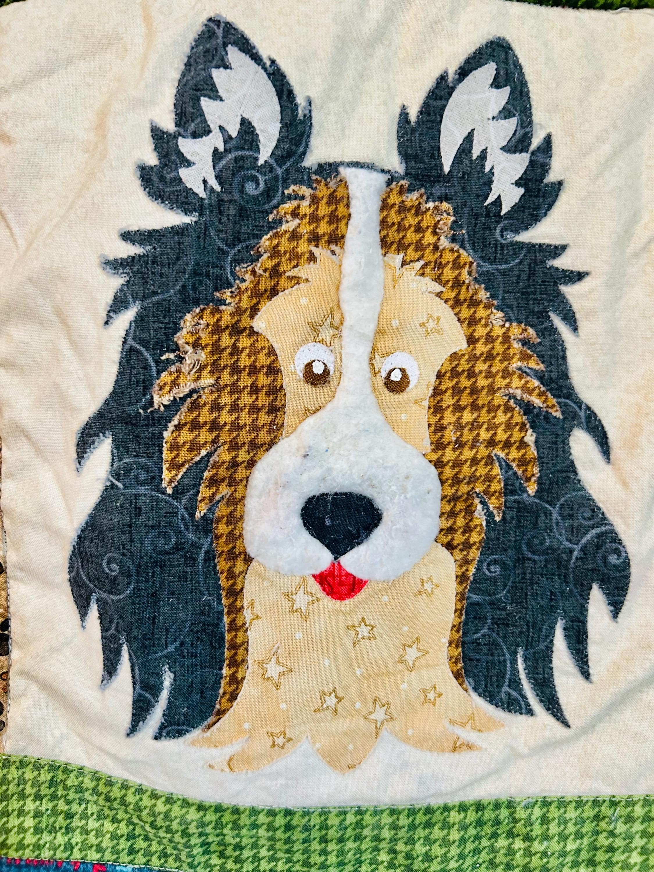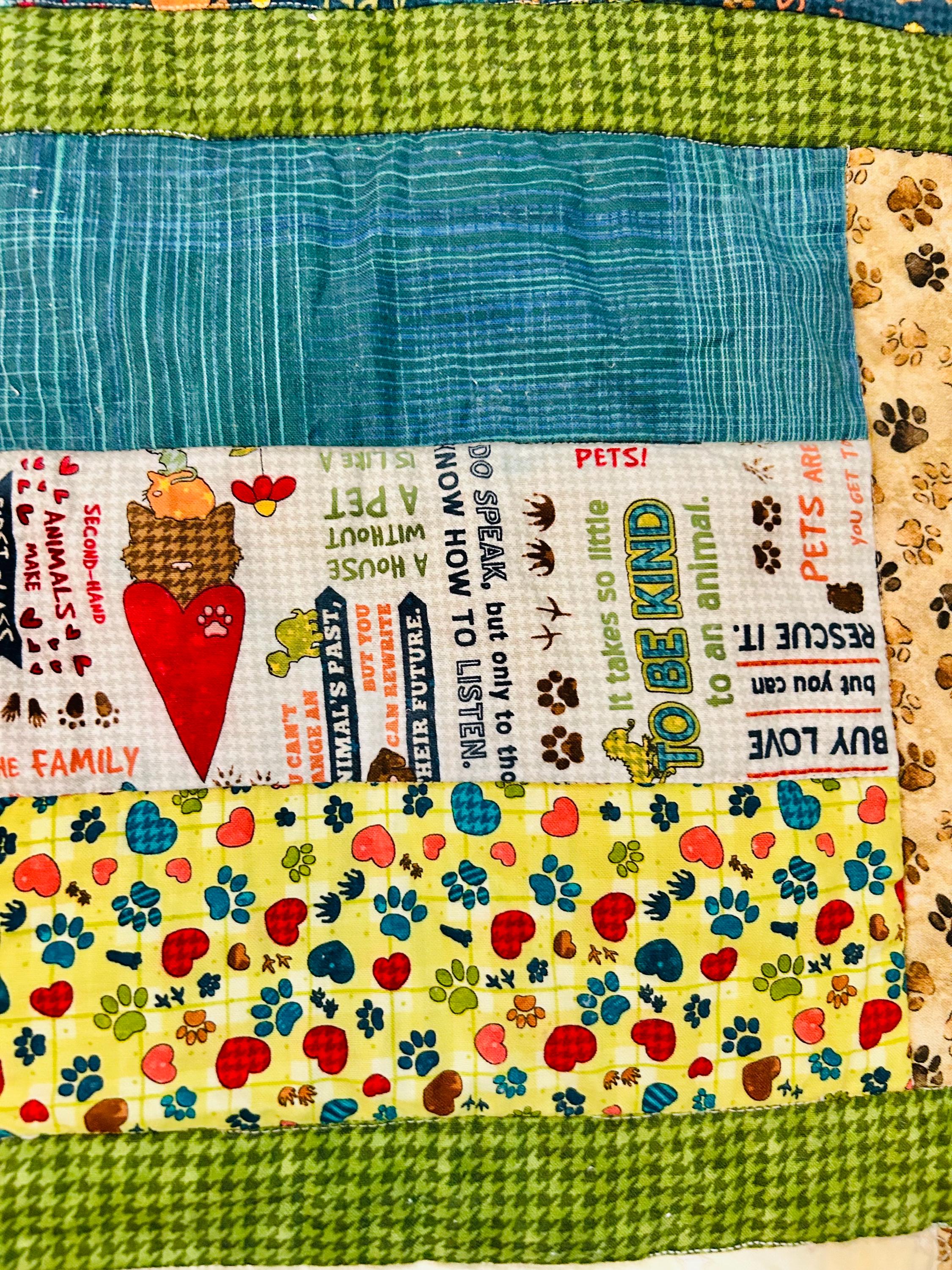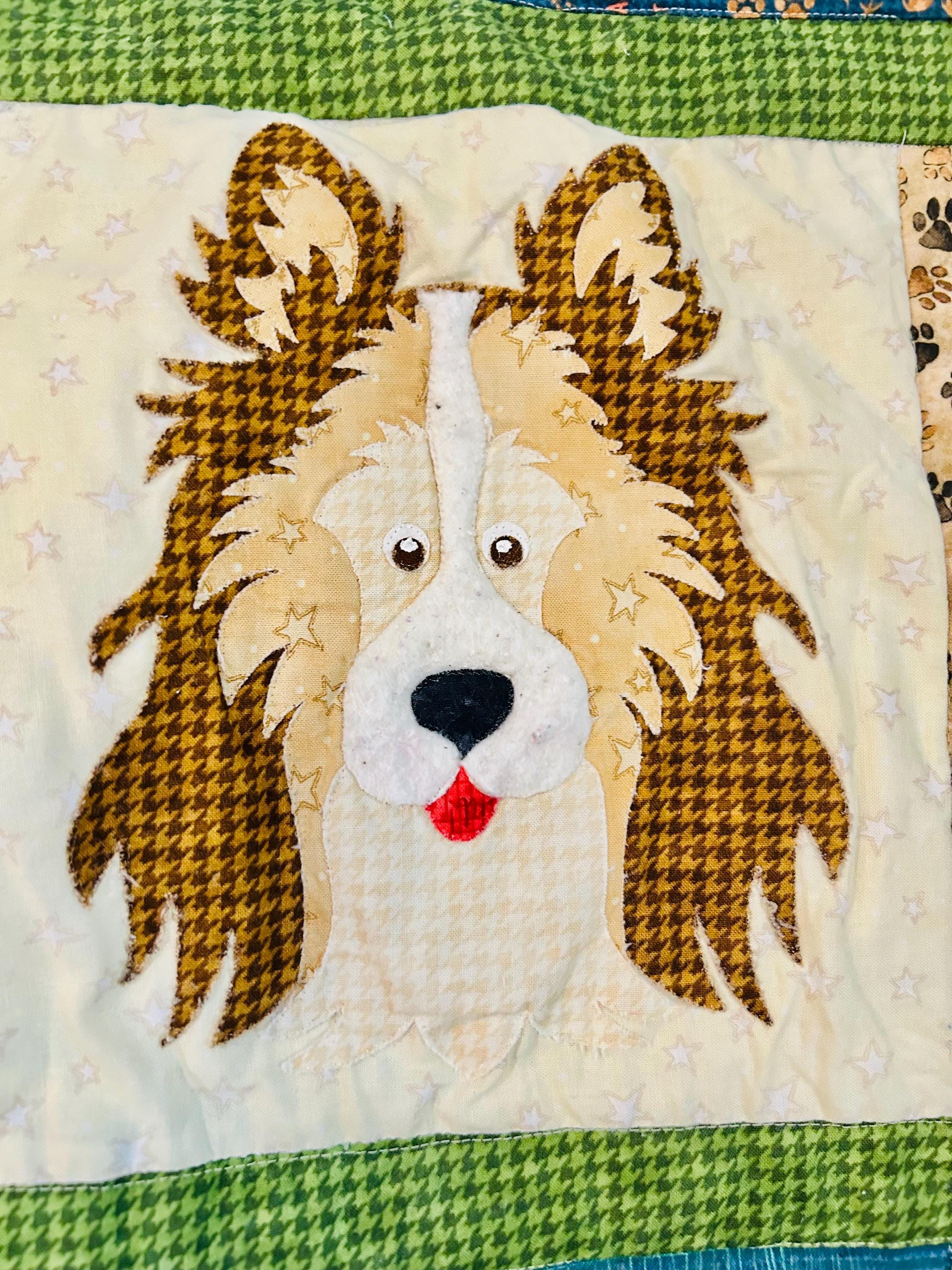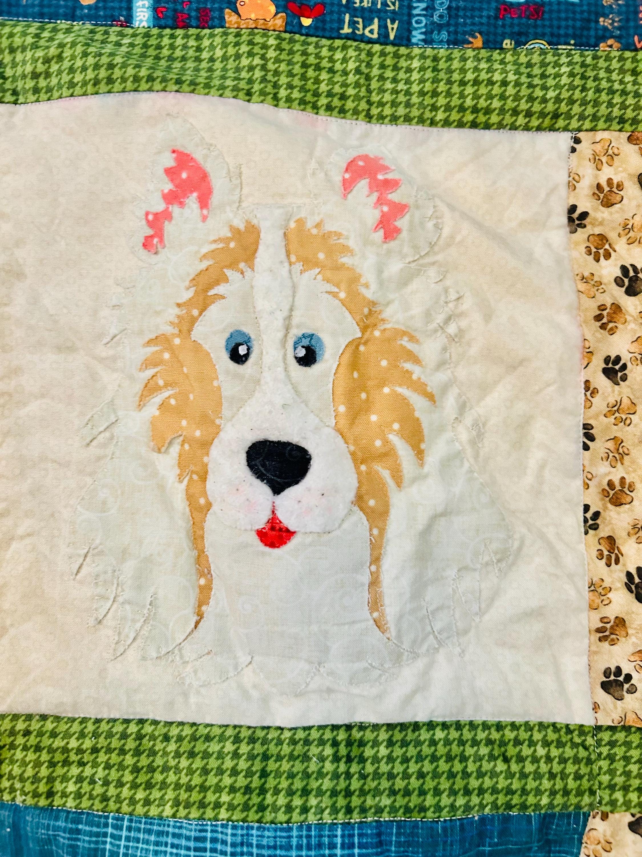 This delightful early 2000s dog-themed quilt features charming appliqué dog portraits with expressive faces and dimensional details, surrounded by coordinating novelty prints of cartoon dogs, paw prints, hearts, and playful phrases like “Sit,” “Woof,” and “Stay" along with Pet Rescue blocks. It has been sewing machine quilted in outlines of the blocks.