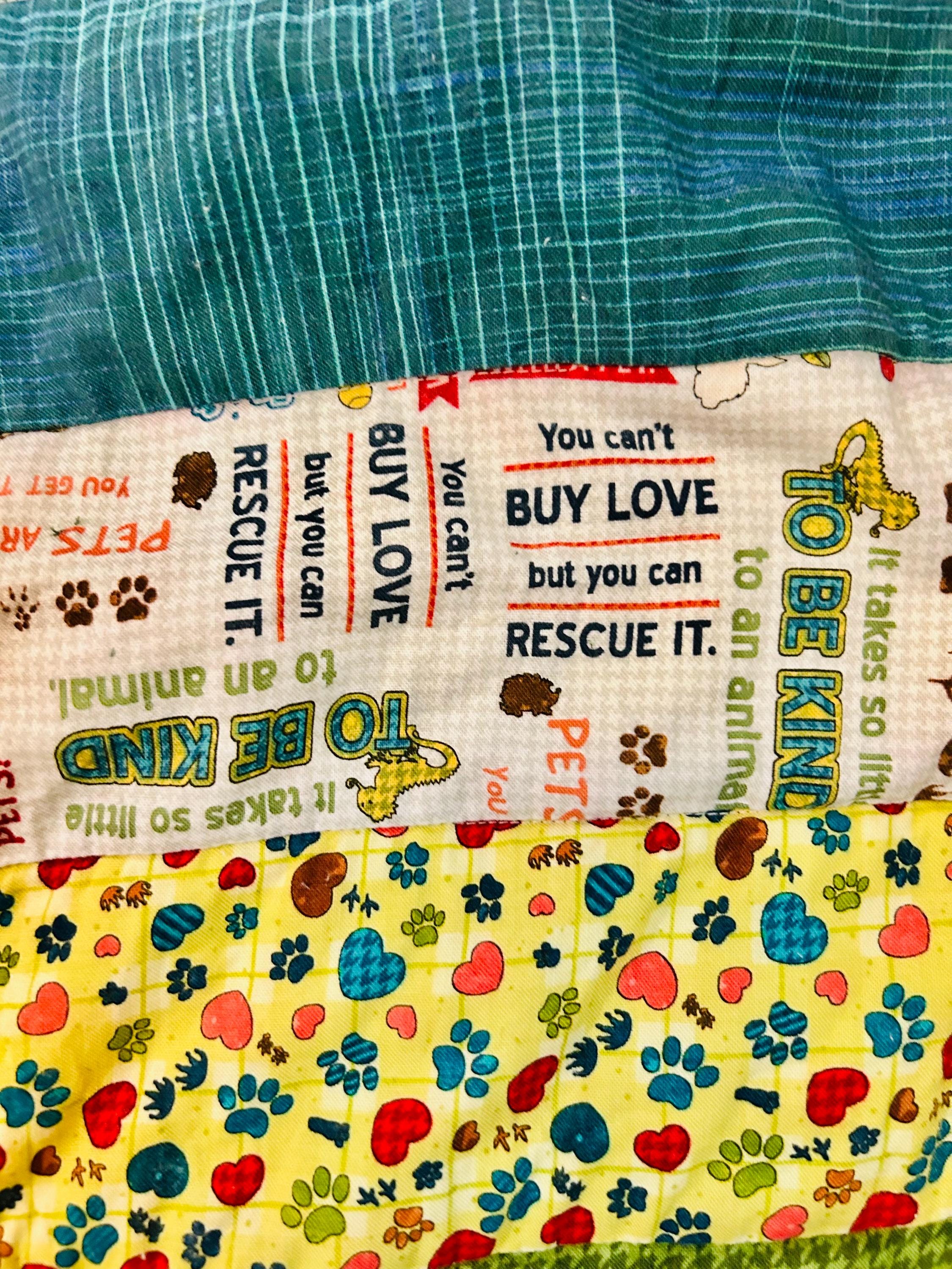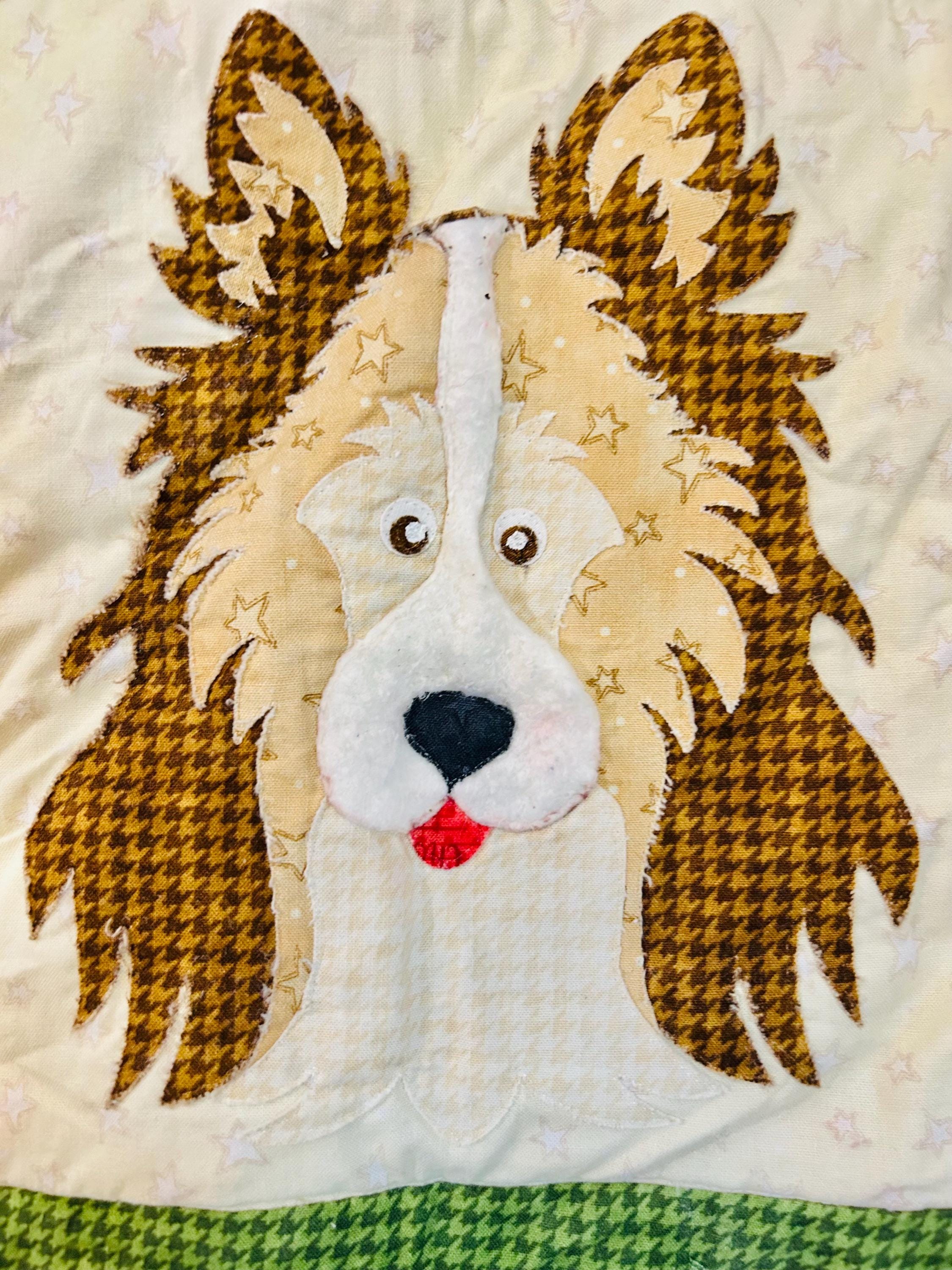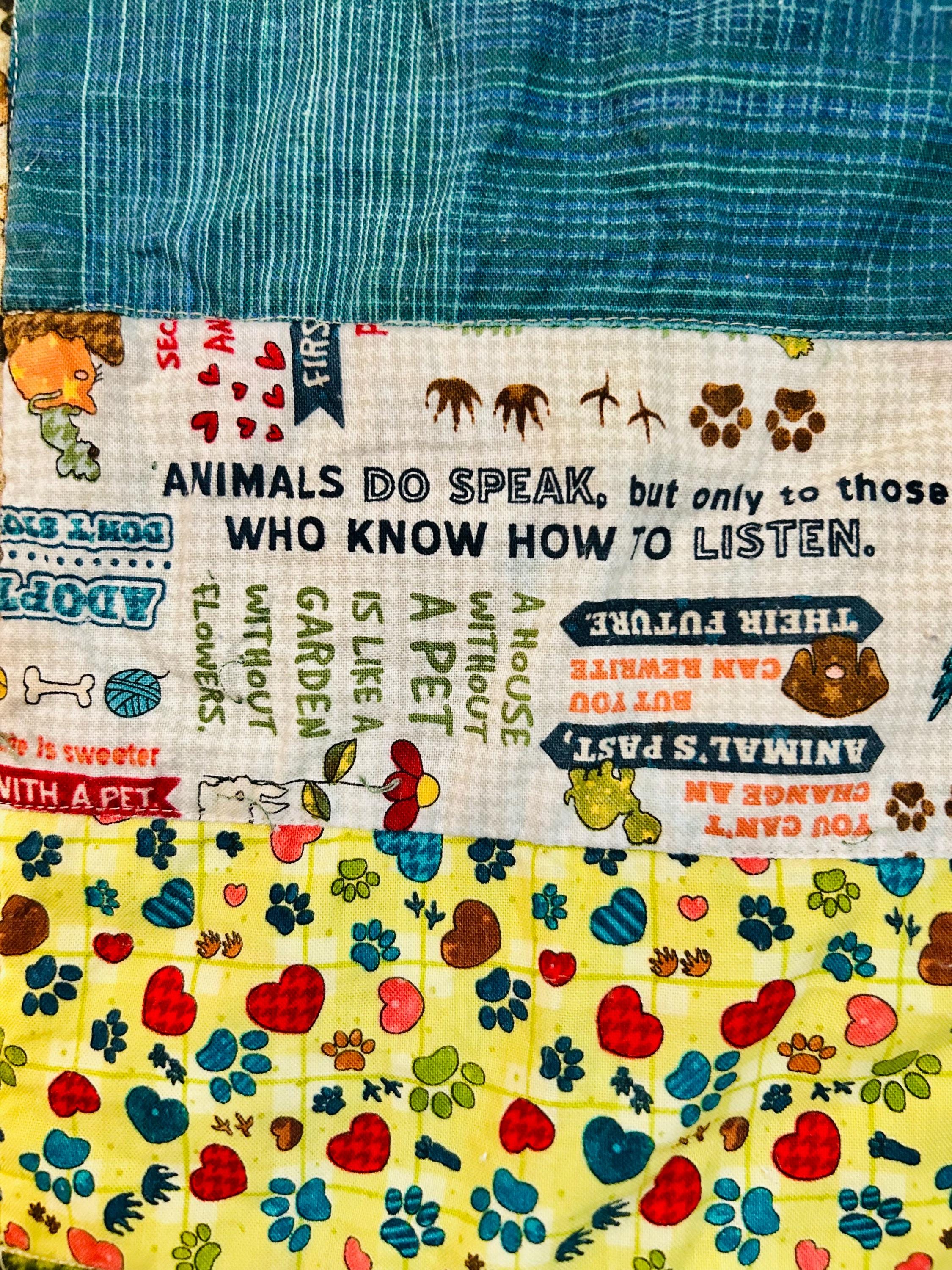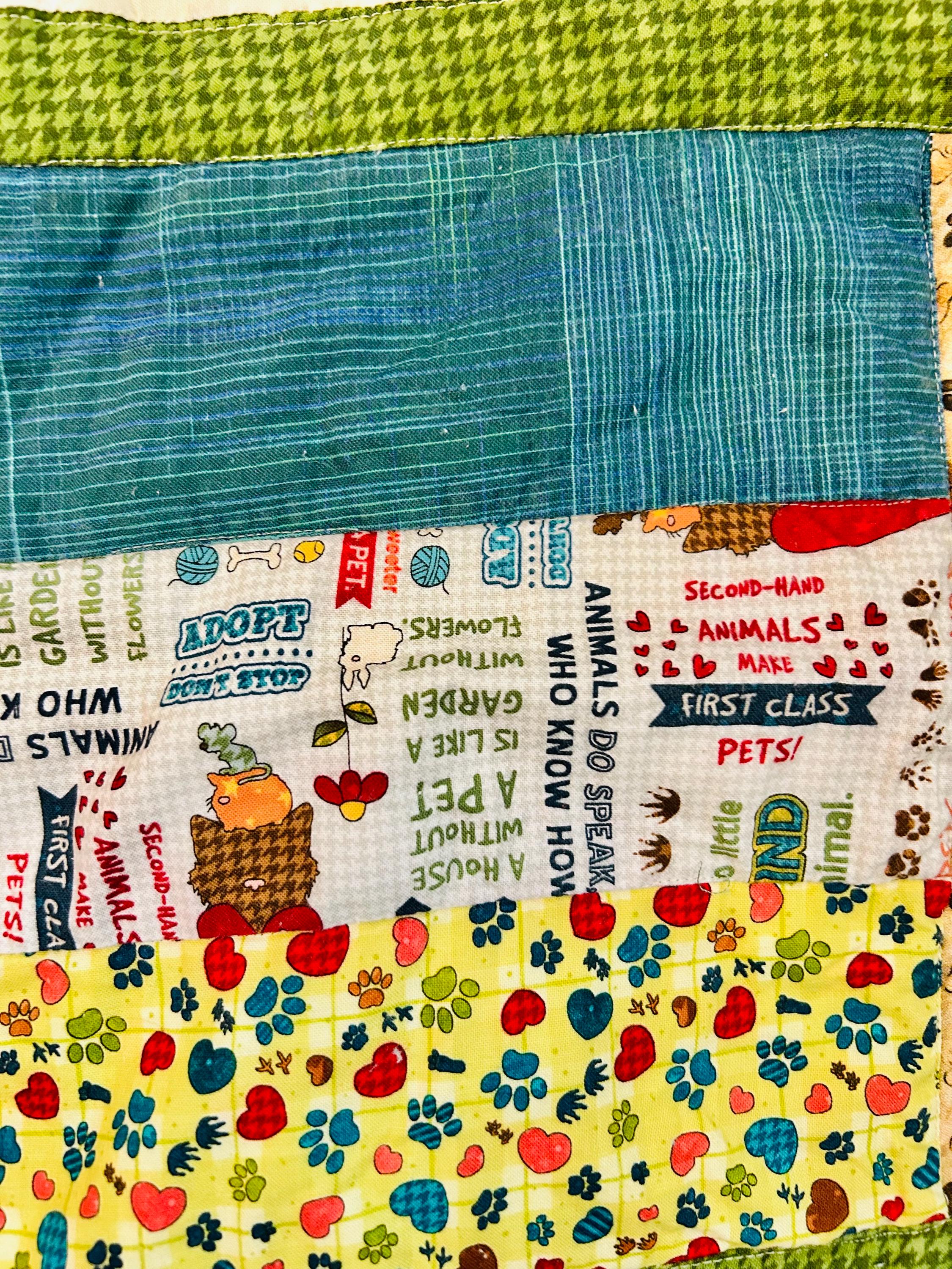 This delightful early 2000s dog-themed quilt features charming appliqué dog portraits with expressive faces and dimensional details, surrounded by coordinating novelty prints of cartoon dogs, paw prints, hearts, and playful phrases like “Sit,” “Woof,” and “Stay" along with Pet Rescue blocks. It has been sewing machine quilted in outlines of the blocks.