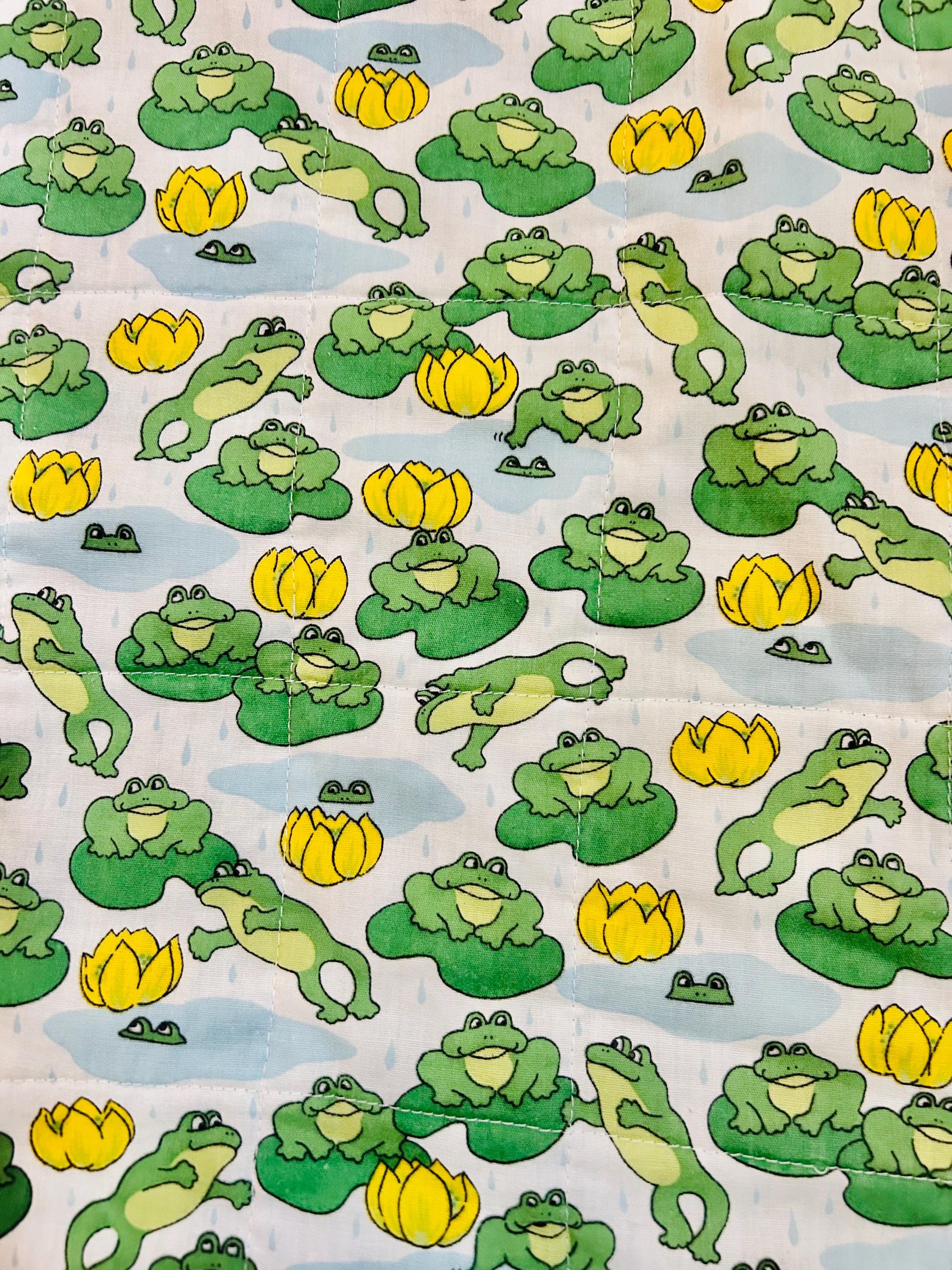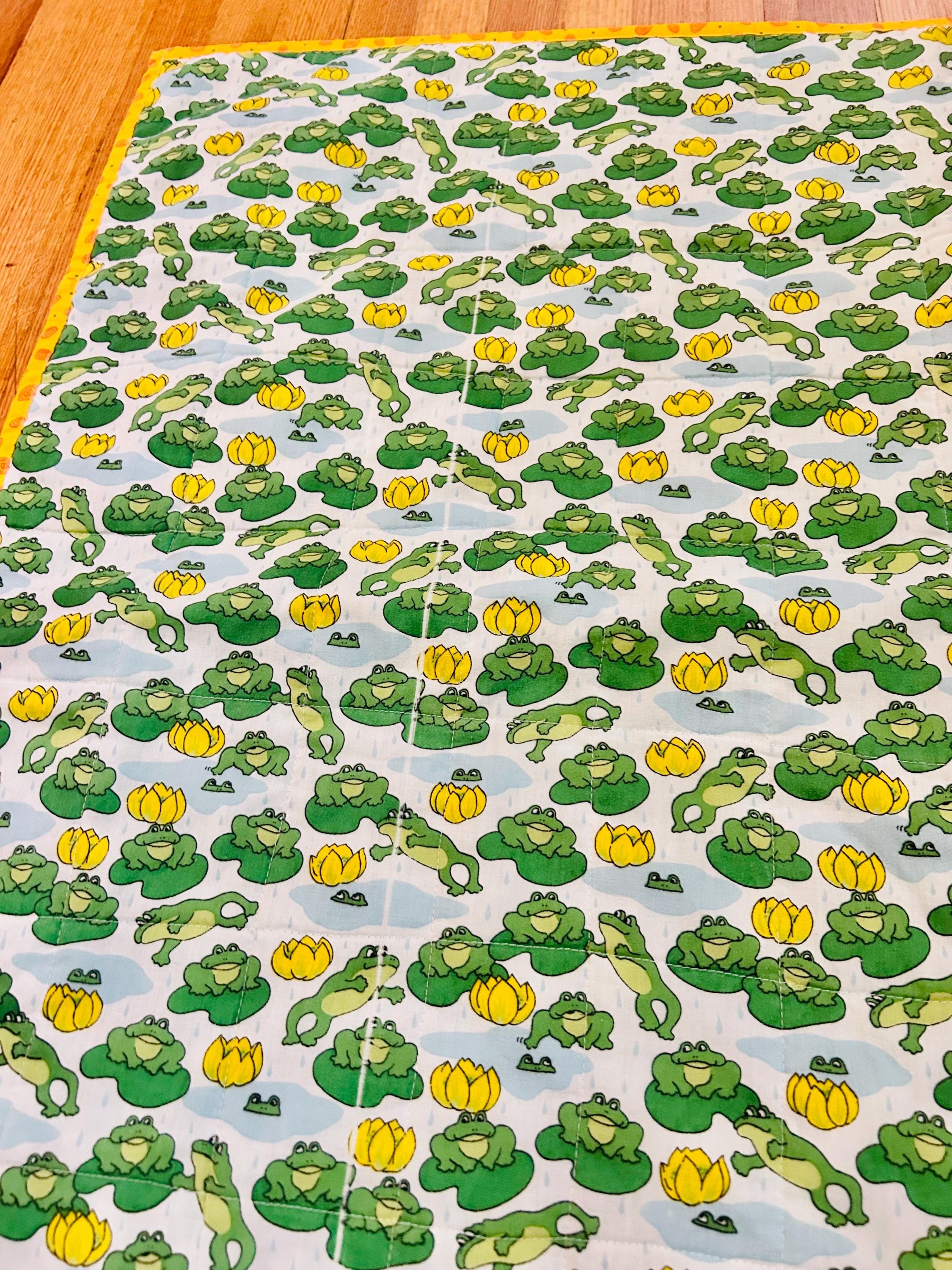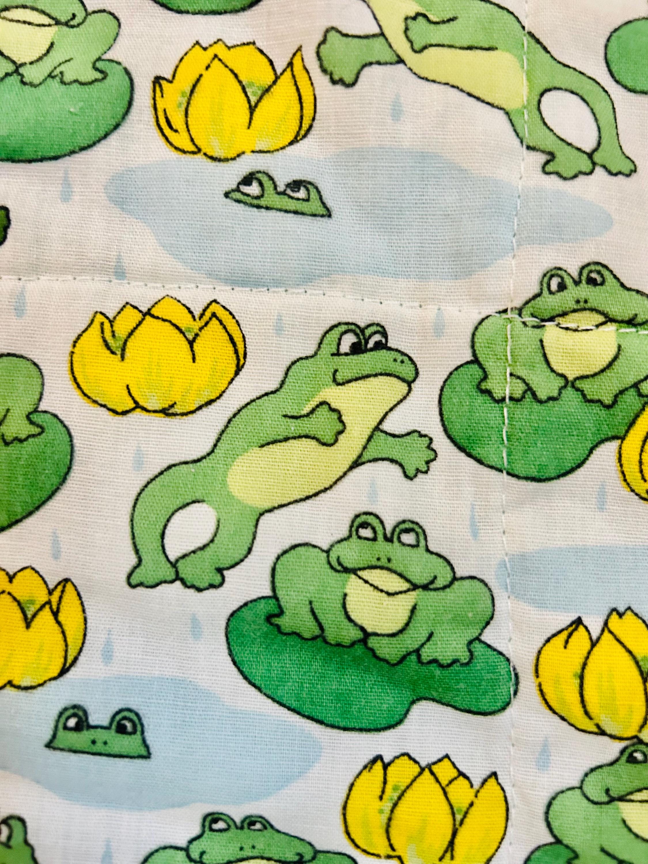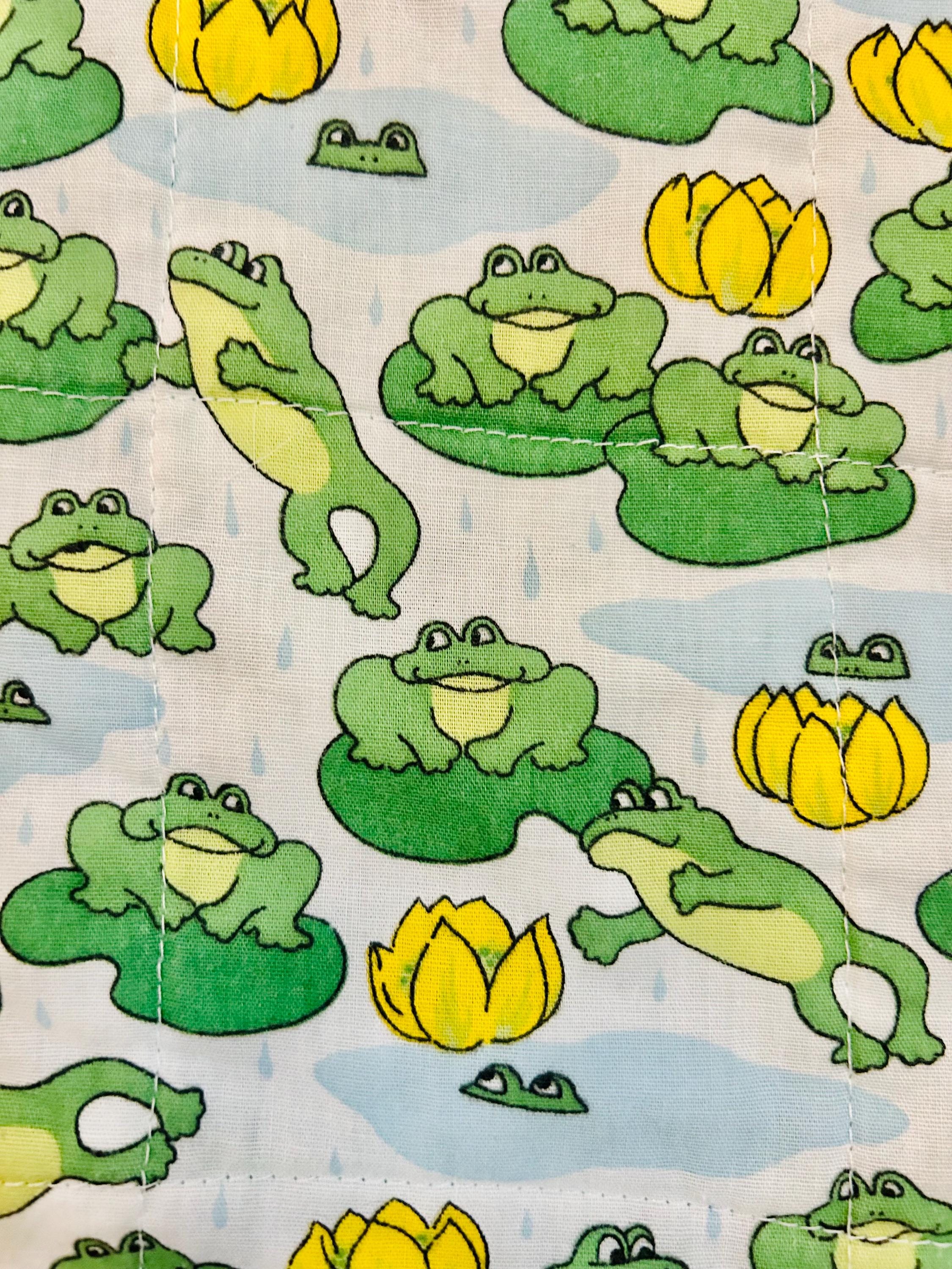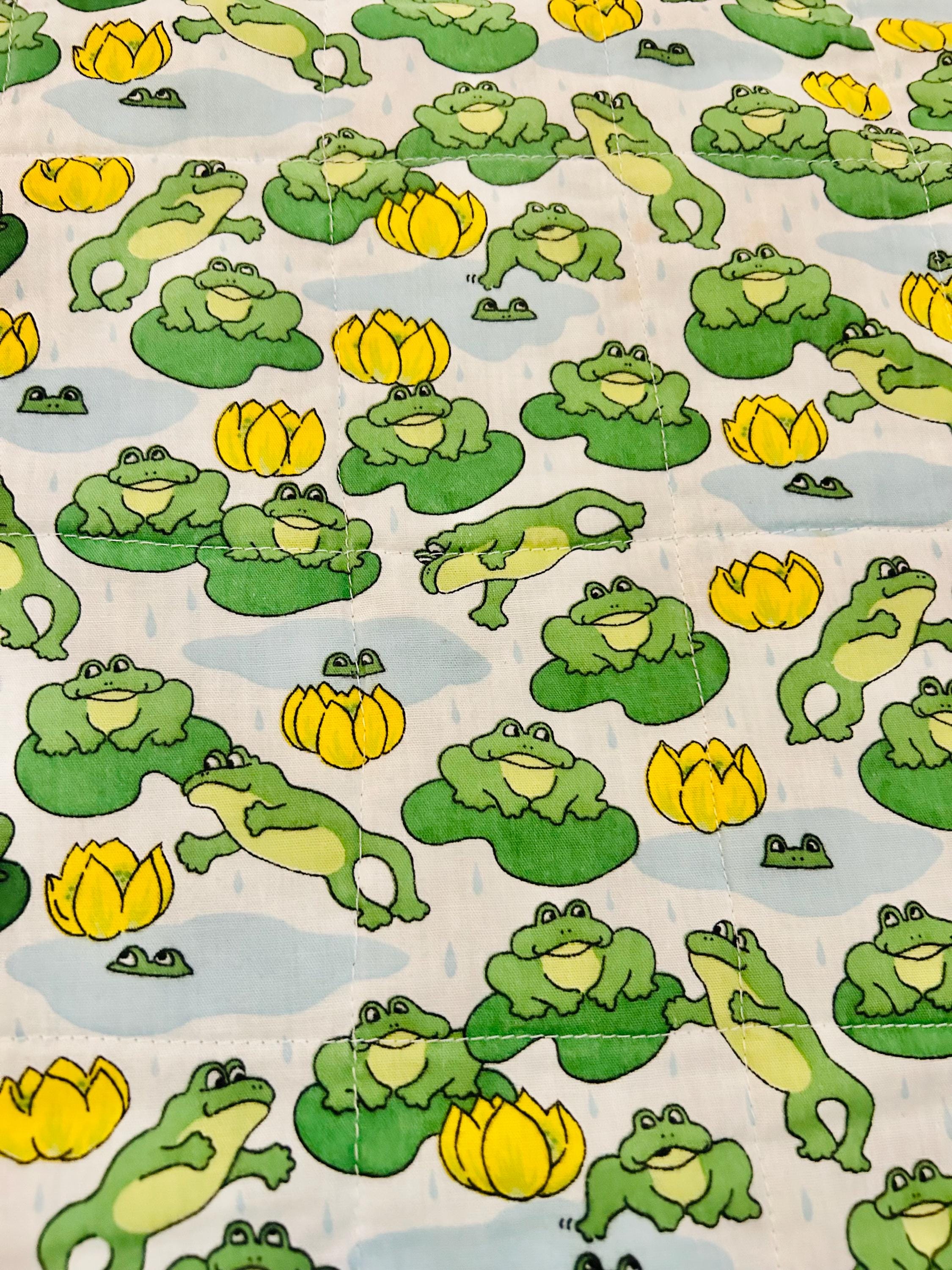 This cheerful vintage frog quilt is full of personality and playful charm! Measuring approximately 42” x 42”, the front features an adorable novelty print of bright green frogs lounging and leaping among lily pads and sunny yellow water lilies, all set against a soft blue “pond” background with gentle raindrops. The vibrant yellow binding with subtle spiral detail frames the quilt beautifully and adds a joyful pop of color.