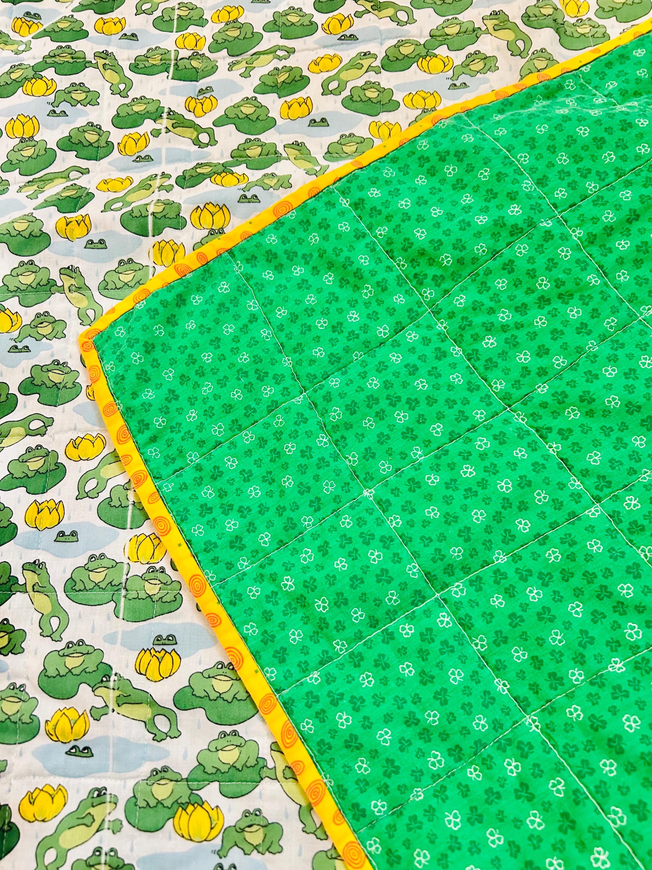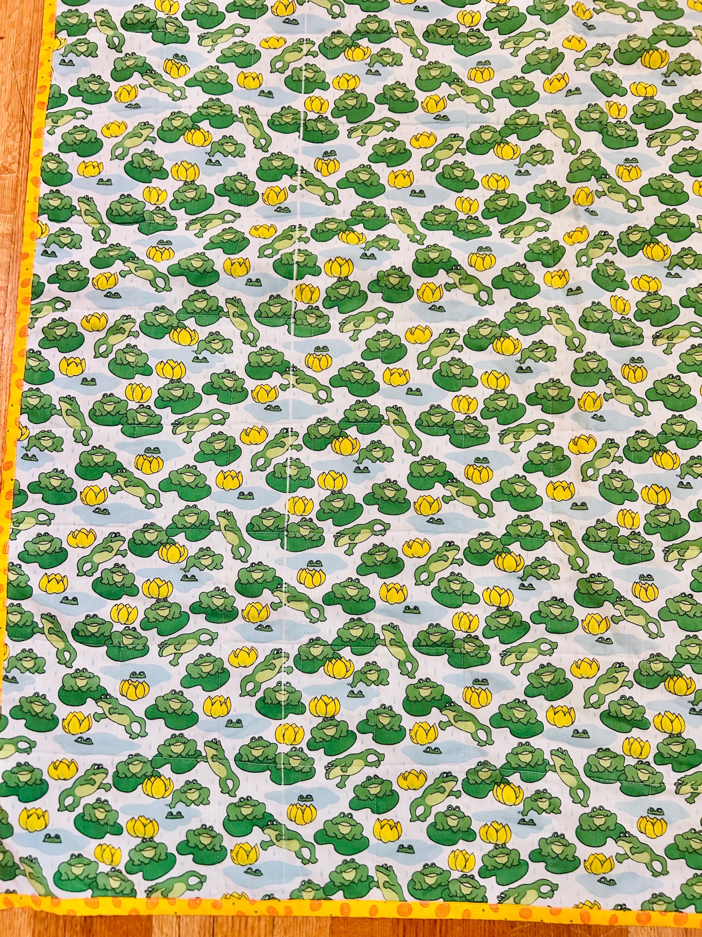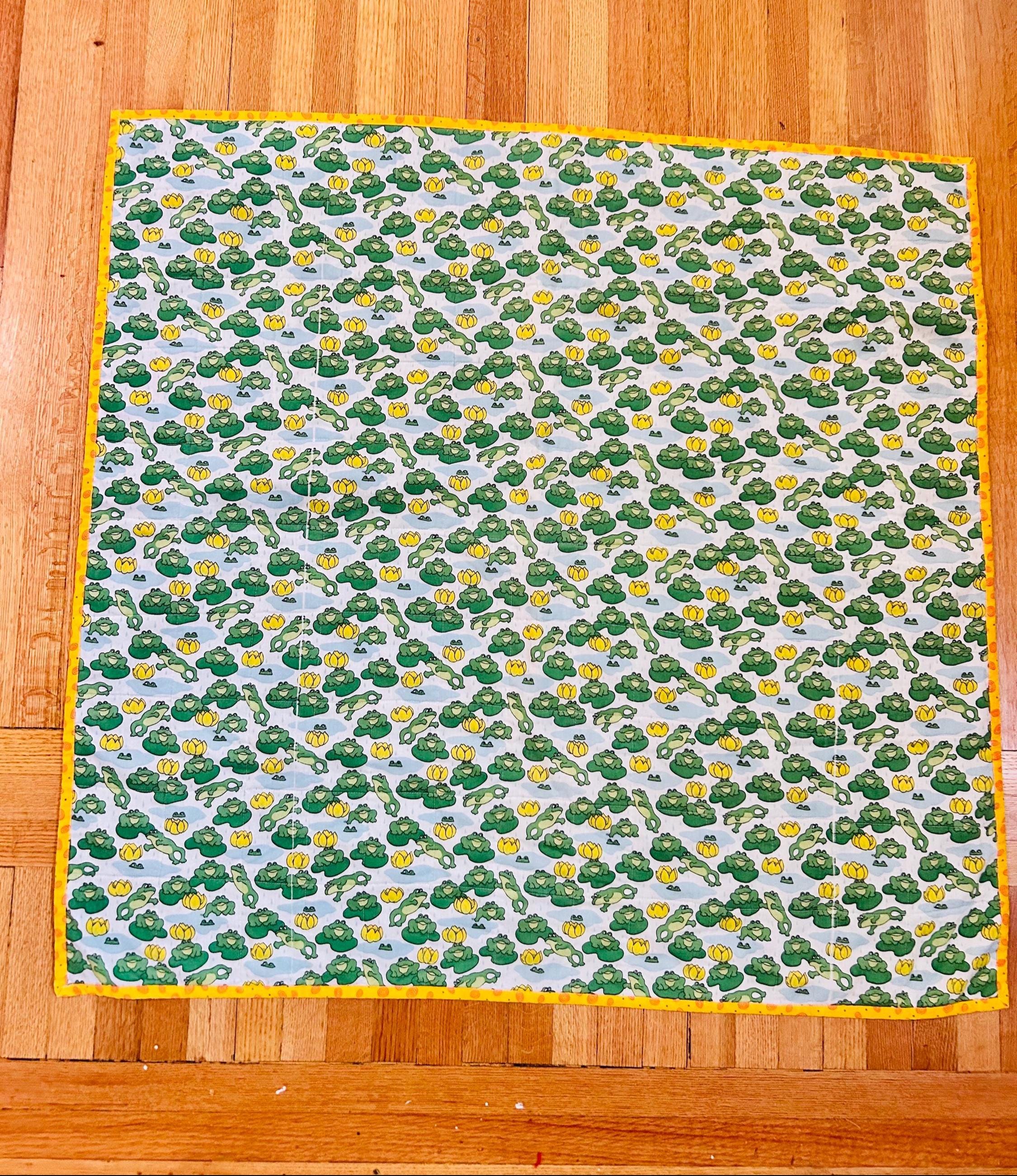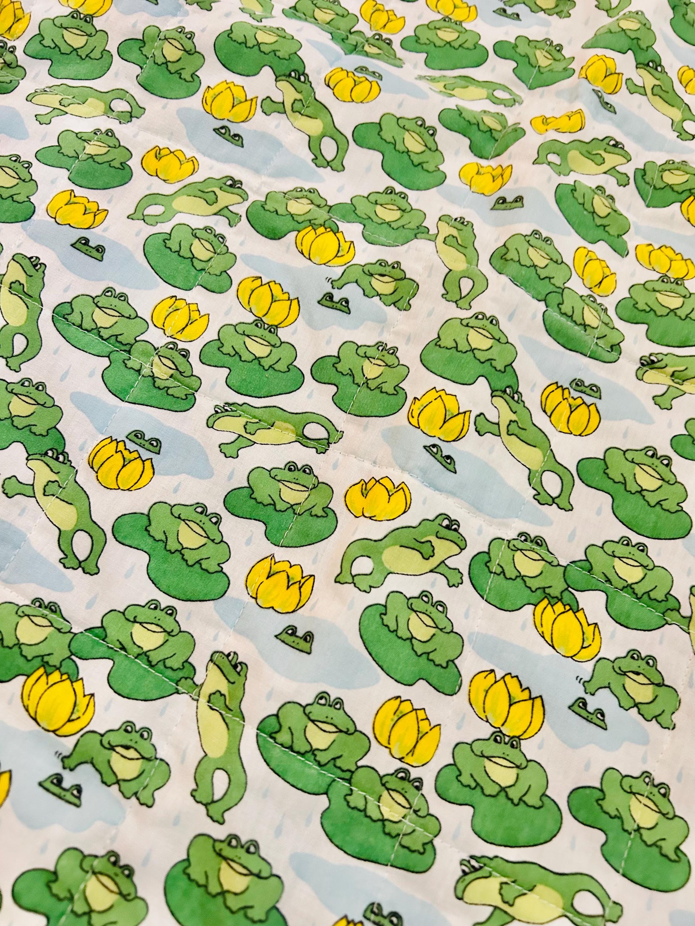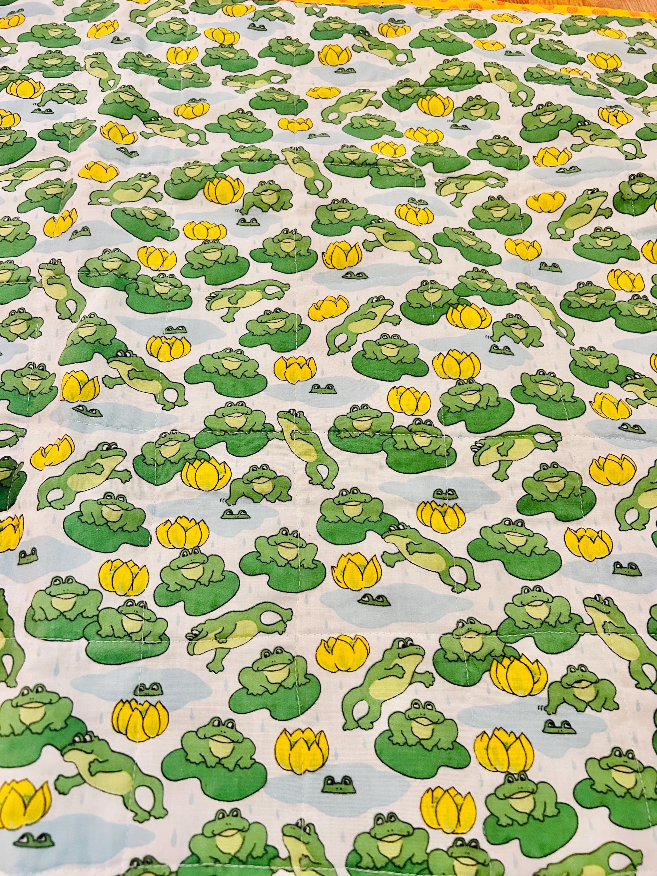 This cheerful vintage frog quilt is full of personality and playful charm! Measuring approximately 42” x 42”, the front features an adorable novelty print of bright green frogs lounging and leaping among lily pads and sunny yellow water lilies, all set against a soft blue “pond” background with gentle raindrops. The vibrant yellow binding with subtle spiral detail frames the quilt beautifully and adds a joyful pop of color.