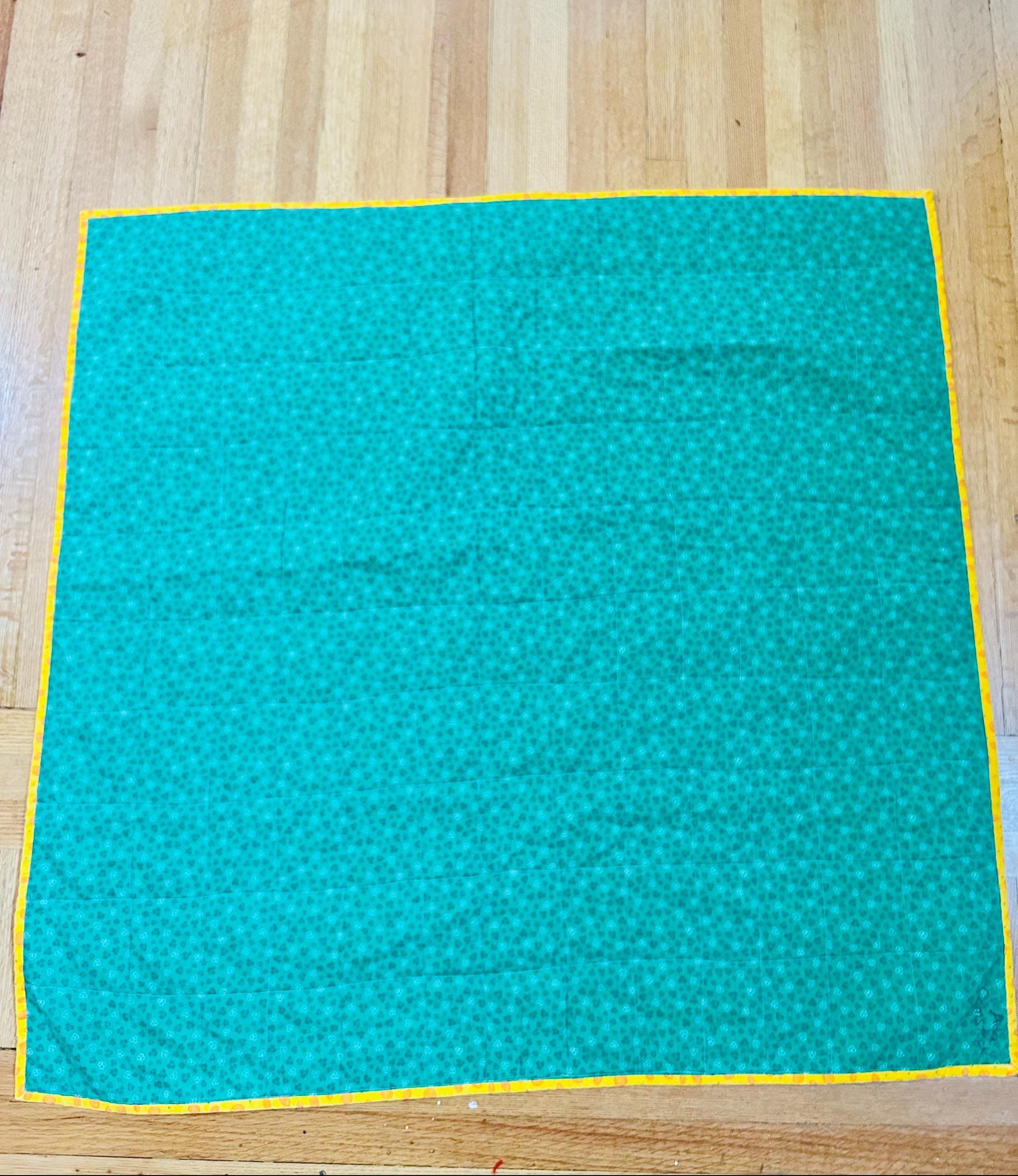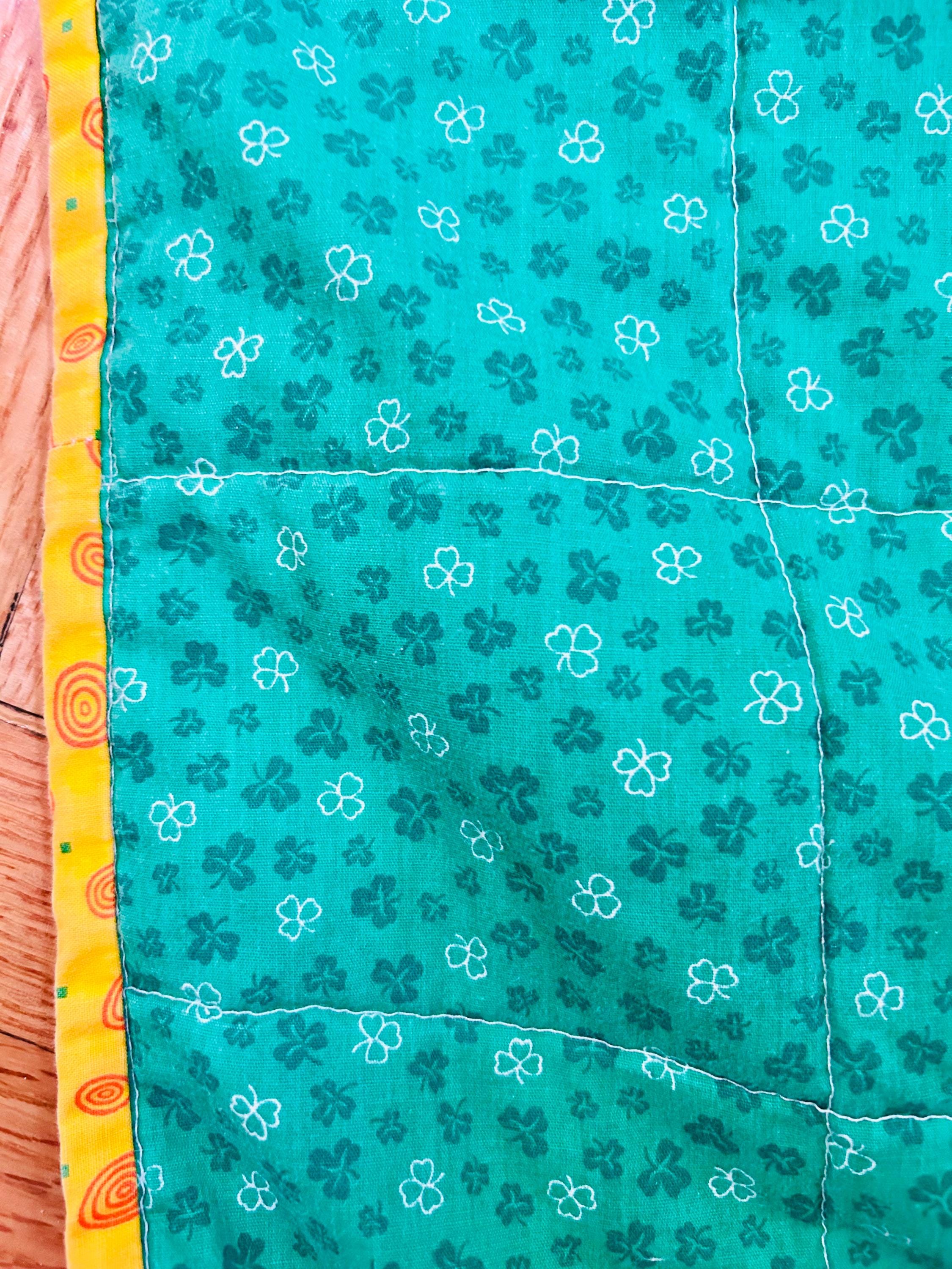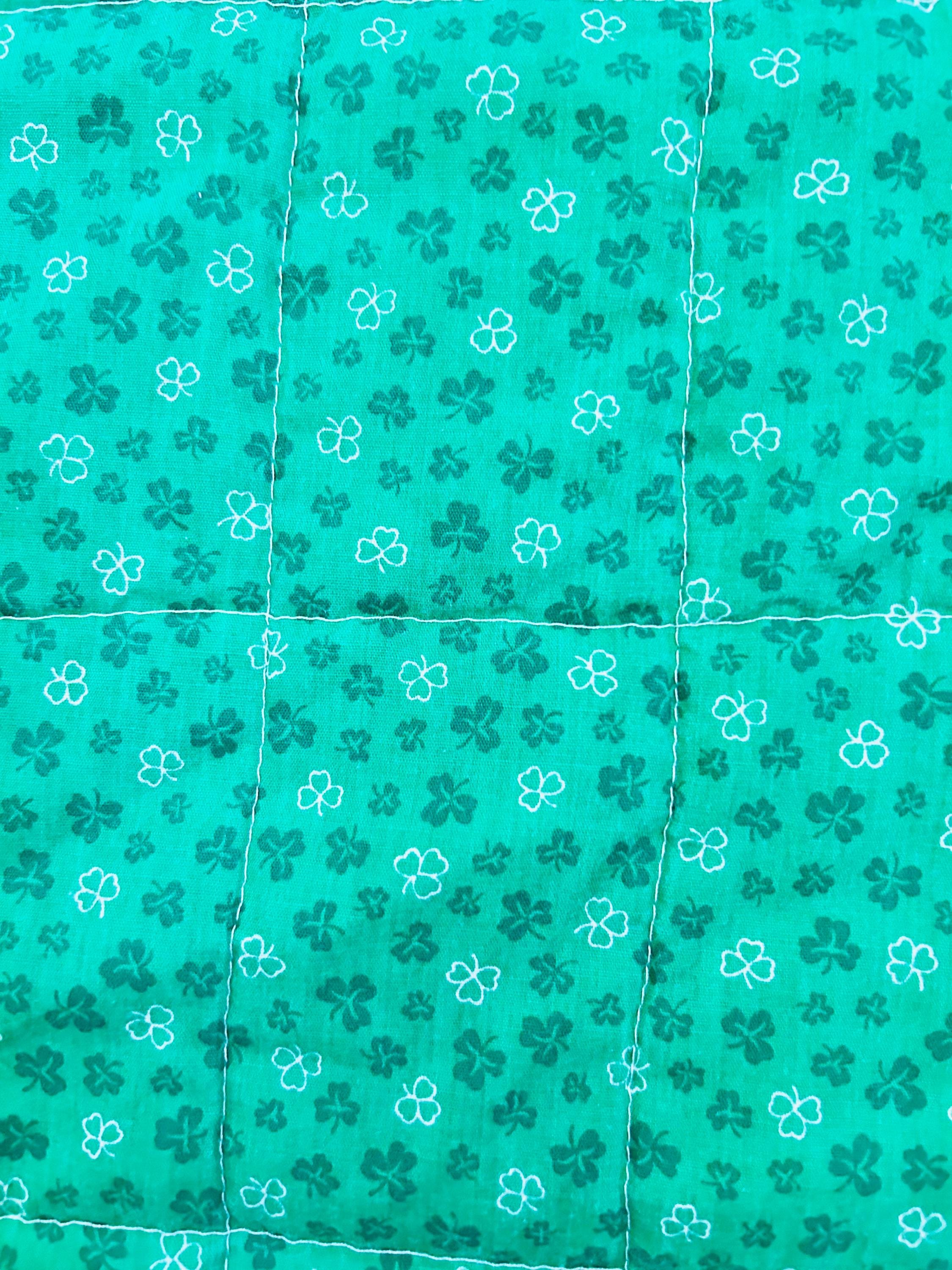 The backing is a coordinating rich green fabric with delicate clover-style floral motifs, machine quilted in a neat grid pattern for durability and softness.