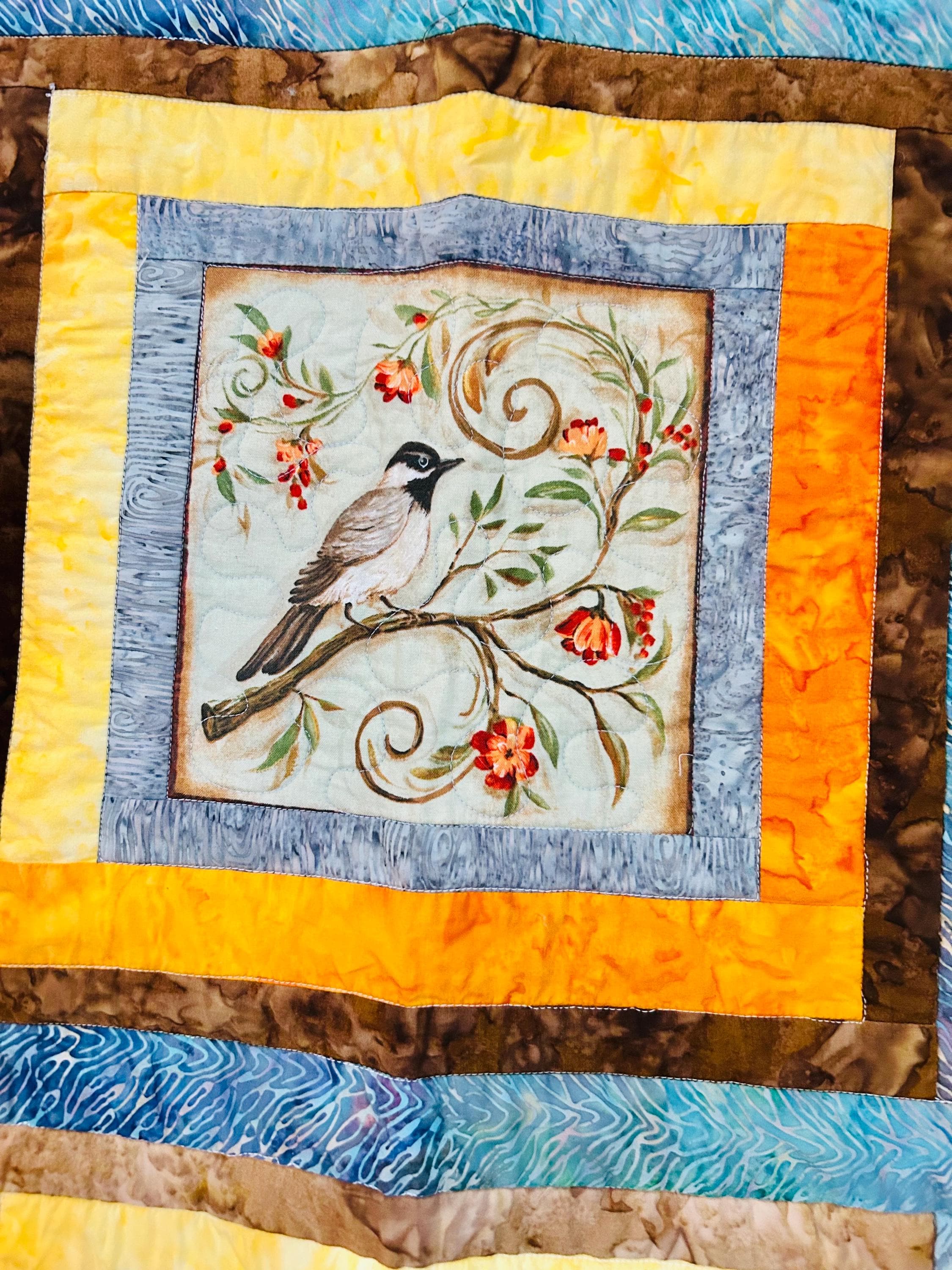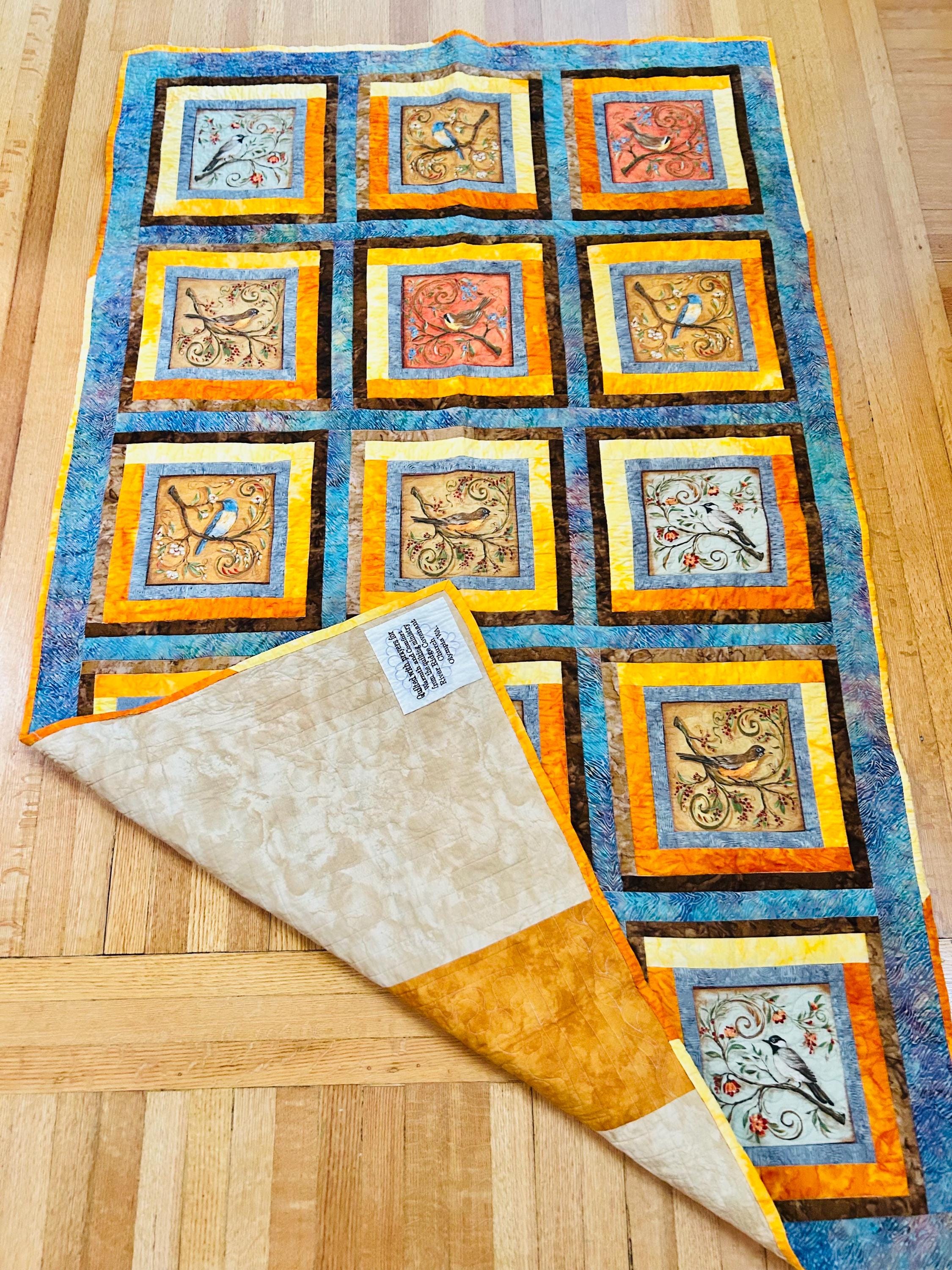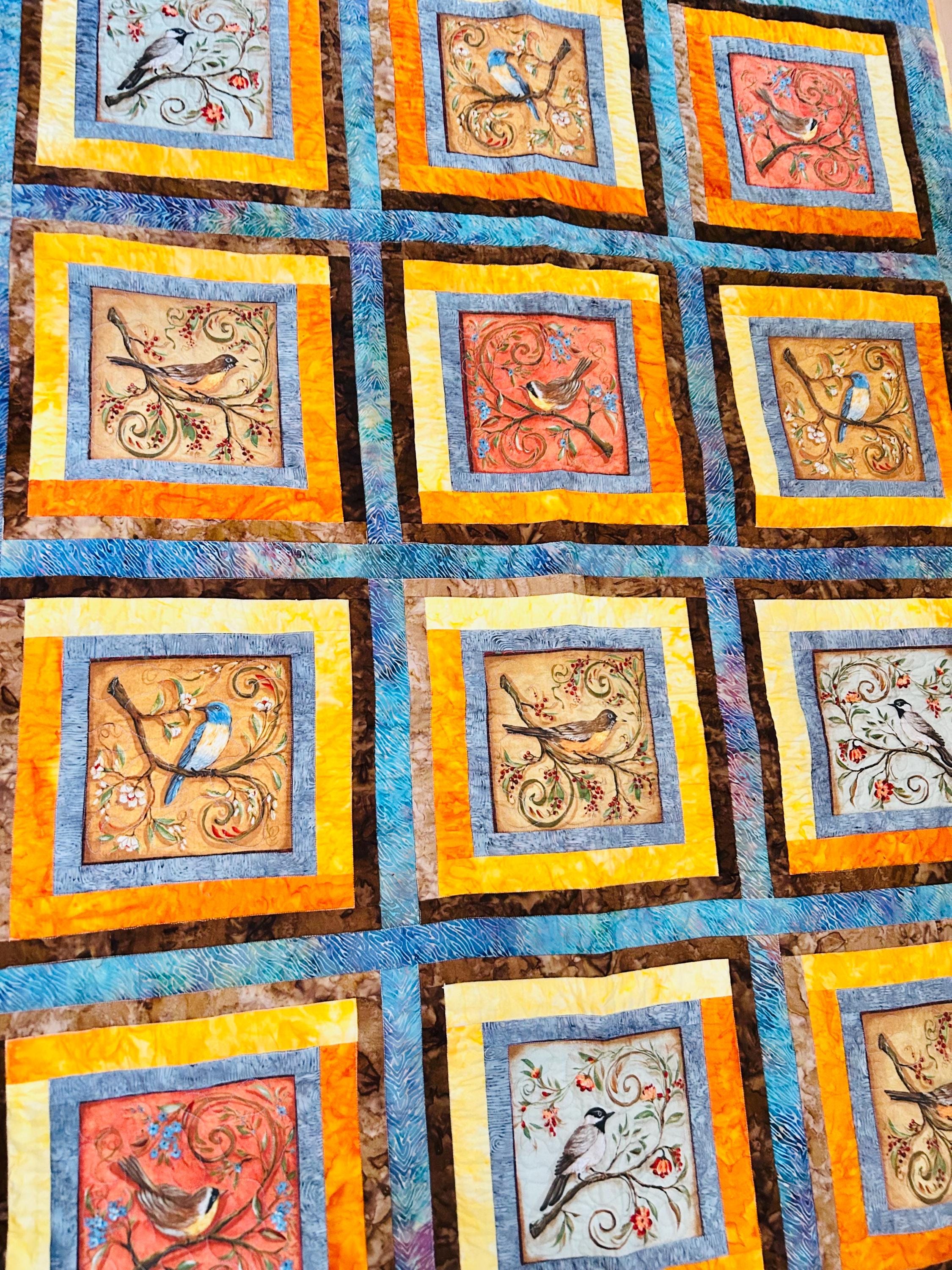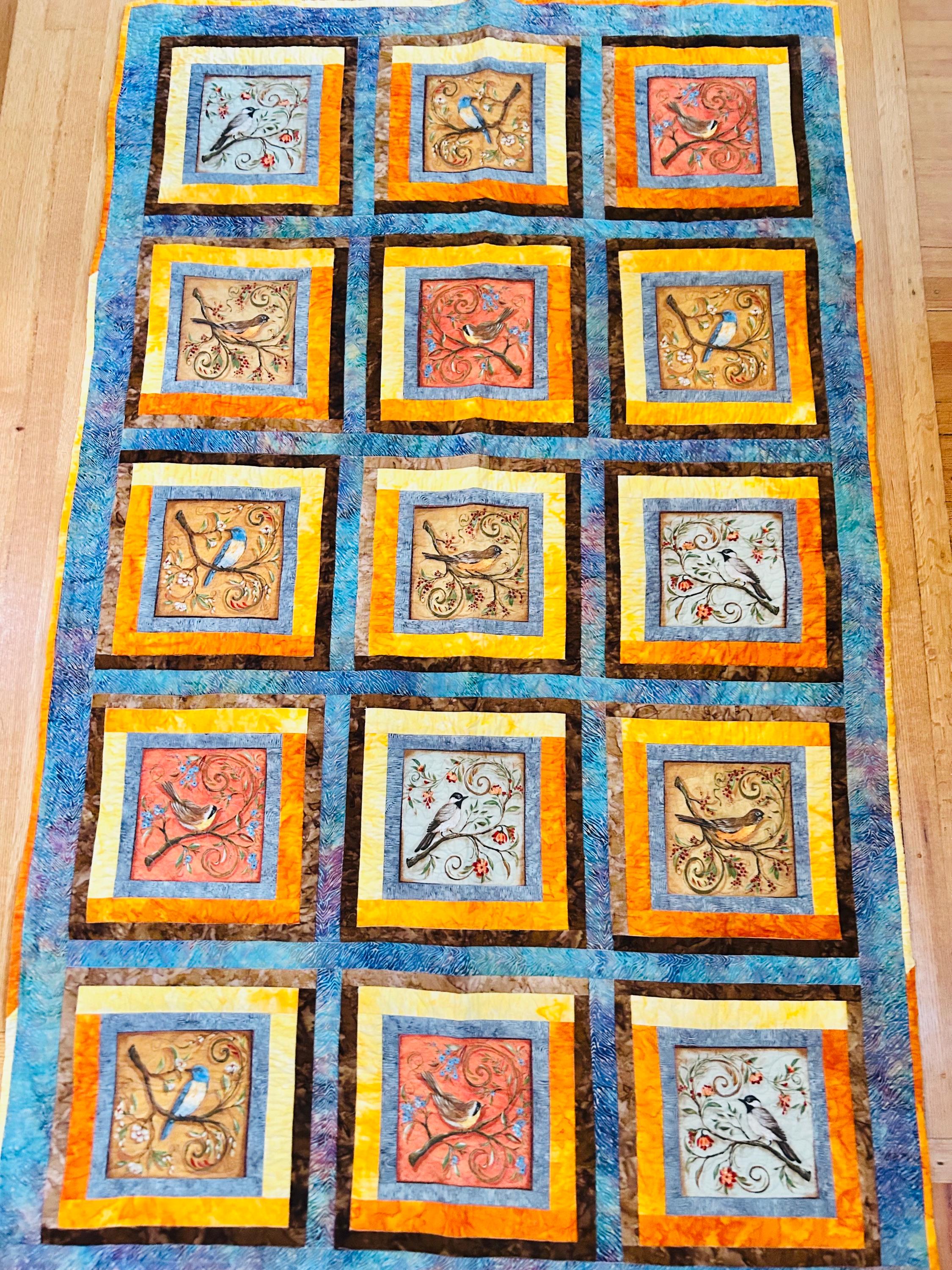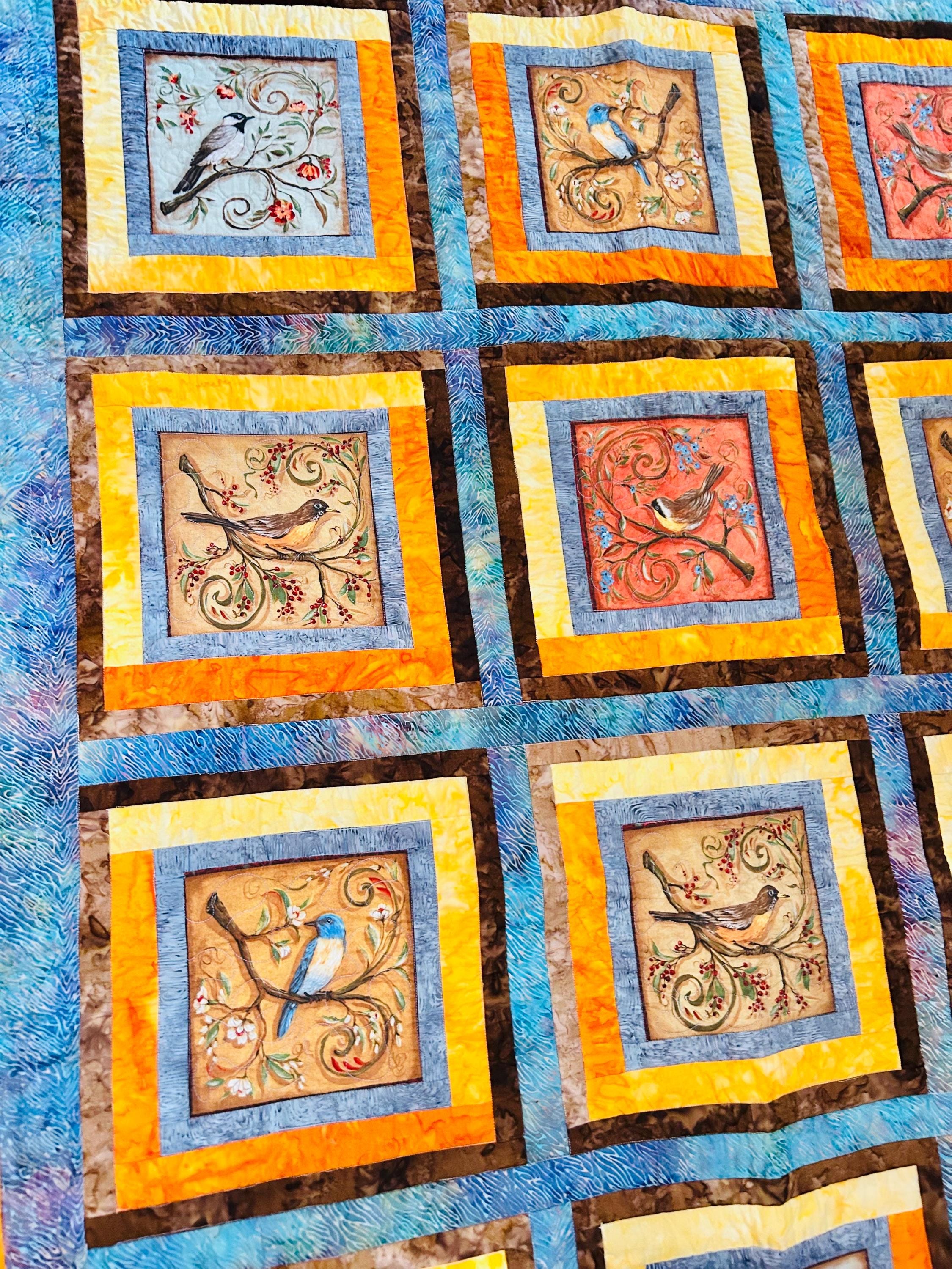 This beautifully made quilt, circa early 2000s, is made of high-quality cottons features a series of detailed bird panels that include Black-capped Chickadees, Eastern Bluebirds and Cedar Waxwings, all framed in rich batik borders of golden yellow, amber, brown, and teal blue. Each square showcases a different bird perched among florals and scrolling vines.