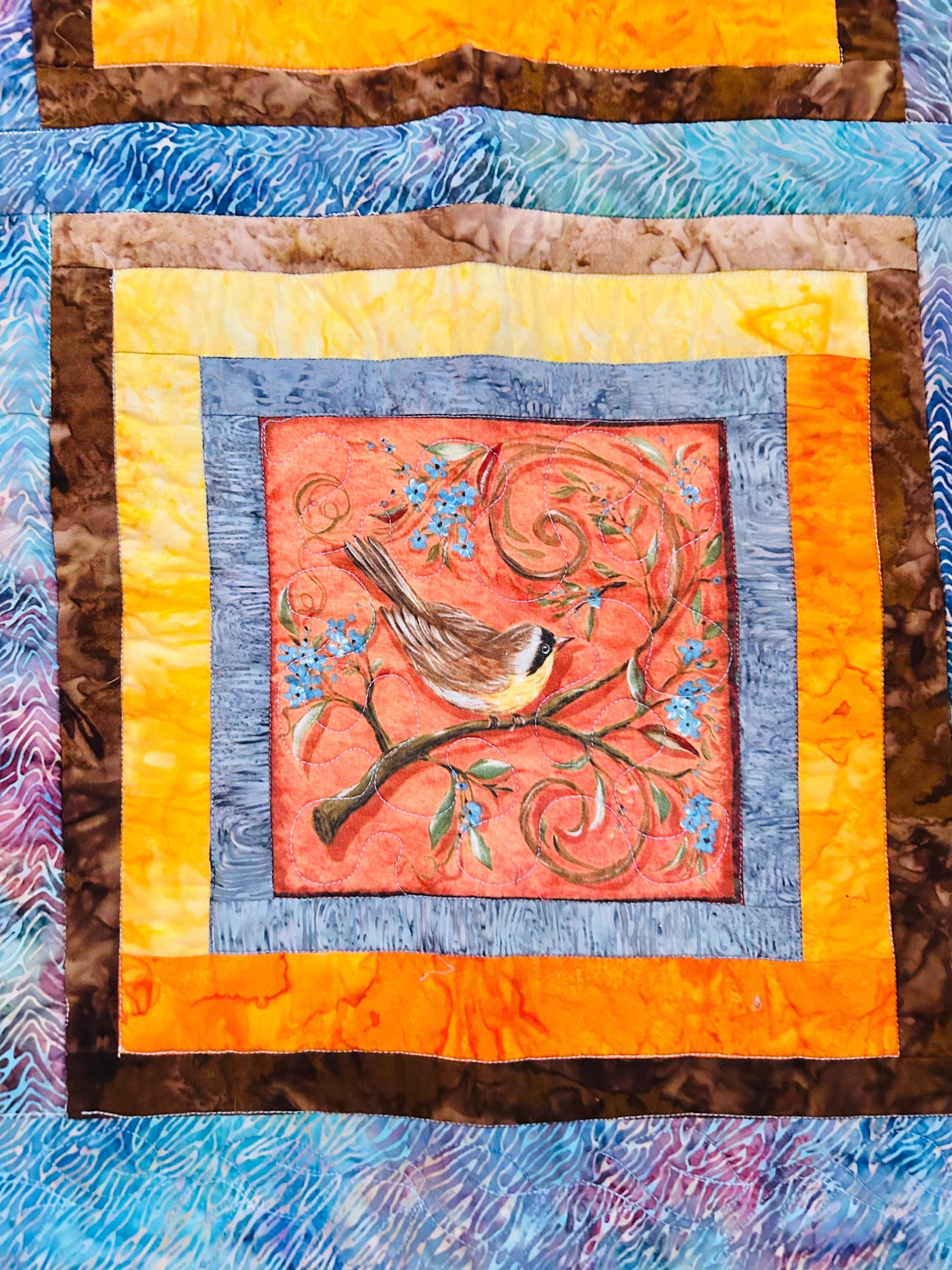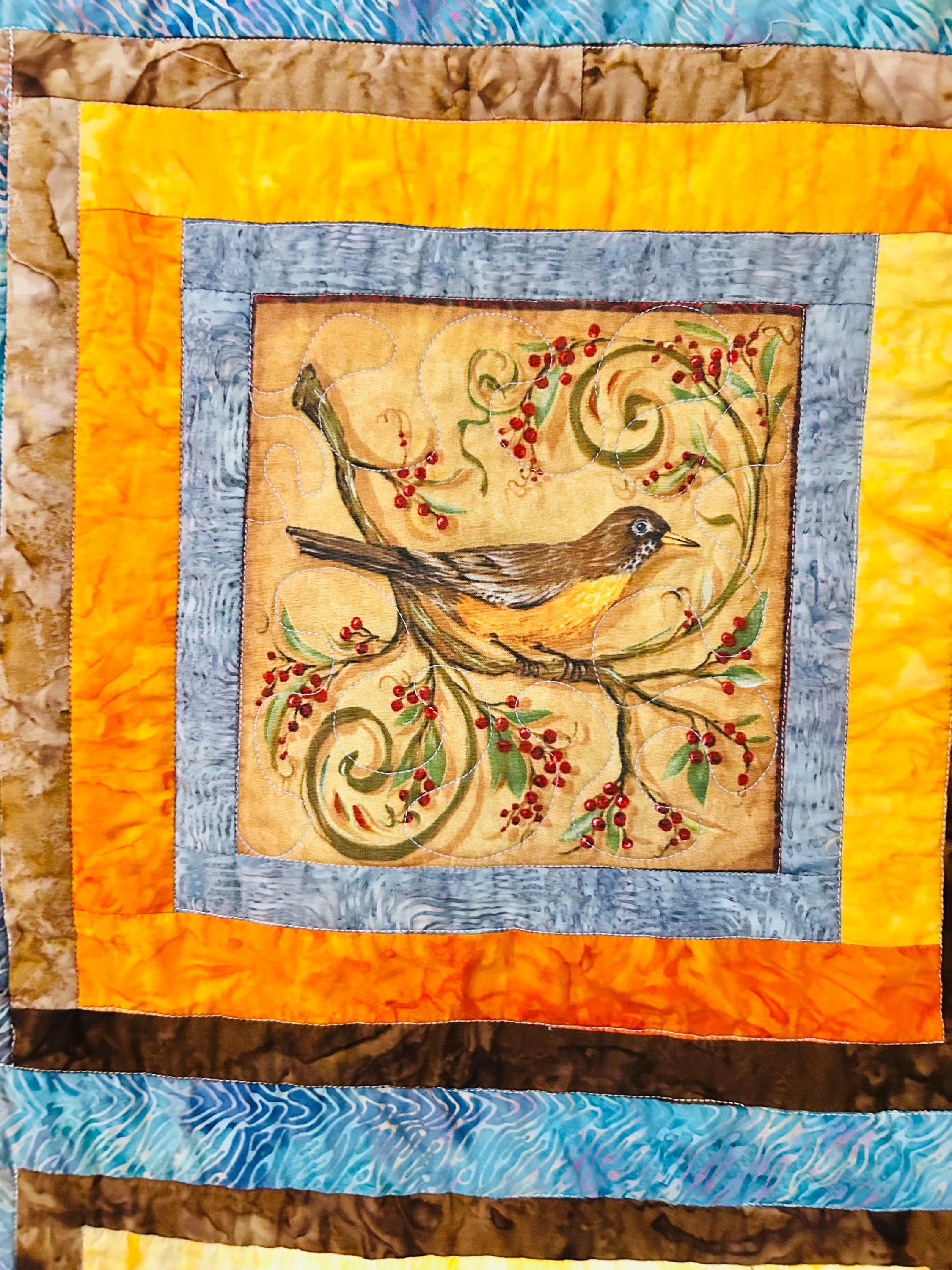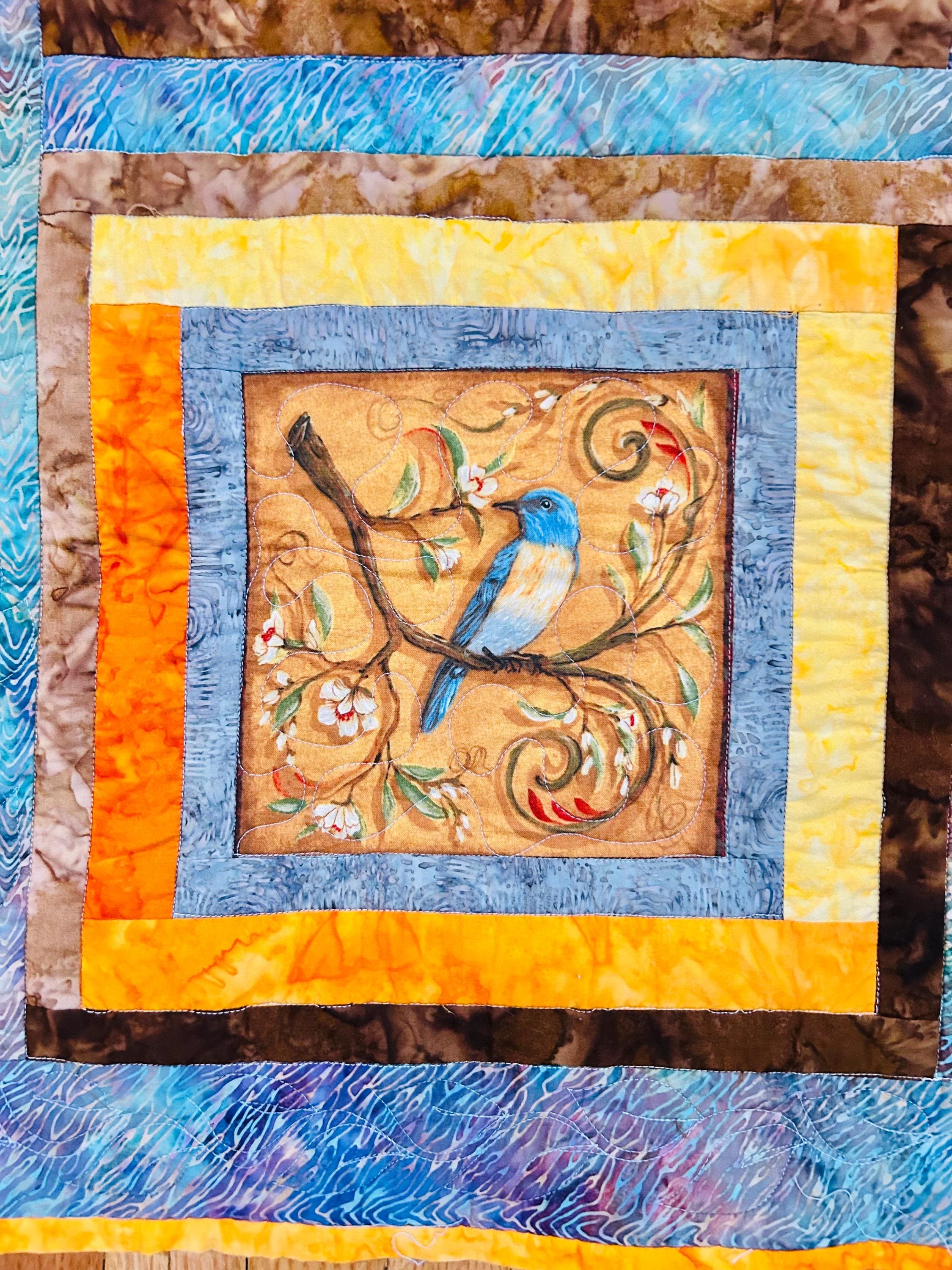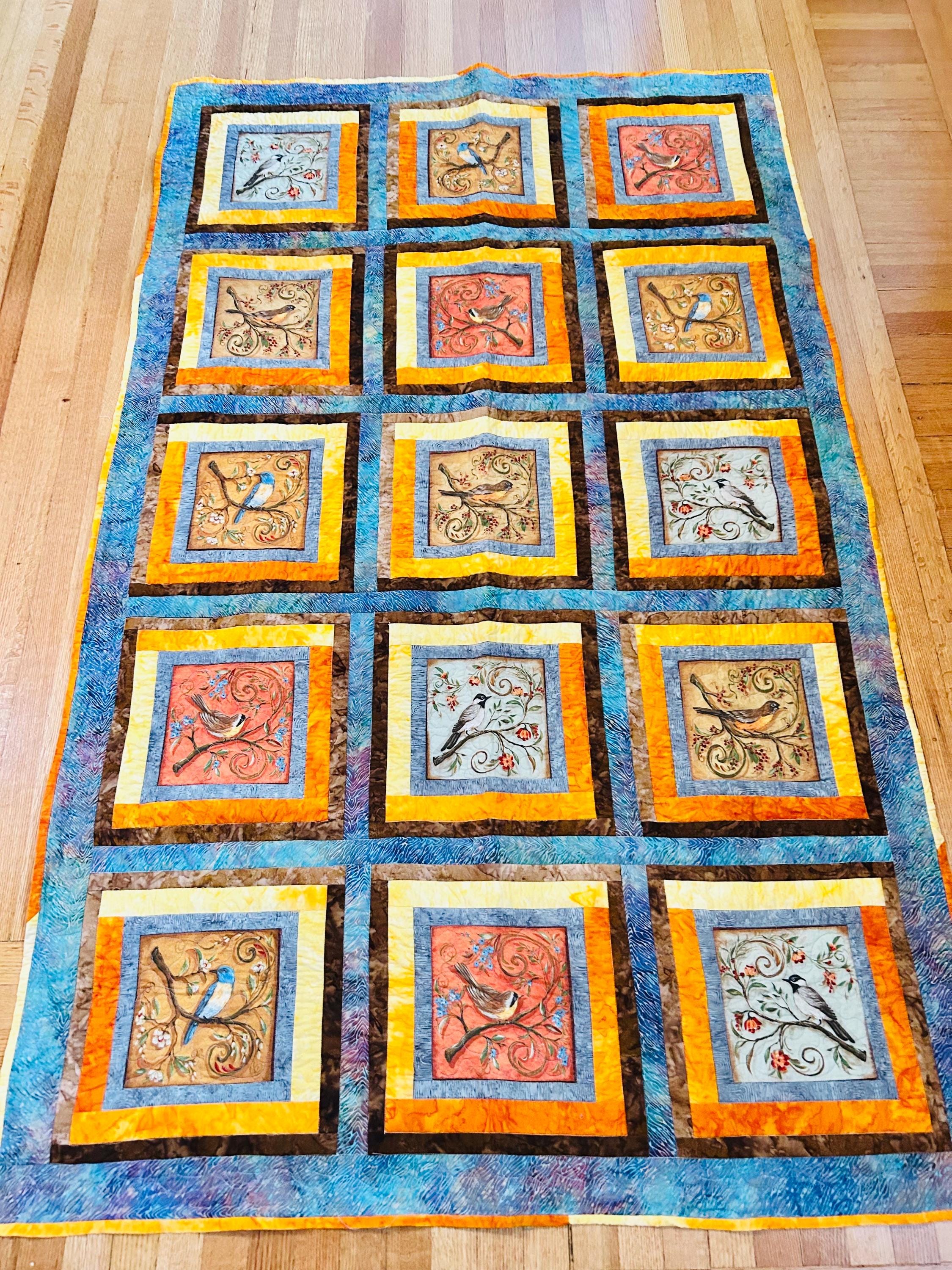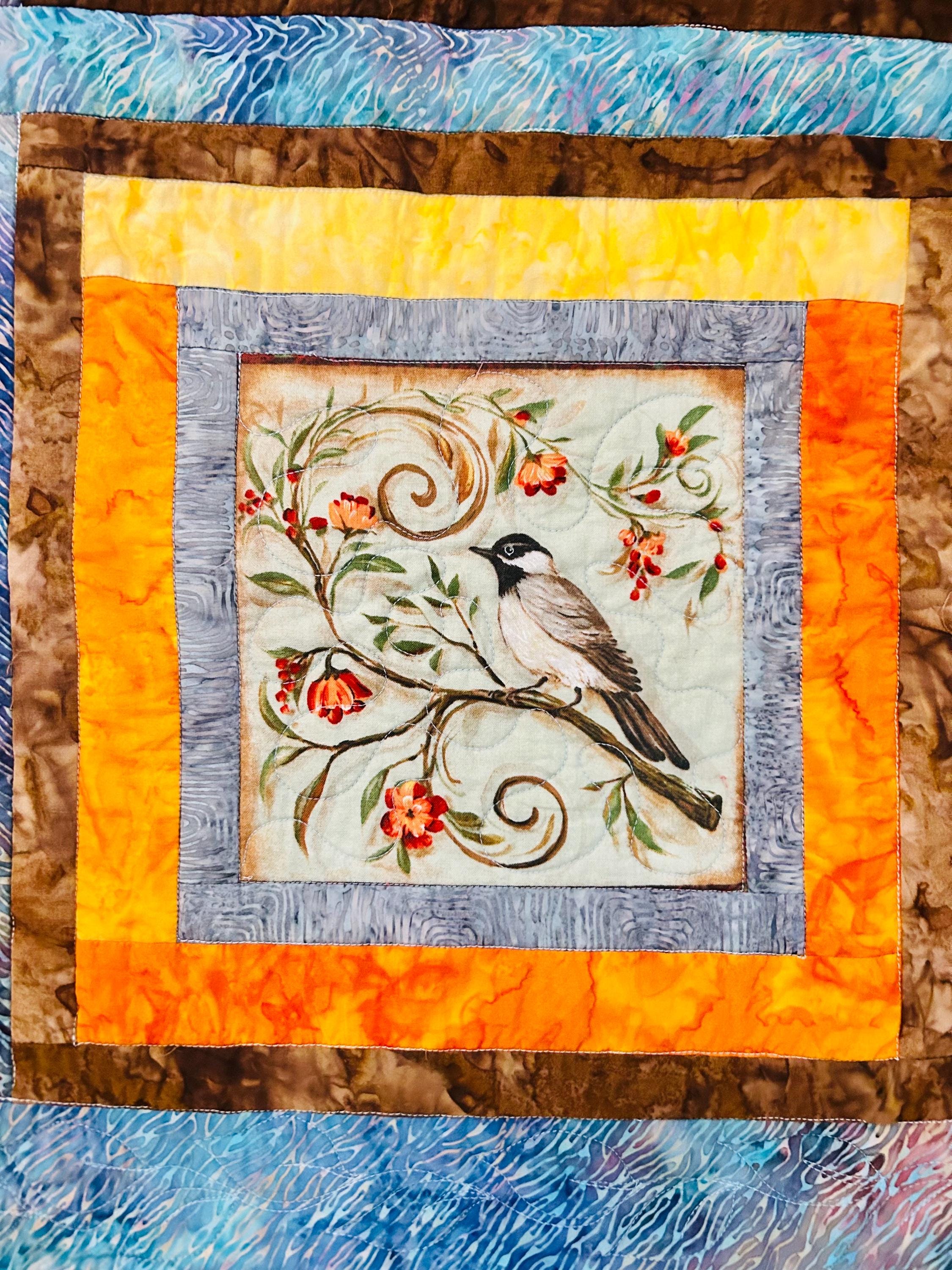 This beautifully made quilt, circa early 2000s, is made of high-quality cottons features a series of detailed bird panels that include Black-capped Chickadees, Eastern Bluebirds and Cedar Waxwings, all framed in rich batik borders of golden yellow, amber, brown, and teal blue. Each square showcases a different bird perched among florals and scrolling vines.