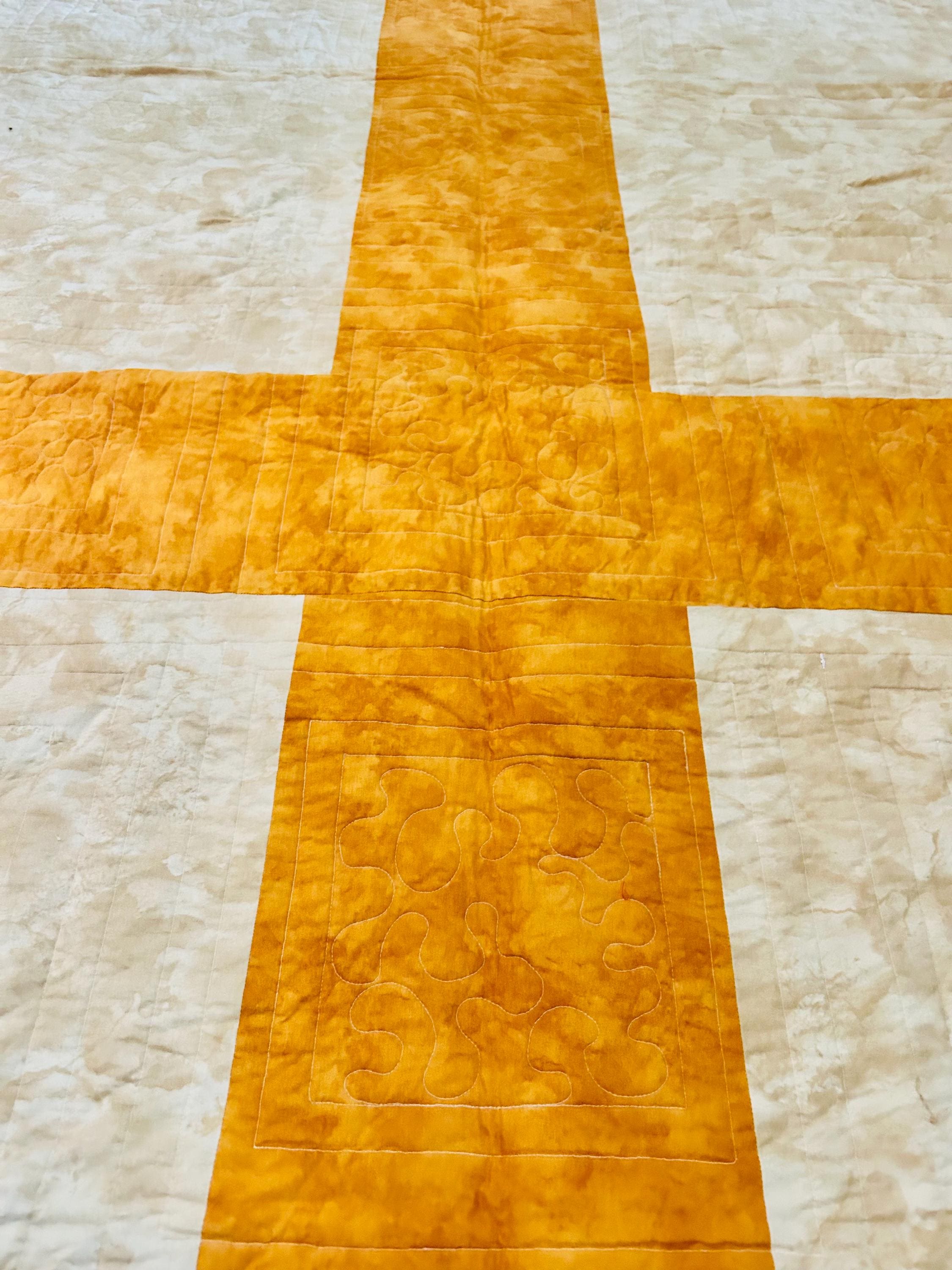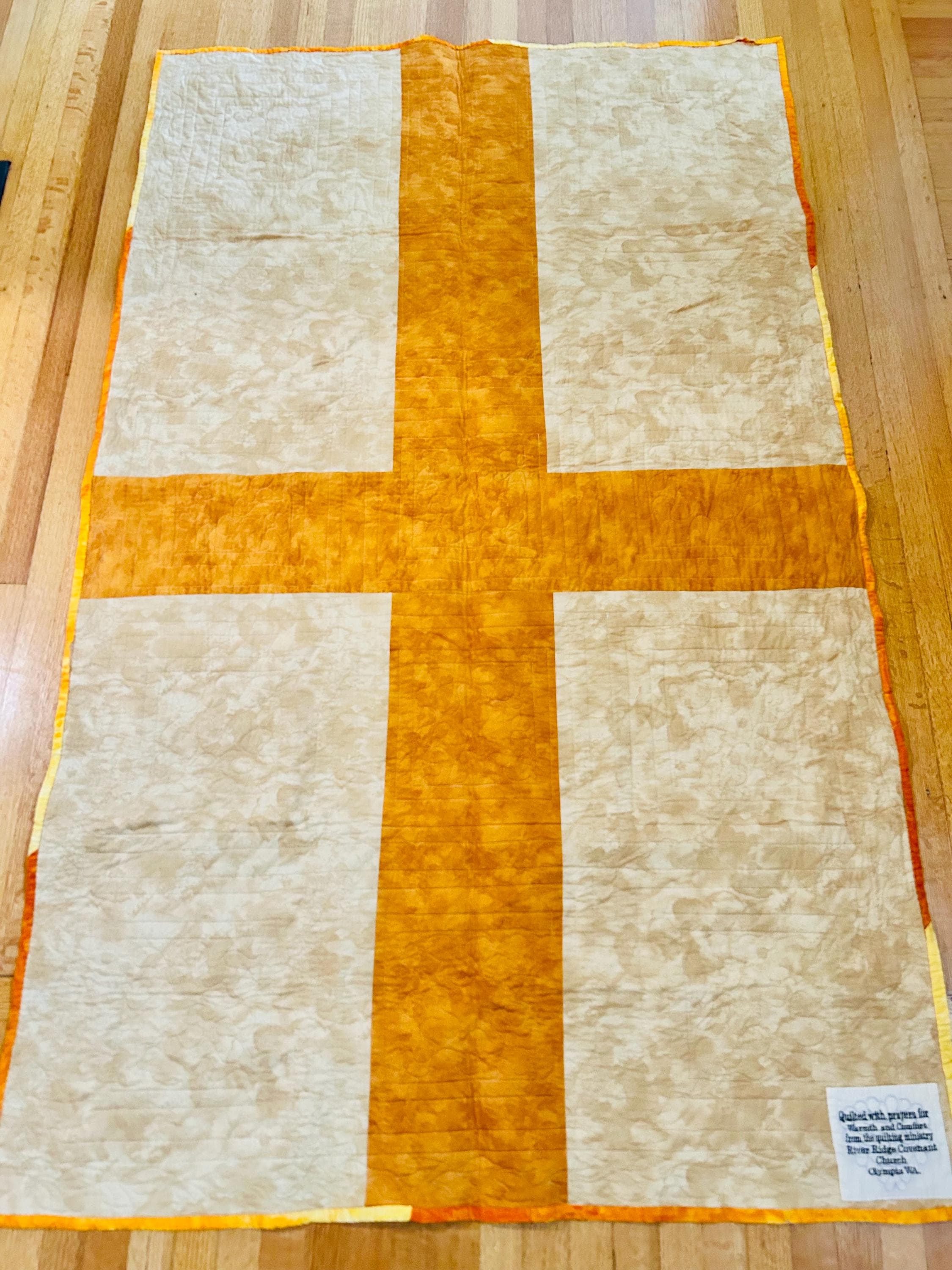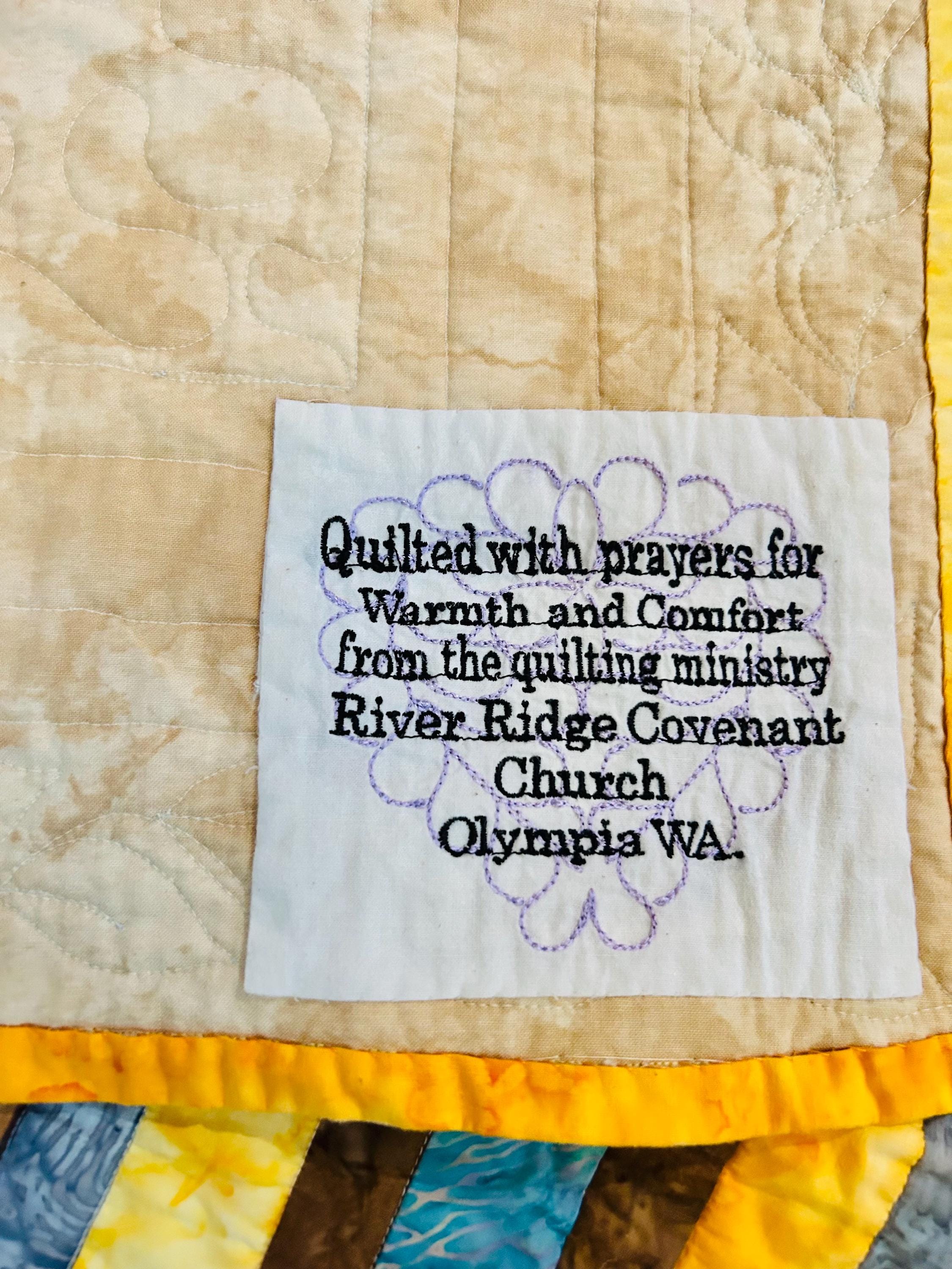 The back includes a stitched dedication label reading: “Quilted with prayers for Warmth and Comfort from the quilting ministry River Ridge Covenant Church Olympia WA.” The back is a yellow and orange batik, while the binding mirrors the sashing and has been hand-stitched to both sides. The batting is lightweight.