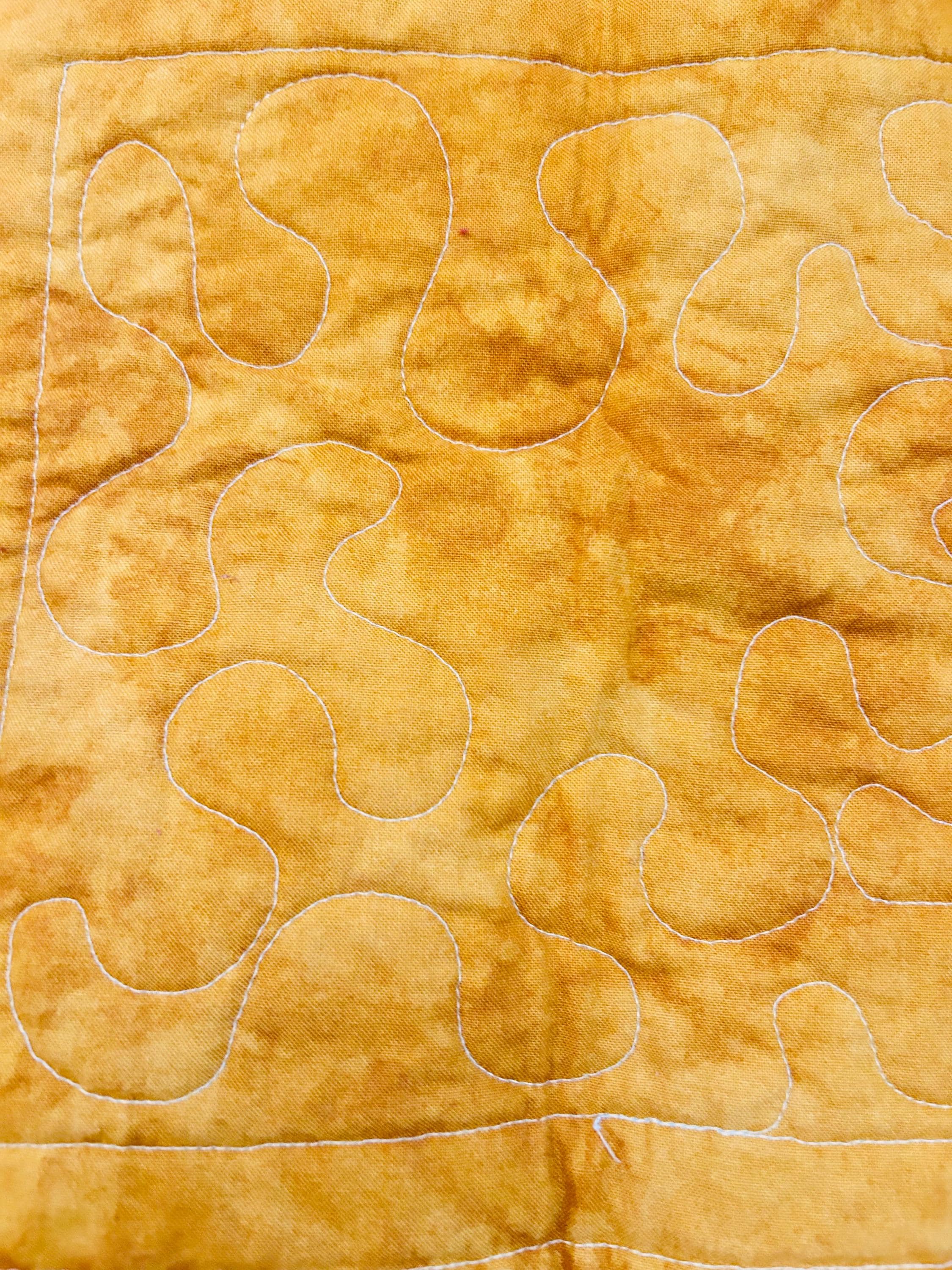 The body of the quilt has been machine-stitched in outlines of the patchwork, while the machine quilting along the borders is in lovely floral vines.