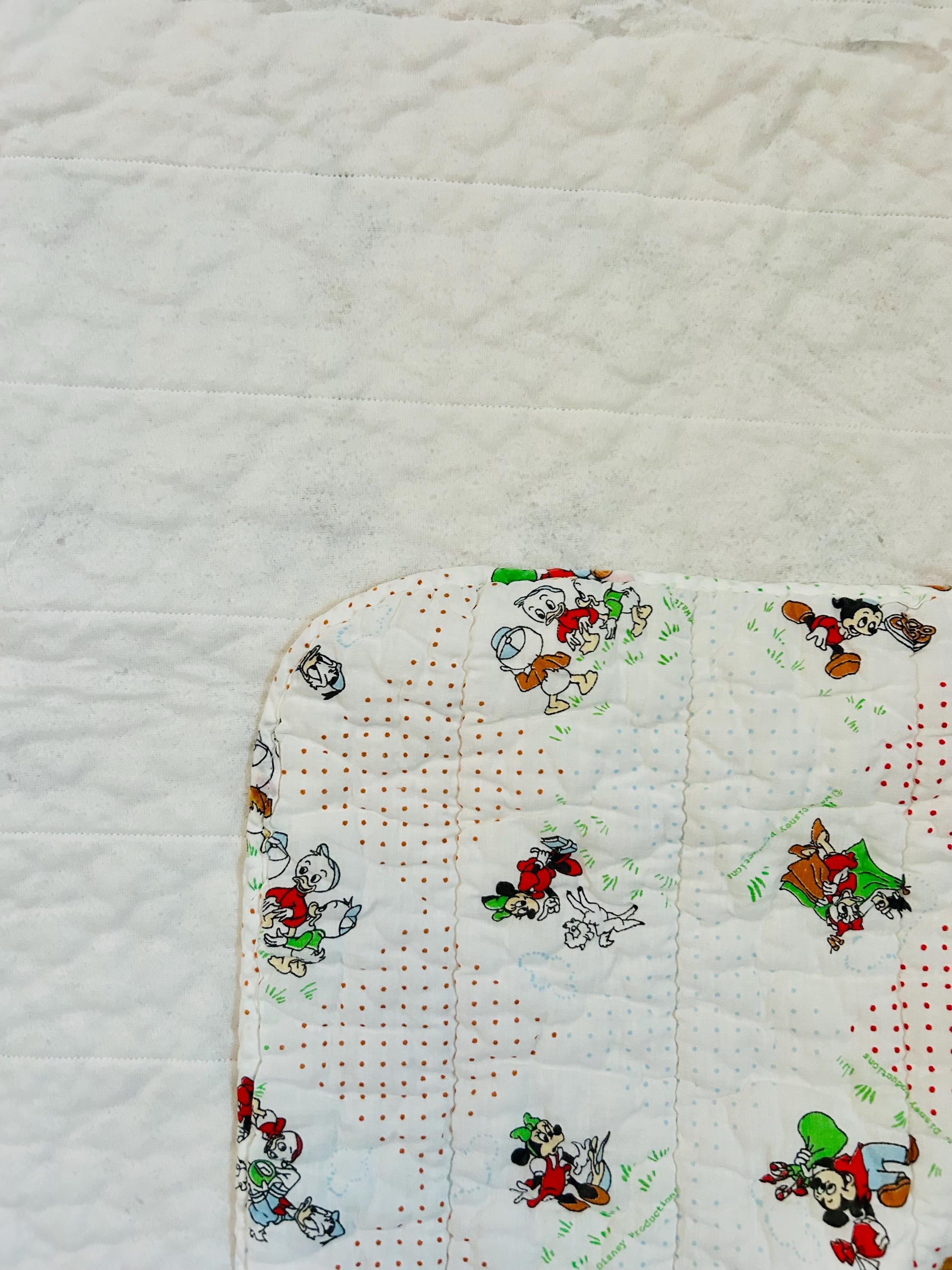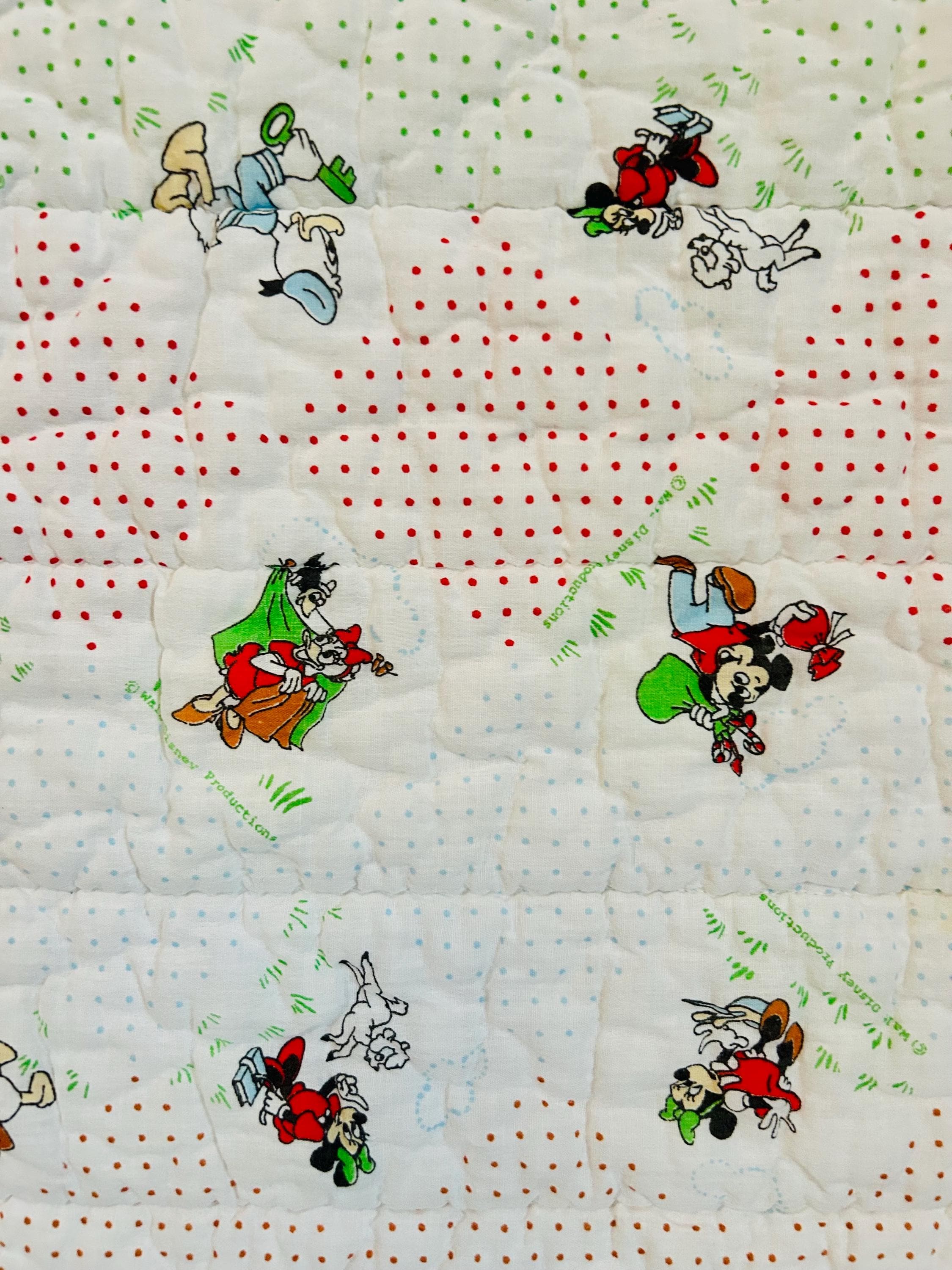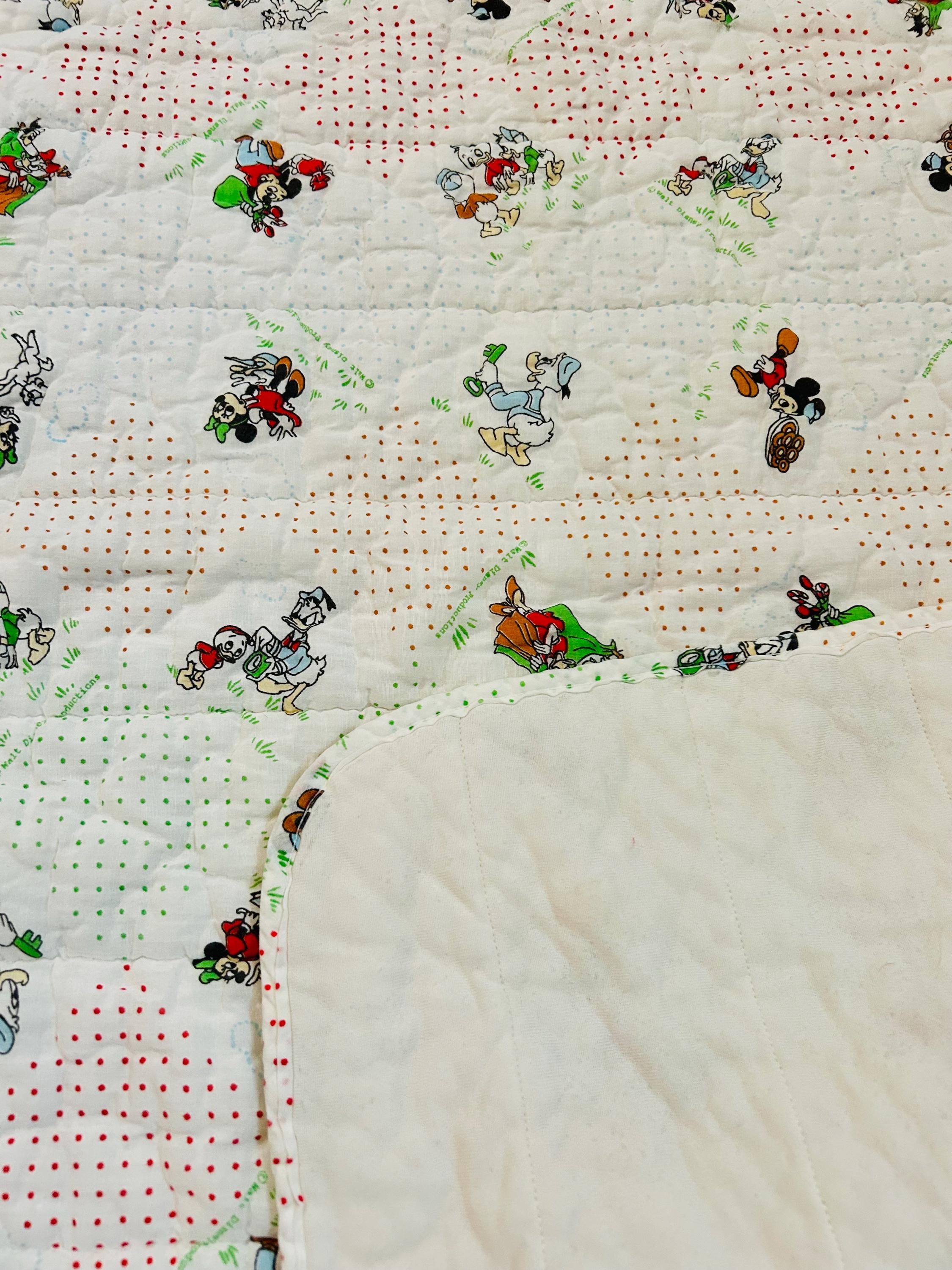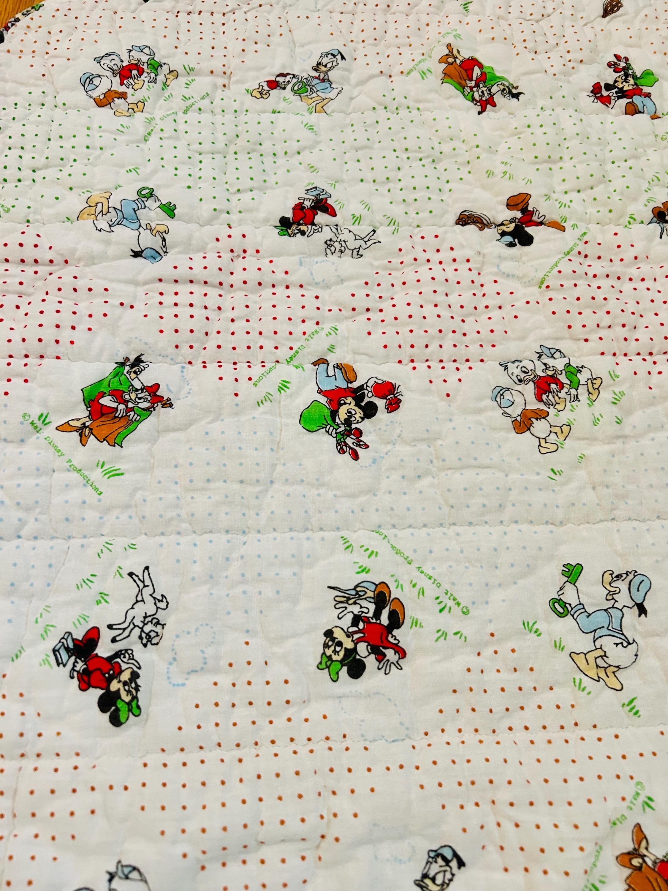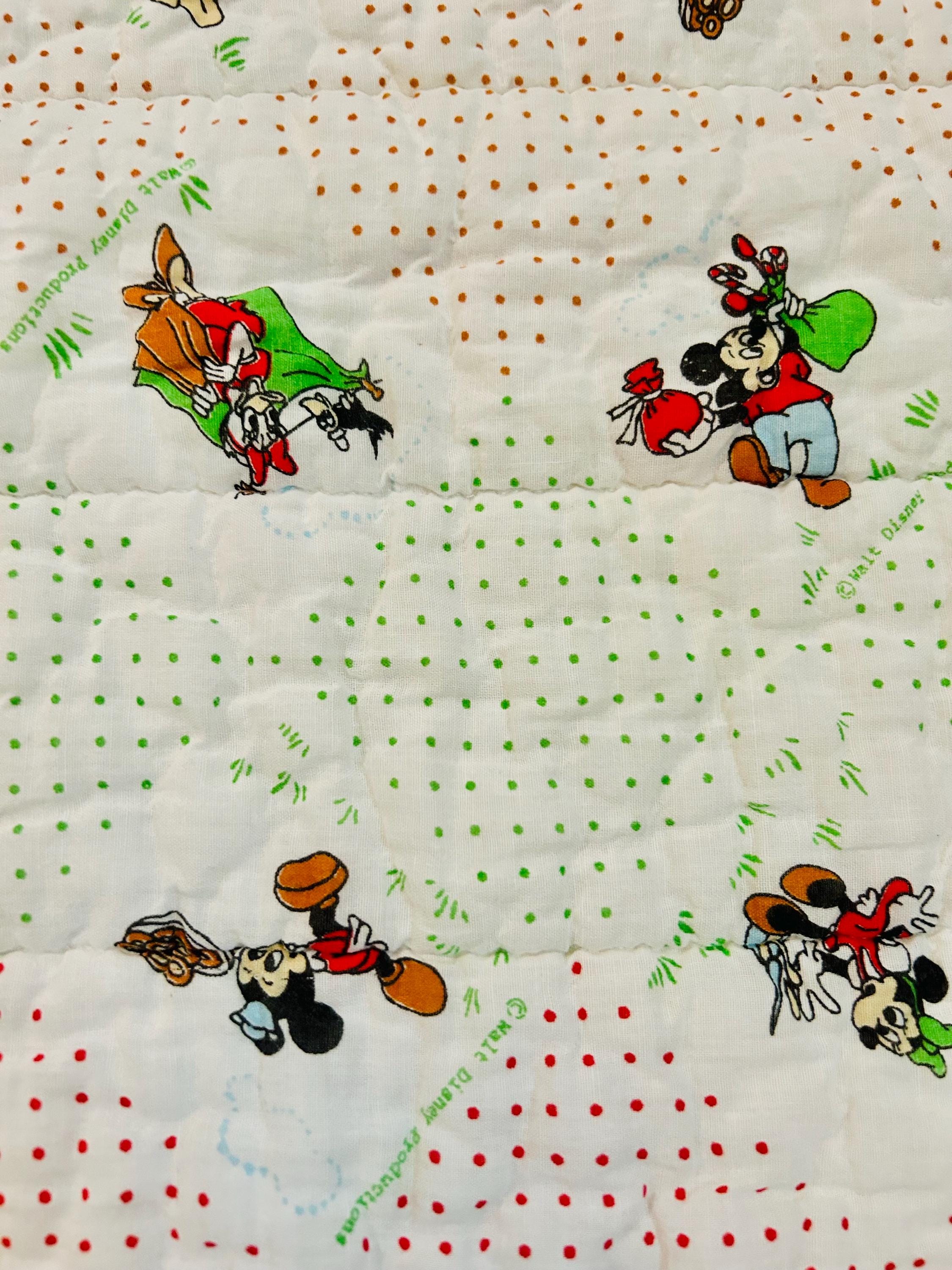 Details • Era: Late 1950s – Early 1960s • Size: 30” x 39” • Characters: Mickey Mouse, Minnie Mouse, Donald Duck, Pluto • Fabric: Cotton • Construction: Machine quilted • Backing: Solid cream/off-white