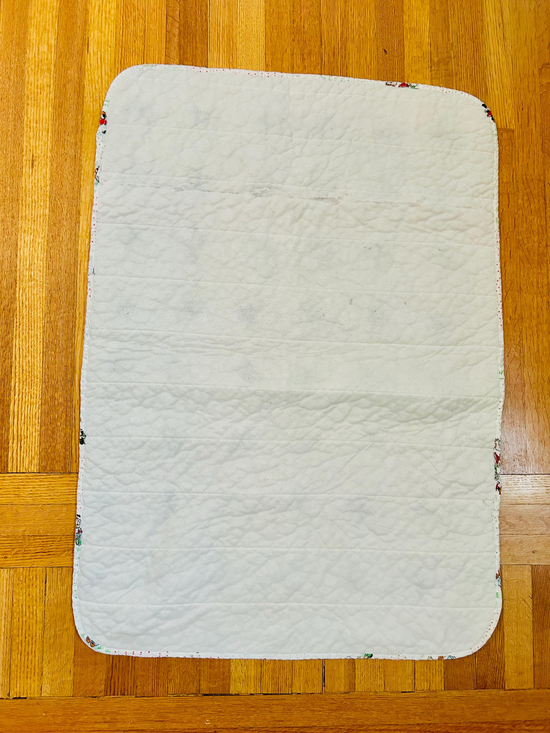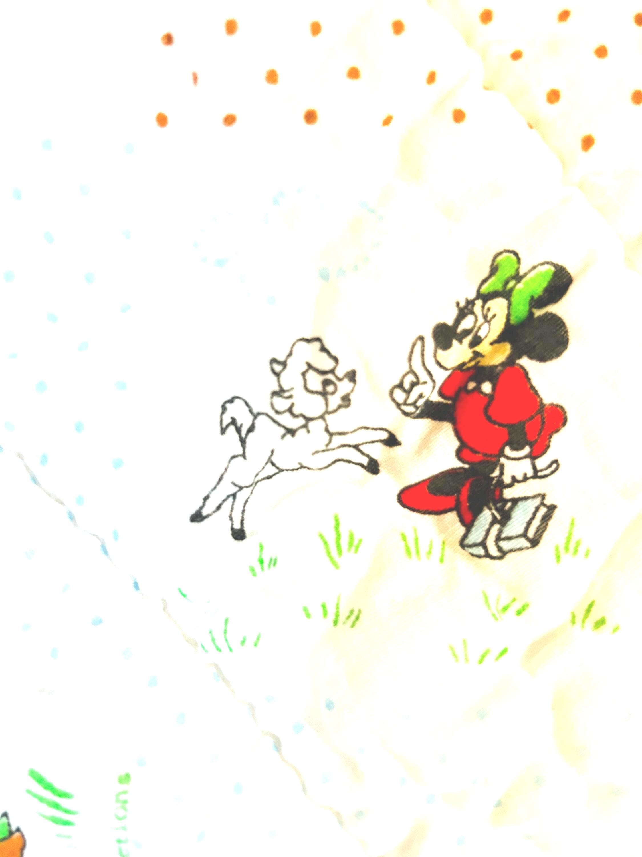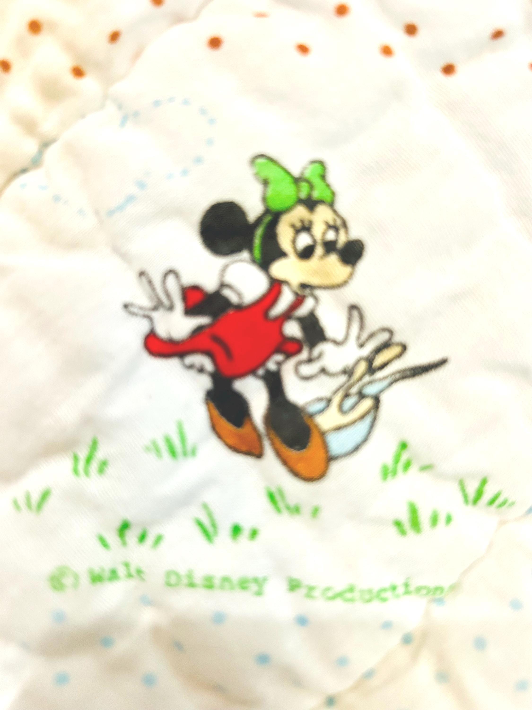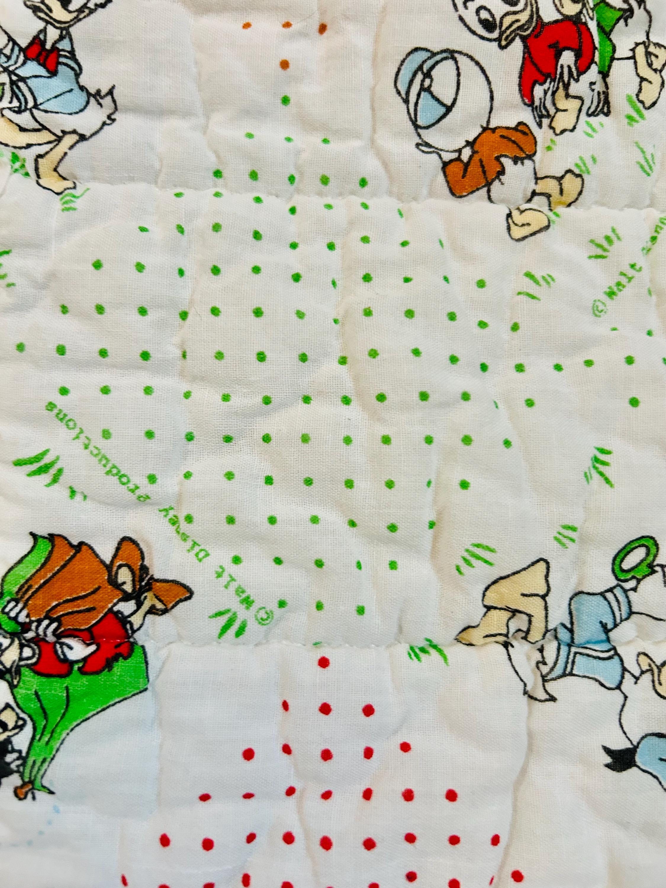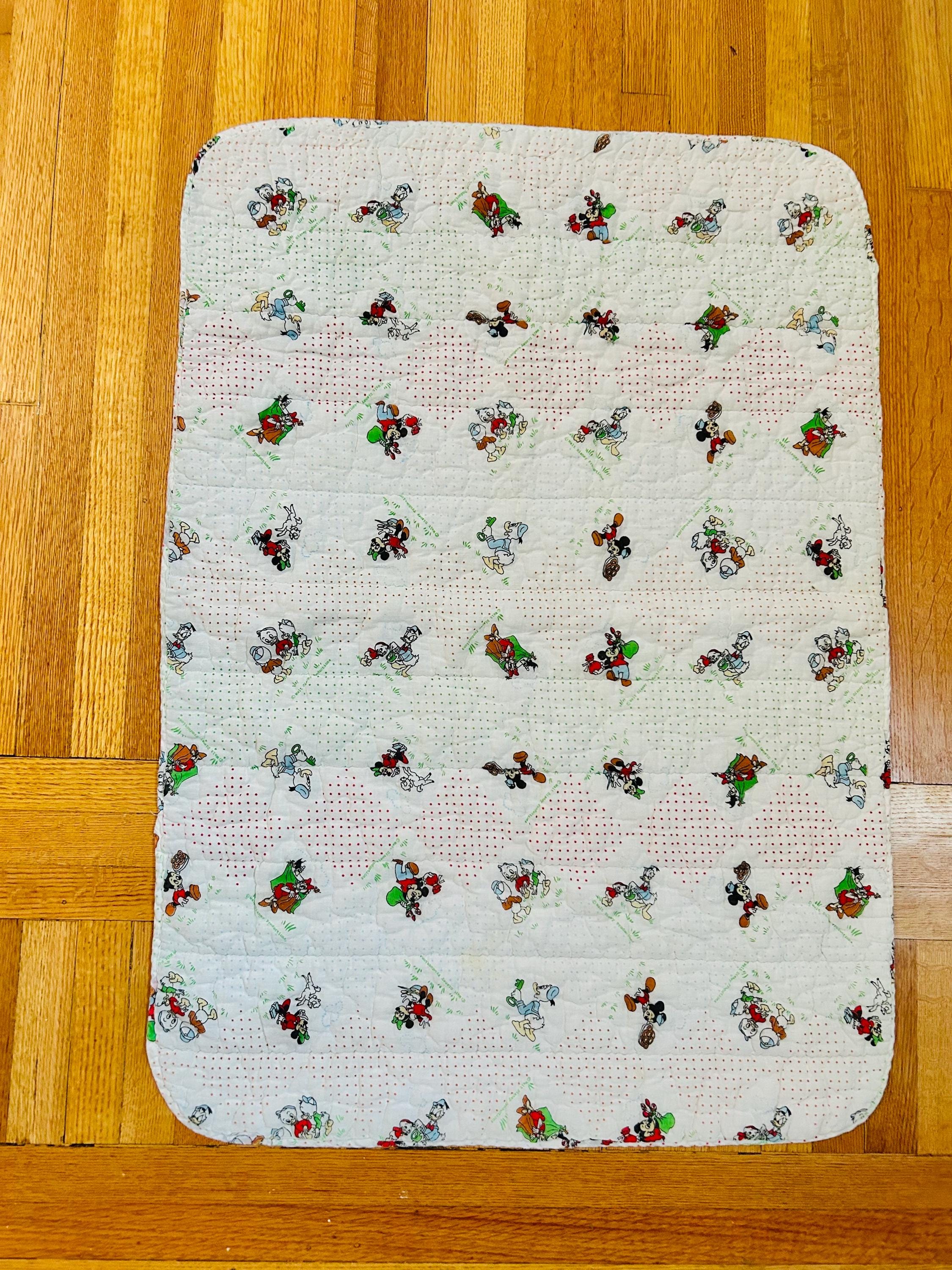 Details • Era: Late 1950s – Early 1960s • Size: 30” x 39” • Characters: Mickey Mouse, Minnie Mouse, Donald Duck, Pluto • Fabric: Cotton • Construction: Machine quilted • Backing: Solid cream/off-white