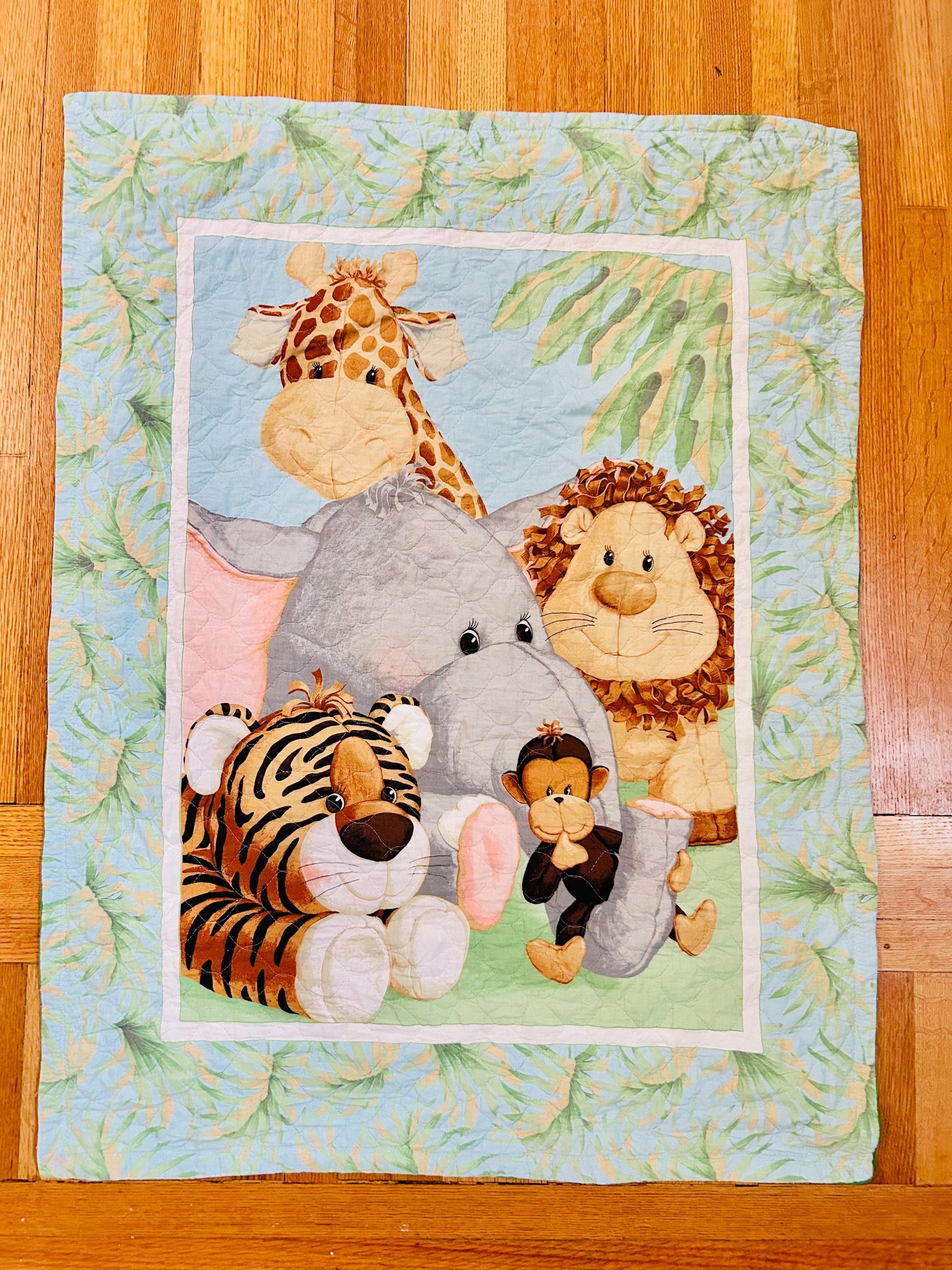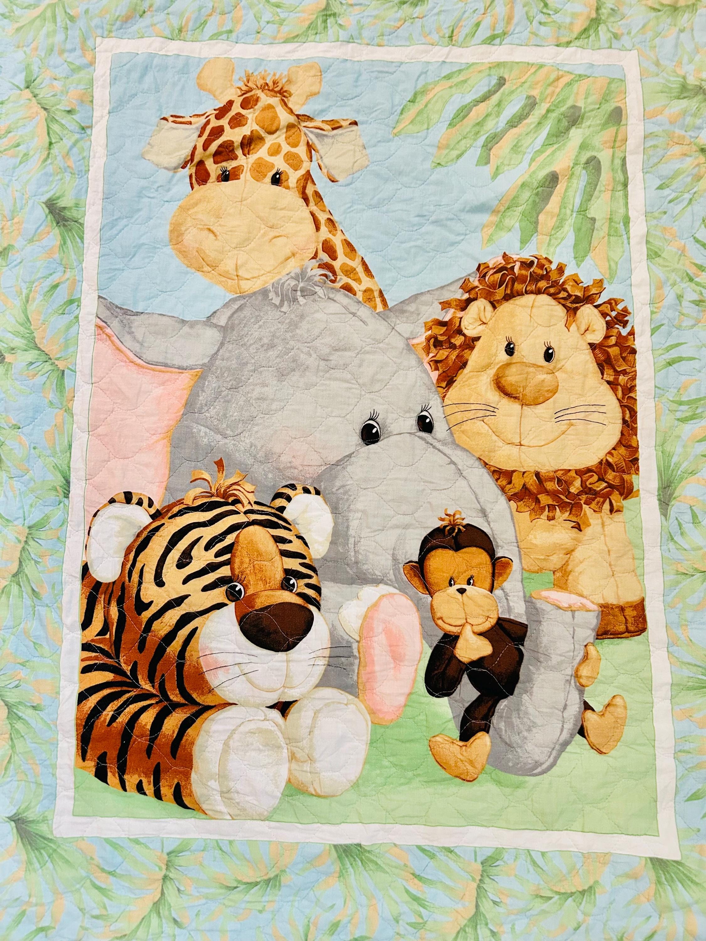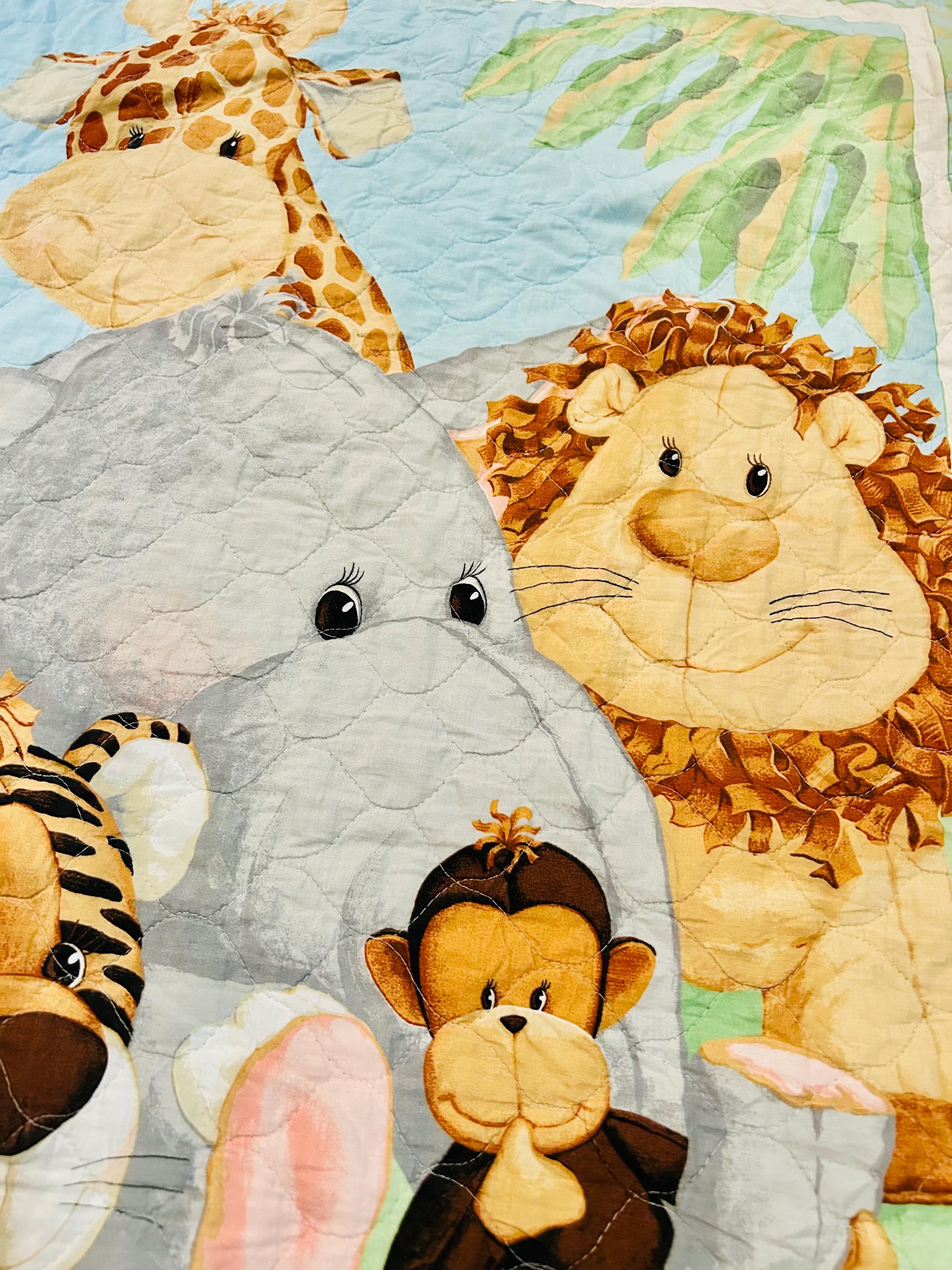 This sweet vintage jungle-themed baby quilt features an adorable group of safari friends including a giraffe, lion, elephant, tiger, and monkey in a soft nursery palette of mint green, sky blue, and warm golden browns.
