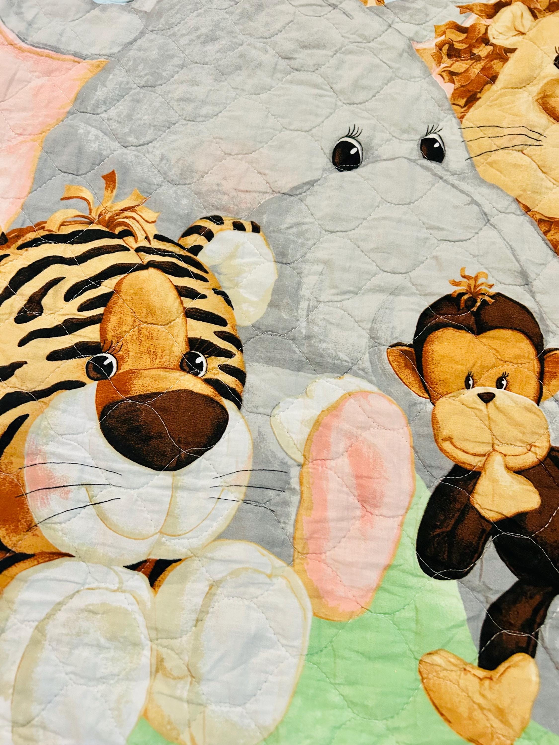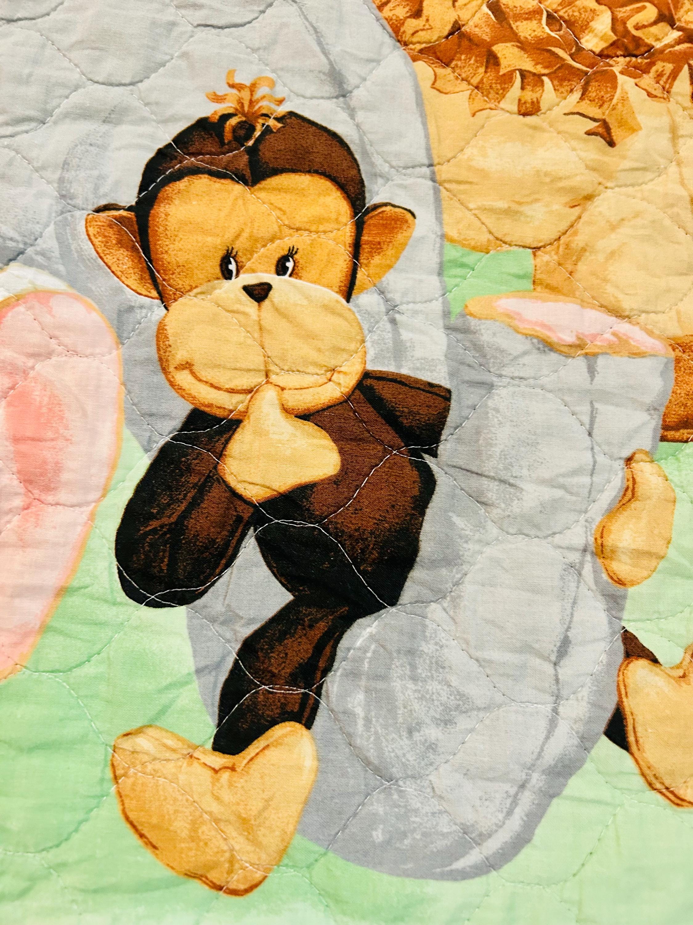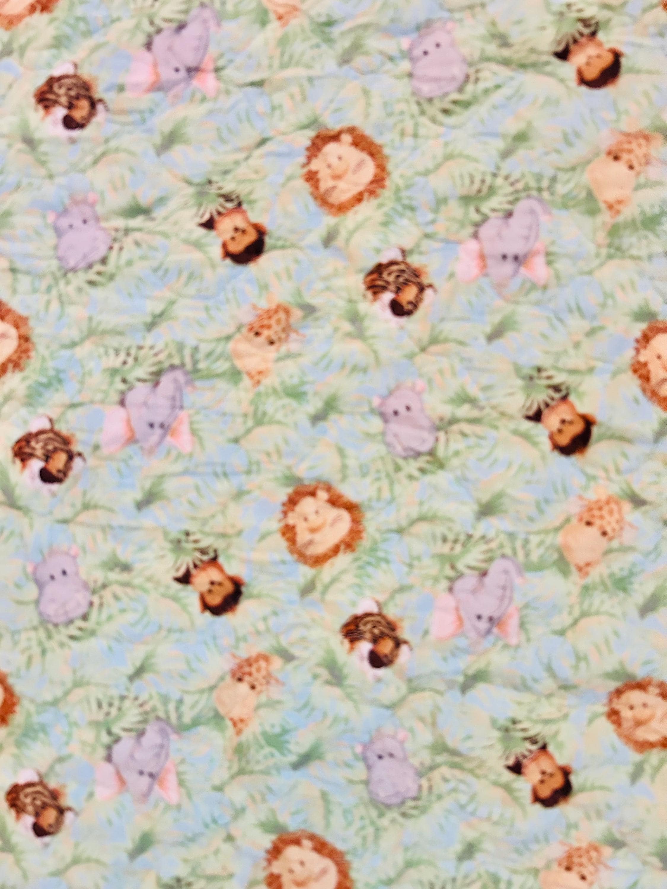 This sweet vintage jungle-themed baby quilt features an adorable group of safari friends including a giraffe, lion, elephant, tiger, and monkey in a soft nursery palette of mint green, sky blue, and warm golden browns.
