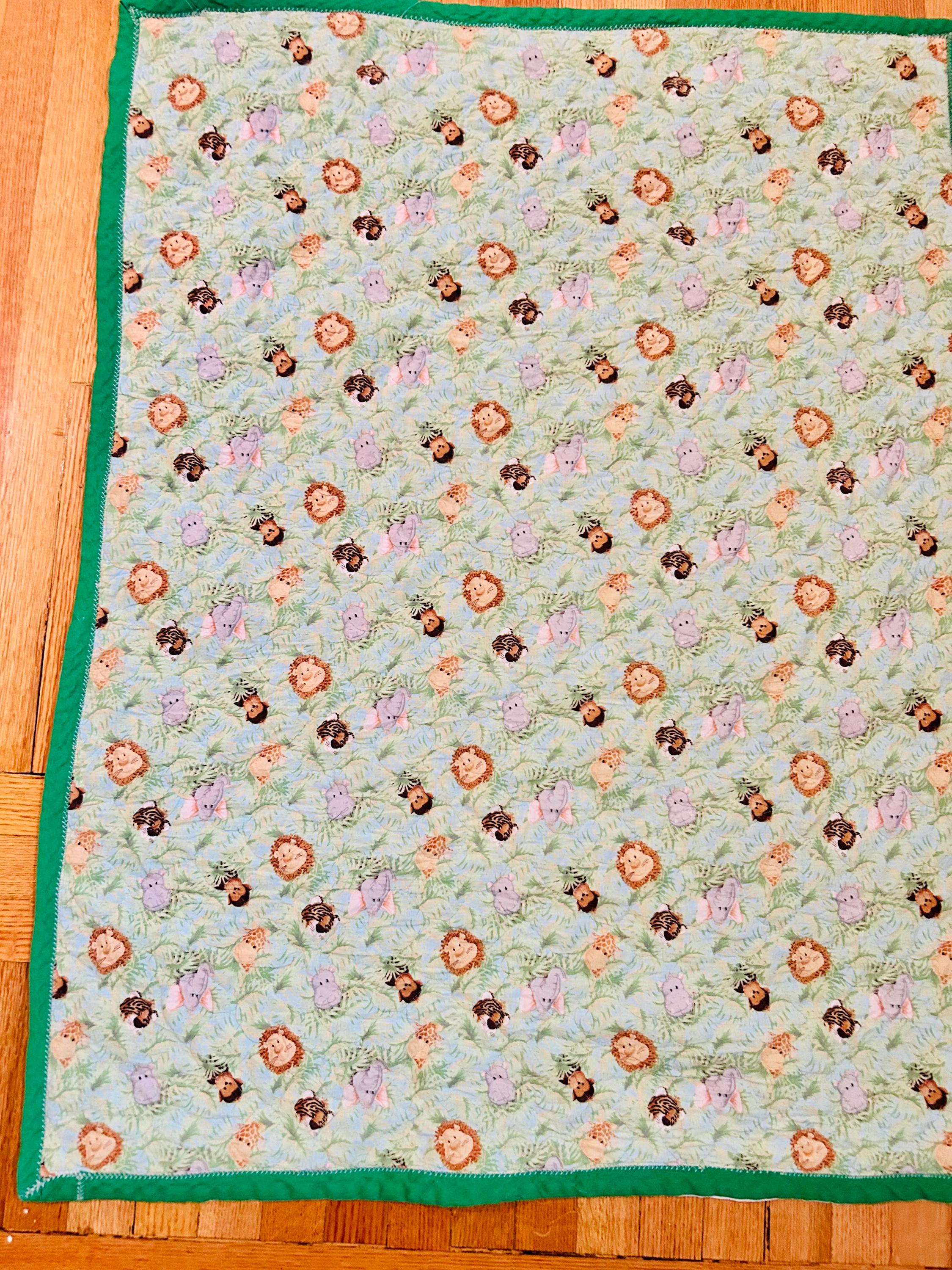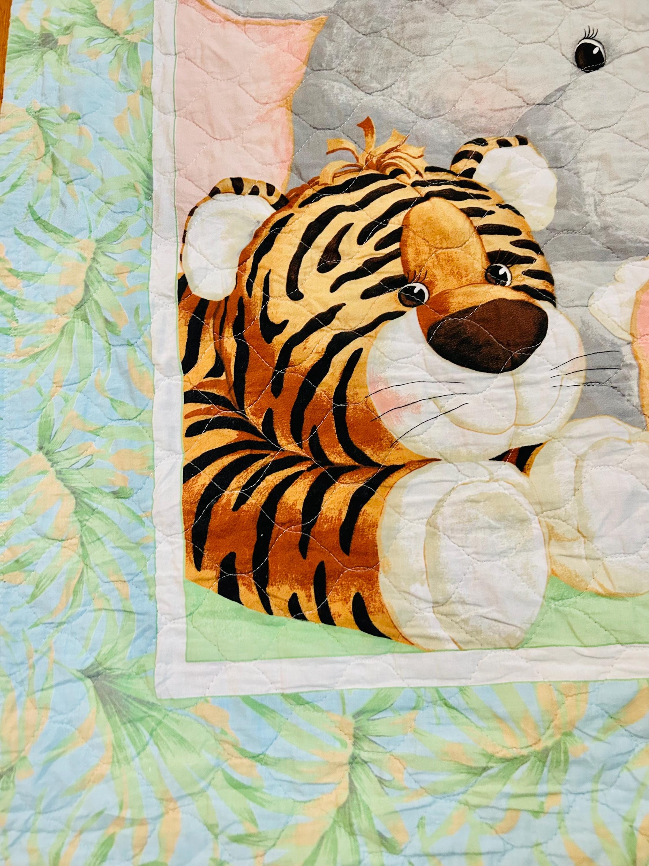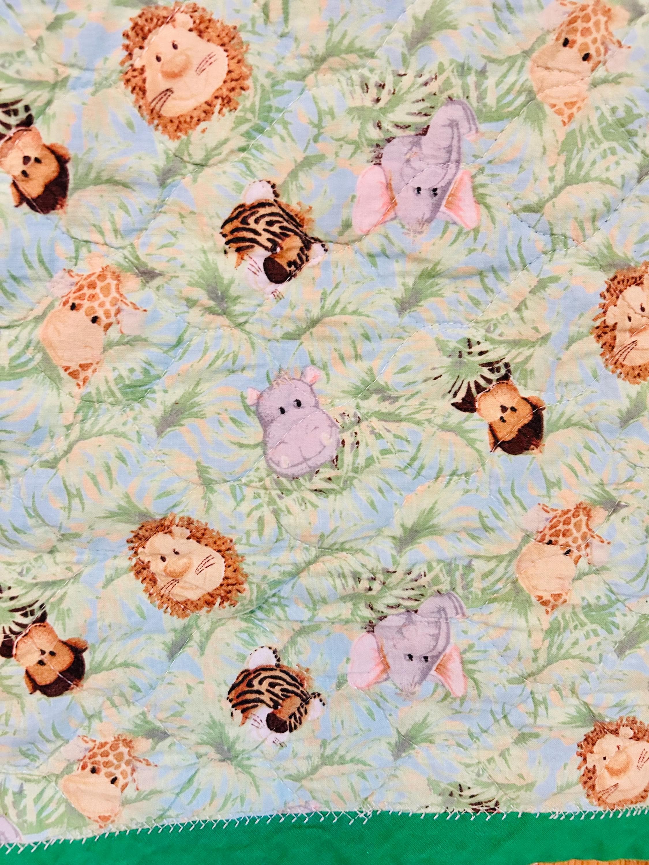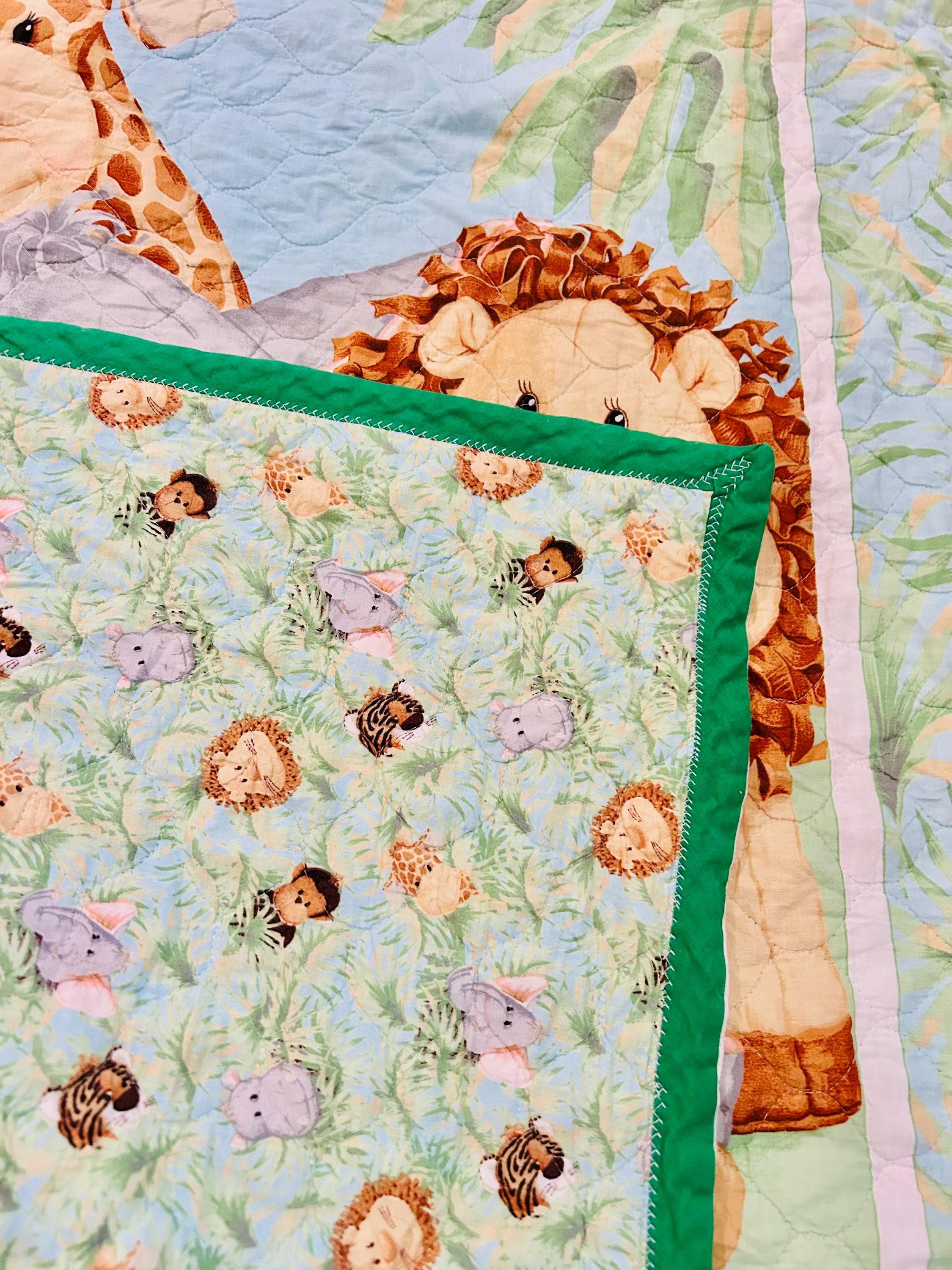 Details: • Size: 32” x 42” • Era: Late 1990s–Early 2000s • Construction: Machine pieced and machine quilted • Fabrics: Cotton prints • Backing: Coordinating jungle animal print • Binding: Green machine-stitched binding • Condition: Excellent vintage condition with no issues noted.