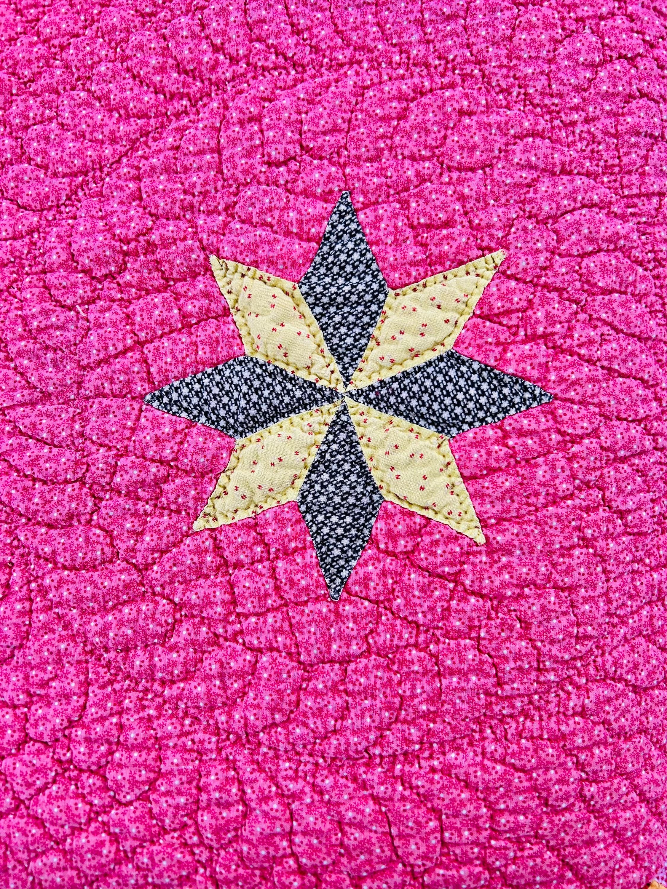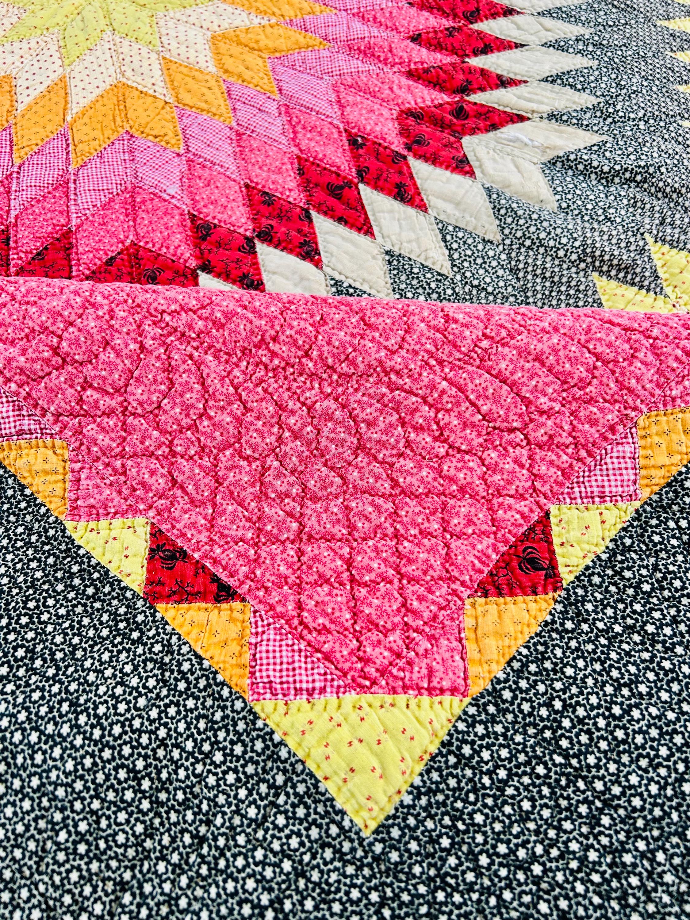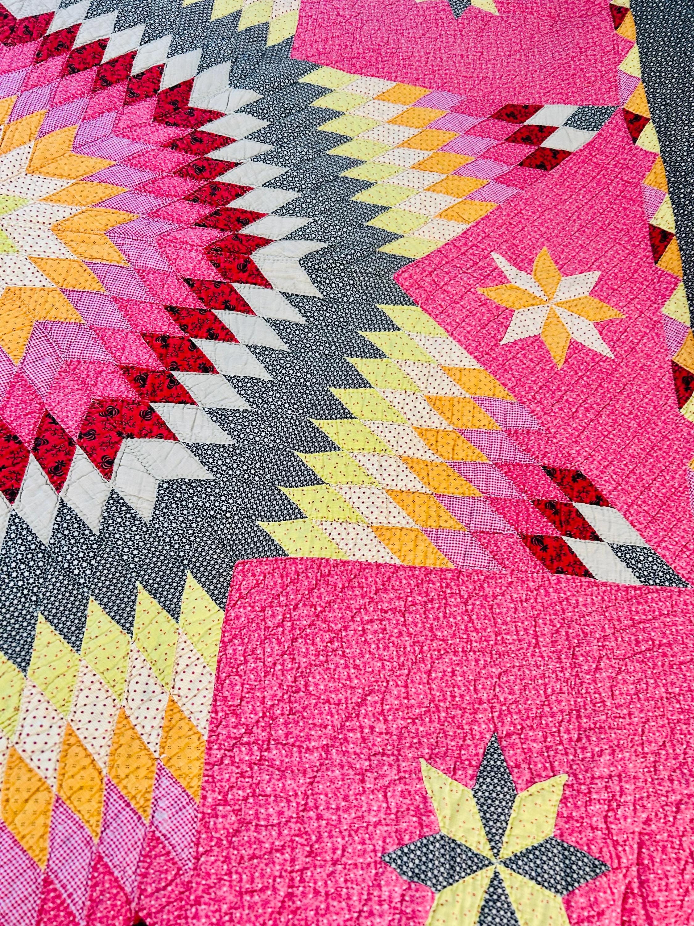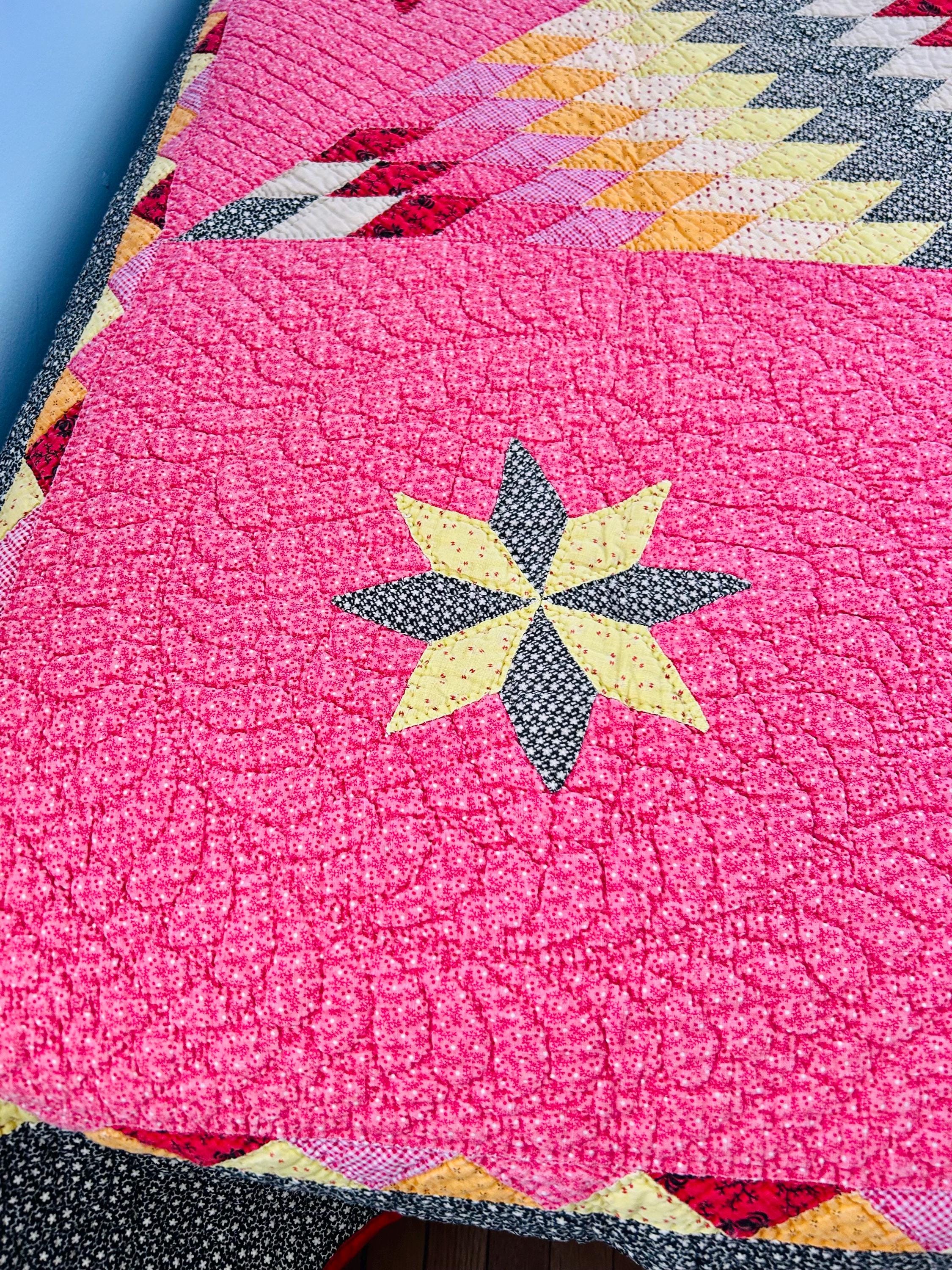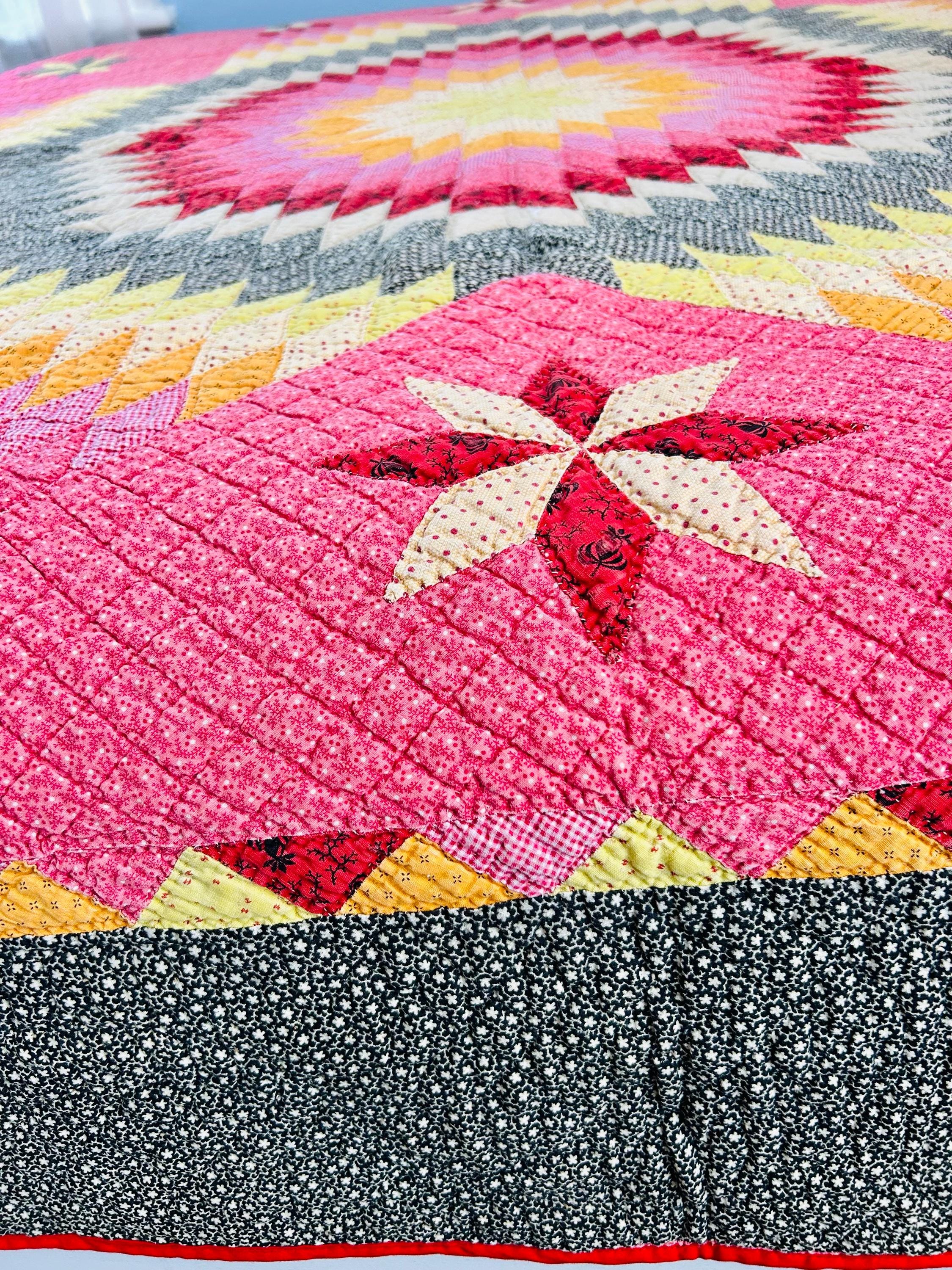 This is a breathtaking work of art 1930s Lone Star (Star of Bethlehem) quilt that features a striking 8-point Lone Star centered on a soft "Anniversary Pink" background with eight-point stars placed around it. The stars are meticulously hand-pieced using vibrant butter yellows, orchid lavenders, and "Nile Green" calicos. There are also charming 1930s "shirting" prints and tiny floral patterns characteristic of the era. The four-sided border is a black & white geometric print that has been hand-quilted in sweeping feathers.