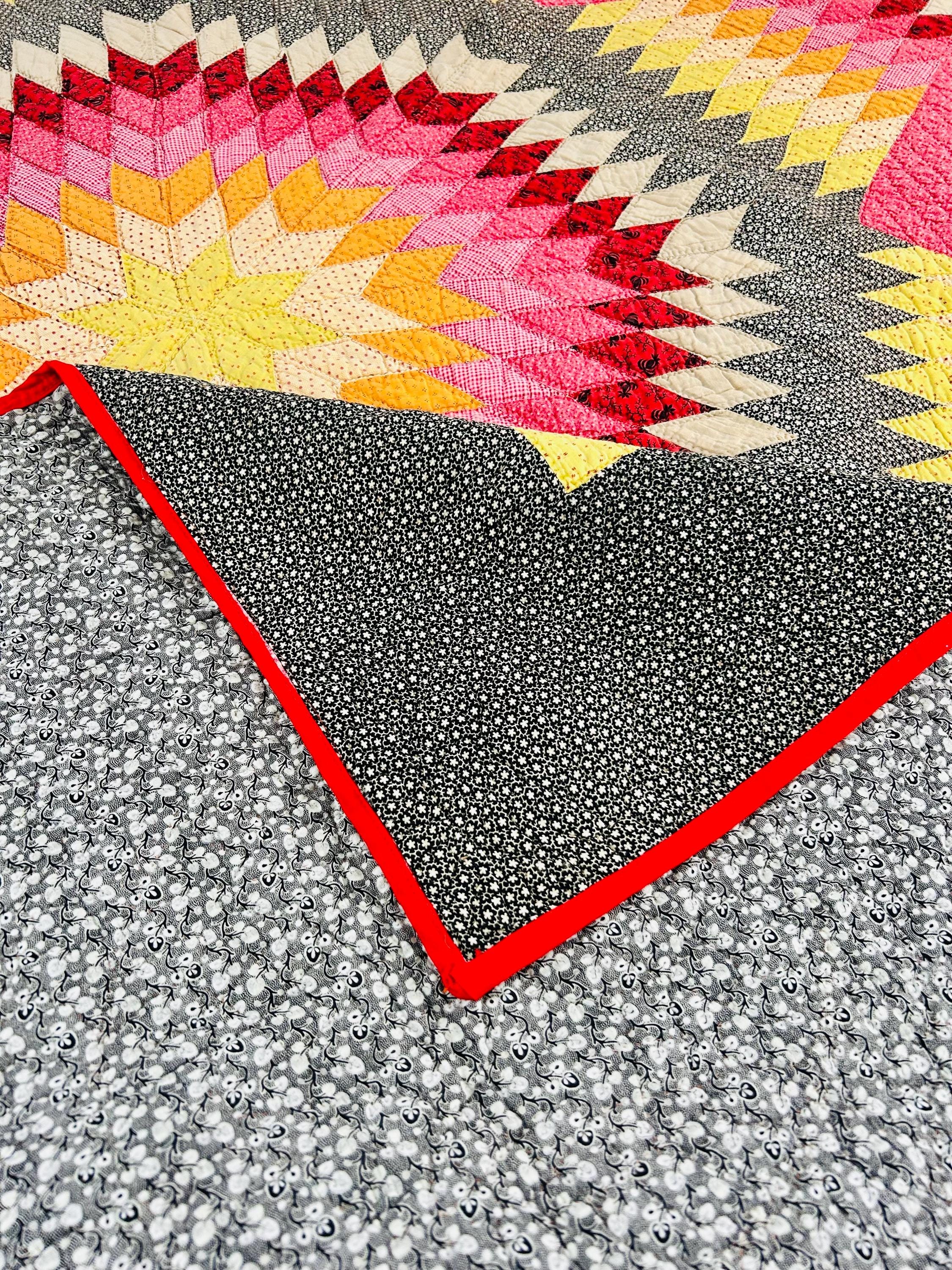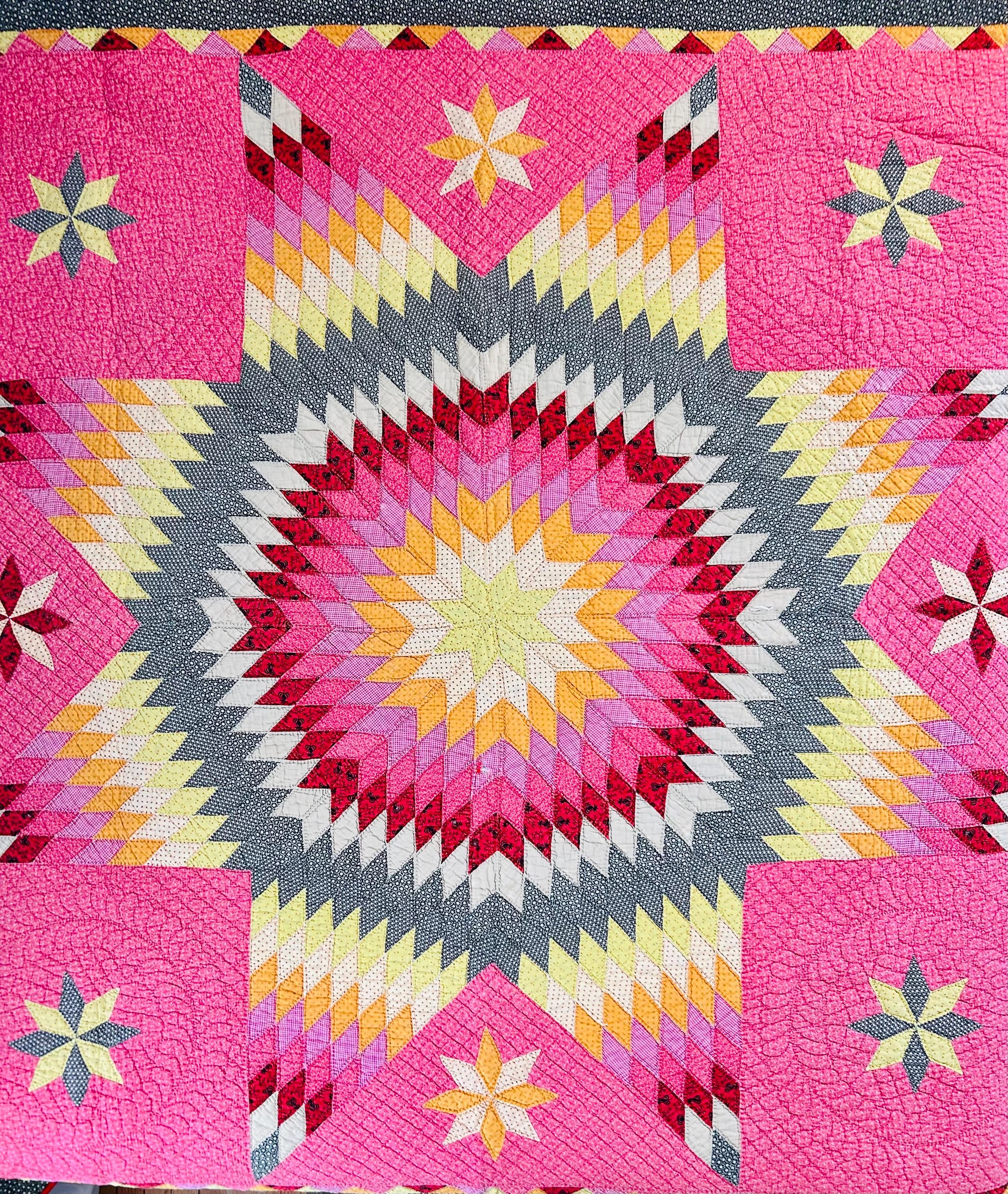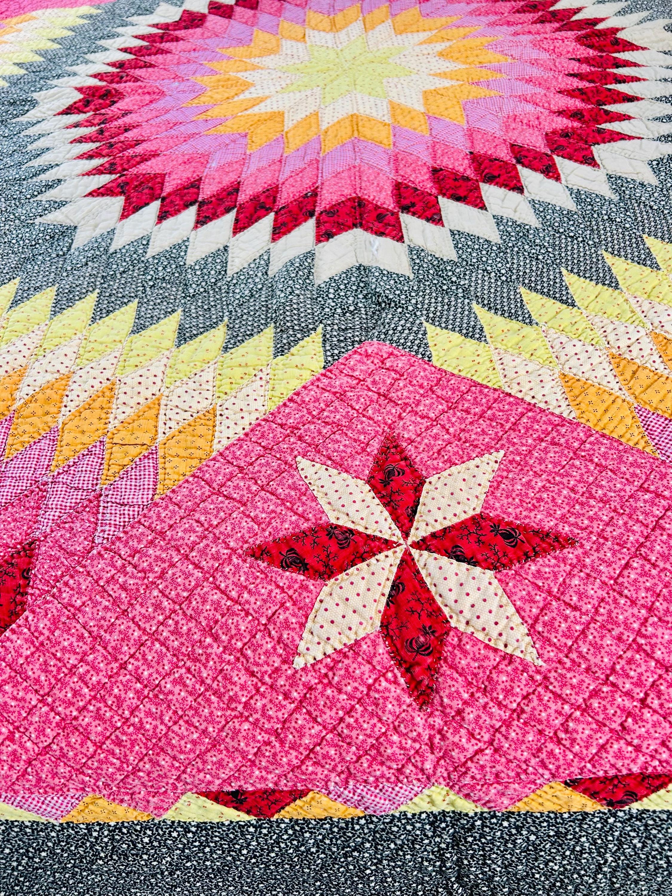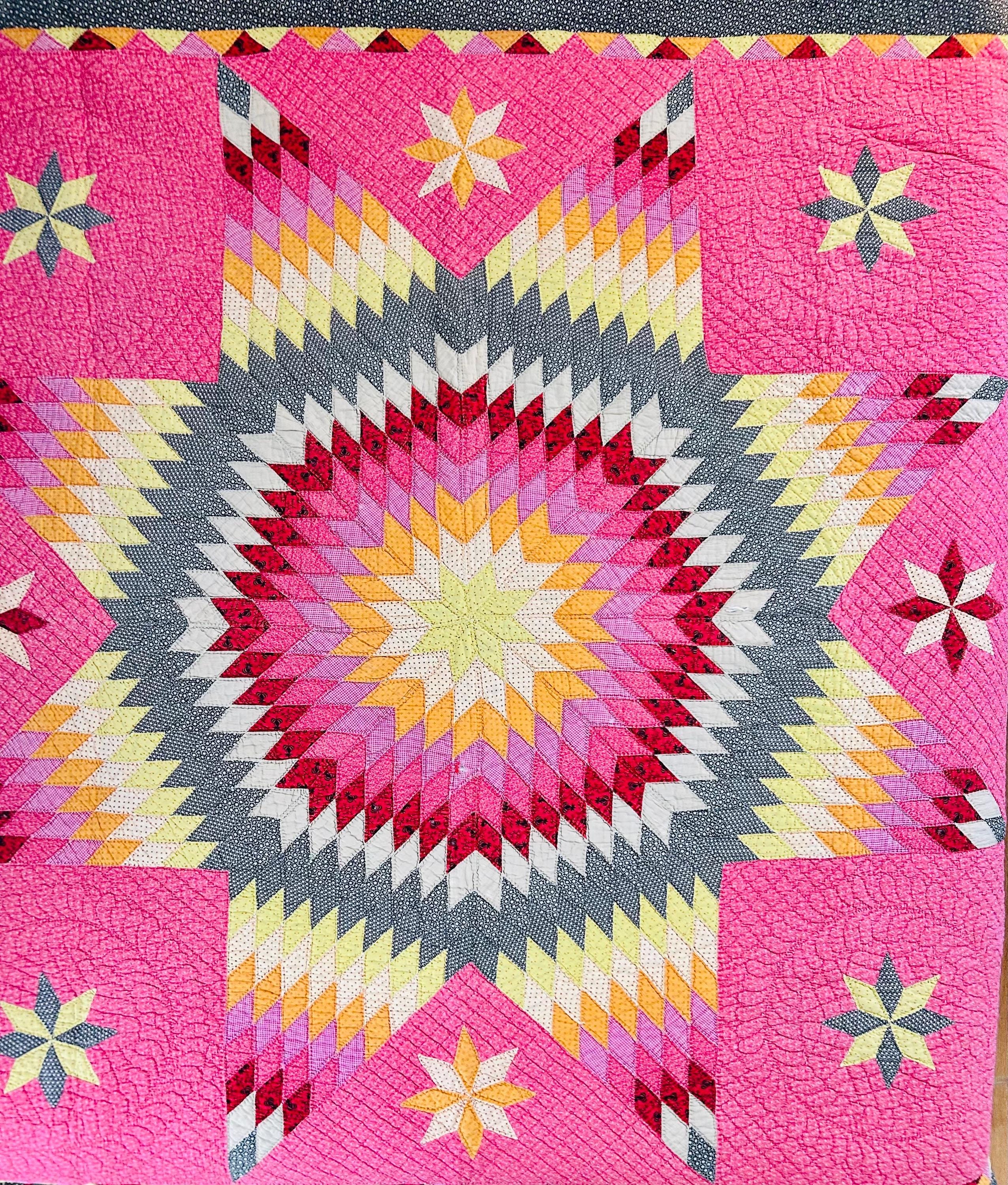 This is a breathtaking work of art 1930s Lone Star (Star of Bethlehem) quilt that features a striking 8-point Lone Star centered on a soft "Anniversary Pink" background with eight-point stars placed around it. The stars are meticulously hand-pieced using vibrant butter yellows, orchid lavenders, and "Nile Green" calicos. There are also charming 1930s "shirting" prints and tiny floral patterns characteristic of the era. The four-sided border is a black & white geometric print that has been hand-quilted in sweeping feathers.