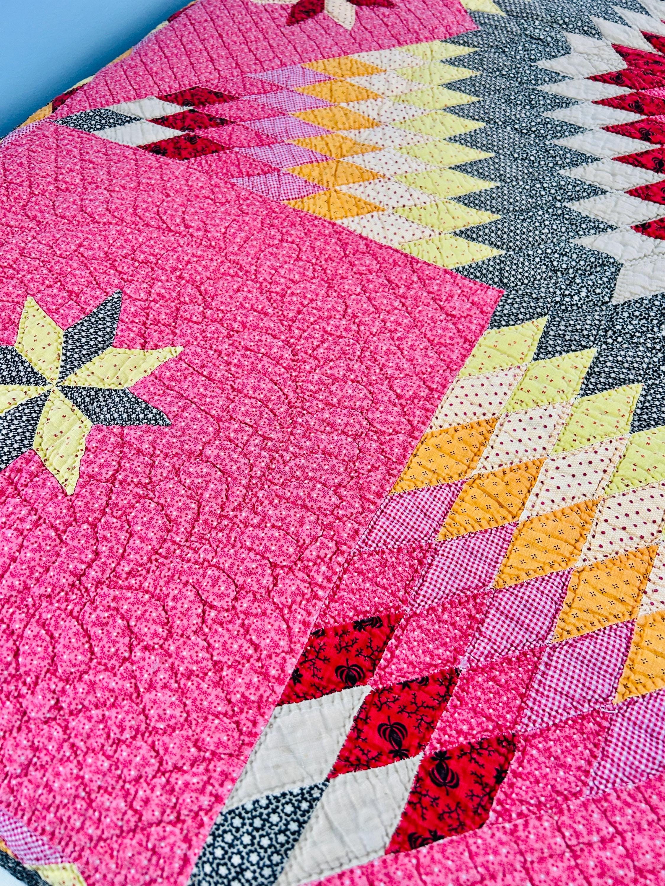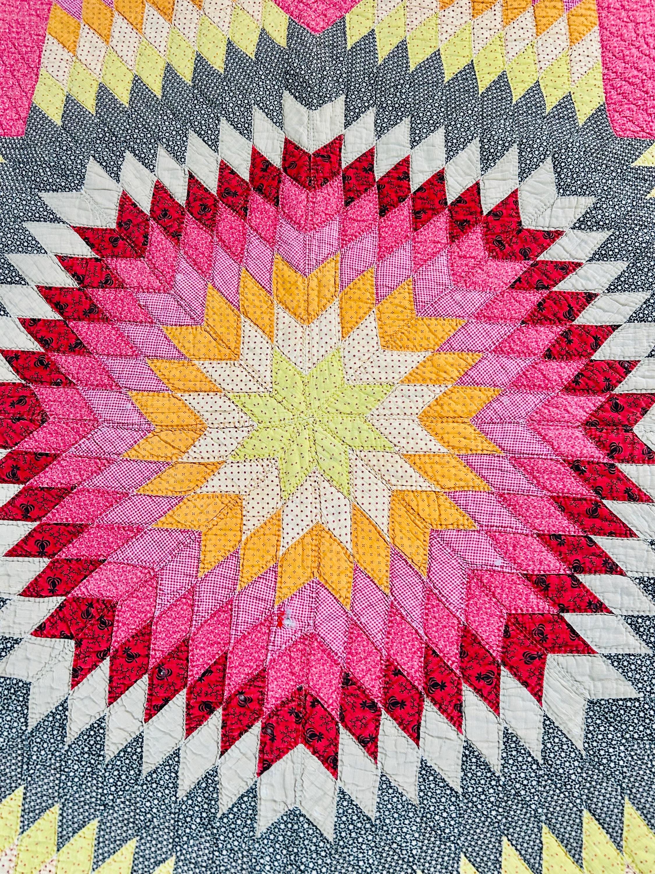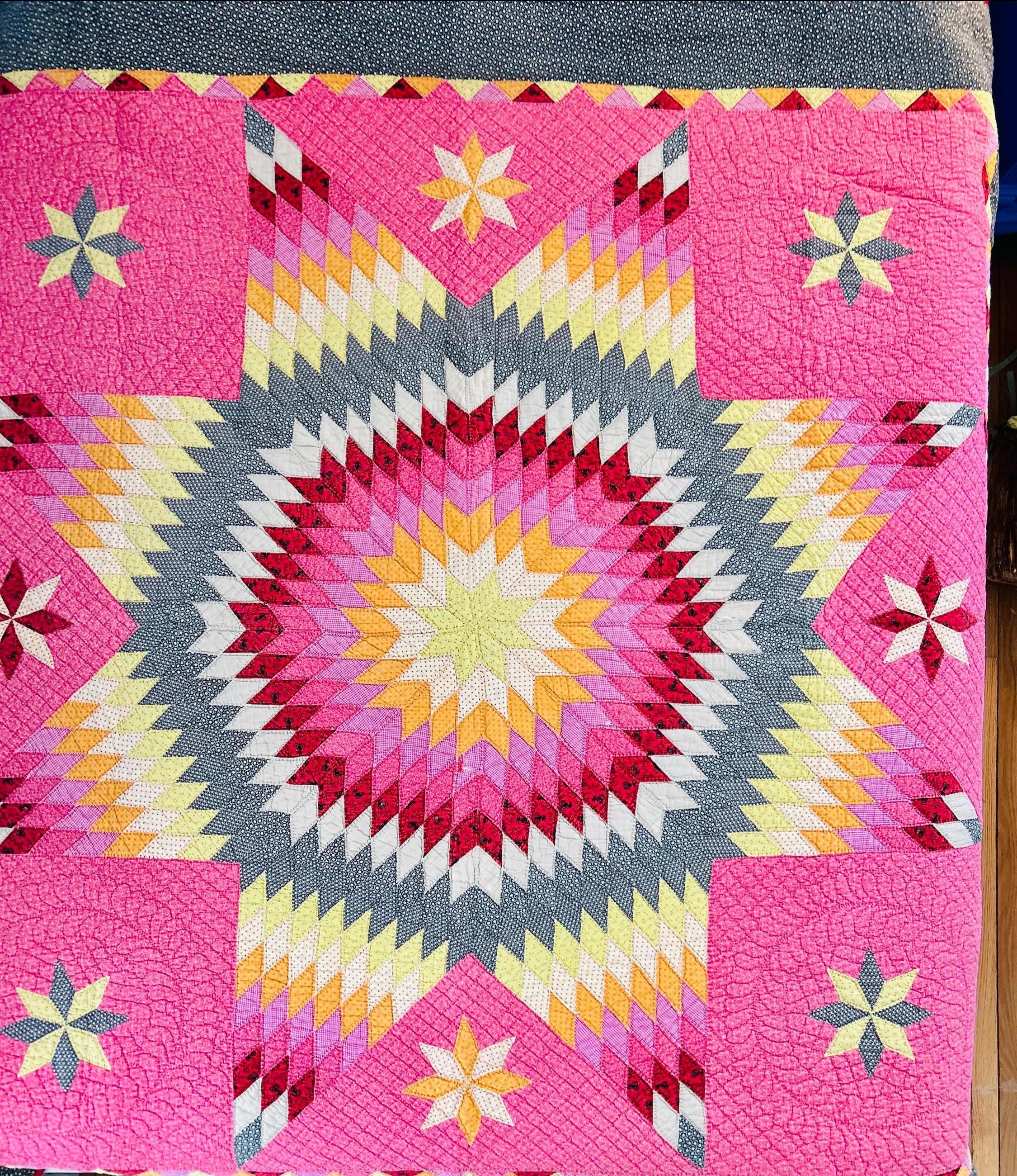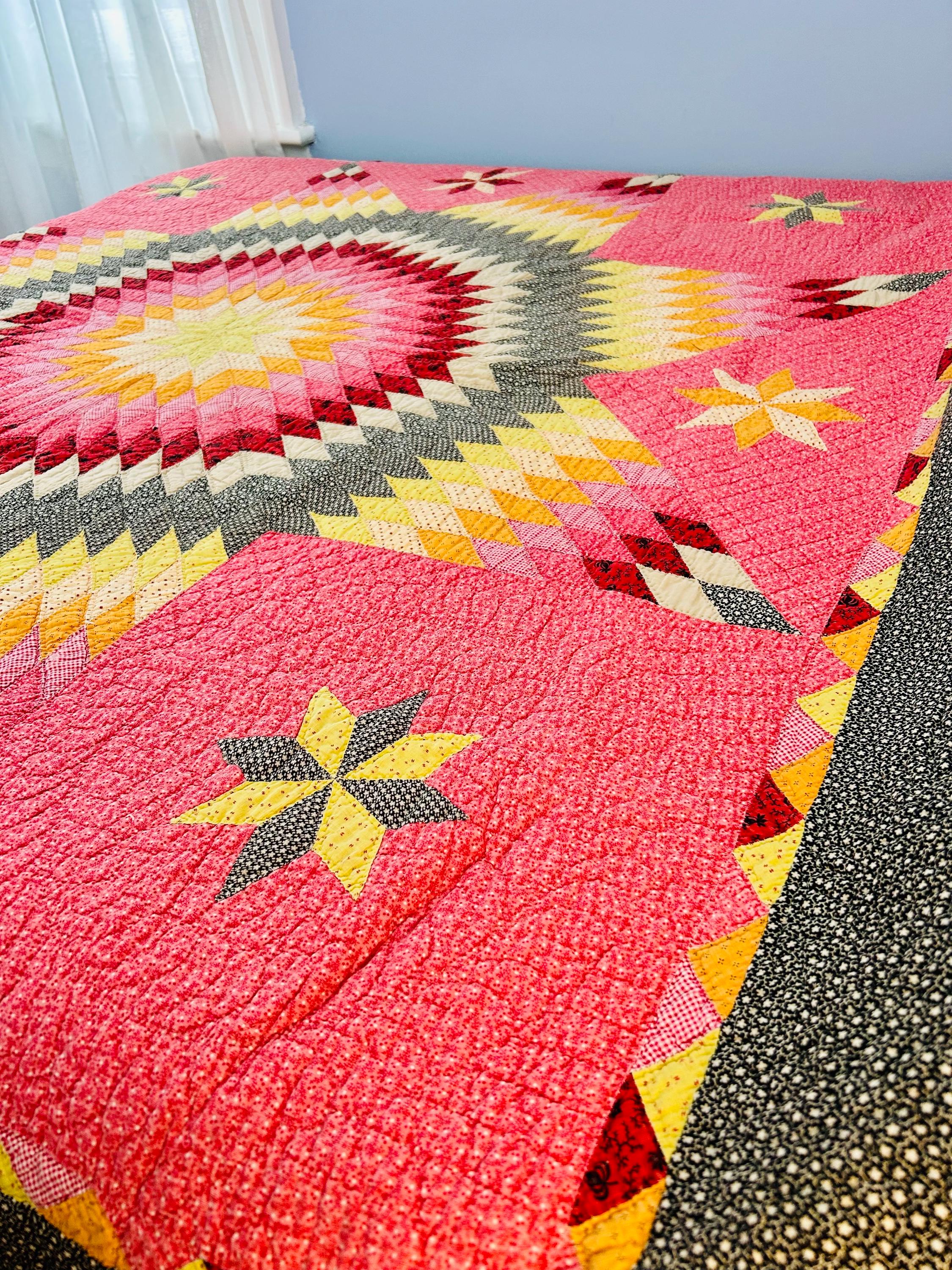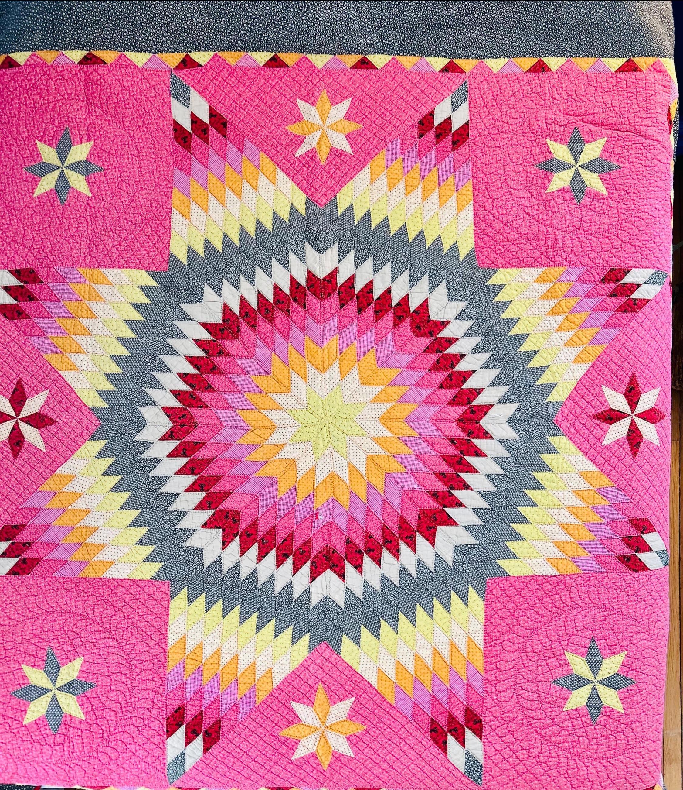 This is a breathtaking work of art 1930s Lone Star (Star of Bethlehem) quilt that features a striking 8-point Lone Star centered on a soft "Anniversary Pink" background with eight-point stars placed around it. The stars are meticulously hand-pieced using vibrant butter yellows, orchid lavenders, and "Nile Green" calicos. There are also charming 1930s "shirting" prints and tiny floral patterns characteristic of the era. The four-sided border is a black & white geometric print that has been hand-quilted in sweeping feathers.