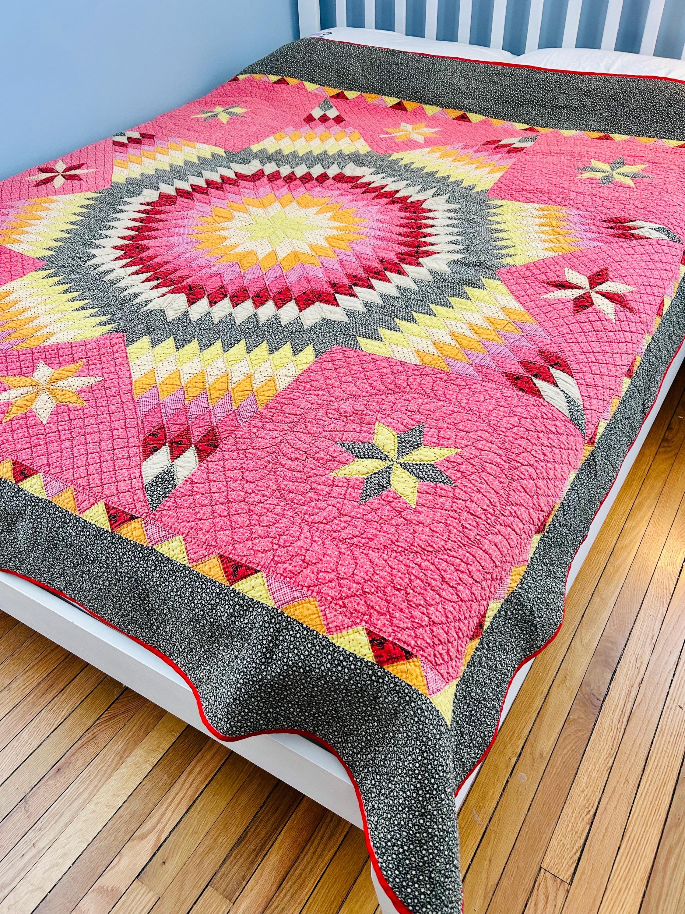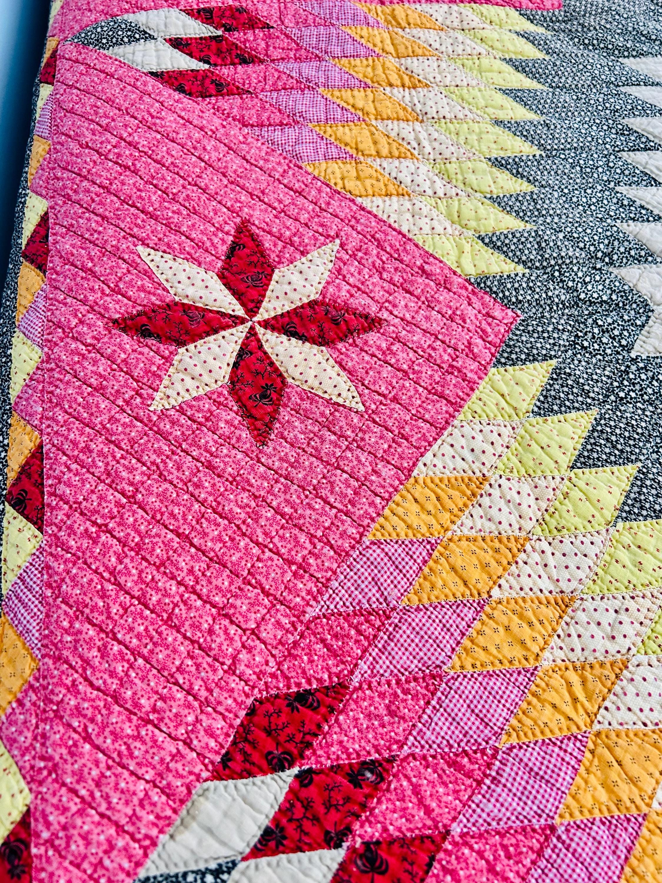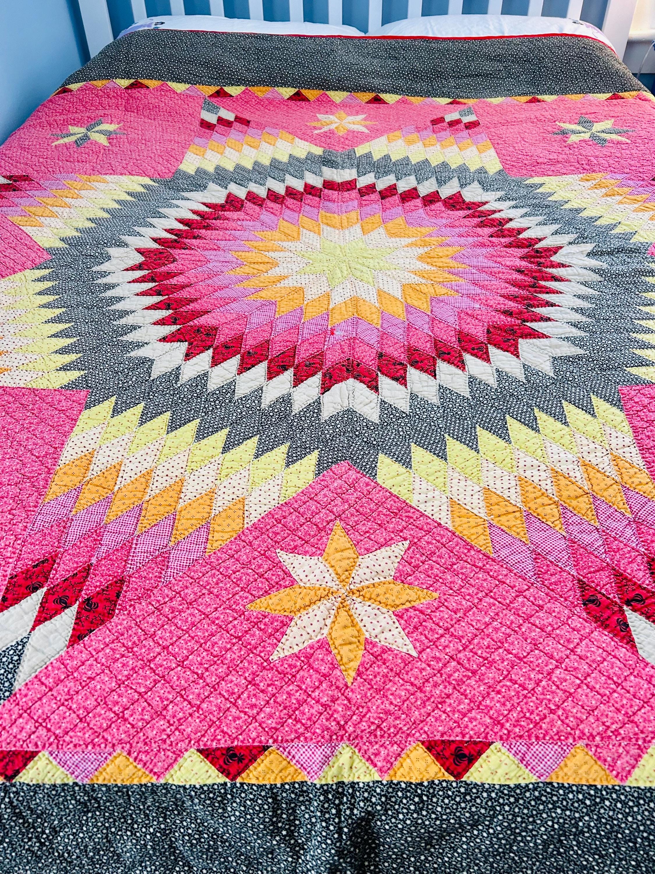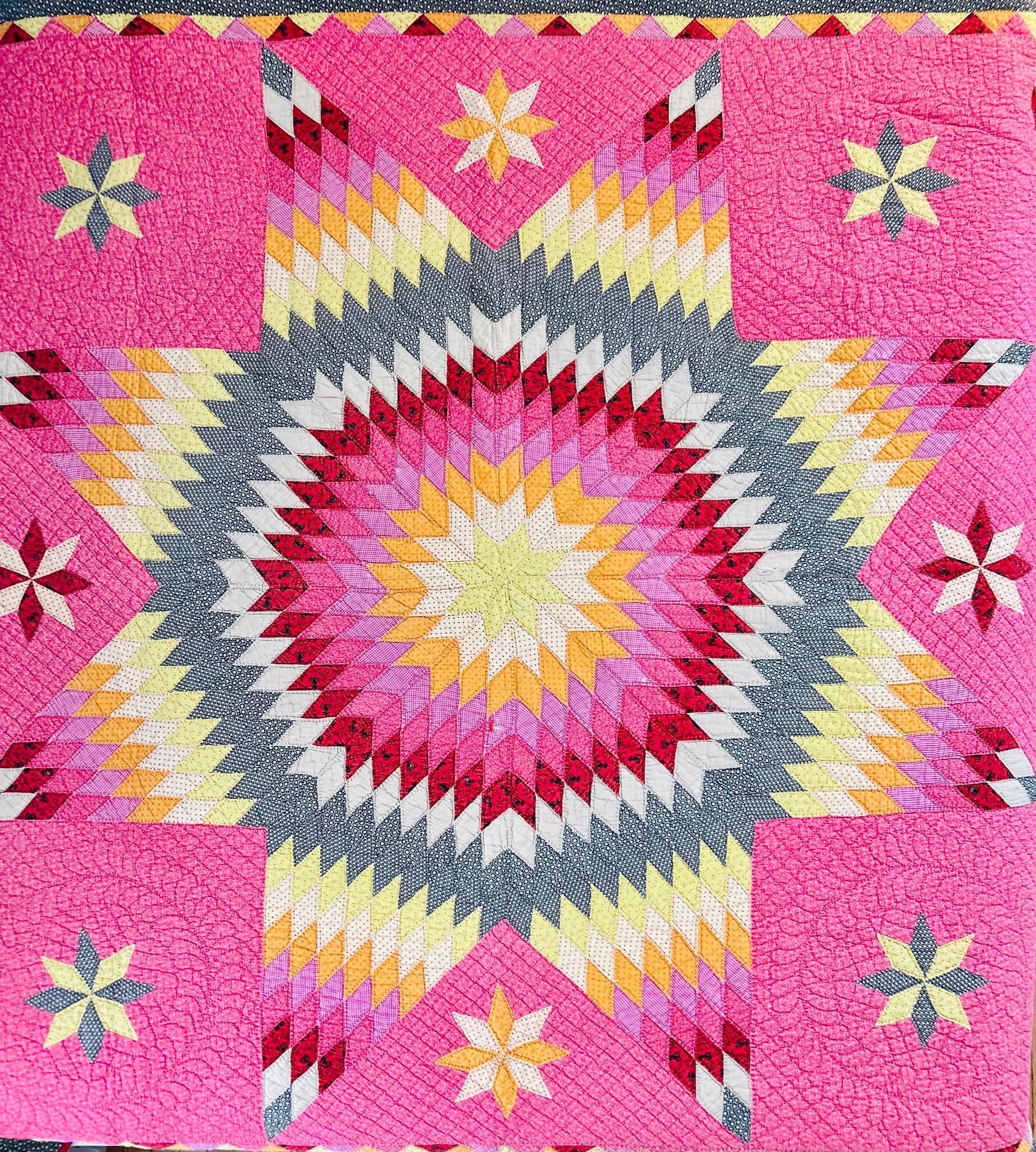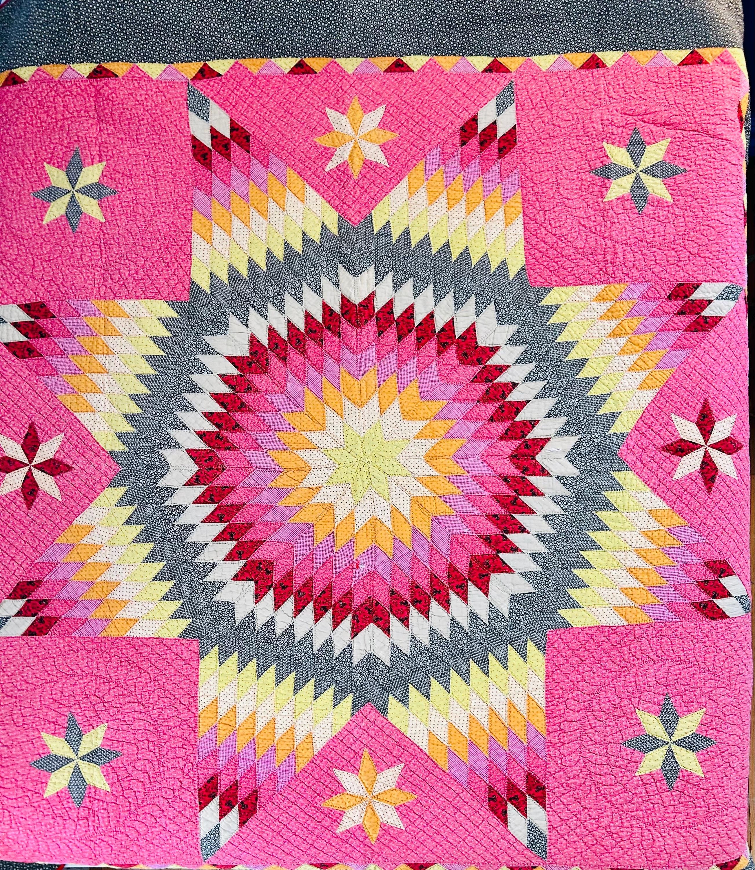 This is a breathtaking work of art 1930s Lone Star (Star of Bethlehem) quilt that features a striking 8-point Lone Star centered on a soft "Anniversary Pink" background with eight-point stars placed around it. The stars are meticulously hand-pieced using vibrant butter yellows, orchid lavenders, and "Nile Green" calicos. There are also charming 1930s "shirting" prints and tiny floral patterns characteristic of the era. The four-sided border is a black & white geometric print that has been hand-quilted in sweeping feathers.