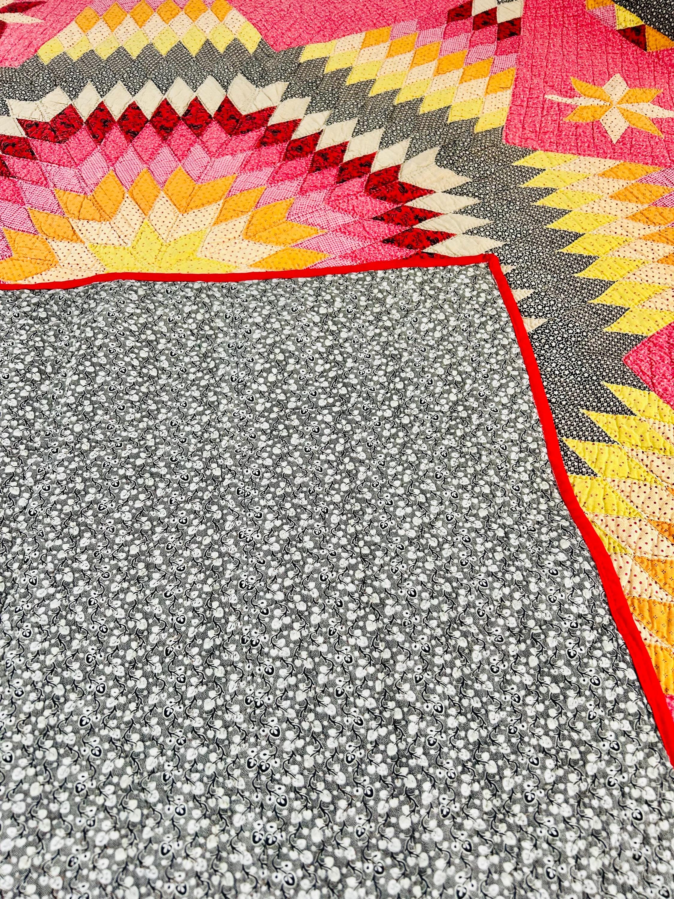The back is a black/grey/white tiny floral while the binding is bright red and has been hand-stitched to both sides. The cotton batting is very lightweight.