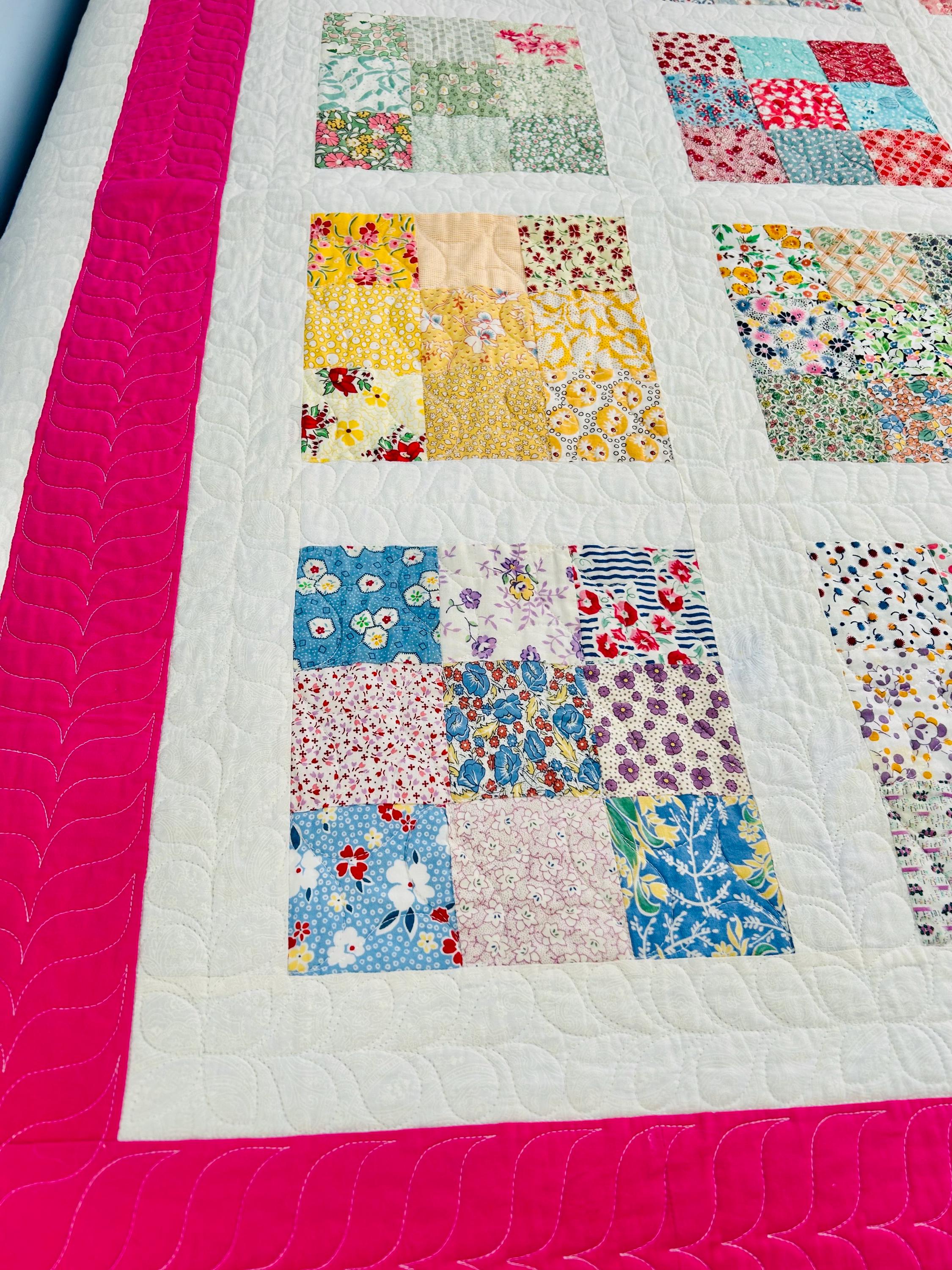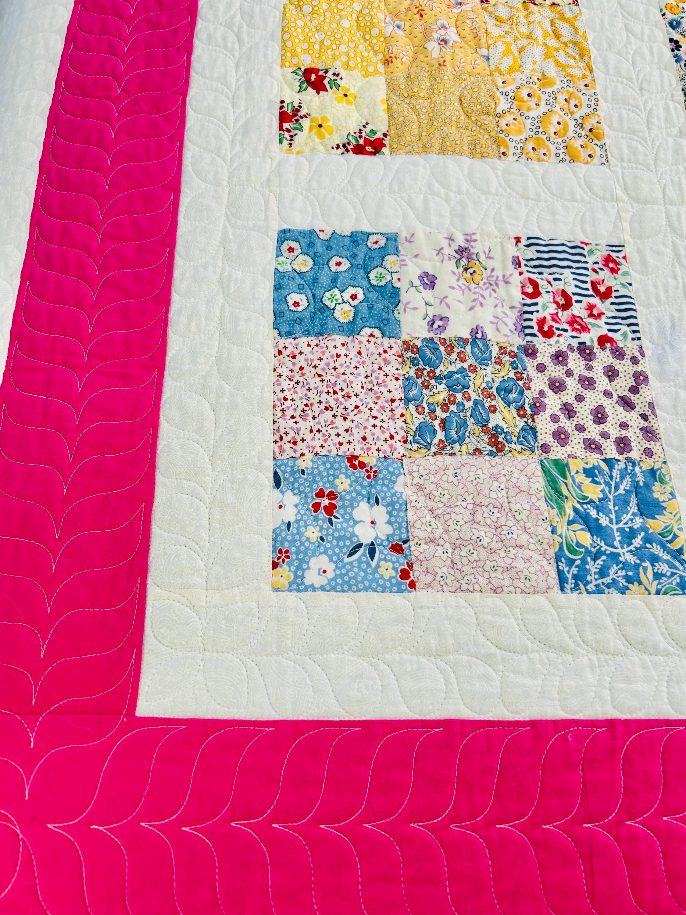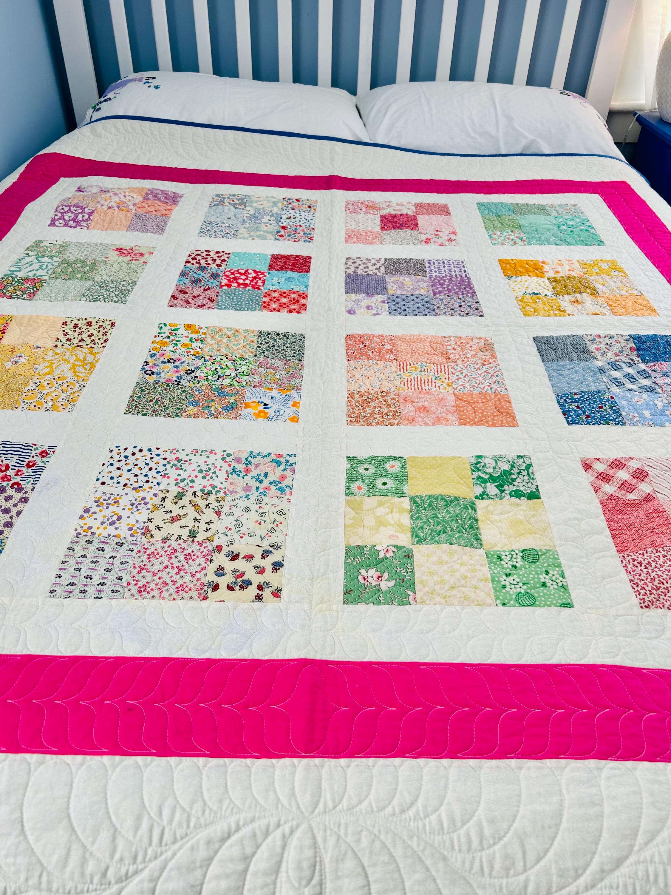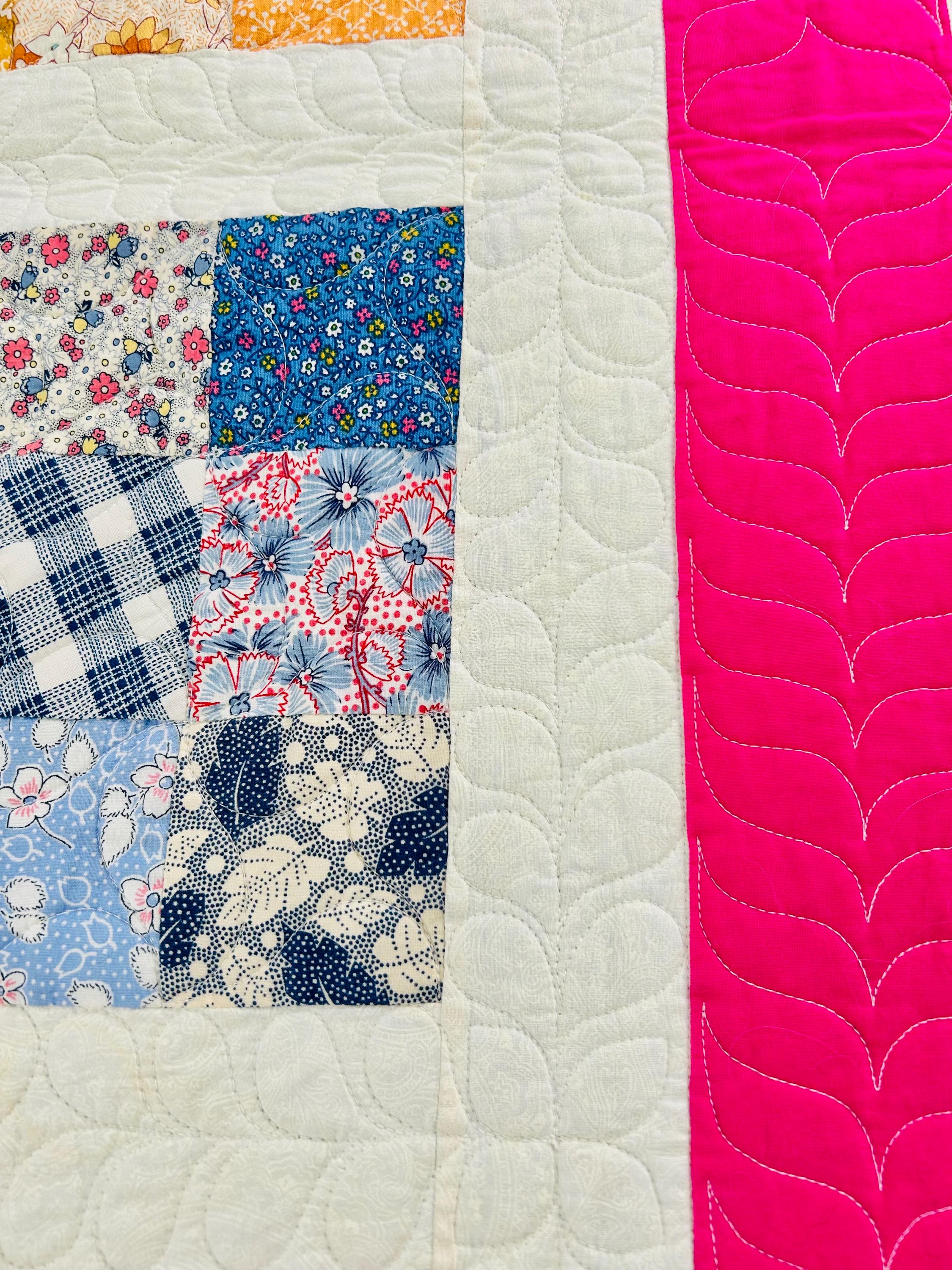 This beautifully crafted nine patch quilt was made in February 2006 and features vibrant patchwork blocks of high-quality cottons framed by a bold fuchsia border and finished with striking blue binding. The quilt has been long arm quilted in three types of elaborate and sweeping feathers along with petals and geometric shapes.