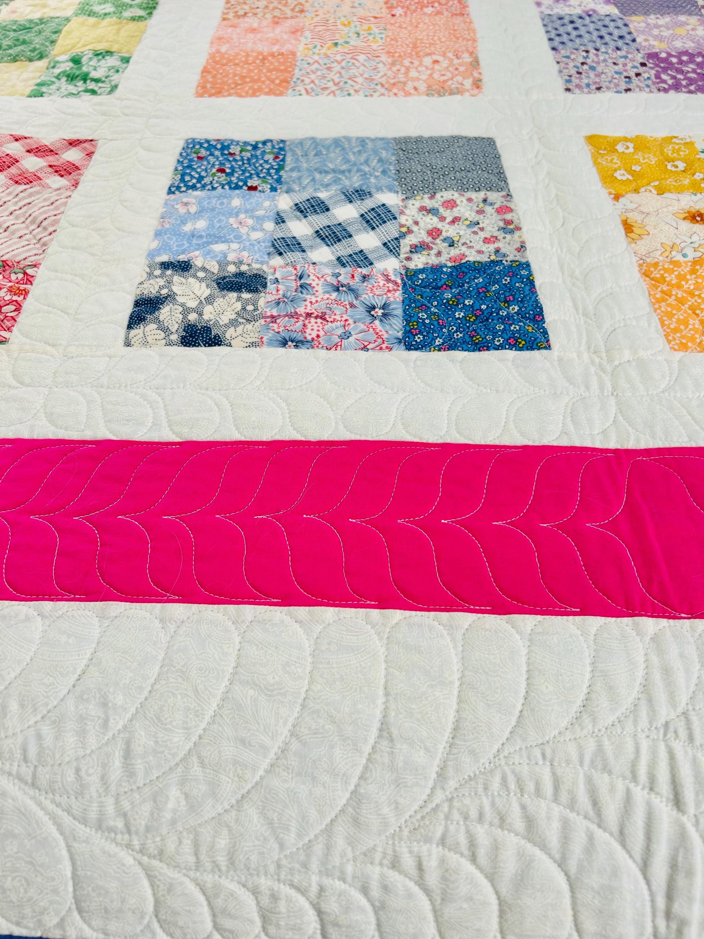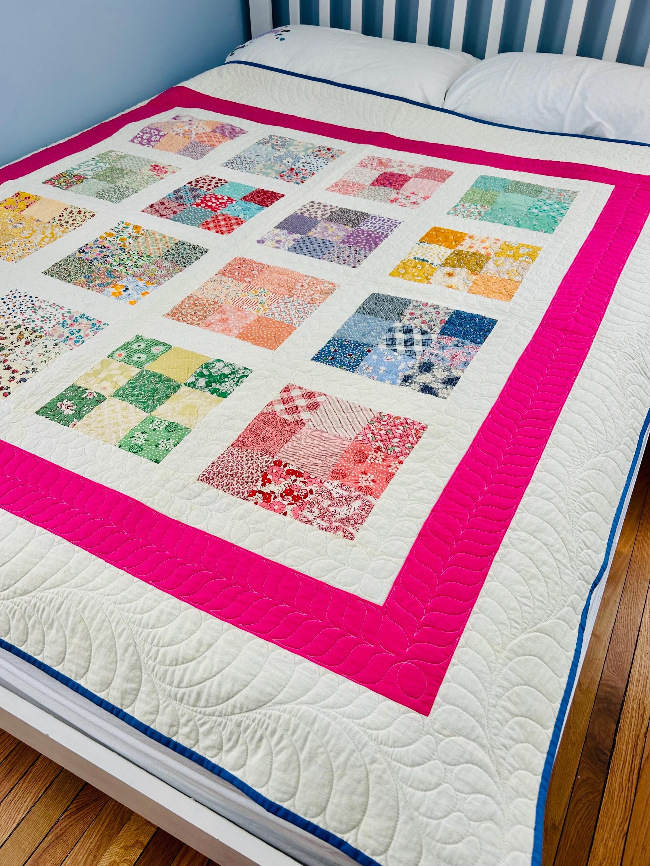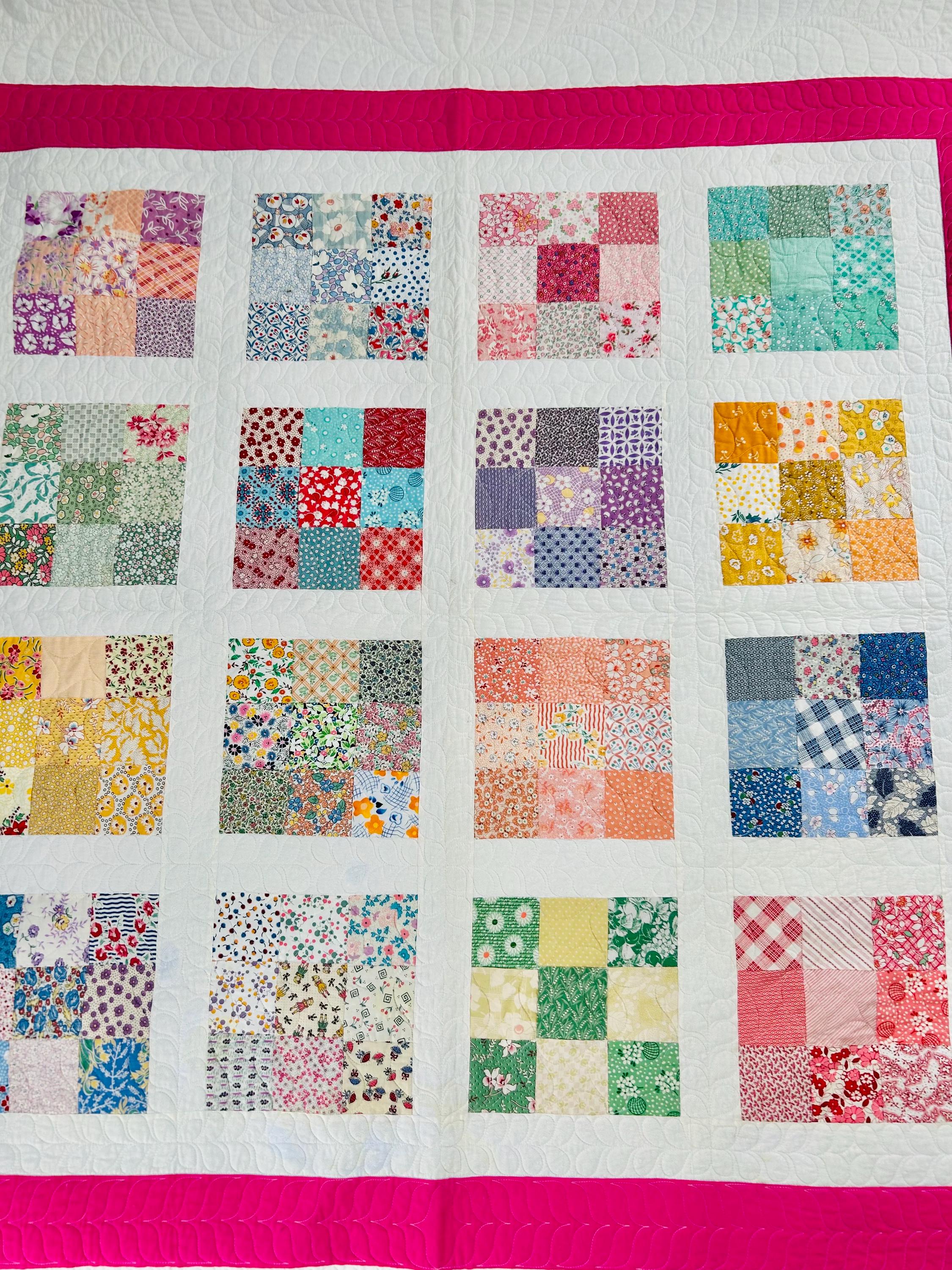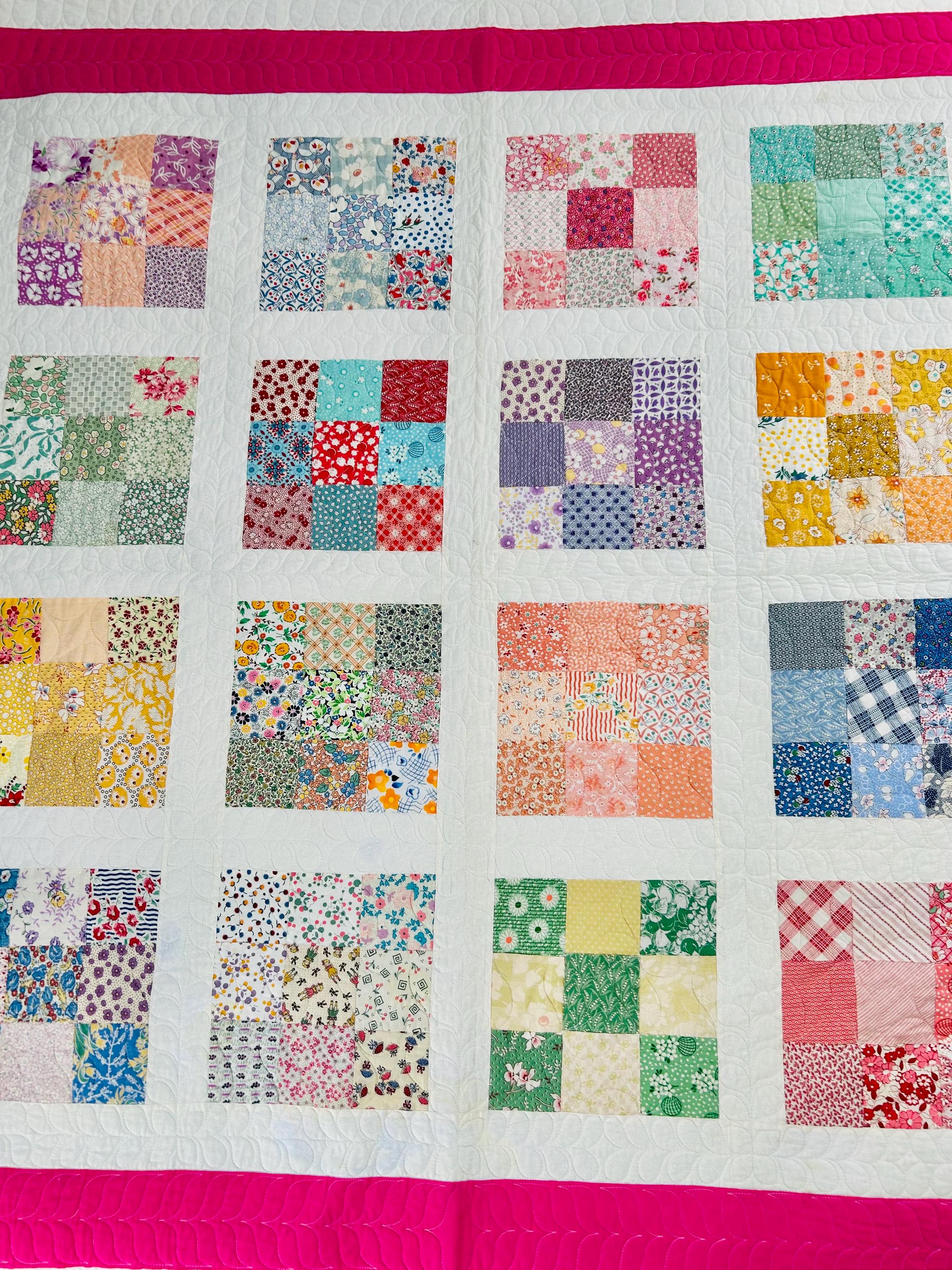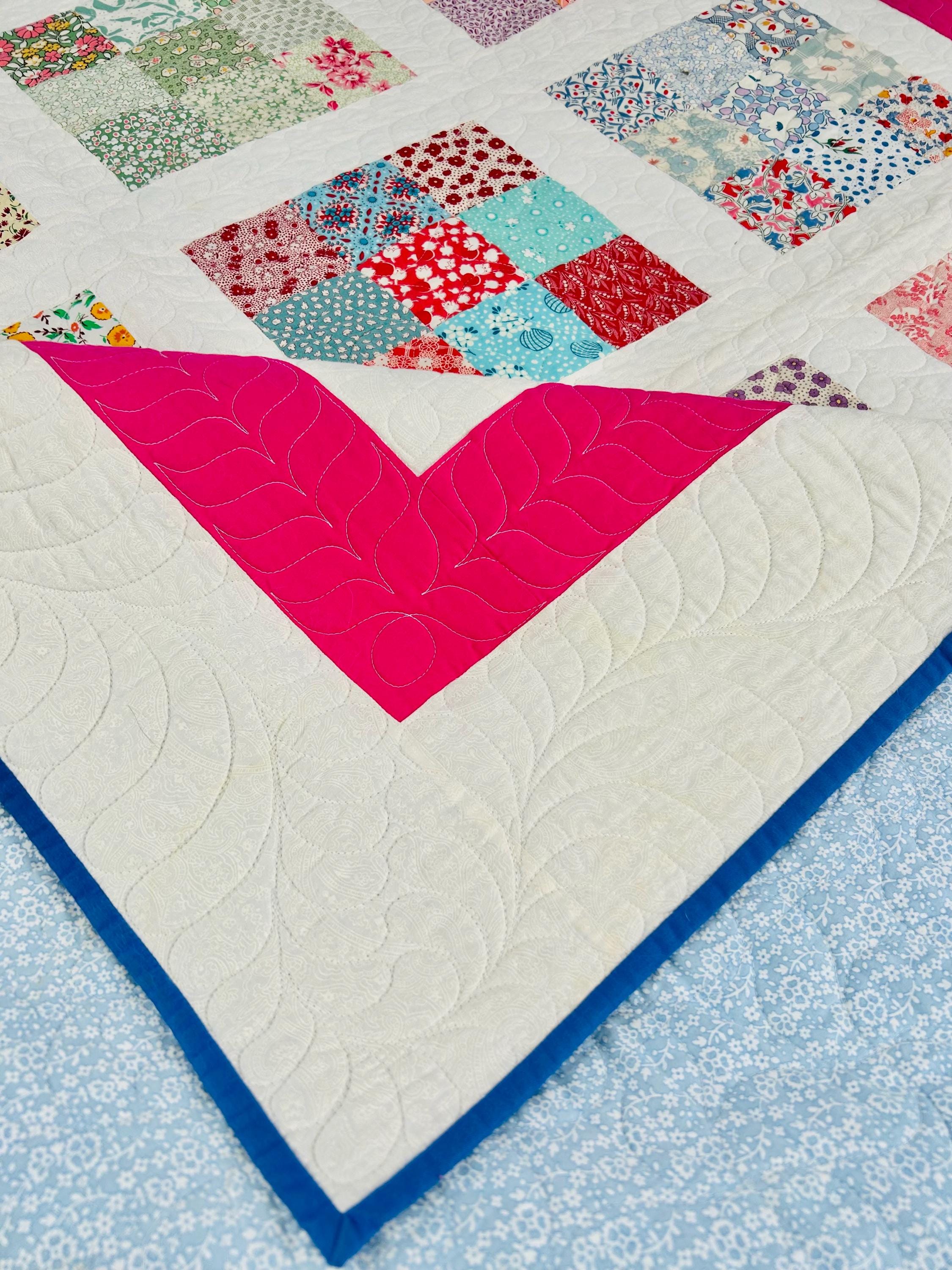 This beautifully crafted nine patch quilt was made in February 2006 and features vibrant patchwork blocks of high-quality cottons framed by a bold fuchsia border and finished with striking blue binding. The quilt has been long arm quilted in three types of elaborate and sweeping feathers along with petals and geometric shapes.