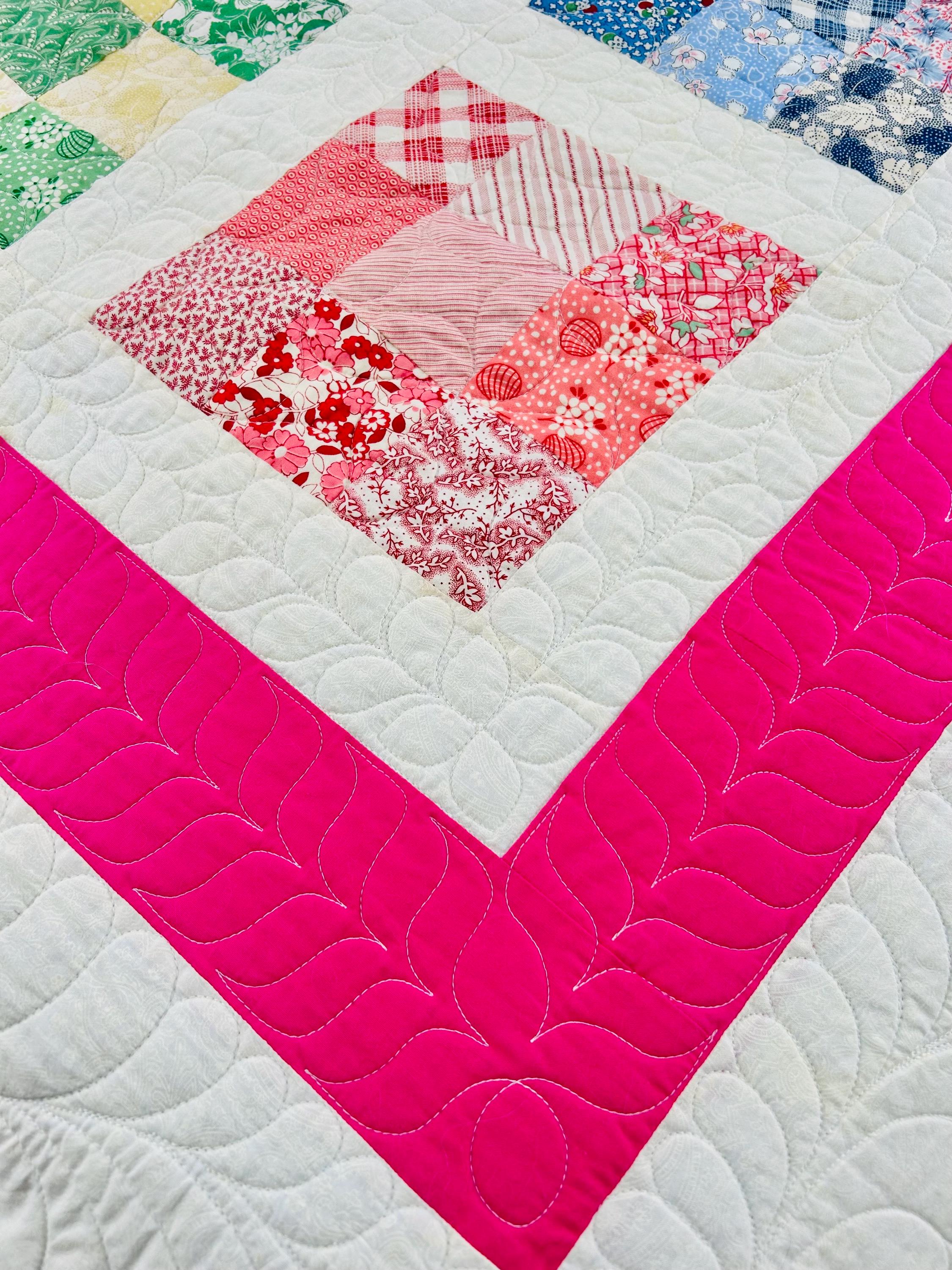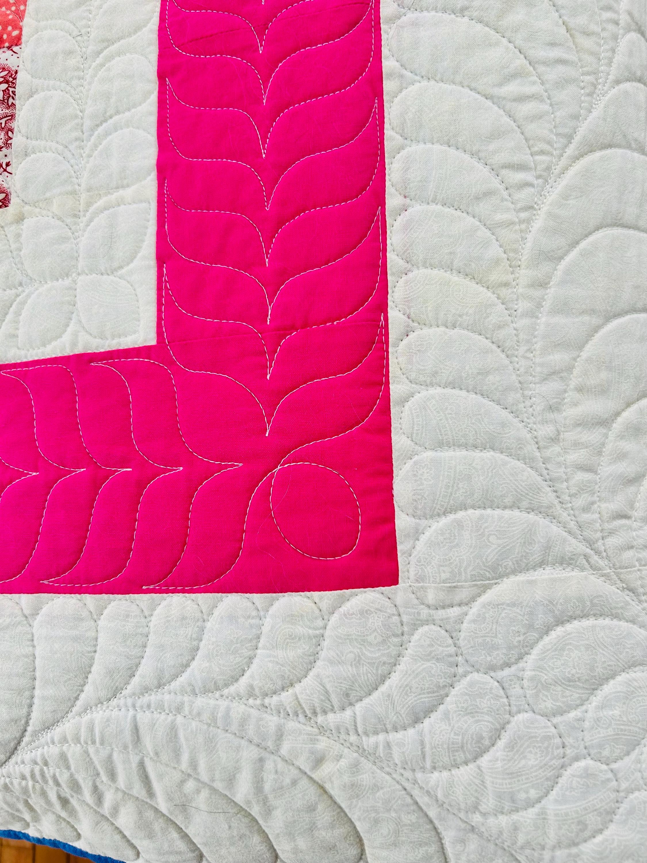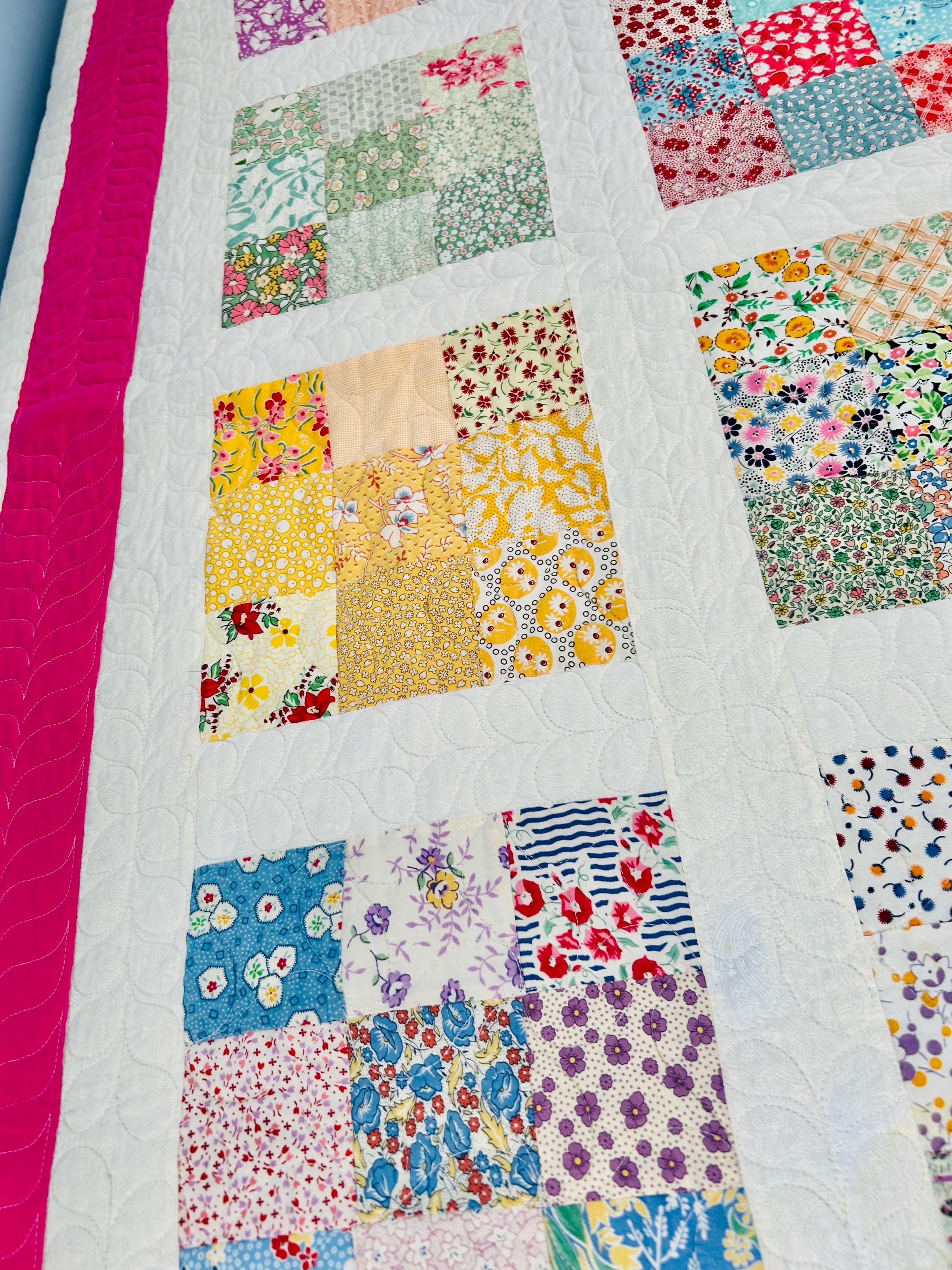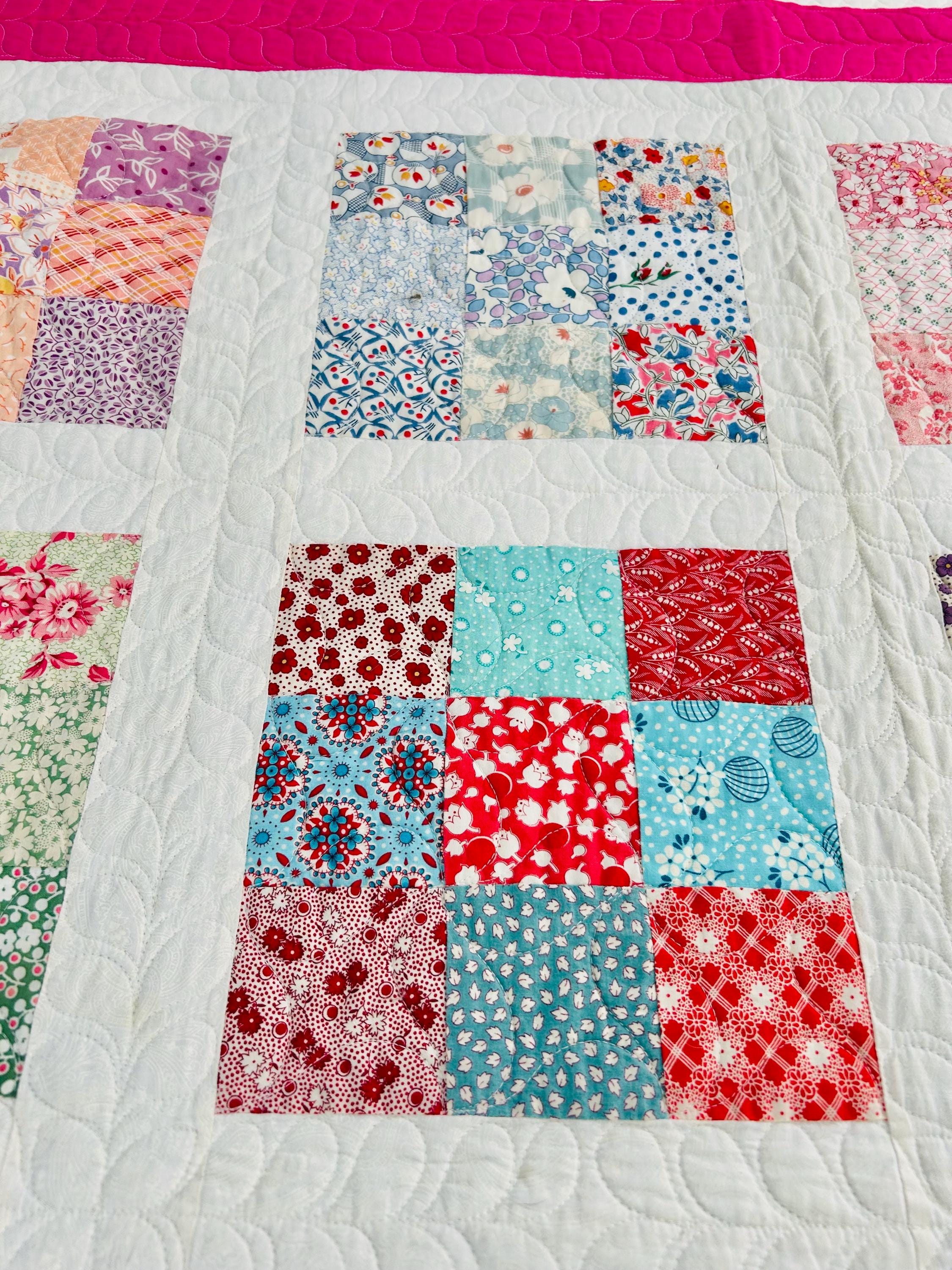 This beautifully crafted nine patch quilt was made in February 2006 and features vibrant patchwork blocks of high-quality cottons framed by a bold fuchsia border and finished with striking blue binding. The quilt has been long arm quilted in three types of elaborate and sweeping feathers along with petals and geometric shapes.