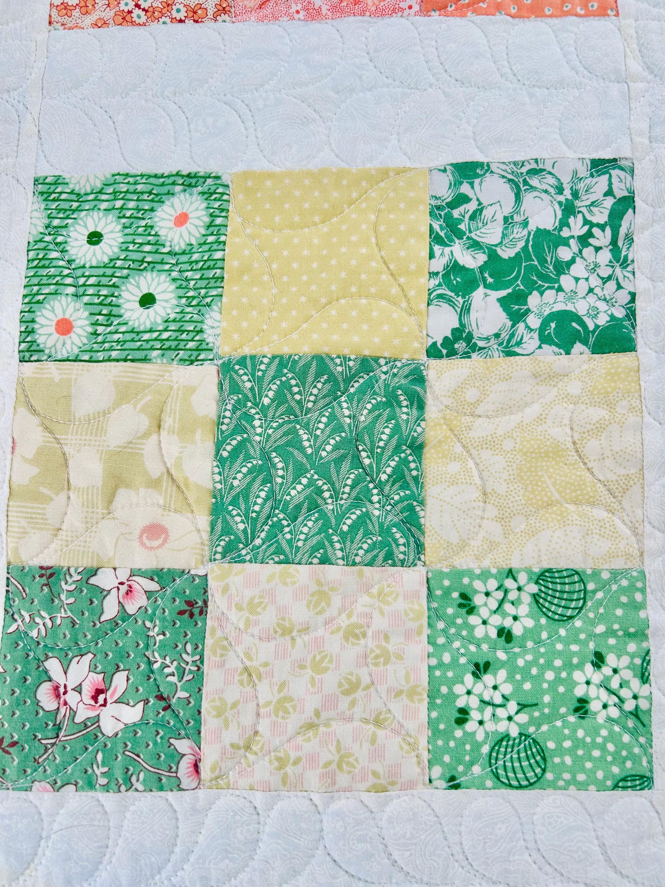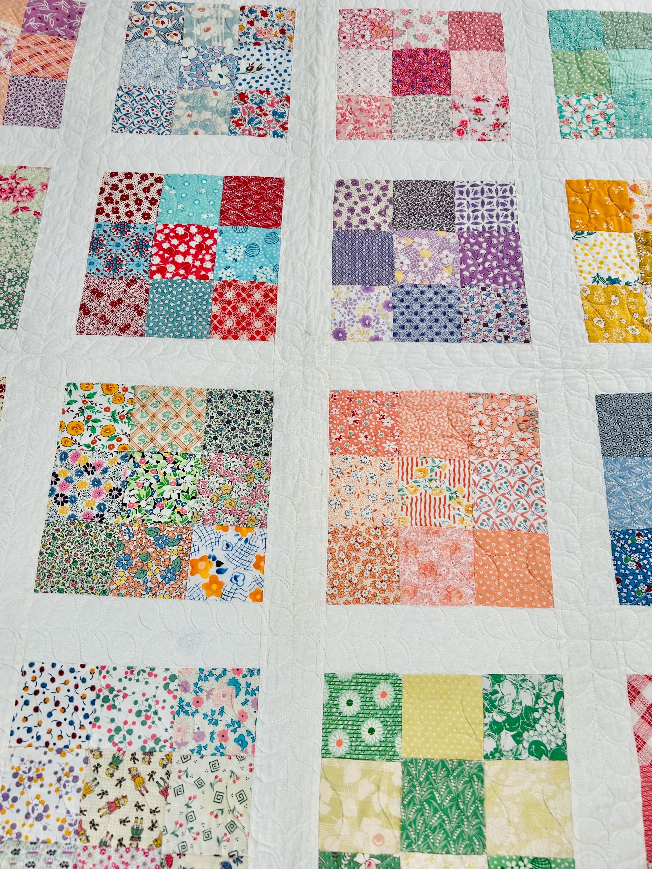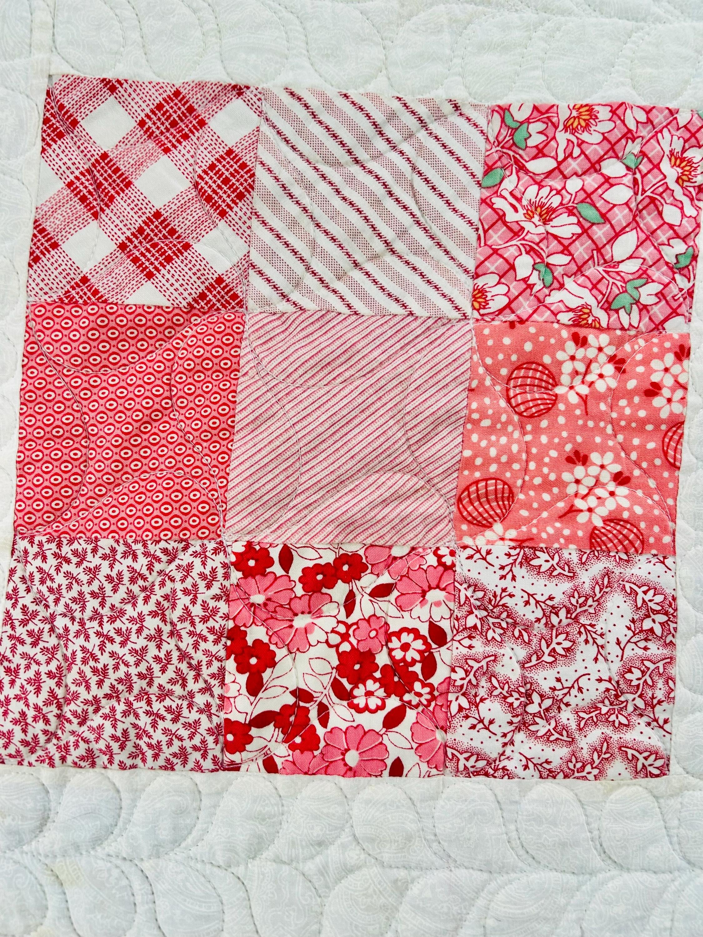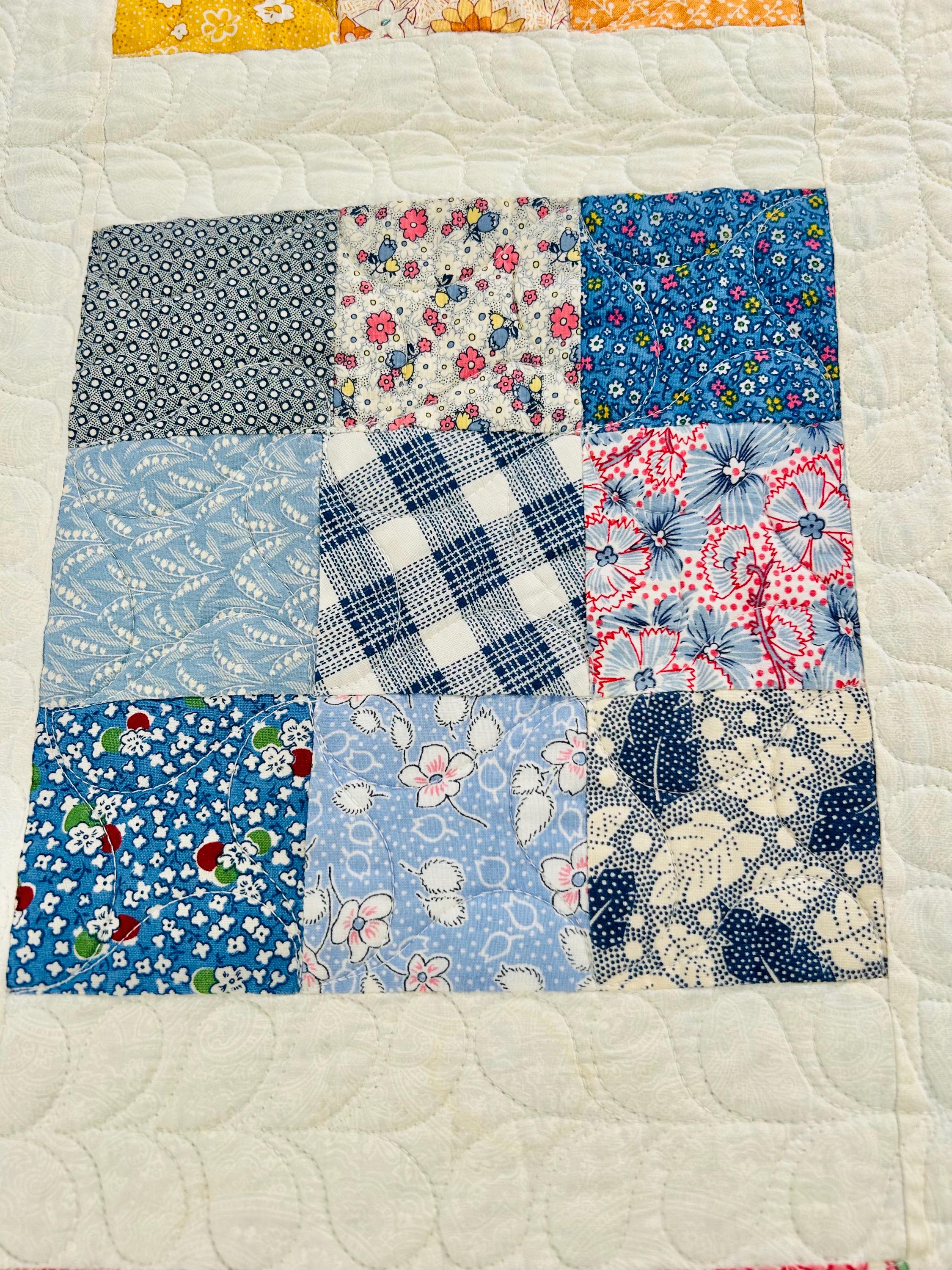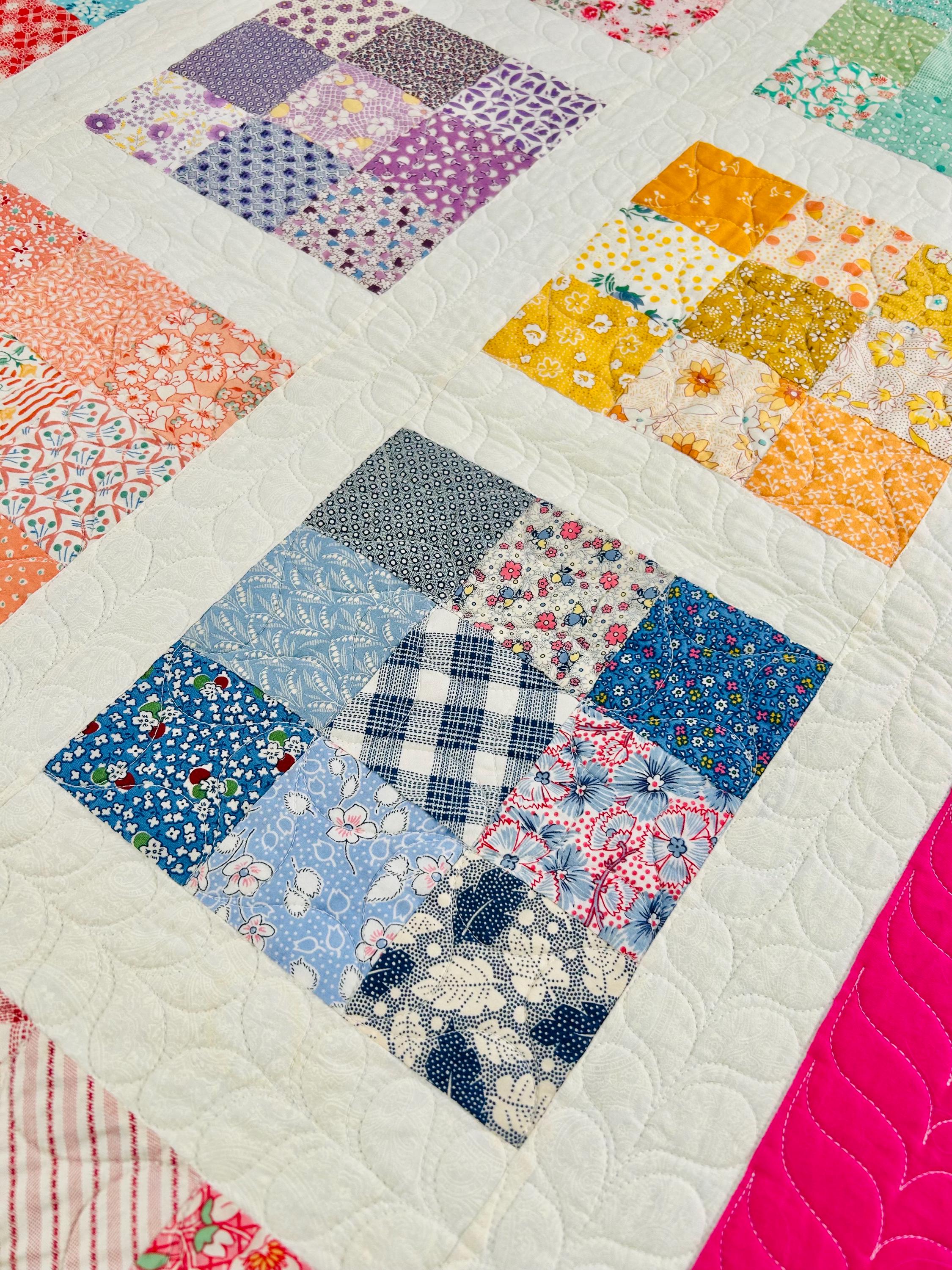 This beautifully crafted nine patch quilt was made in February 2006 and features vibrant patchwork blocks of high-quality cottons framed by a bold fuchsia border and finished with striking blue binding. The quilt has been long arm quilted in three types of elaborate and sweeping feathers along with petals and geometric shapes.