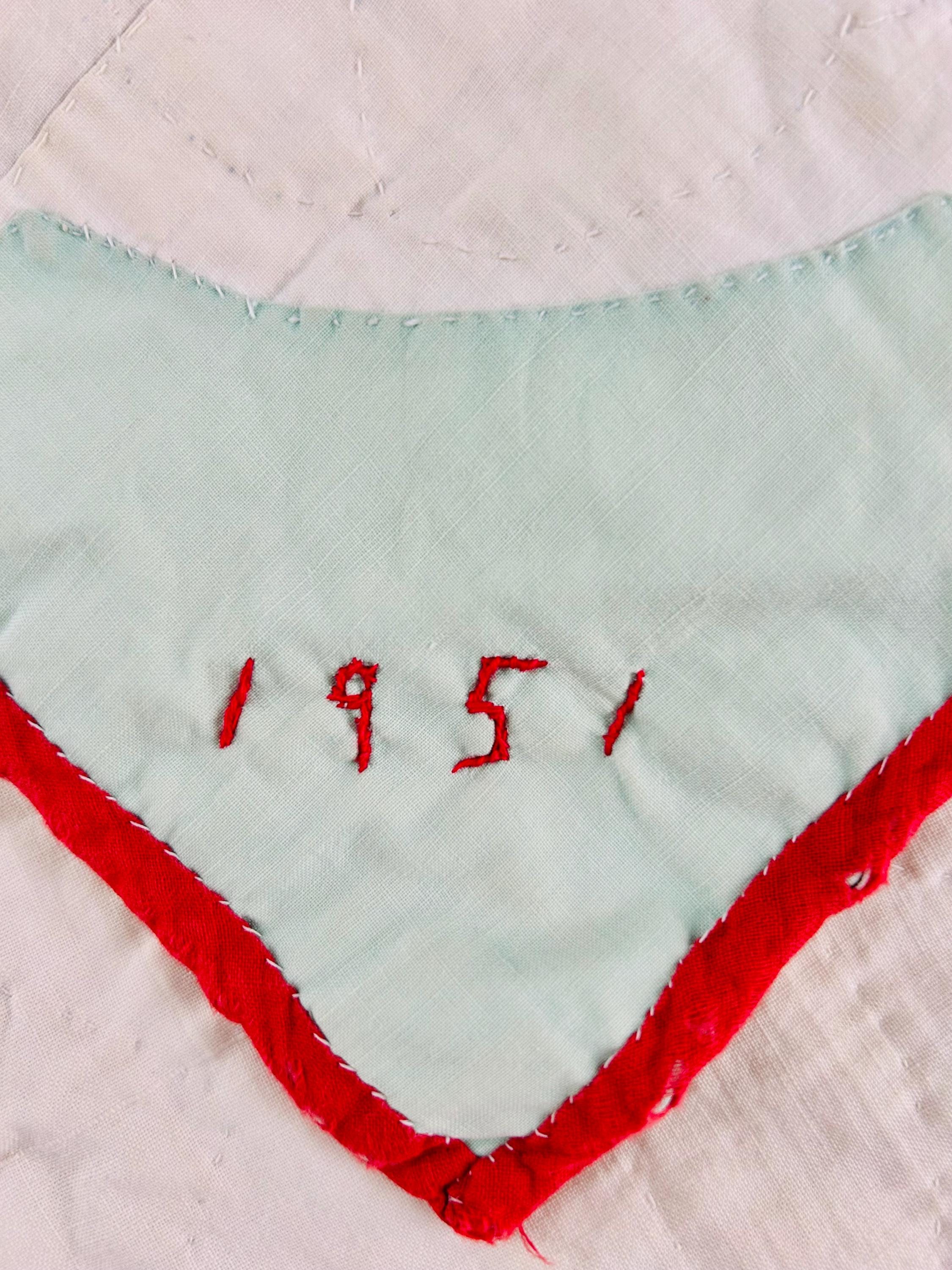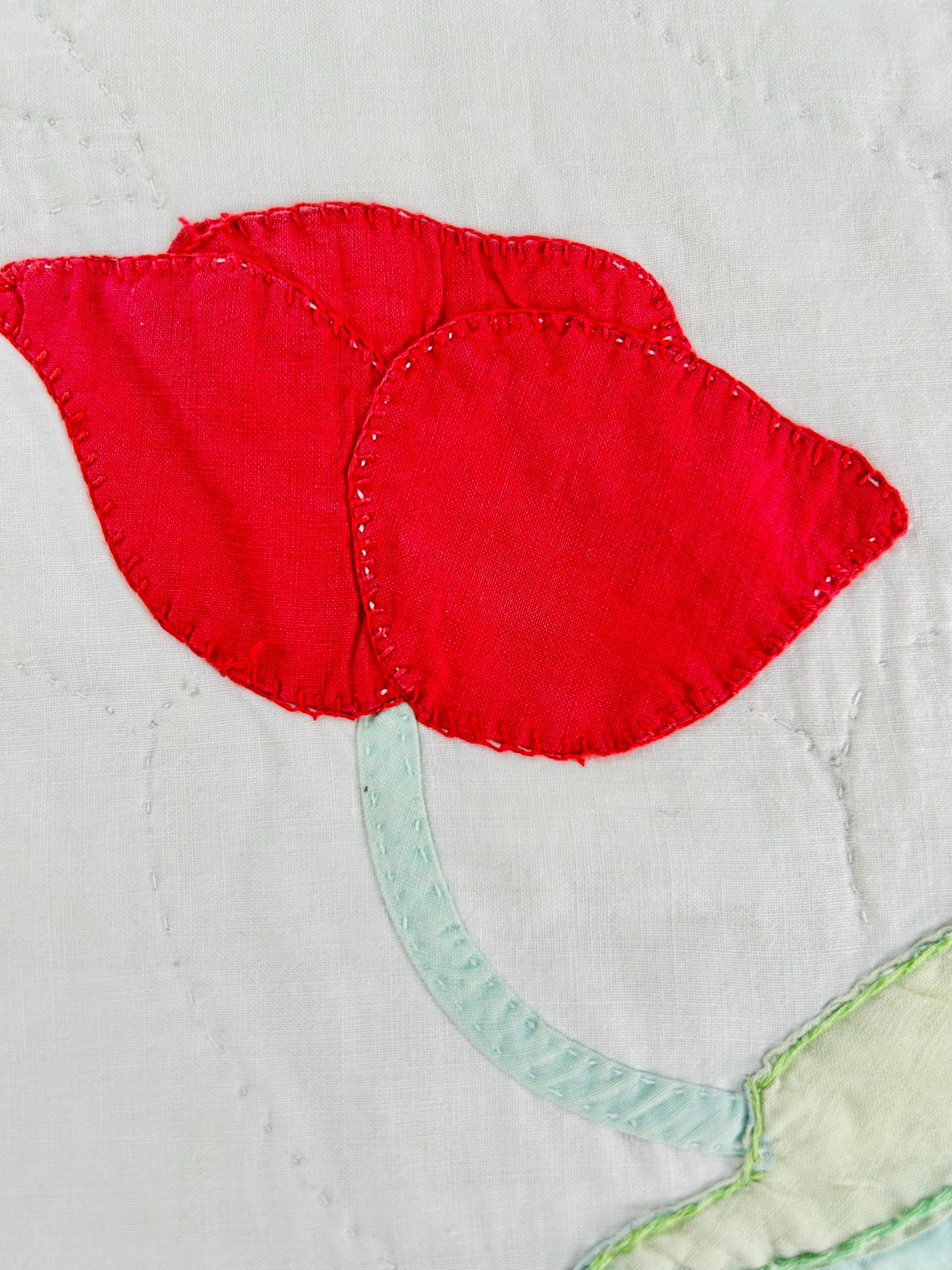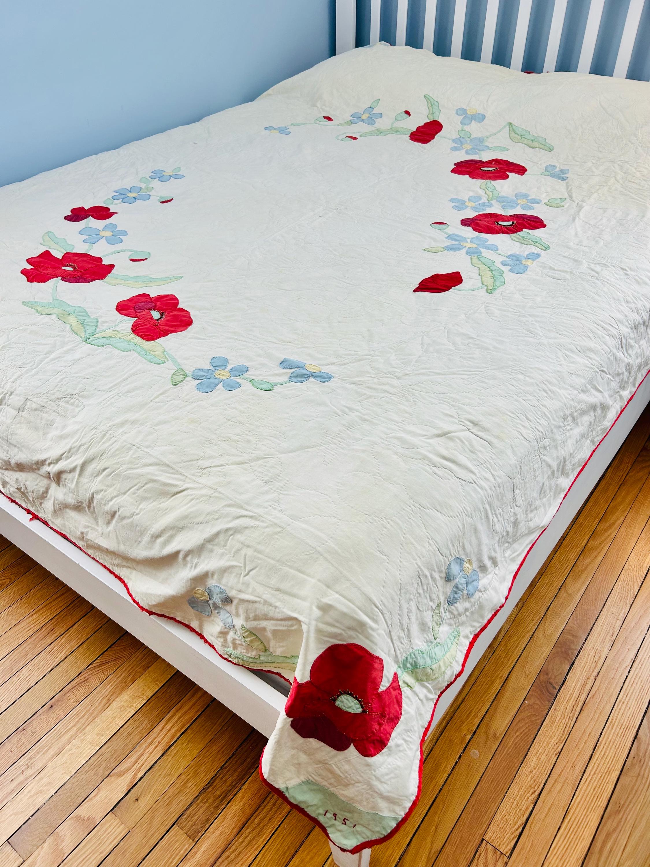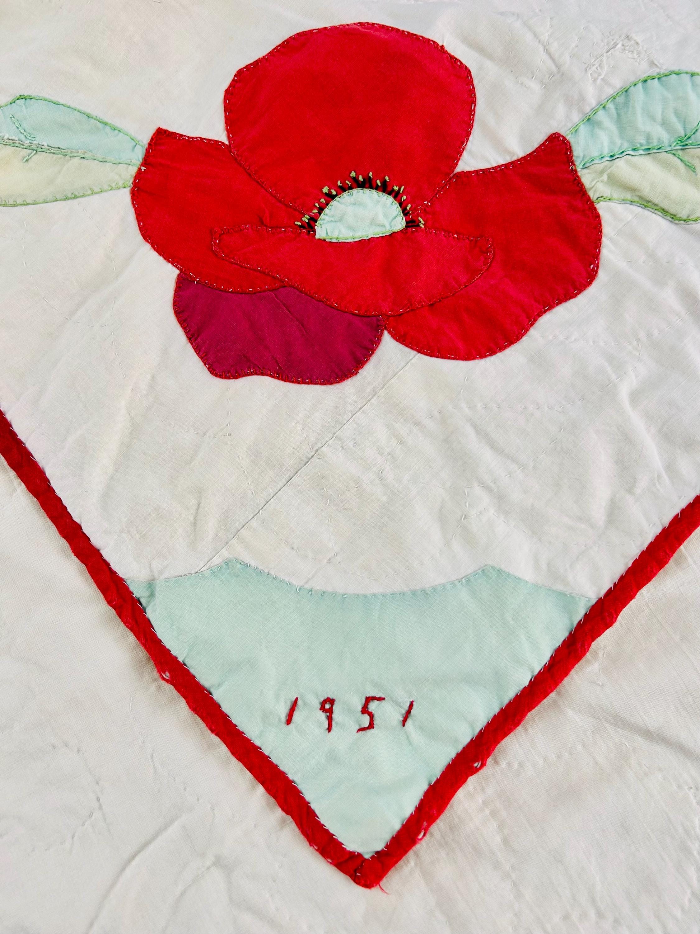 This charming mid-century Rose Vine Quilt/Coverlet is dated 1951 and features vibrant red blossoms and soft blue flowers, all hand-appliquéd onto a creamy white ground. The quilting is in leaves and flower petals and a simple twisted rope design around the border. In addition to the hand-embroidered date, embroidery embellishes the flowers and vines.