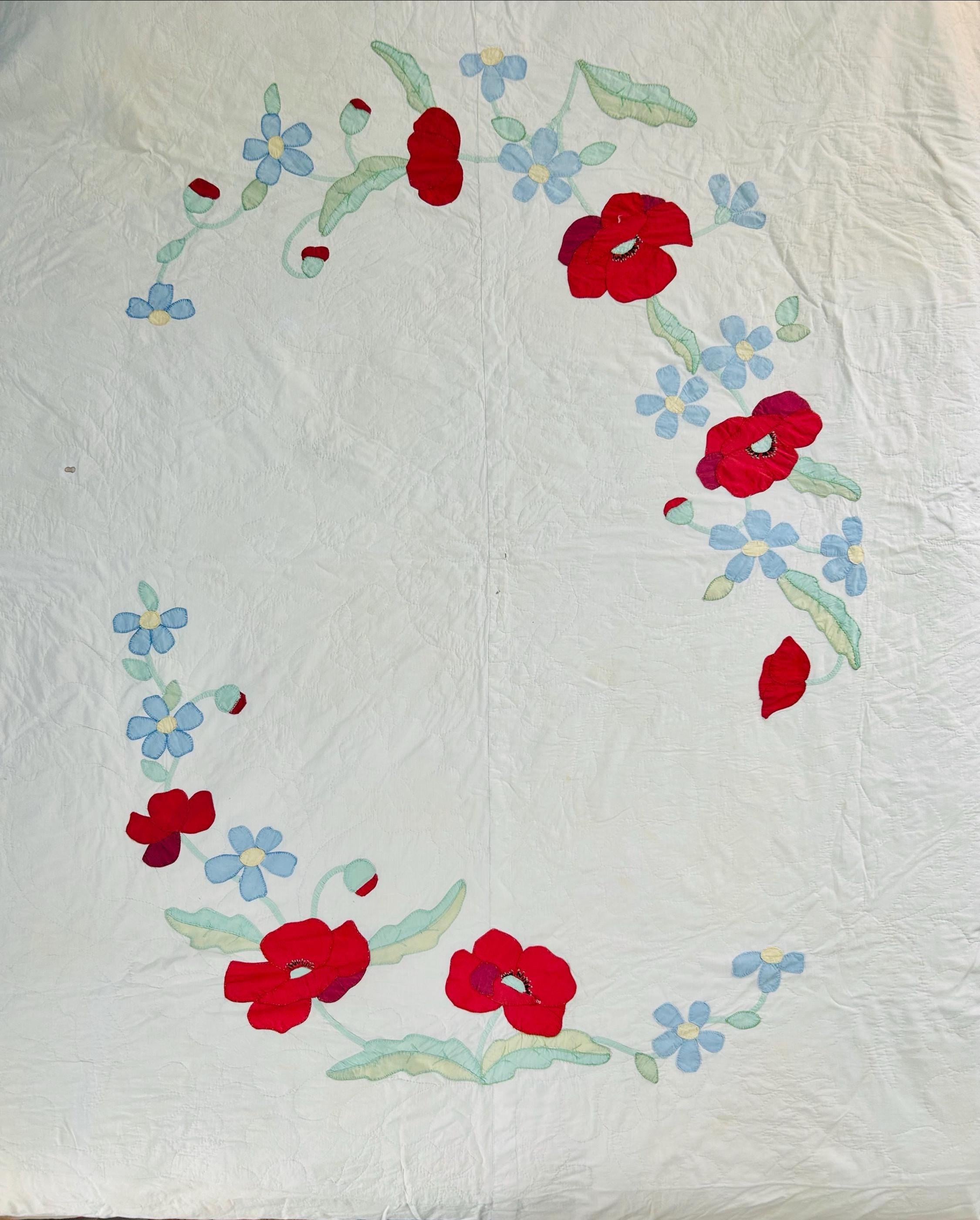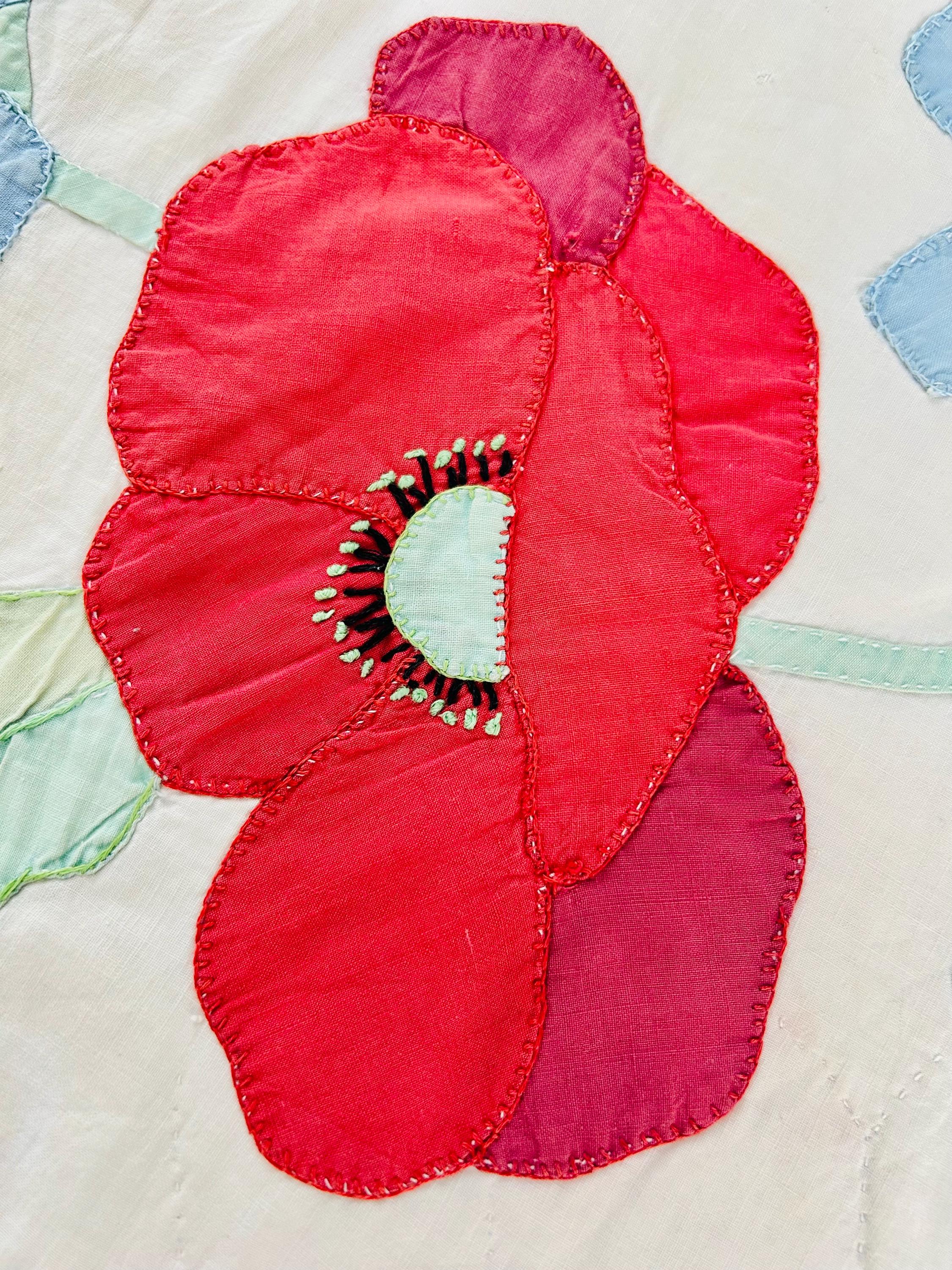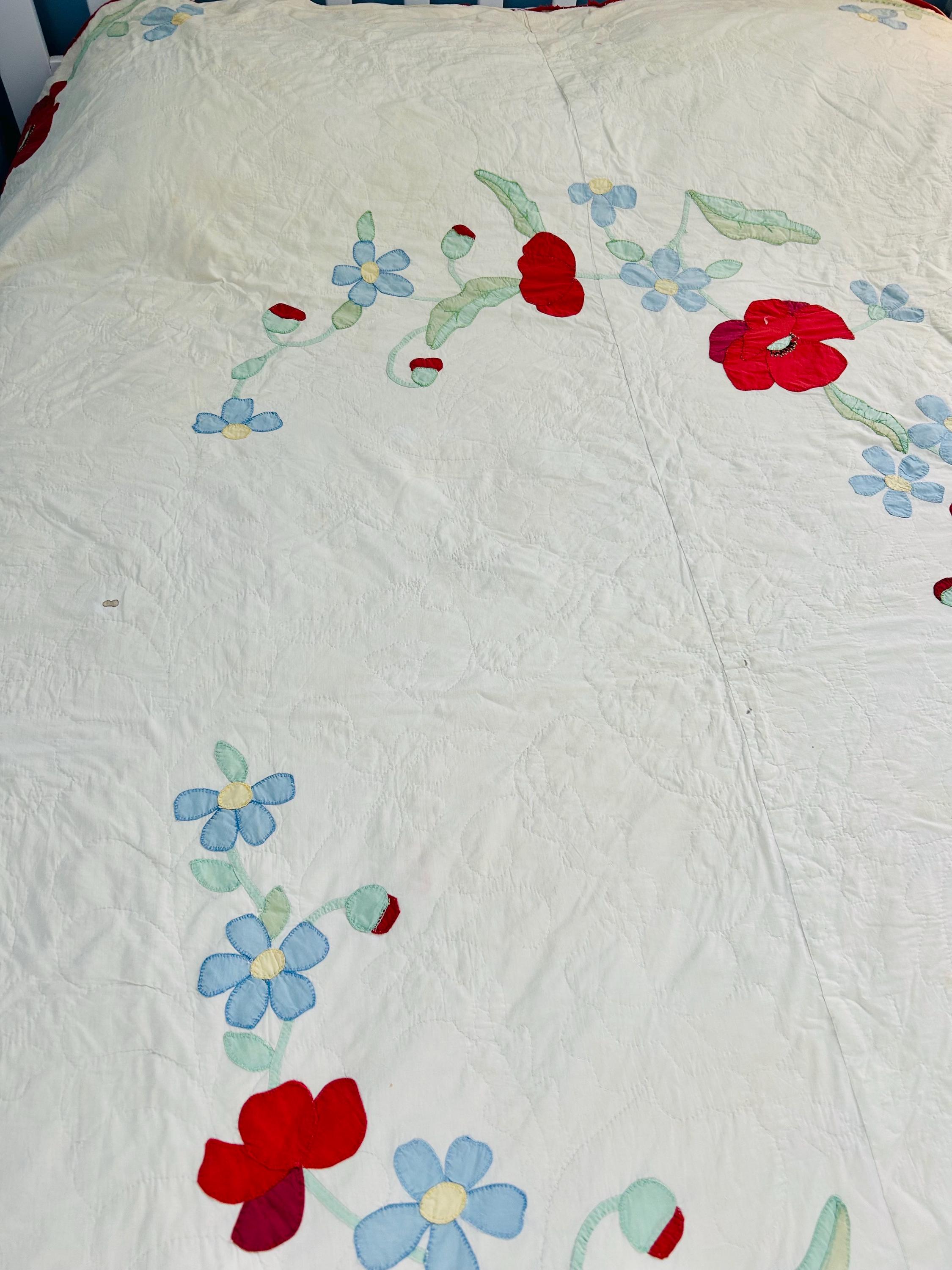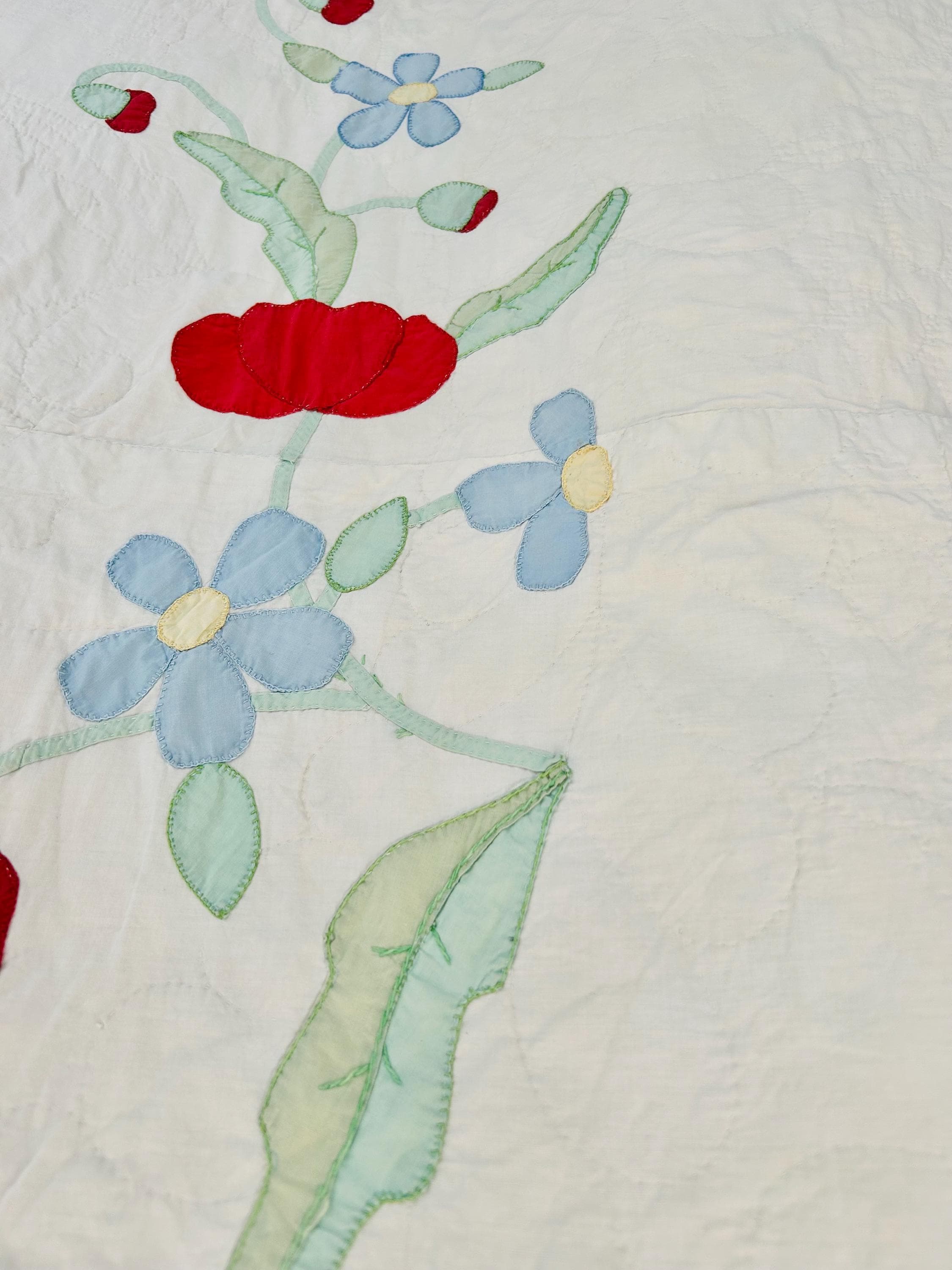 This charming mid-century Rose Vine Quilt/Coverlet is dated 1951 and features vibrant red blossoms and soft blue flowers, all hand-appliquéd onto a creamy white ground. The quilting is in leaves and flower petals and a simple twisted rope design around the border. In addition to the hand-embroidered date, embroidery embellishes the flowers and vines.