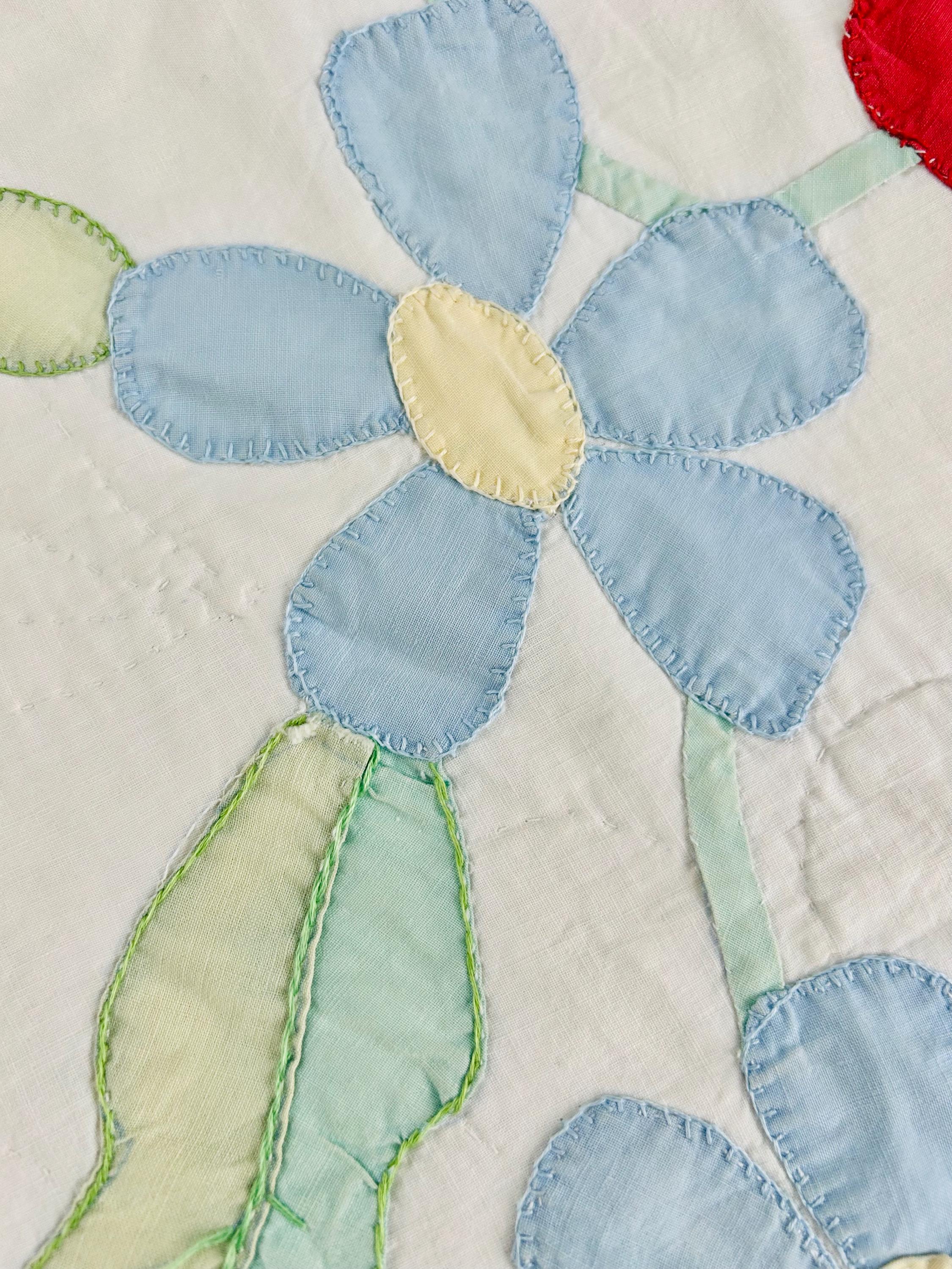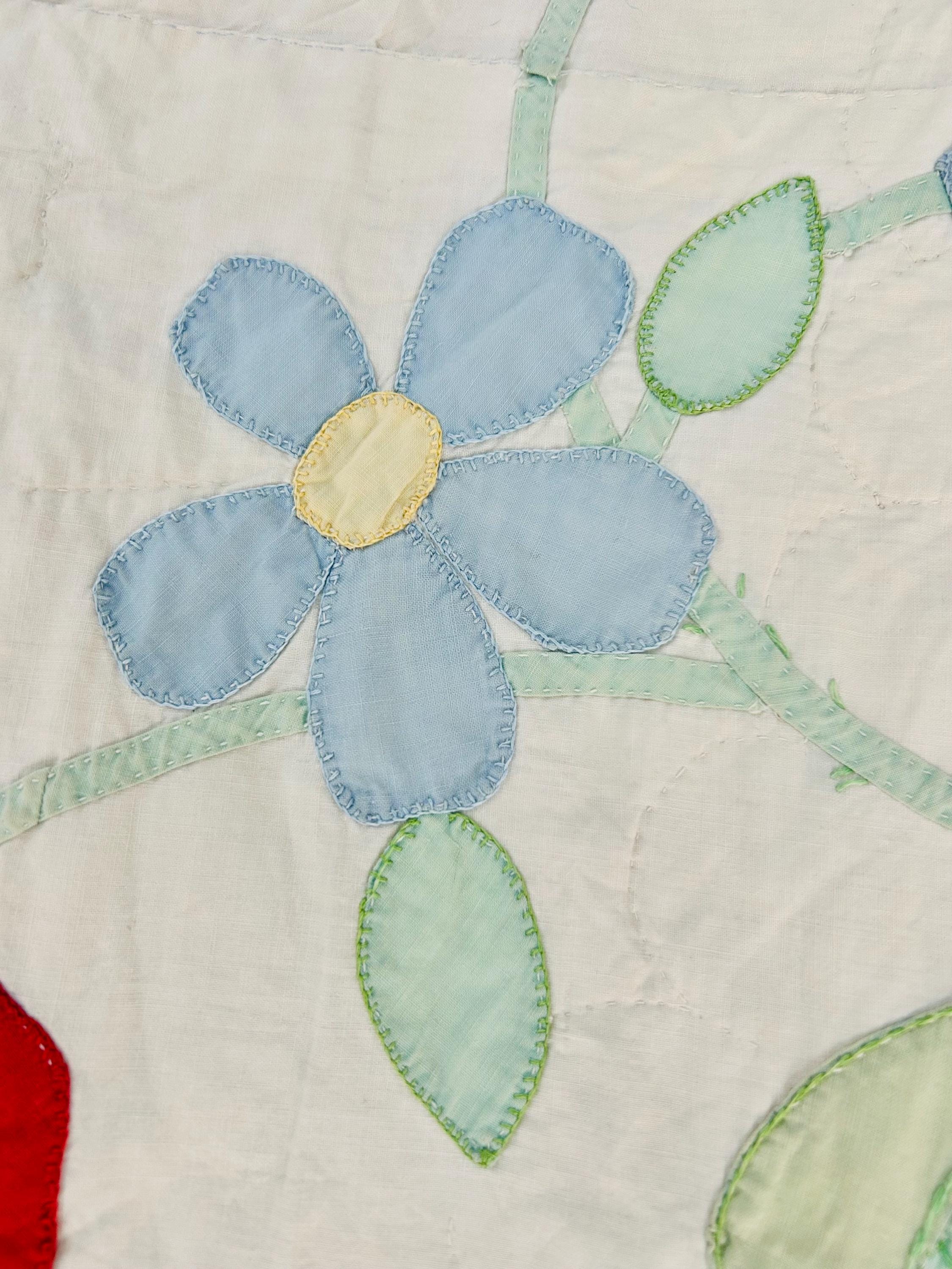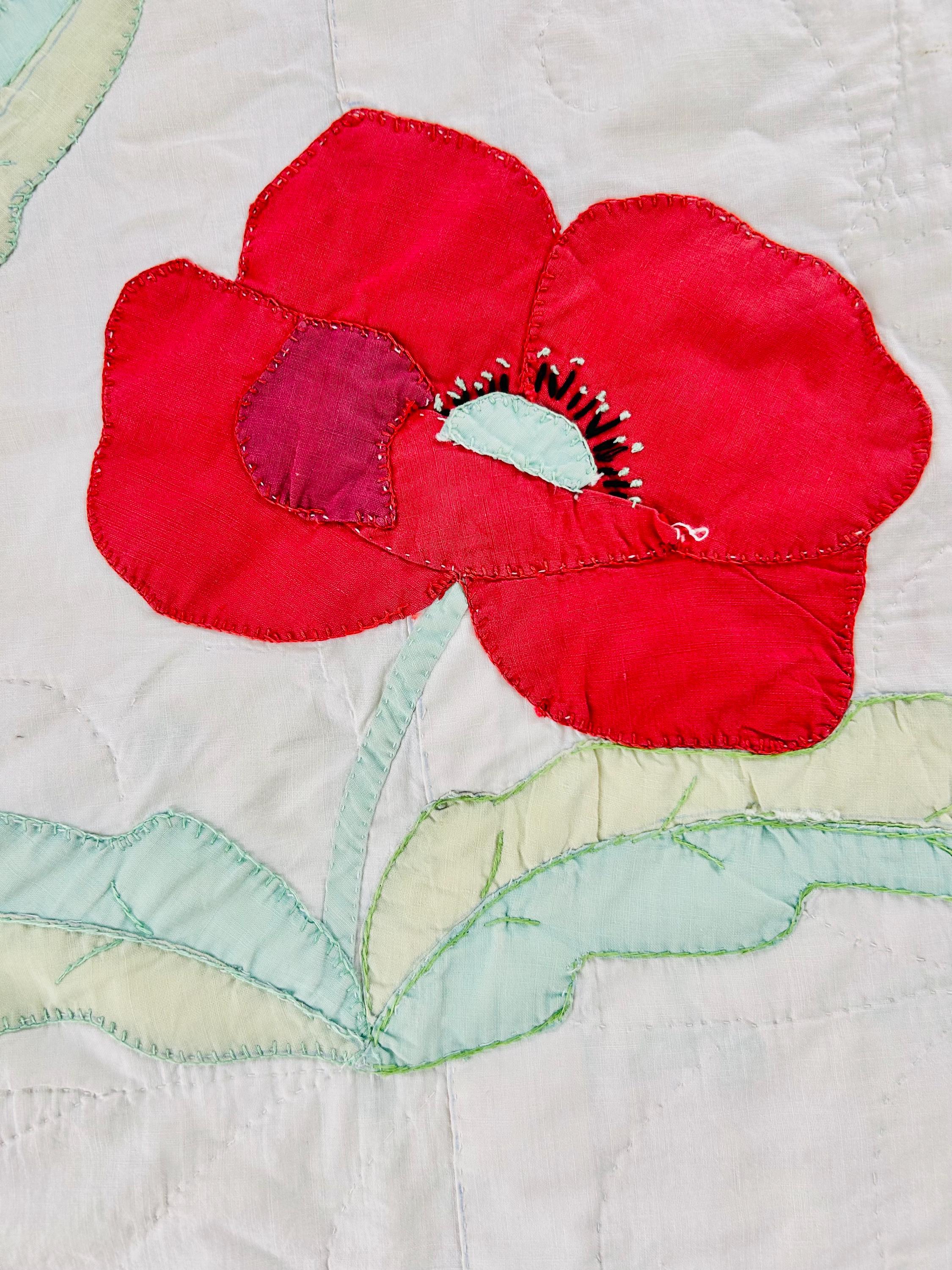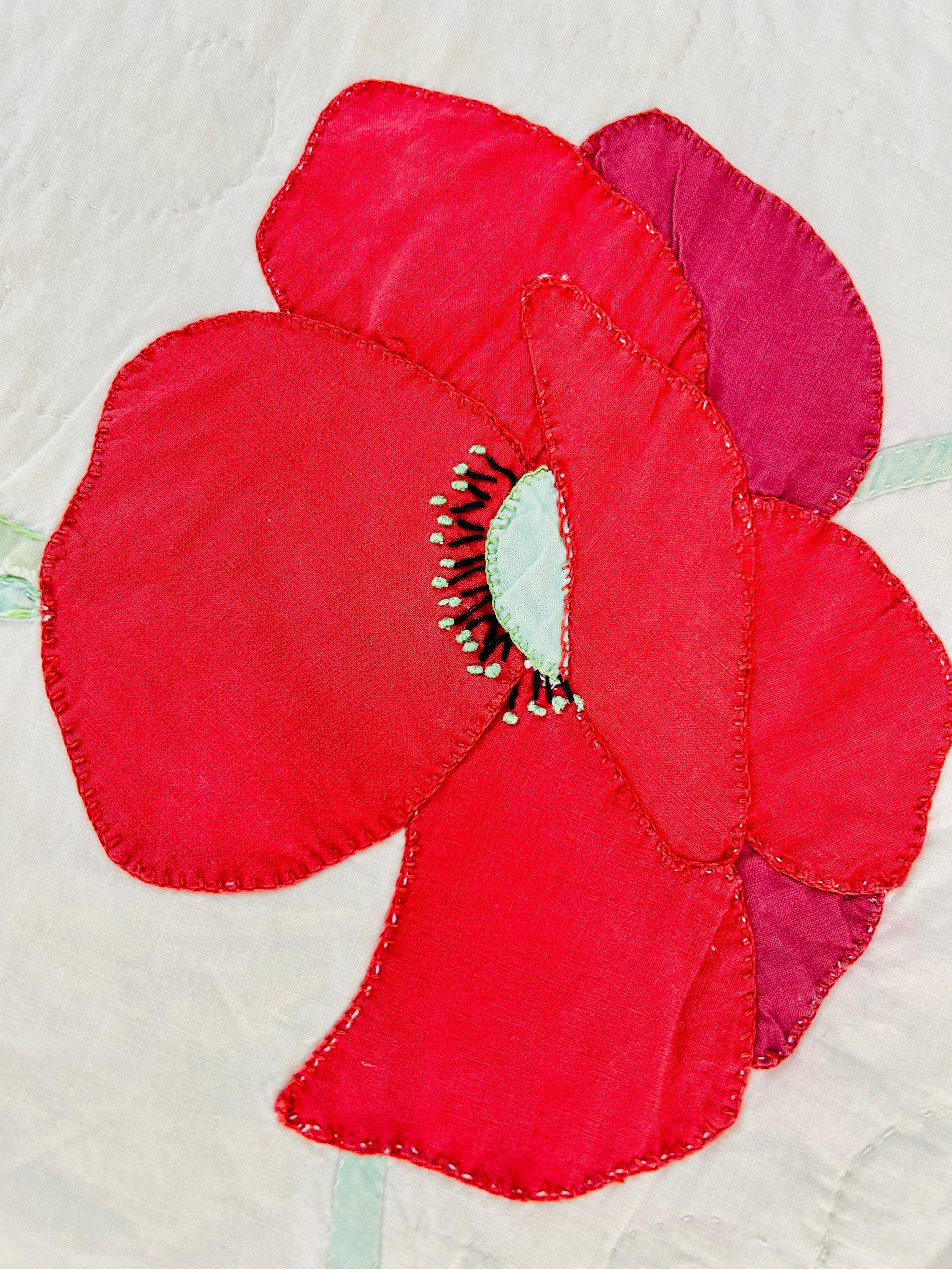 This charming mid-century Rose Vine Quilt/Coverlet is dated 1951 and features vibrant red blossoms and soft blue flowers, all hand-appliquéd onto a creamy white ground. The quilting is in leaves and flower petals and a simple twisted rope design around the border. In addition to the hand-embroidered date, embroidery embellishes the flowers and vines.