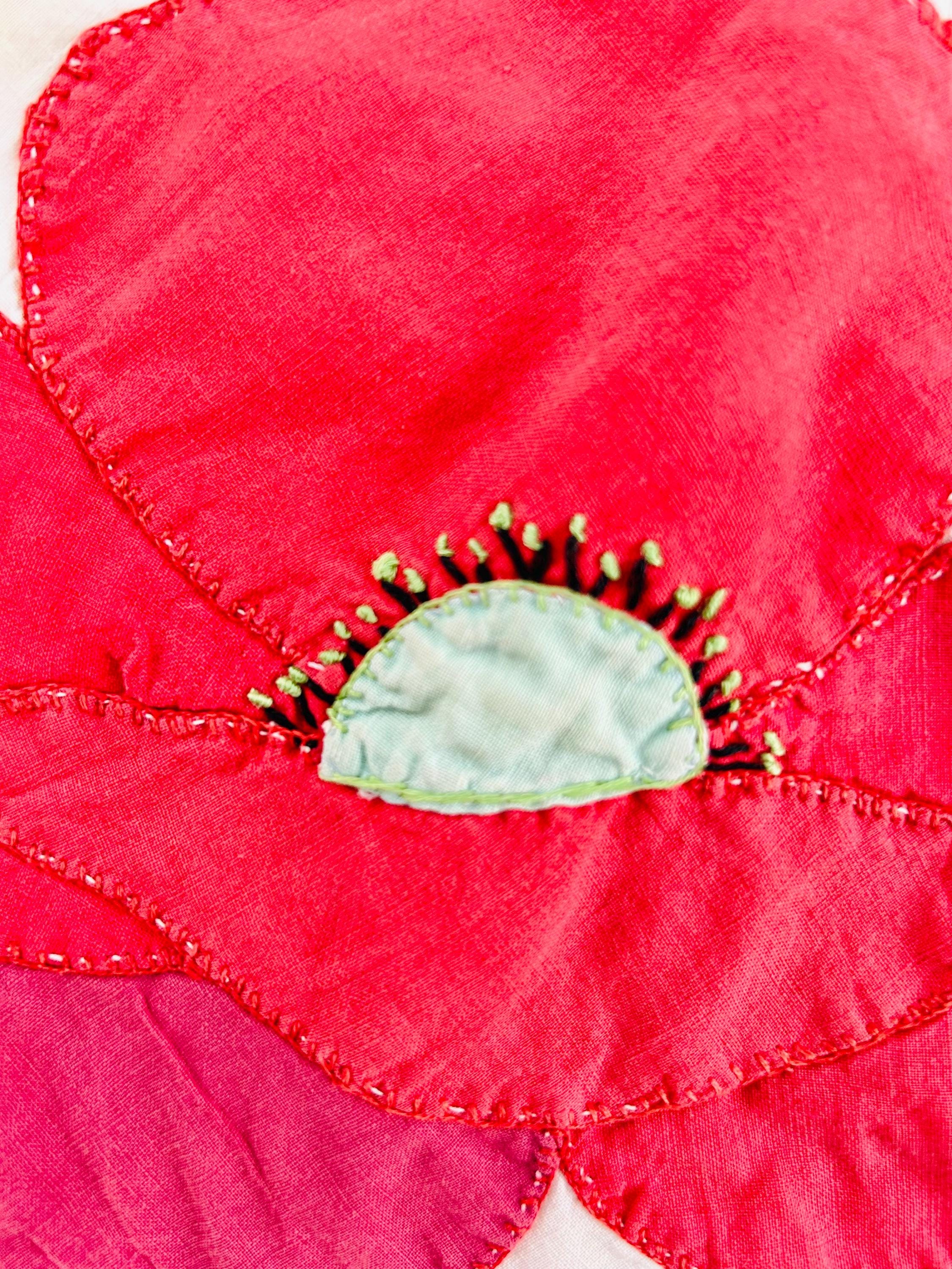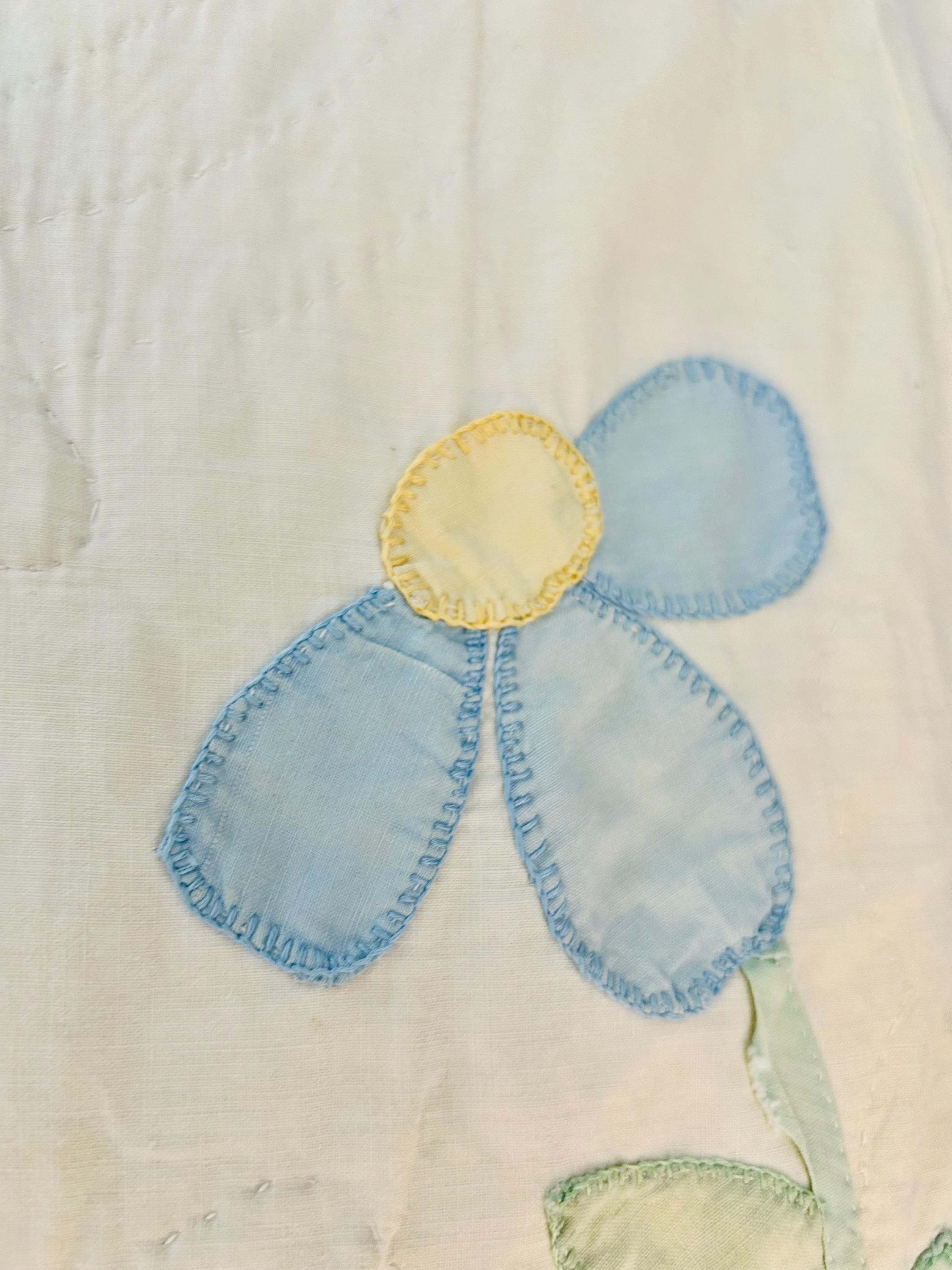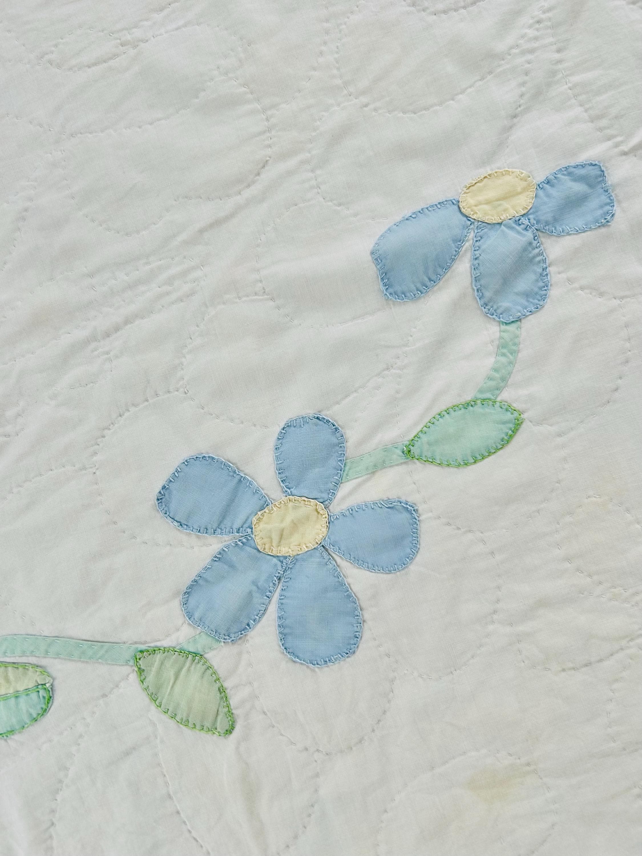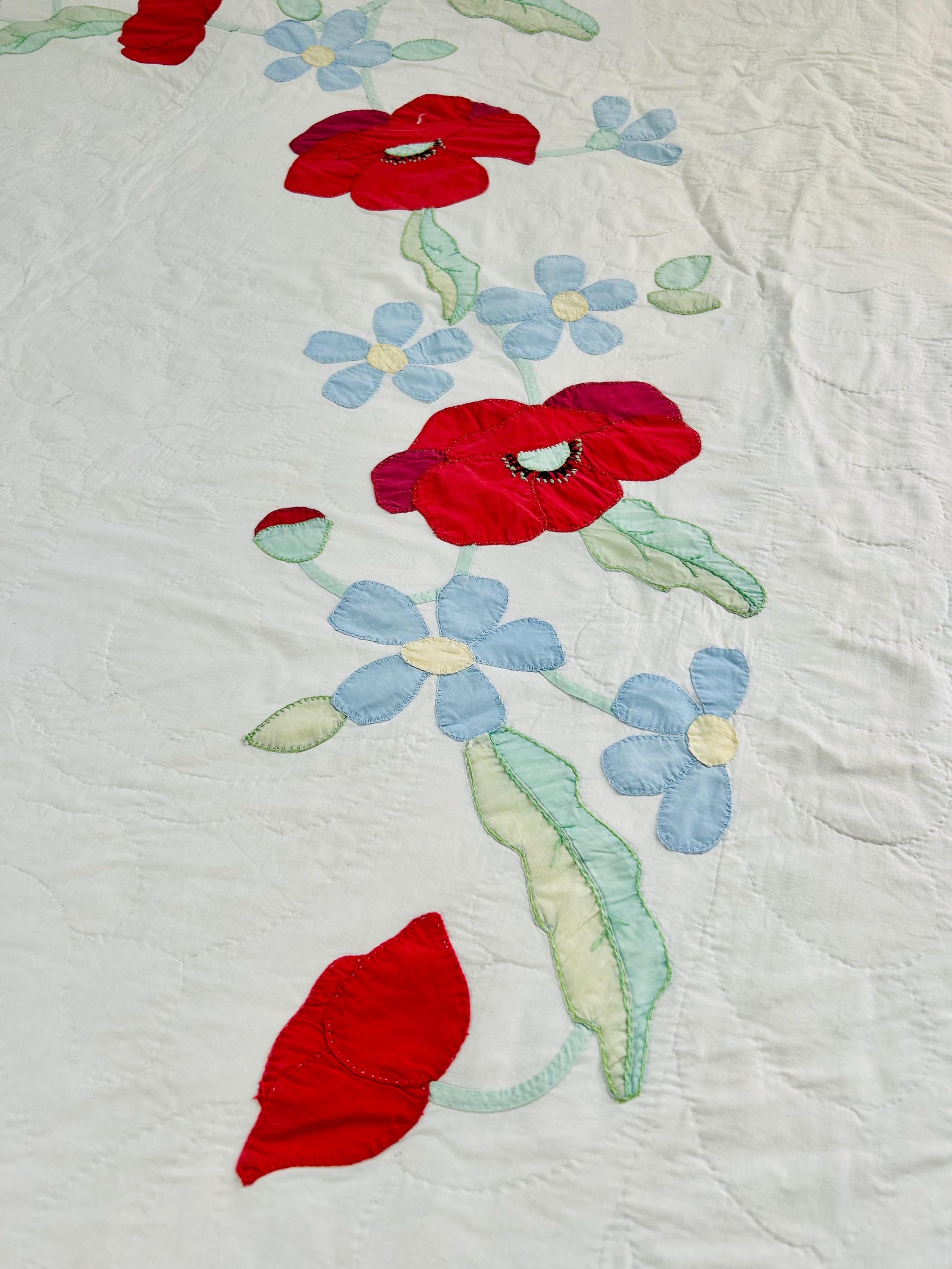 This charming mid-century Rose Vine Quilt/Coverlet is dated 1951 and features vibrant red blossoms and soft blue flowers, all hand-appliquéd onto a creamy white ground. The quilting is in leaves and flower petals and a simple twisted rope design around the border. In addition to the hand-embroidered date, embroidery embellishes the flowers and vines.