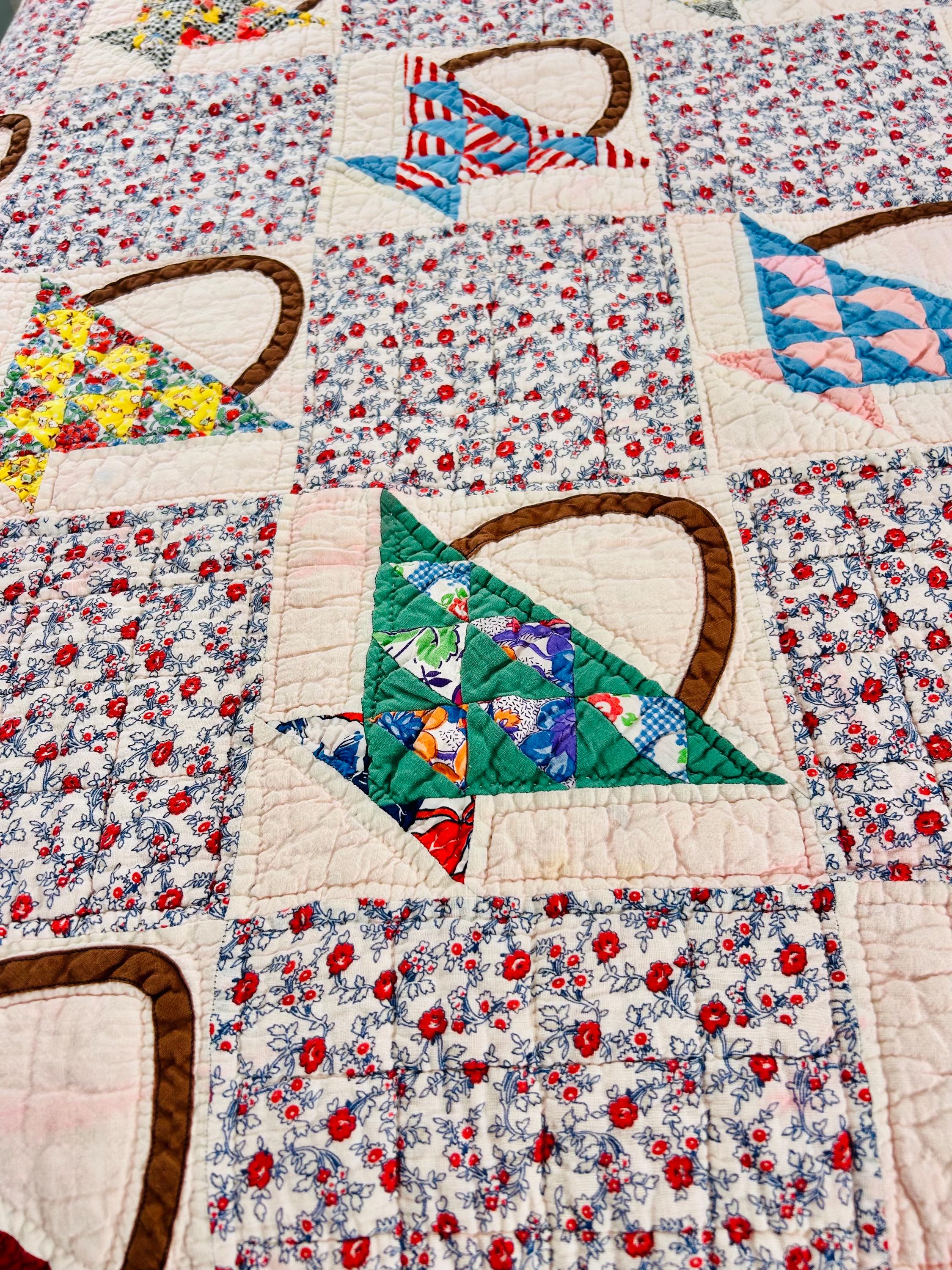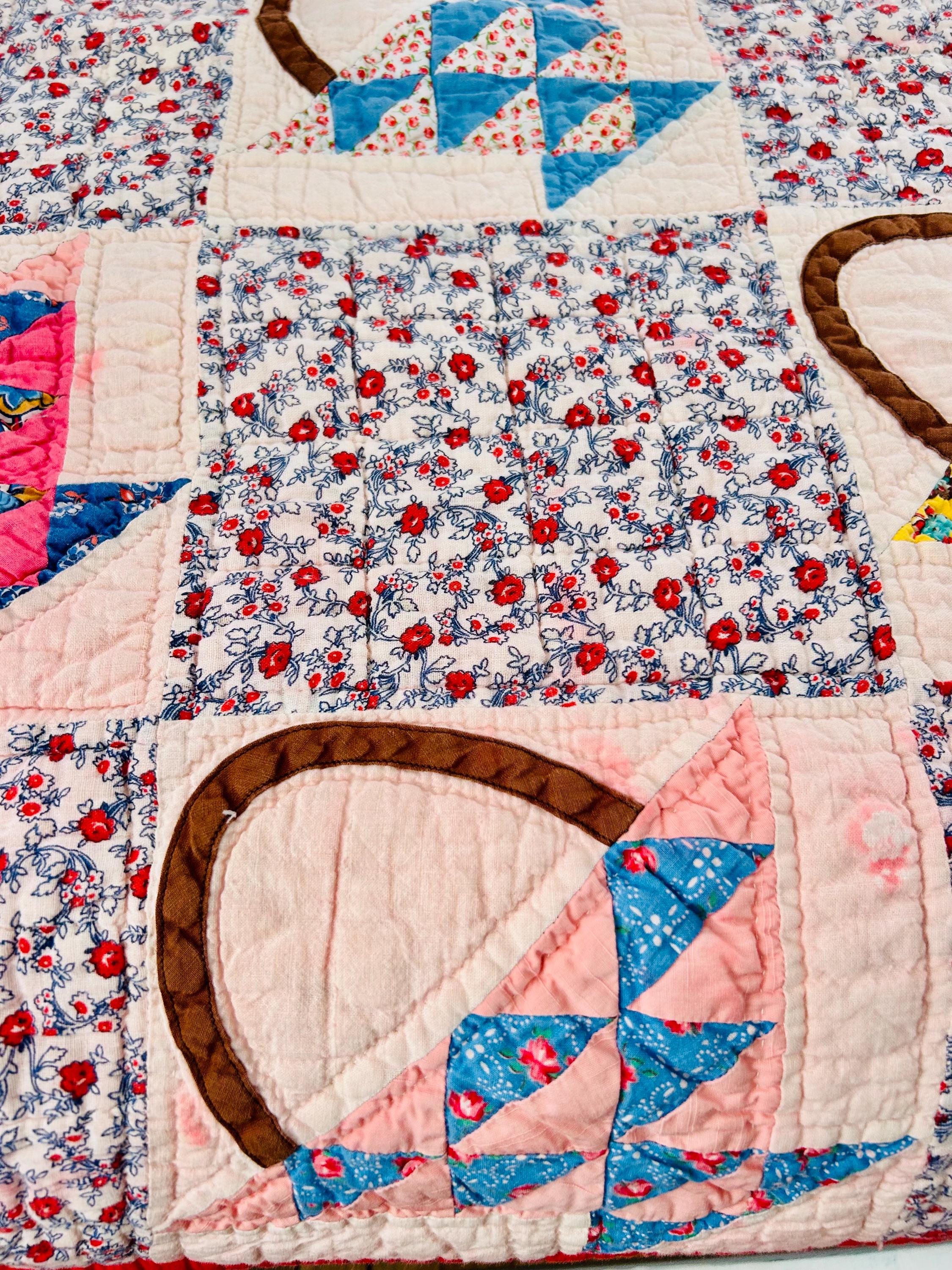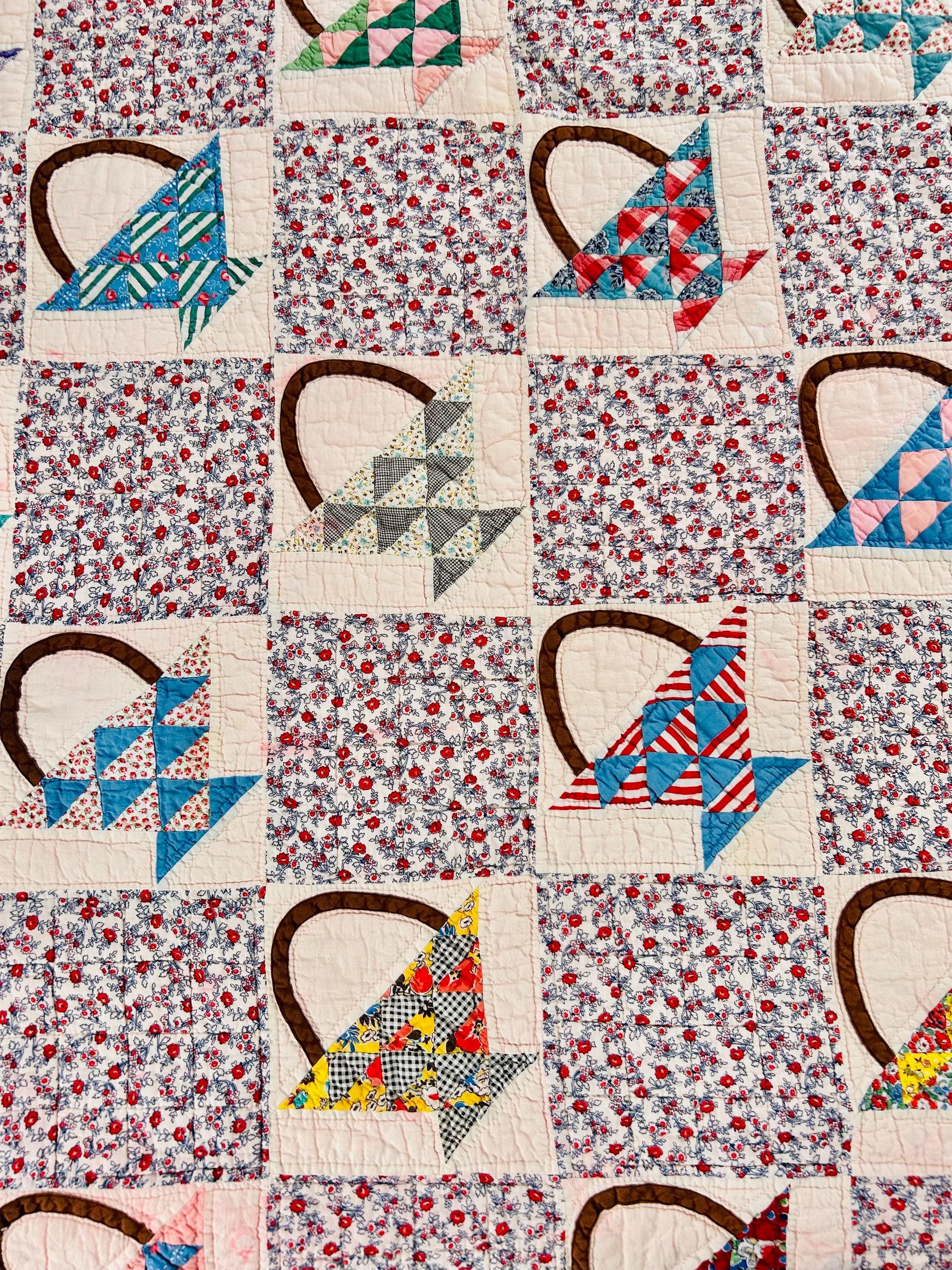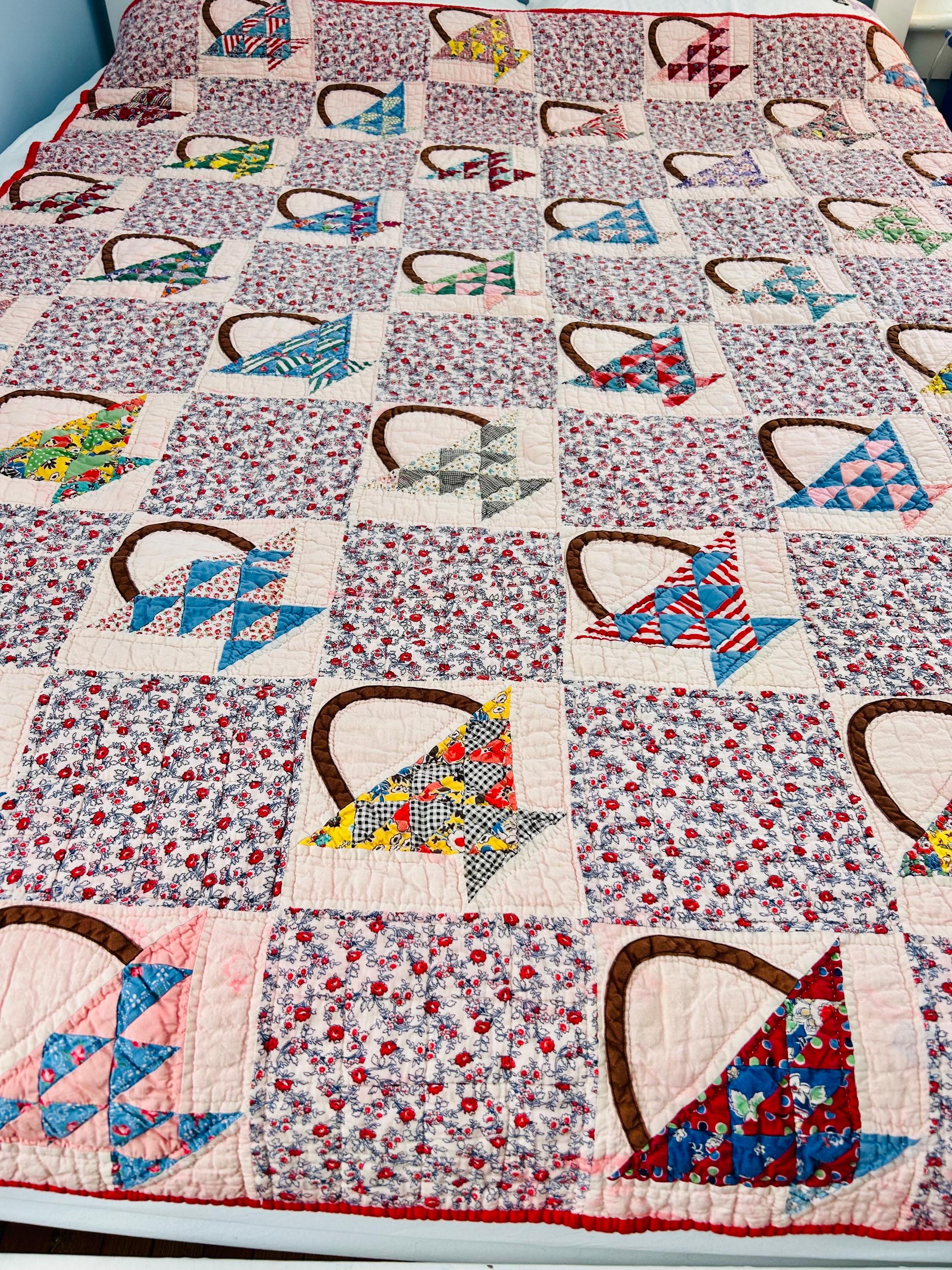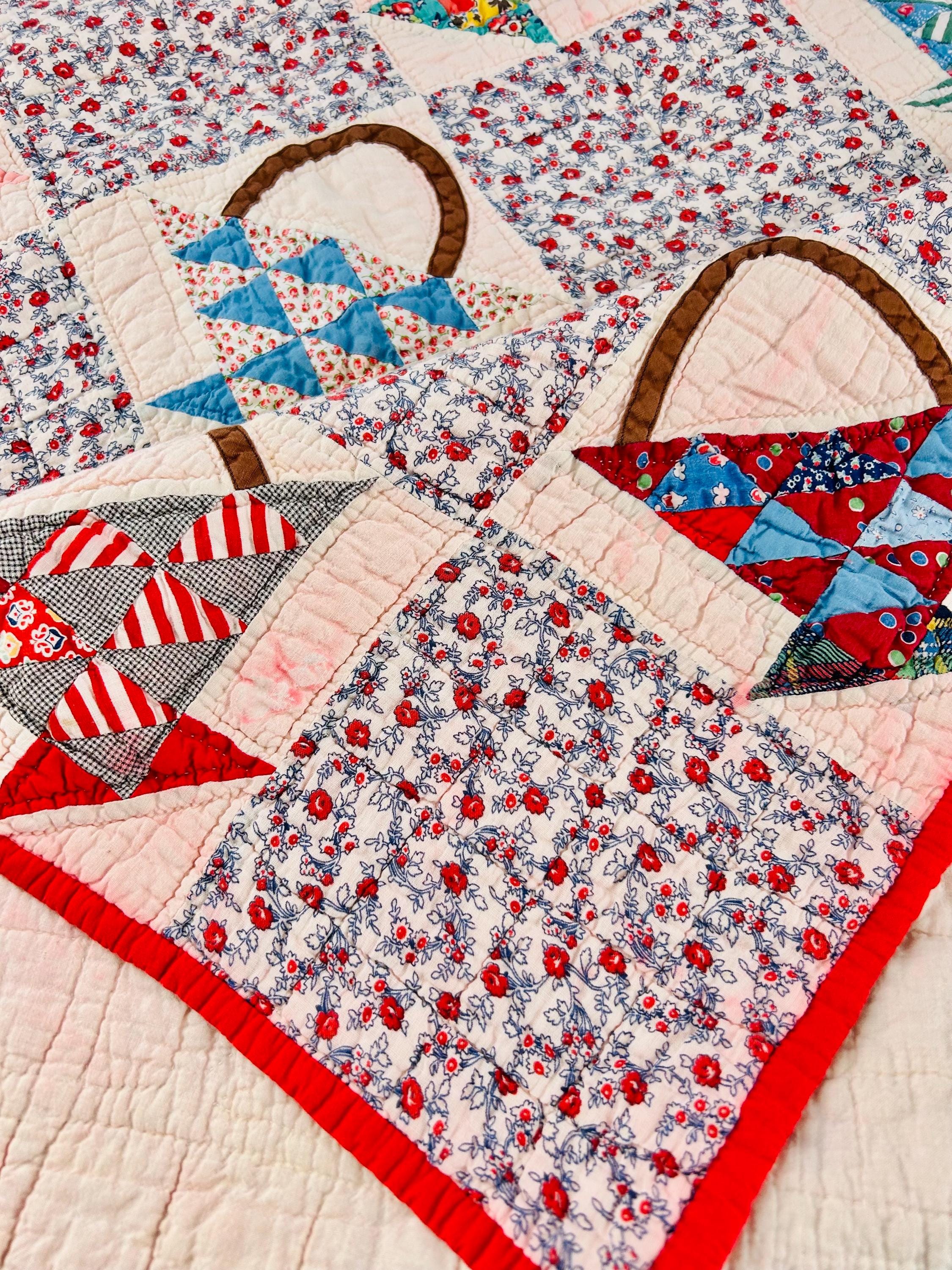 Details: • Date: Circa 1930s–1945 • Pattern: Flower Basket blocks with pieced triangular baskets • Size: 60” x 72” • Materials: Cotton fabrics; cotton batting • Construction: Hand pieced and hand quilted • Binding: Red cotton binding