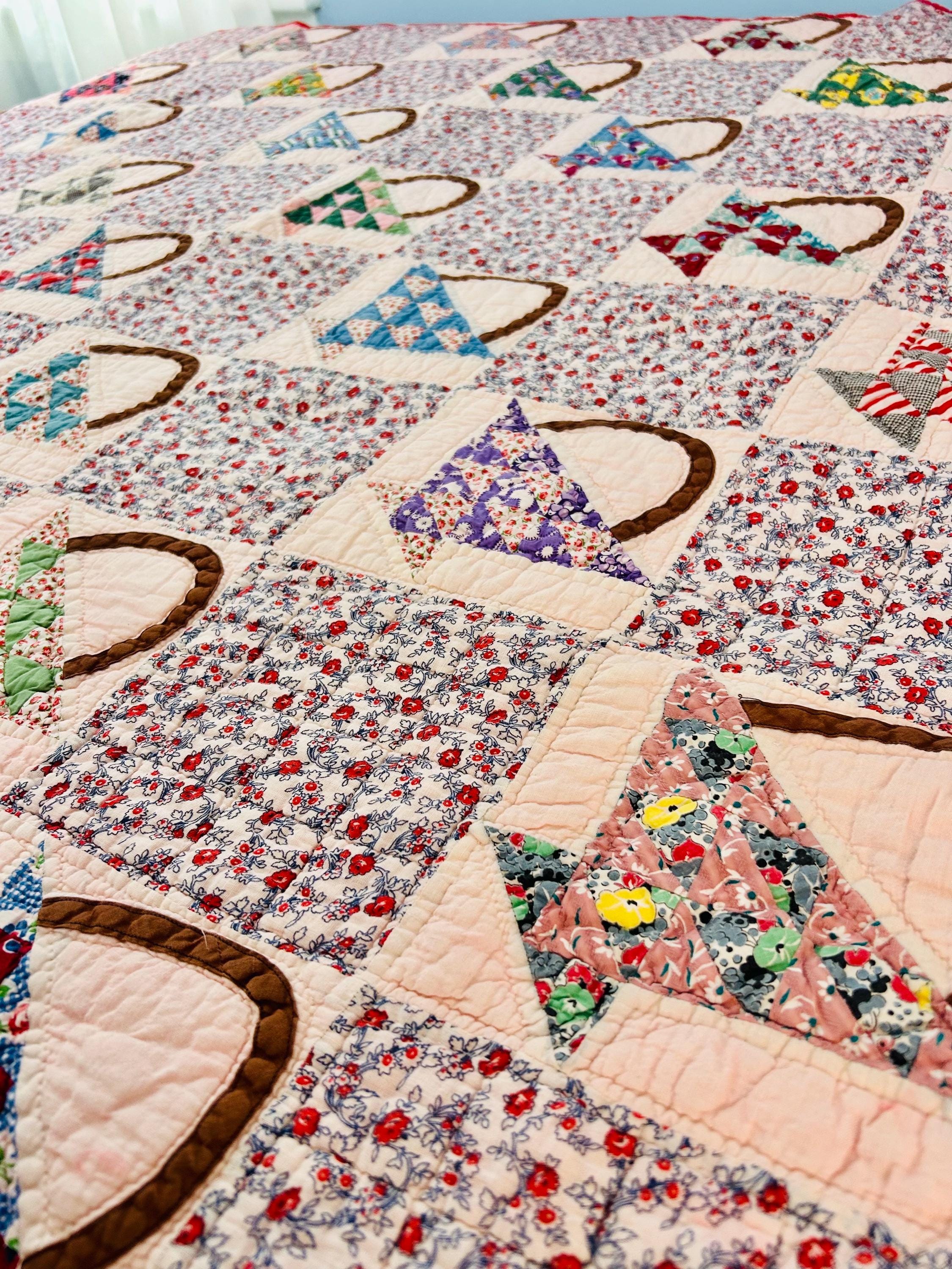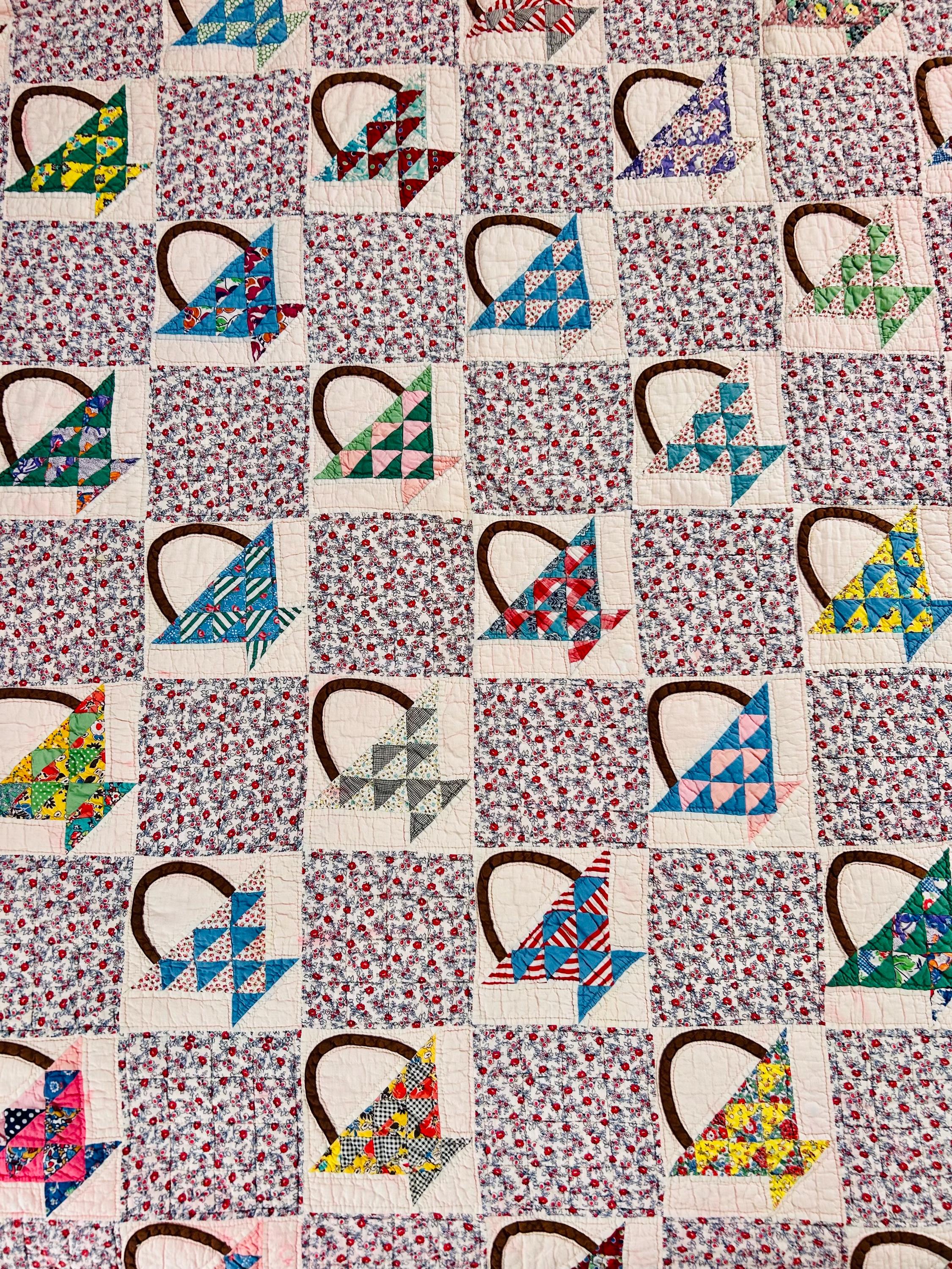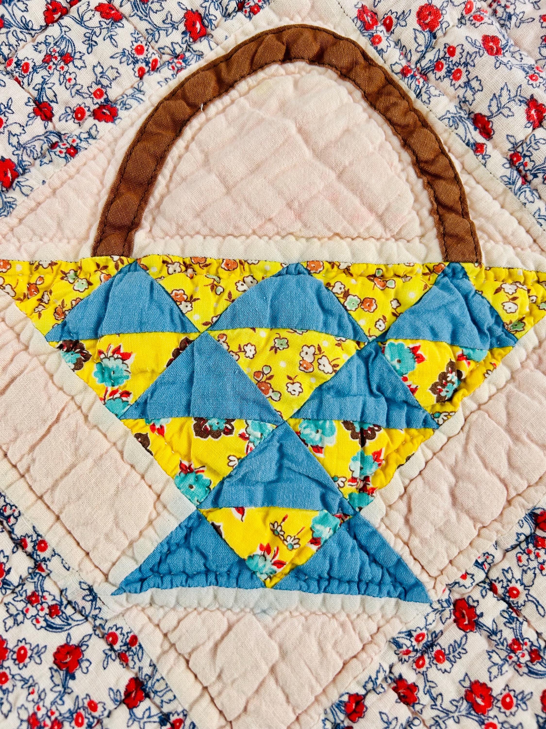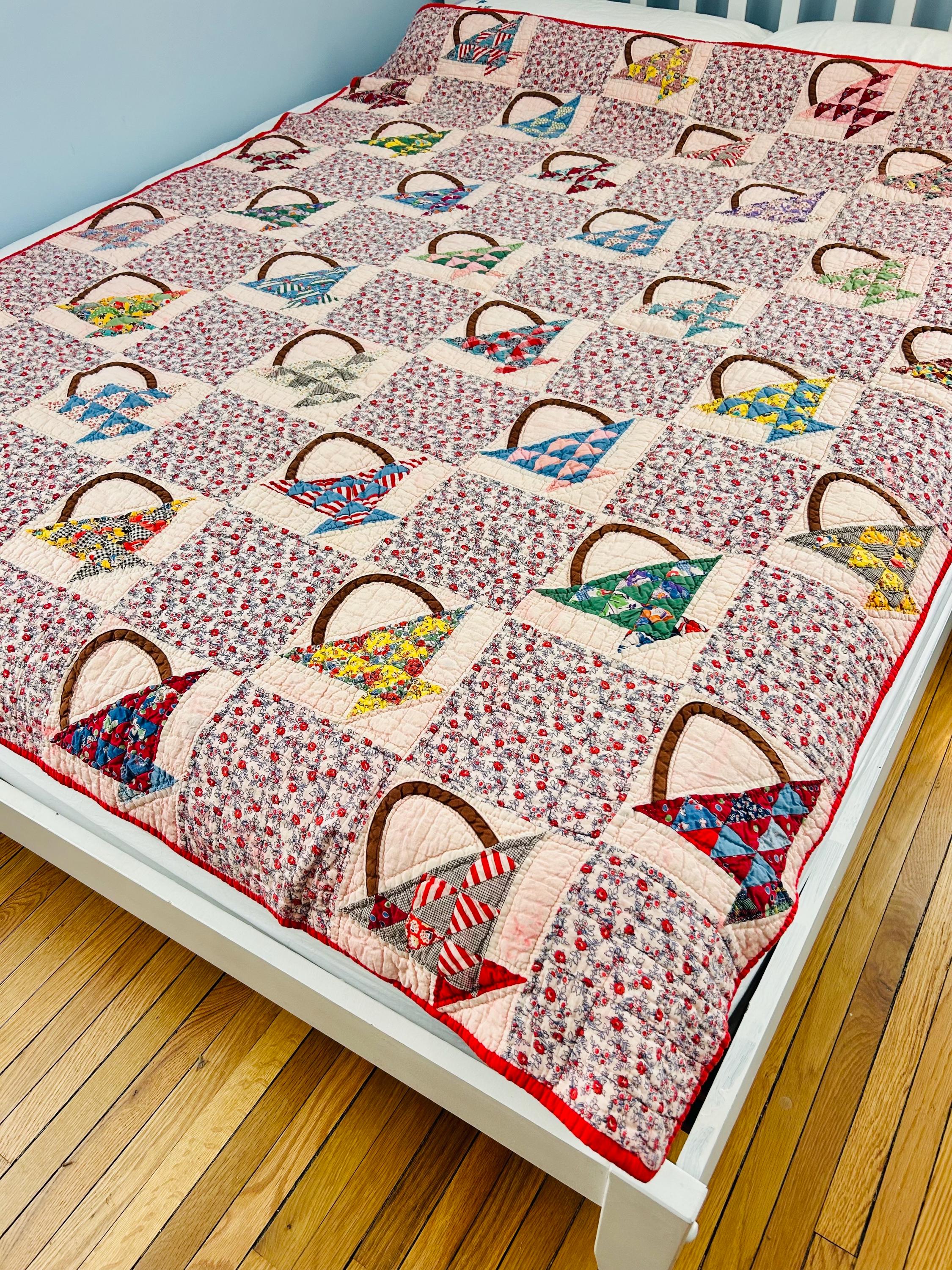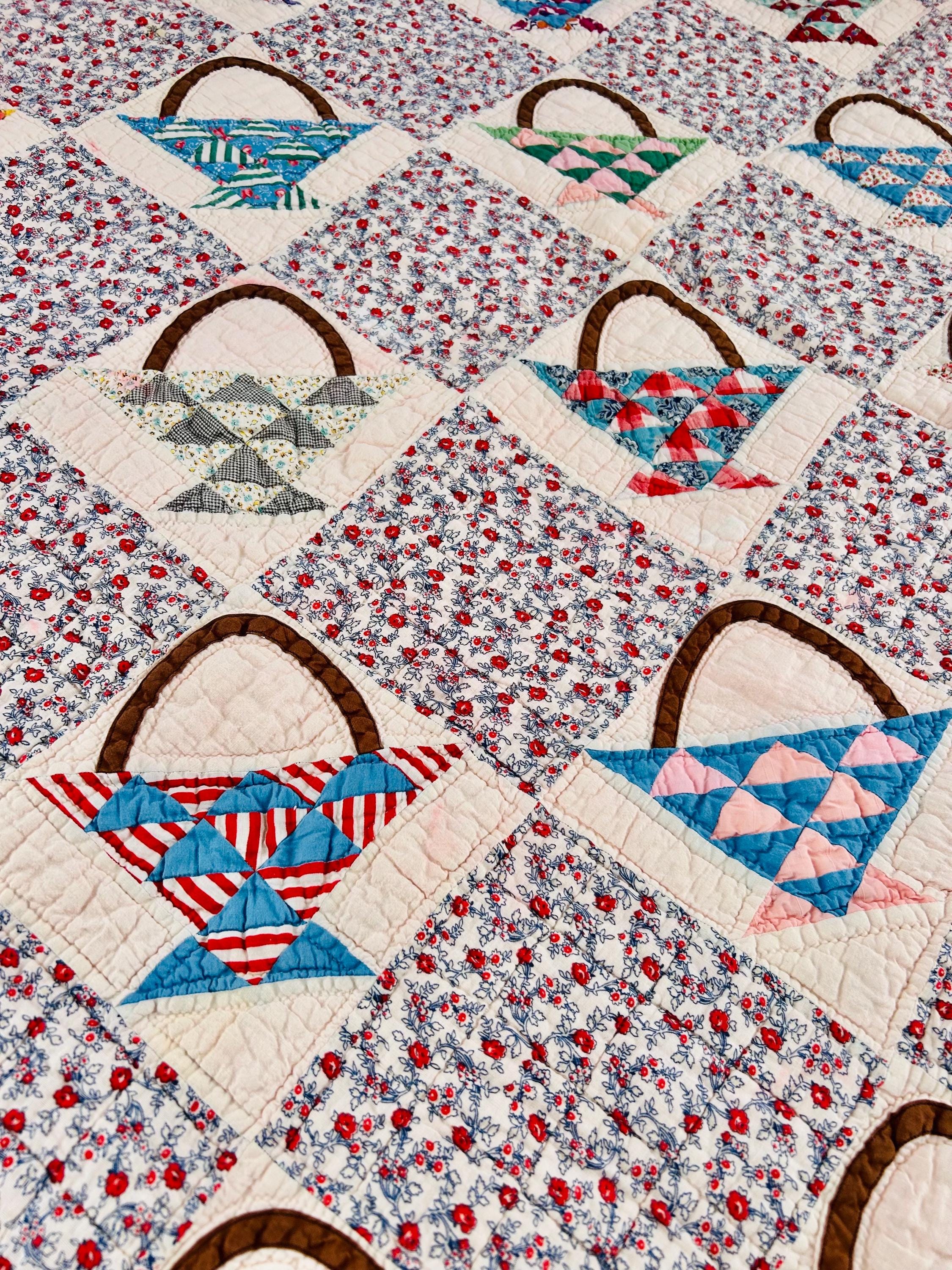 Details: • Date: Circa 1930s–1945 • Pattern: Flower Basket blocks with pieced triangular baskets • Size: 60” x 72” • Materials: Cotton fabrics; cotton batting • Construction: Hand pieced and hand quilted • Binding: Red cotton binding