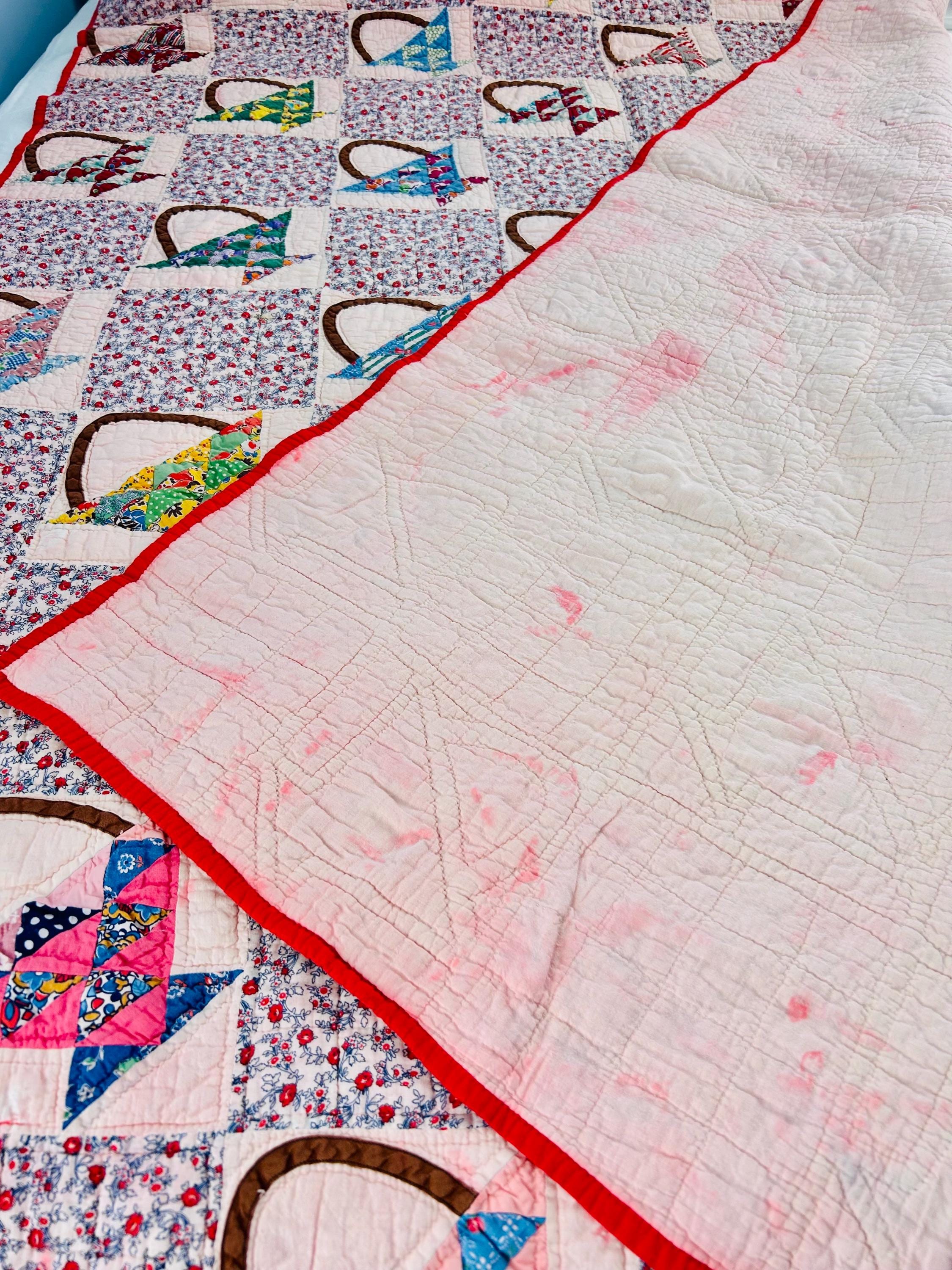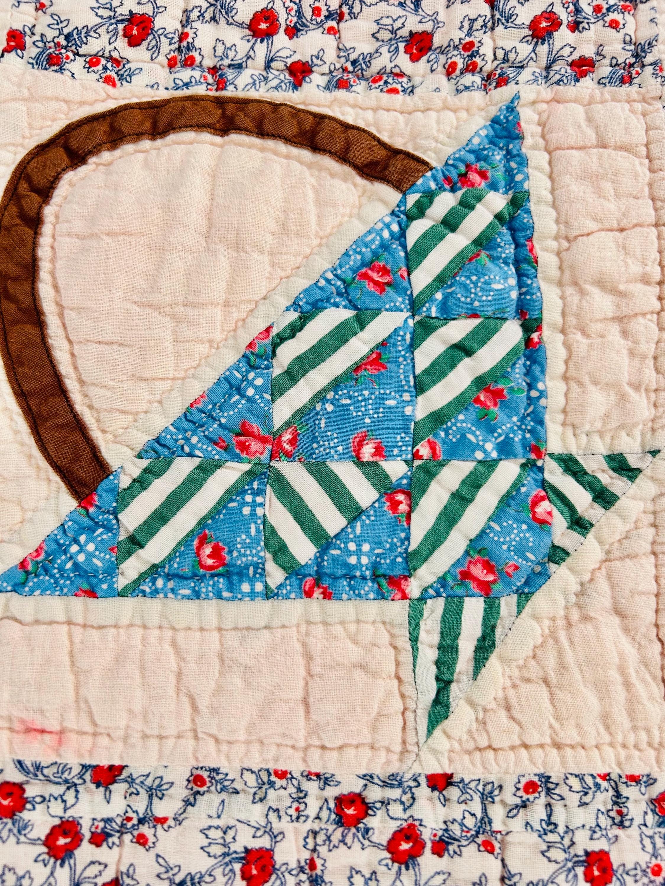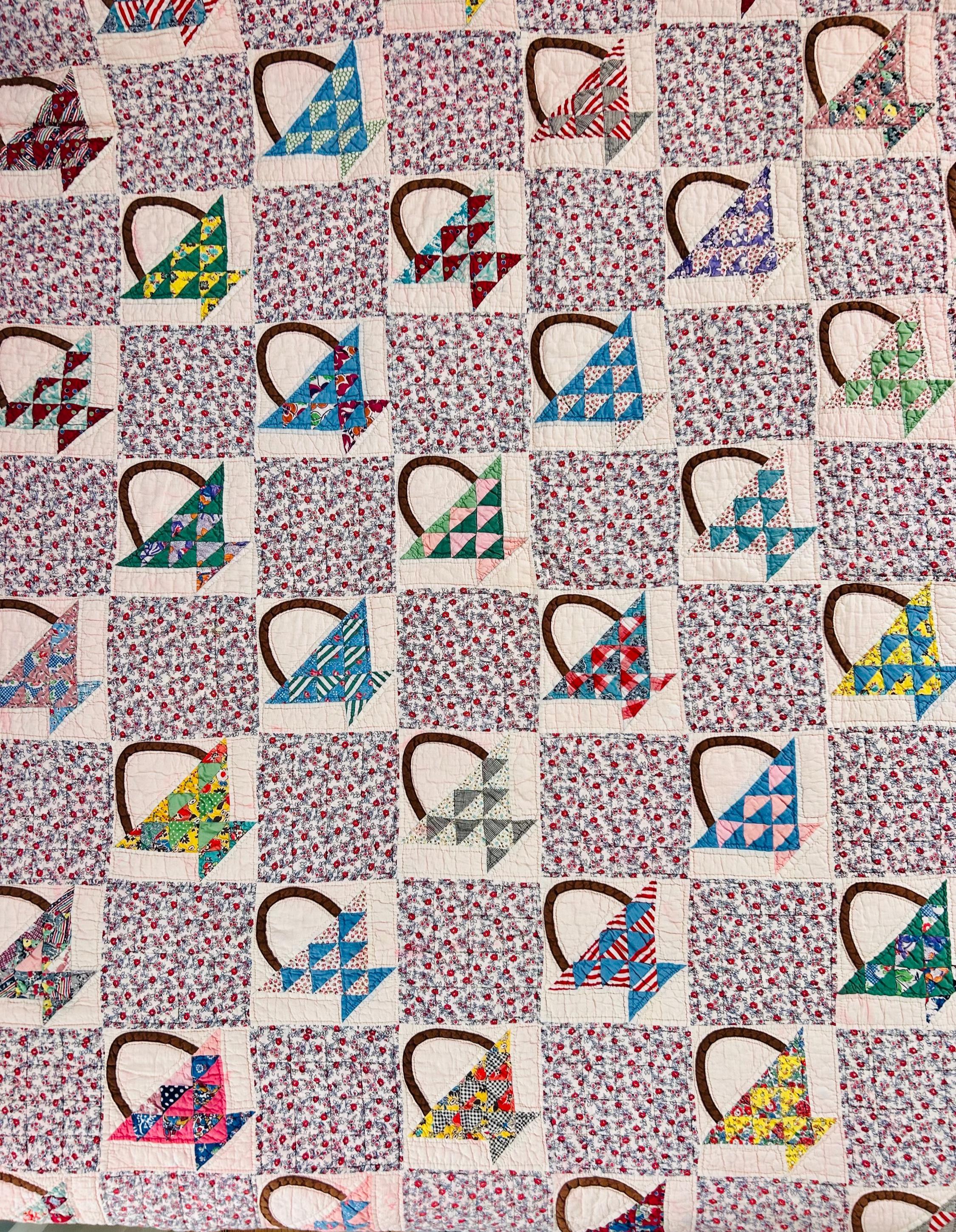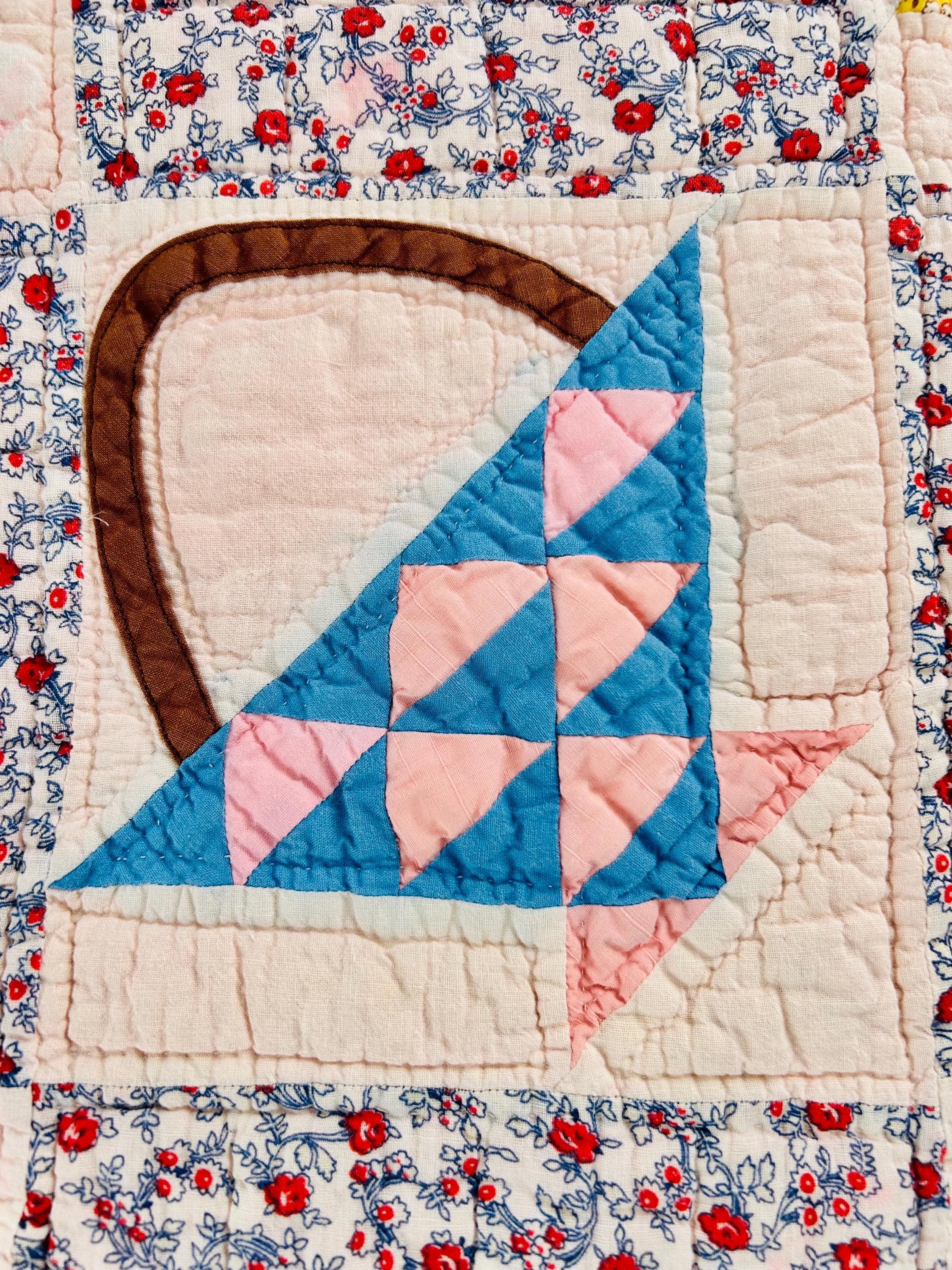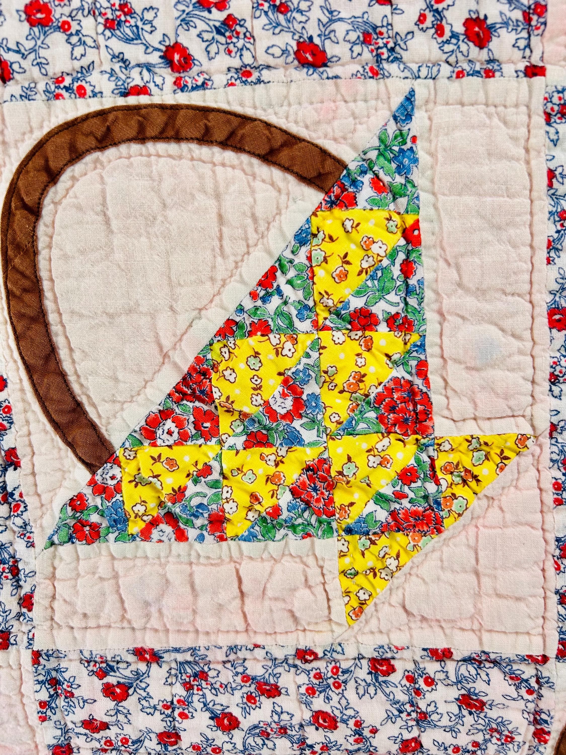 Details: • Date: Circa 1930s–1945 • Pattern: Flower Basket blocks with pieced triangular baskets • Size: 60” x 72” • Materials: Cotton fabrics; cotton batting • Construction: Hand pieced and hand quilted • Binding: Red cotton binding