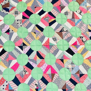 The back is a cream-pink cotton while the binding is red cotton that has been machine-stitched to the front and hand-stitched to the back. The cotton batting is lightweight.