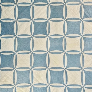 The quilt is entirely hand quilted with tiny stitches in outlines of the basket patchwork and in square grids in the blocks in-between.
