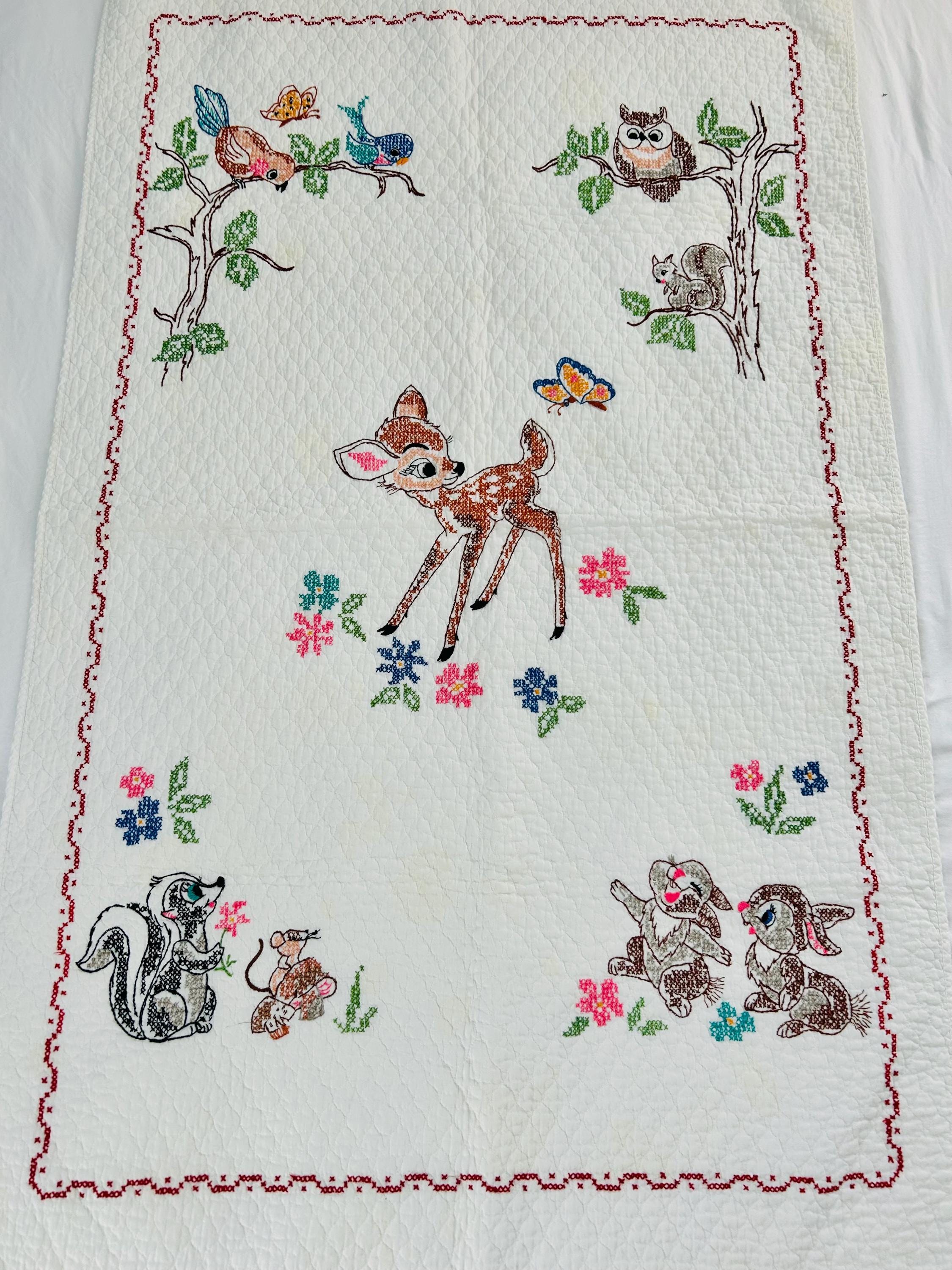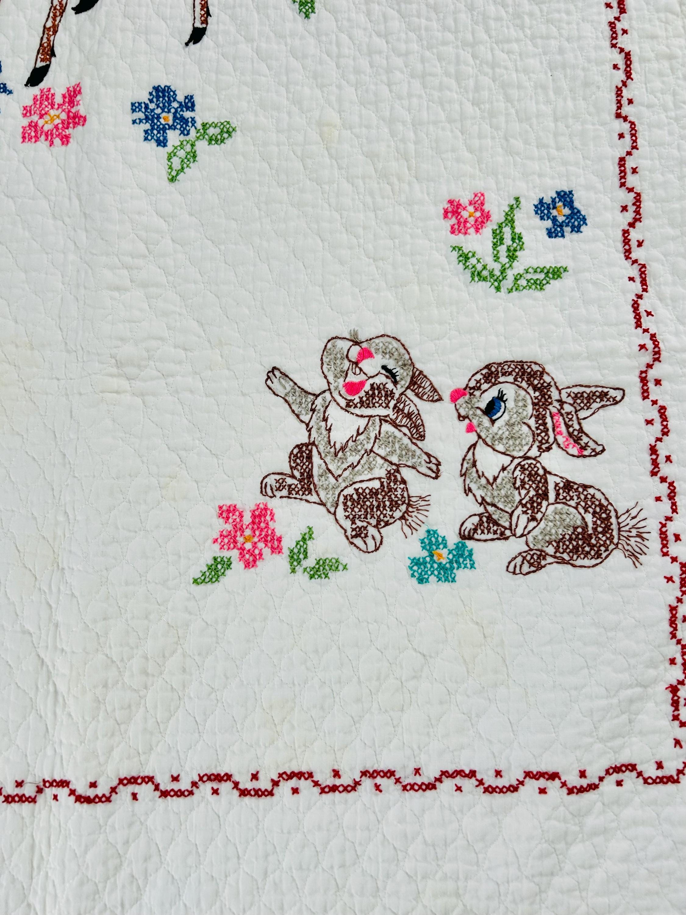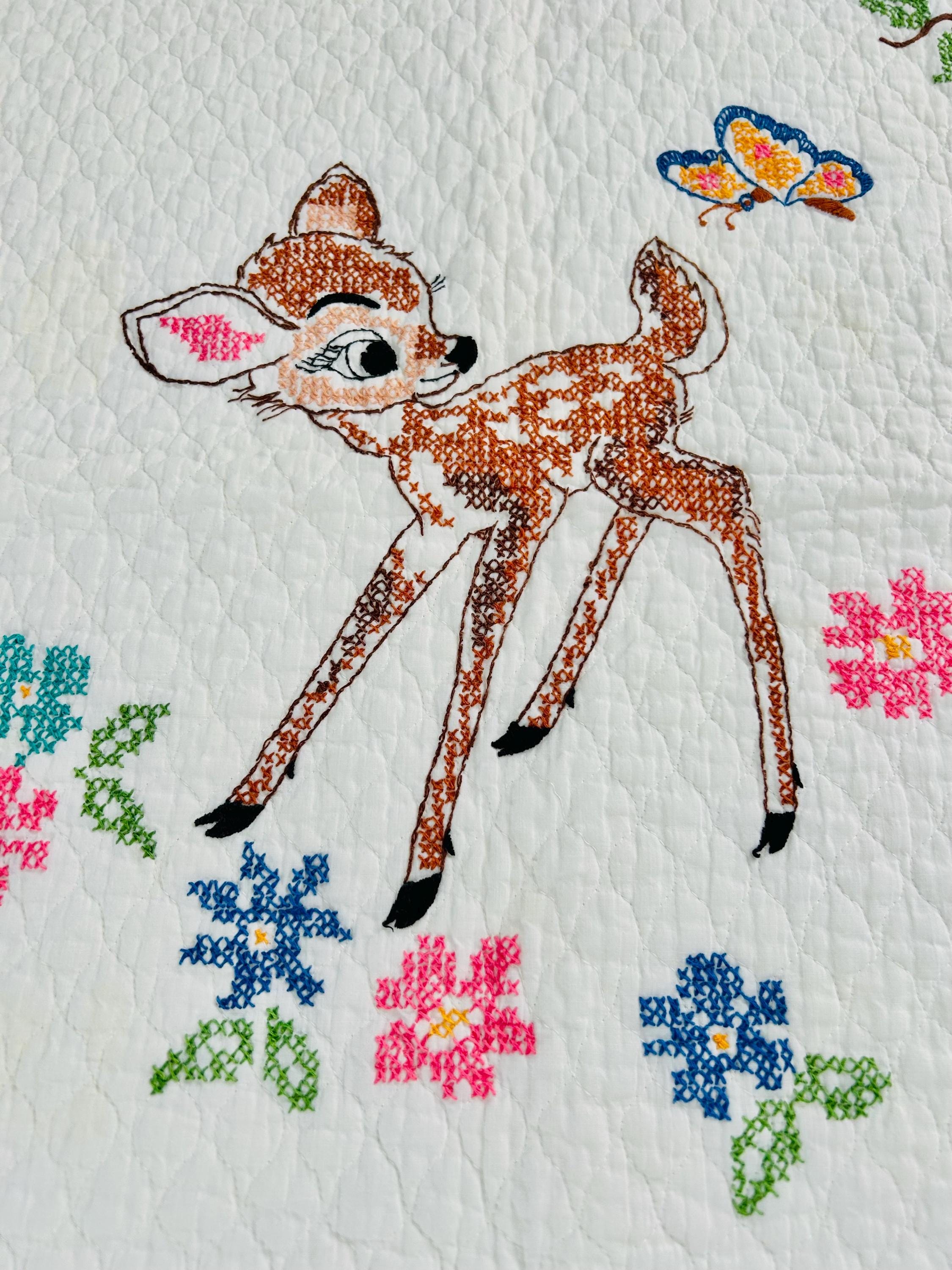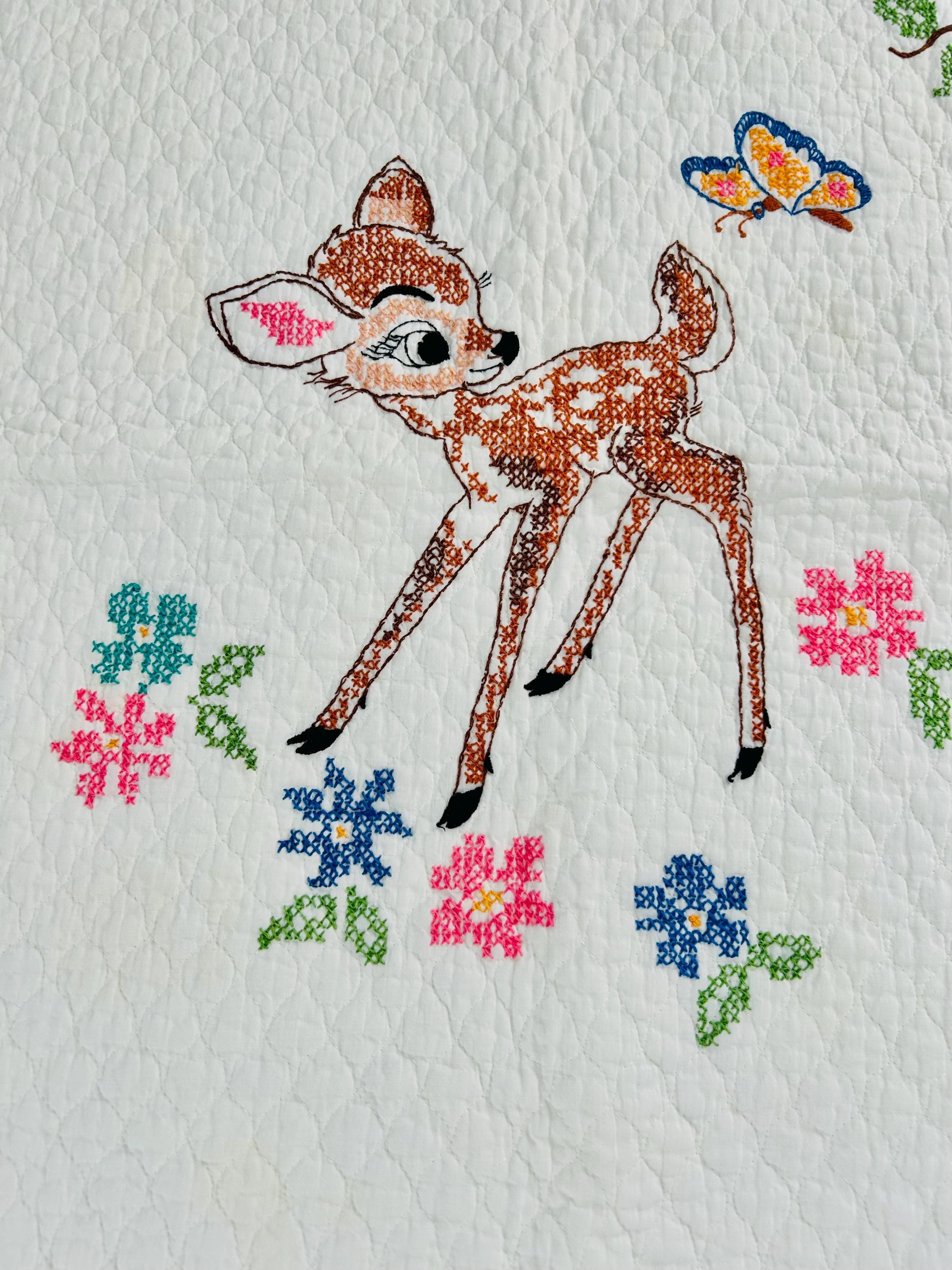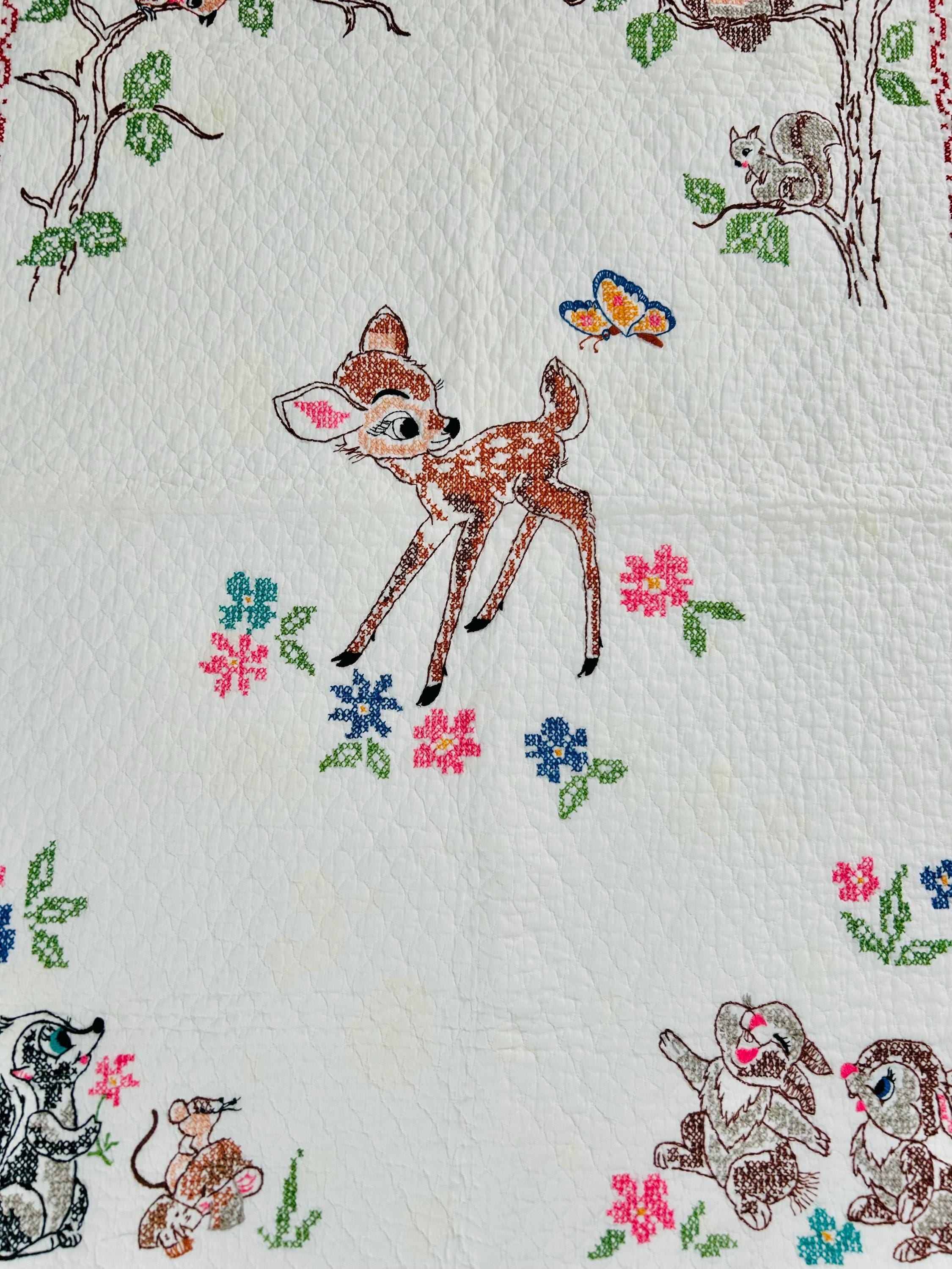 • Pattern: Bambi & Friends woodland scene from a Bucilla kit • Era: Circa 1970s • Size: 33” x 55” • Technique: Hand cross-stitched embroidery on pre-quilted cotton • Materials: Cotton fabric and cotton floss • Colors: Brown, tan, hot pink, turquoise, blue, green, red • Edge Finish: Red embroidered border • Batting: Thin crib-weight batting