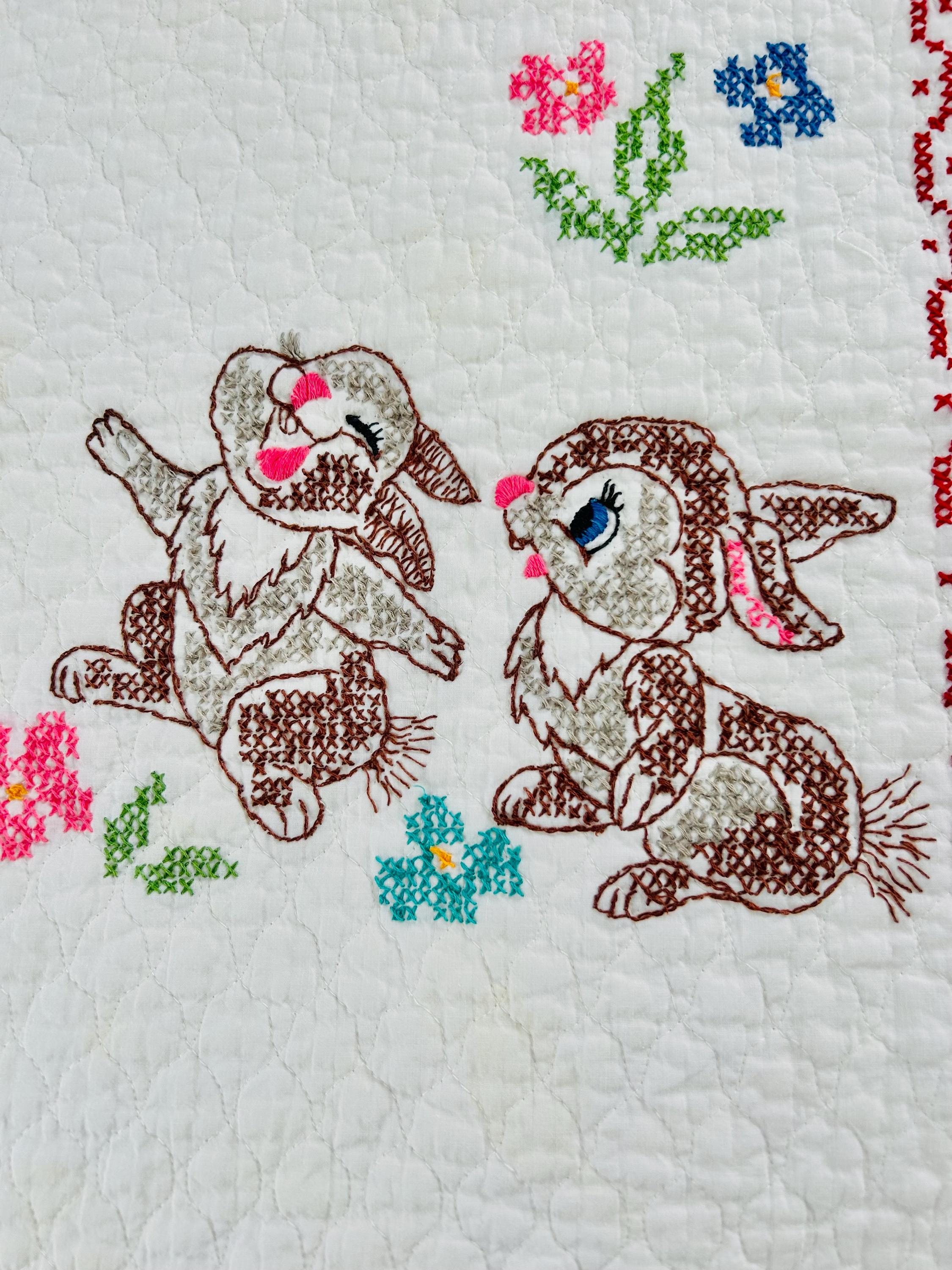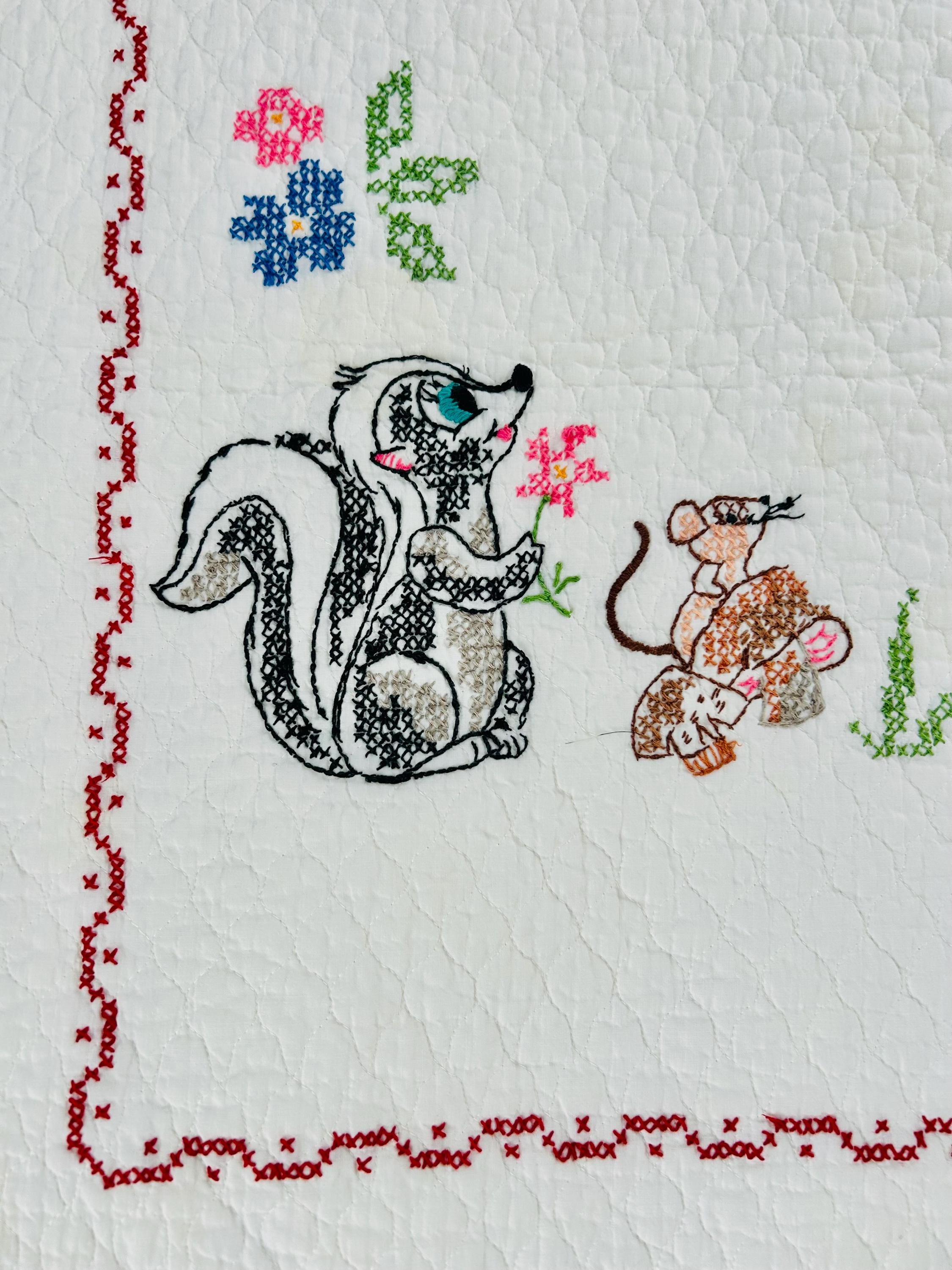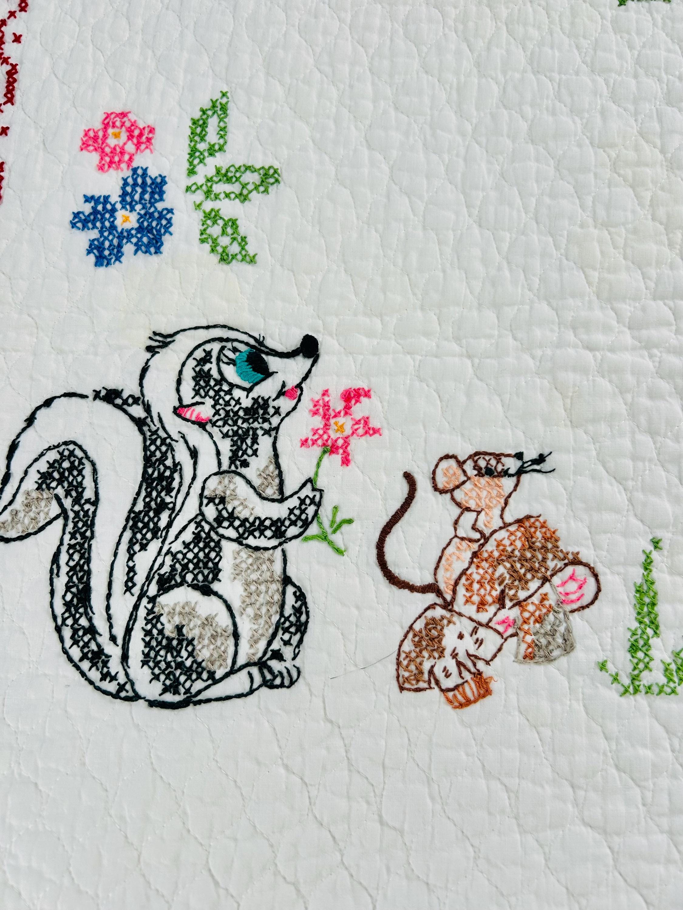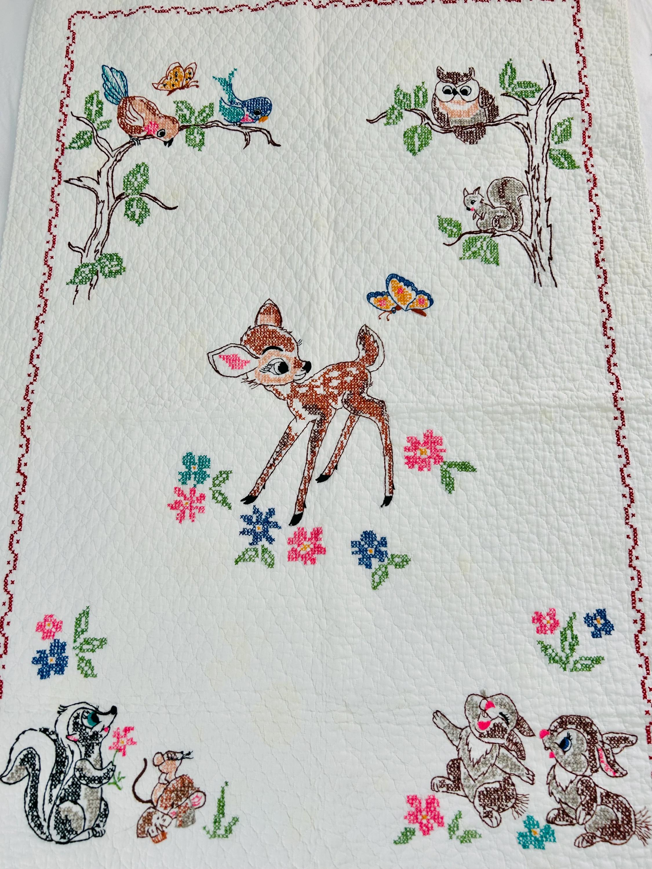 • Pattern: Bambi & Friends woodland scene from a Bucilla kit • Era: Circa 1970s • Size: 33” x 55” • Technique: Hand cross-stitched embroidery on pre-quilted cotton • Materials: Cotton fabric and cotton floss • Colors: Brown, tan, hot pink, turquoise, blue, green, red • Edge Finish: Red embroidered border • Batting: Thin crib-weight batting