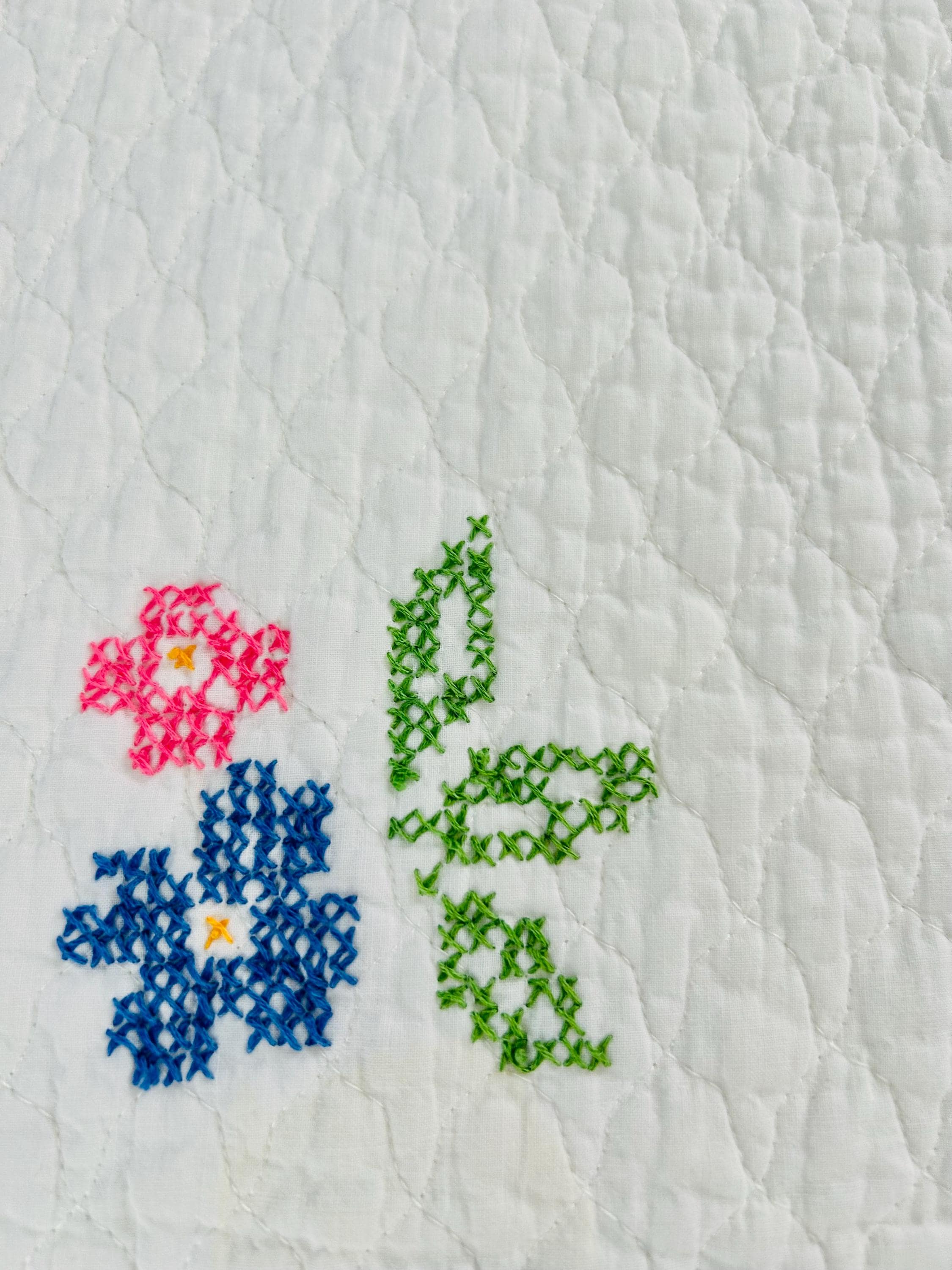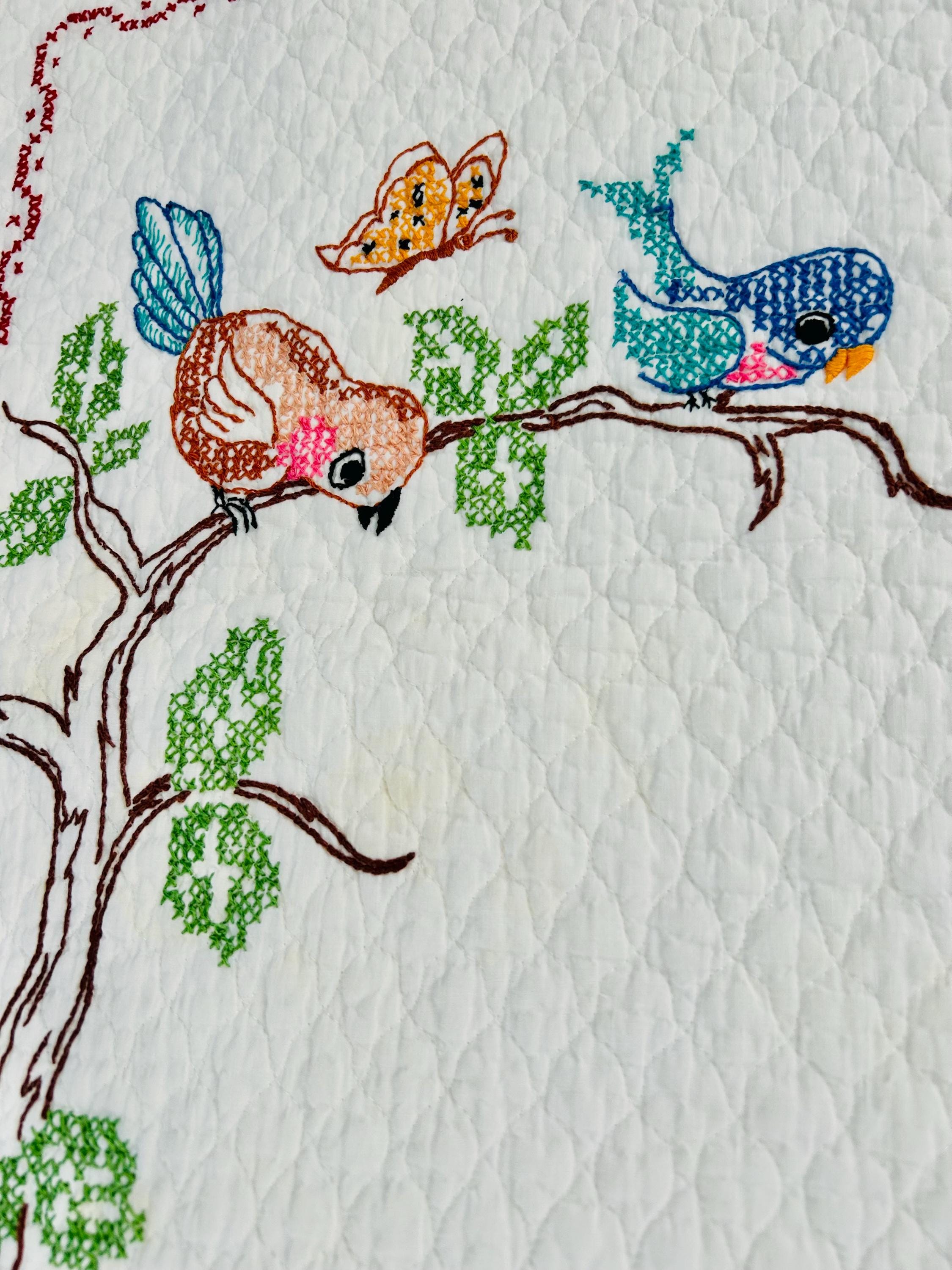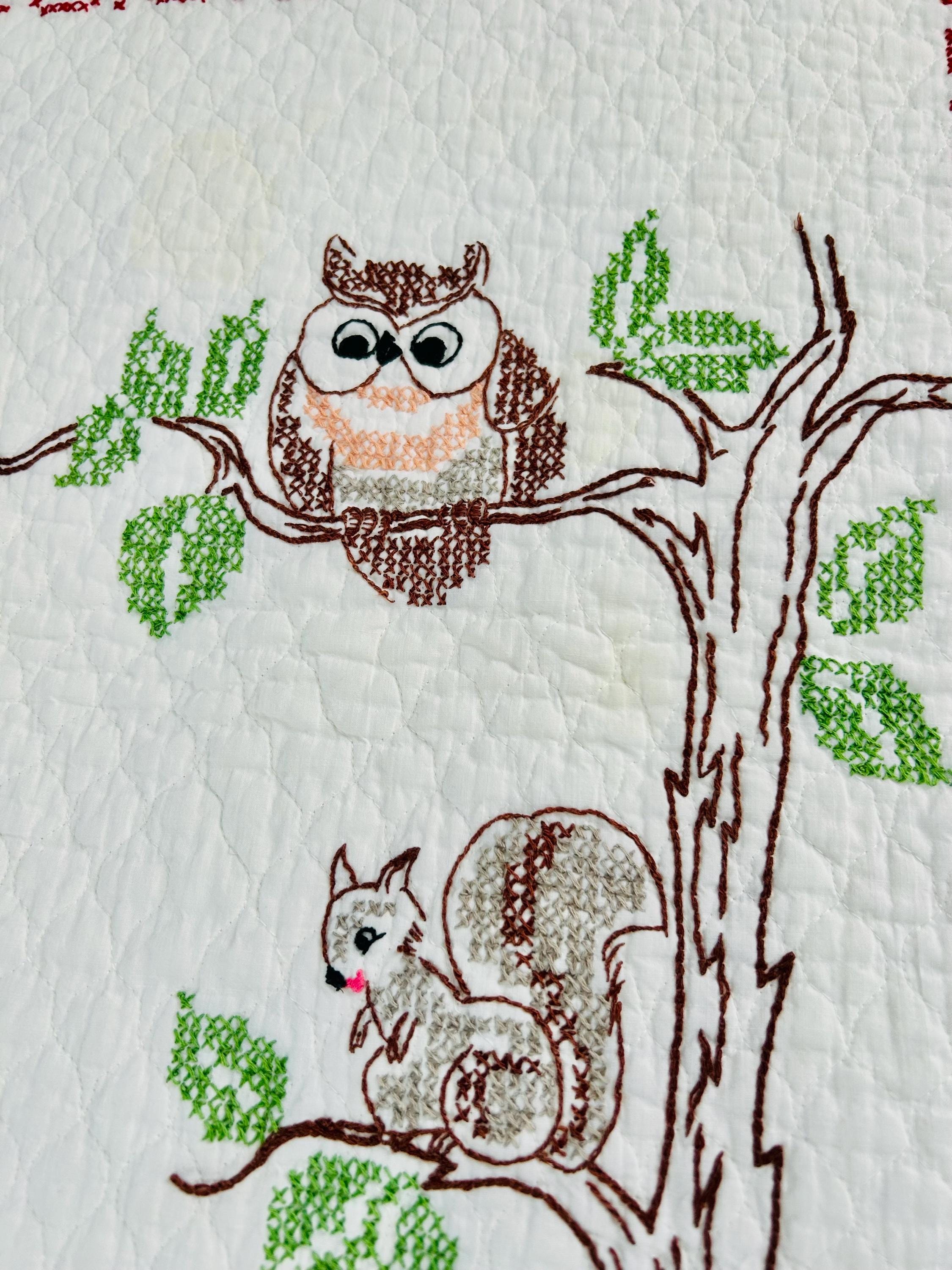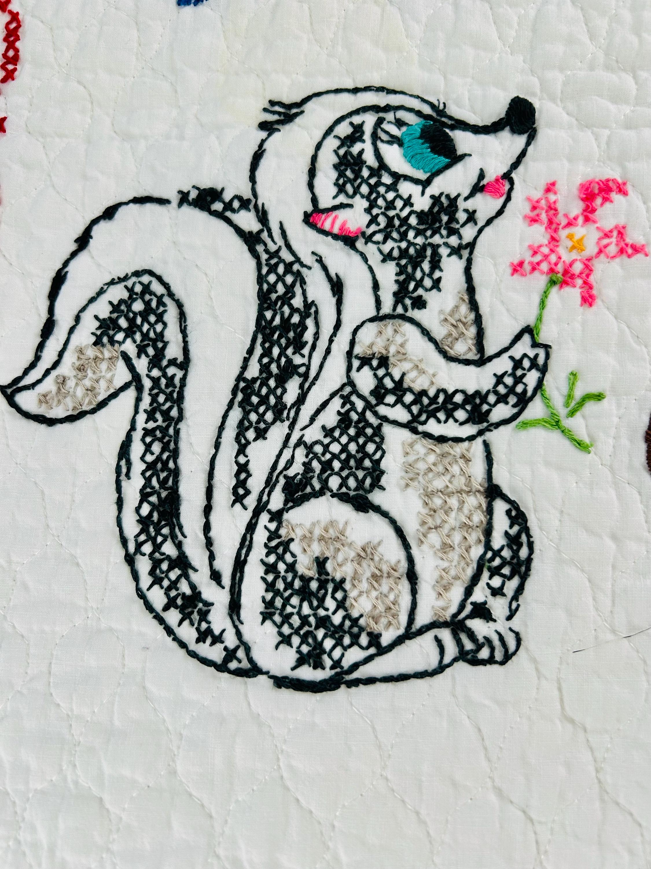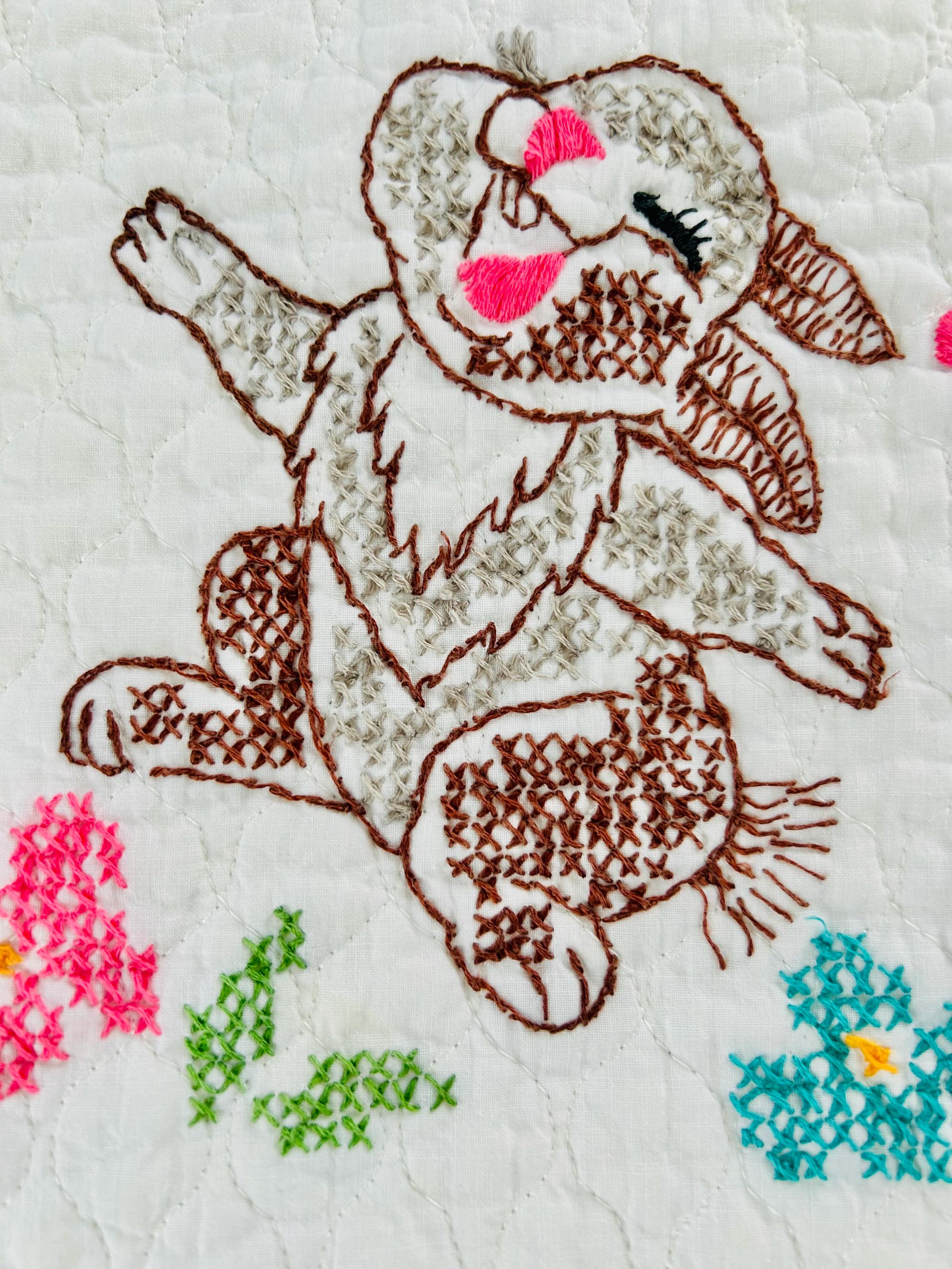 • Pattern: Bambi & Friends woodland scene from a Bucilla kit • Era: Circa 1970s • Size: 33” x 55” • Technique: Hand cross-stitched embroidery on pre-quilted cotton • Materials: Cotton fabric and cotton floss • Colors: Brown, tan, hot pink, turquoise, blue, green, red • Edge Finish: Red embroidered border • Batting: Thin crib-weight batting