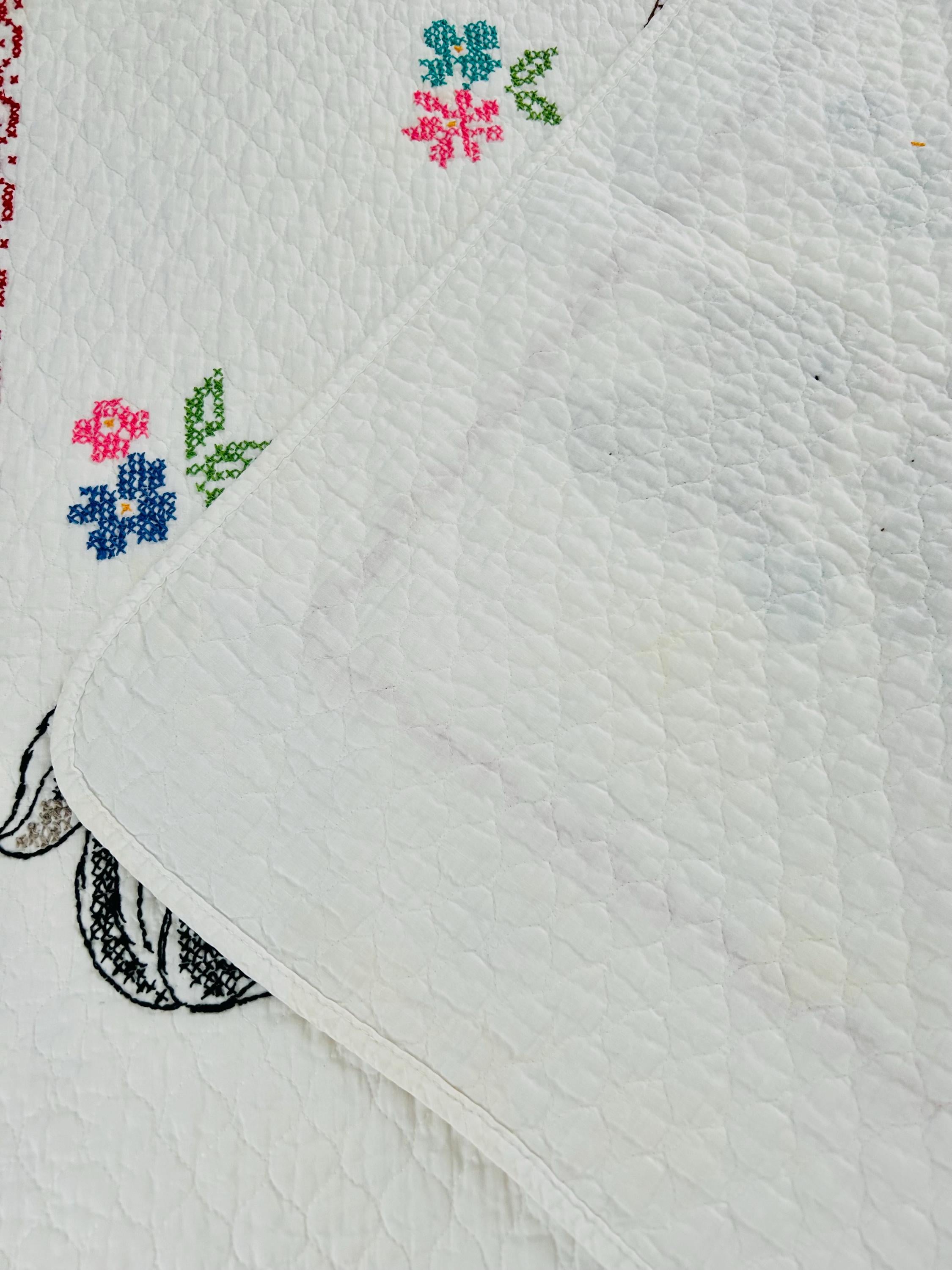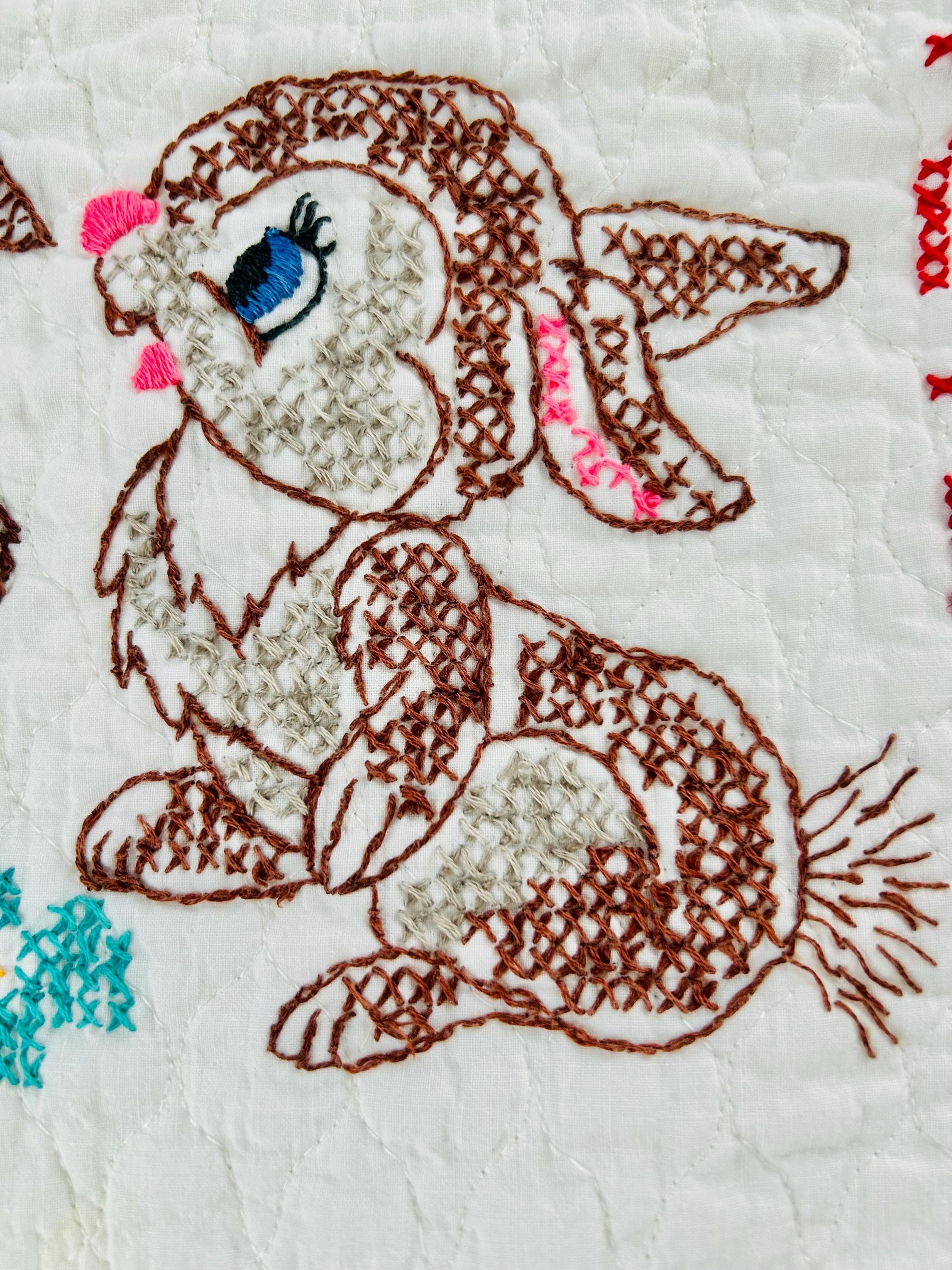 The stitching is done entirely by hand in vibrant cotton floss on a white quilted cotton ground, finished with a delicate red embroidered border. The overall look is bright, nostalgic, and unmistakably late 1970s–1980s nursery style.