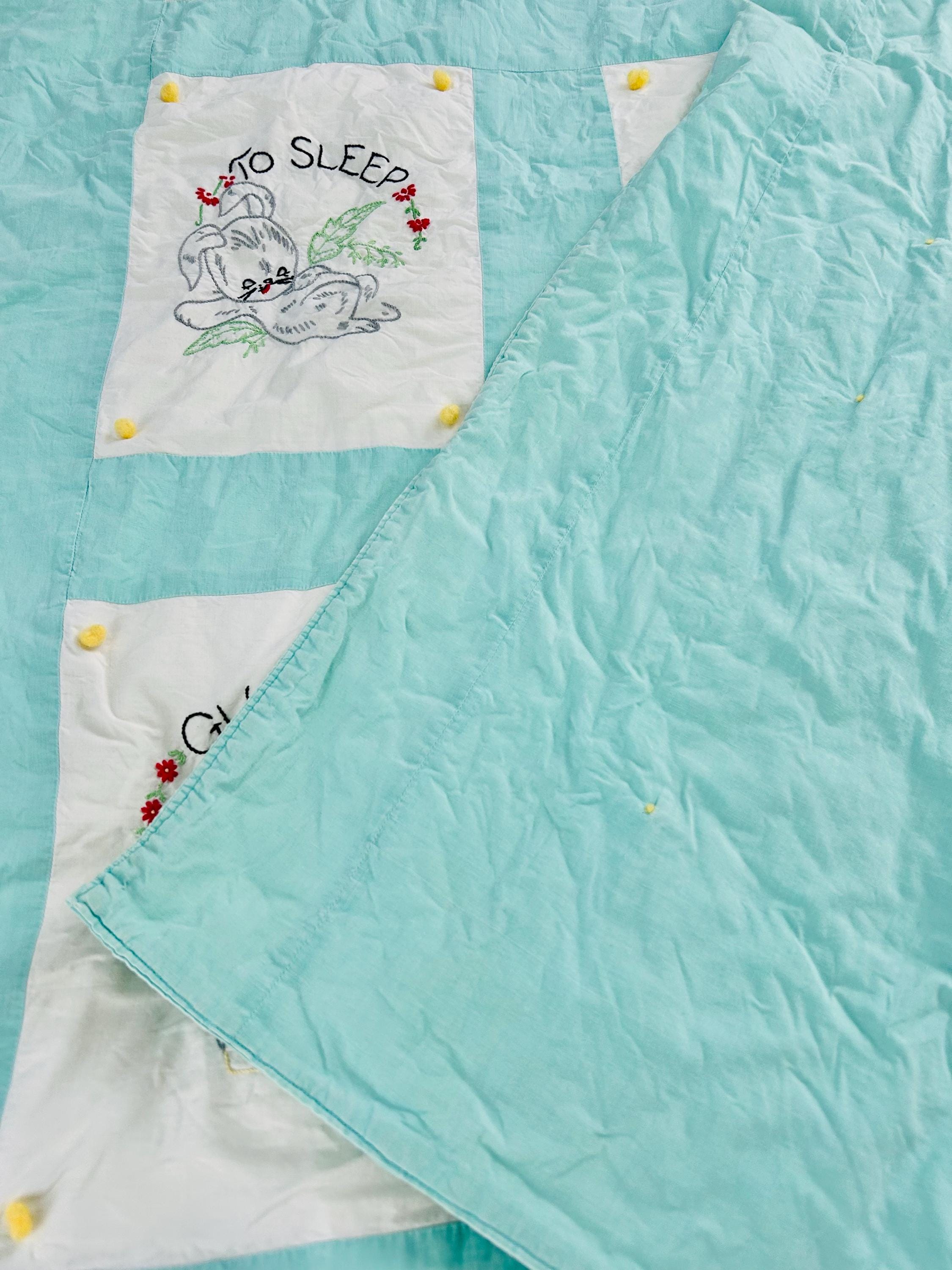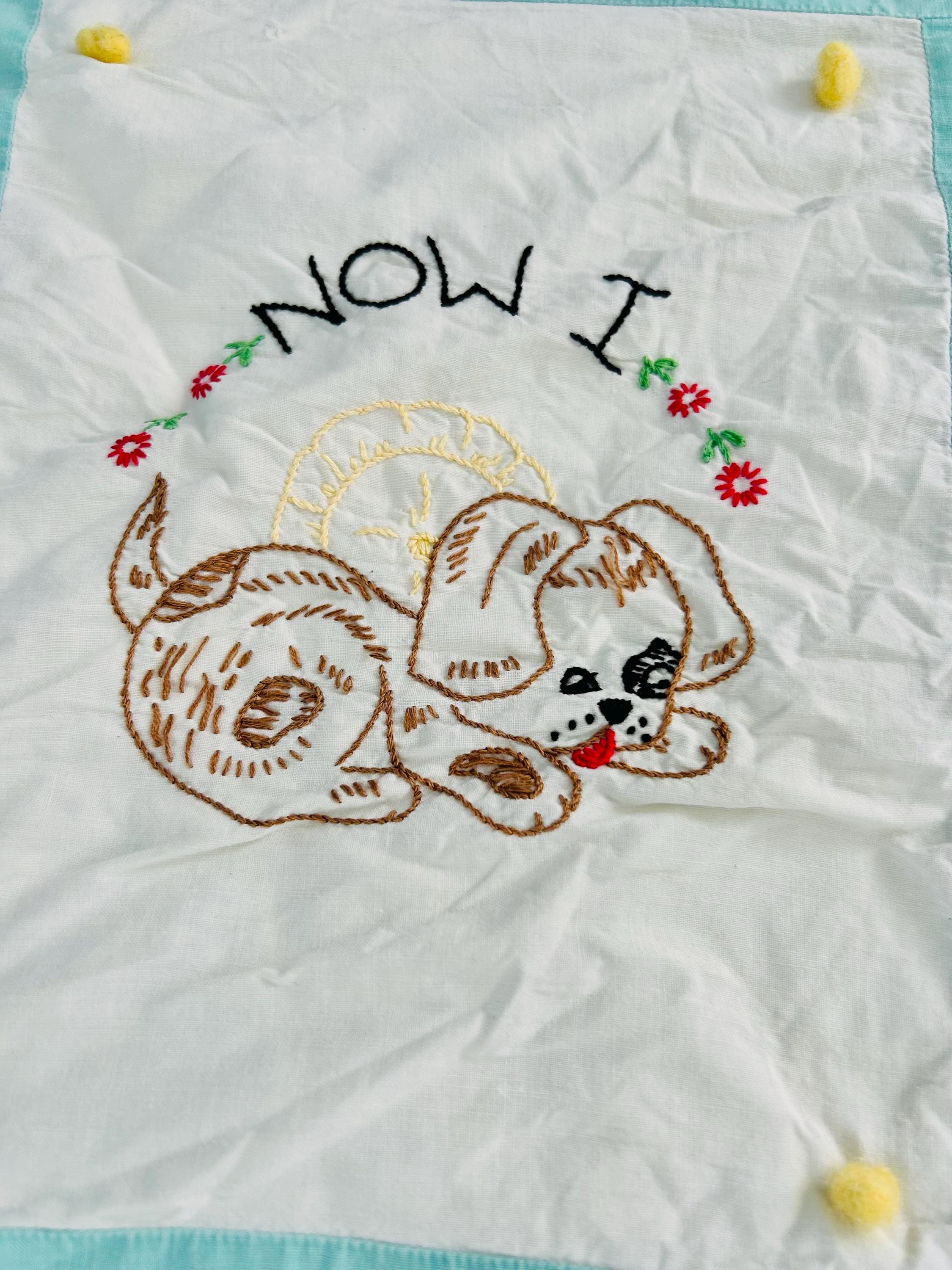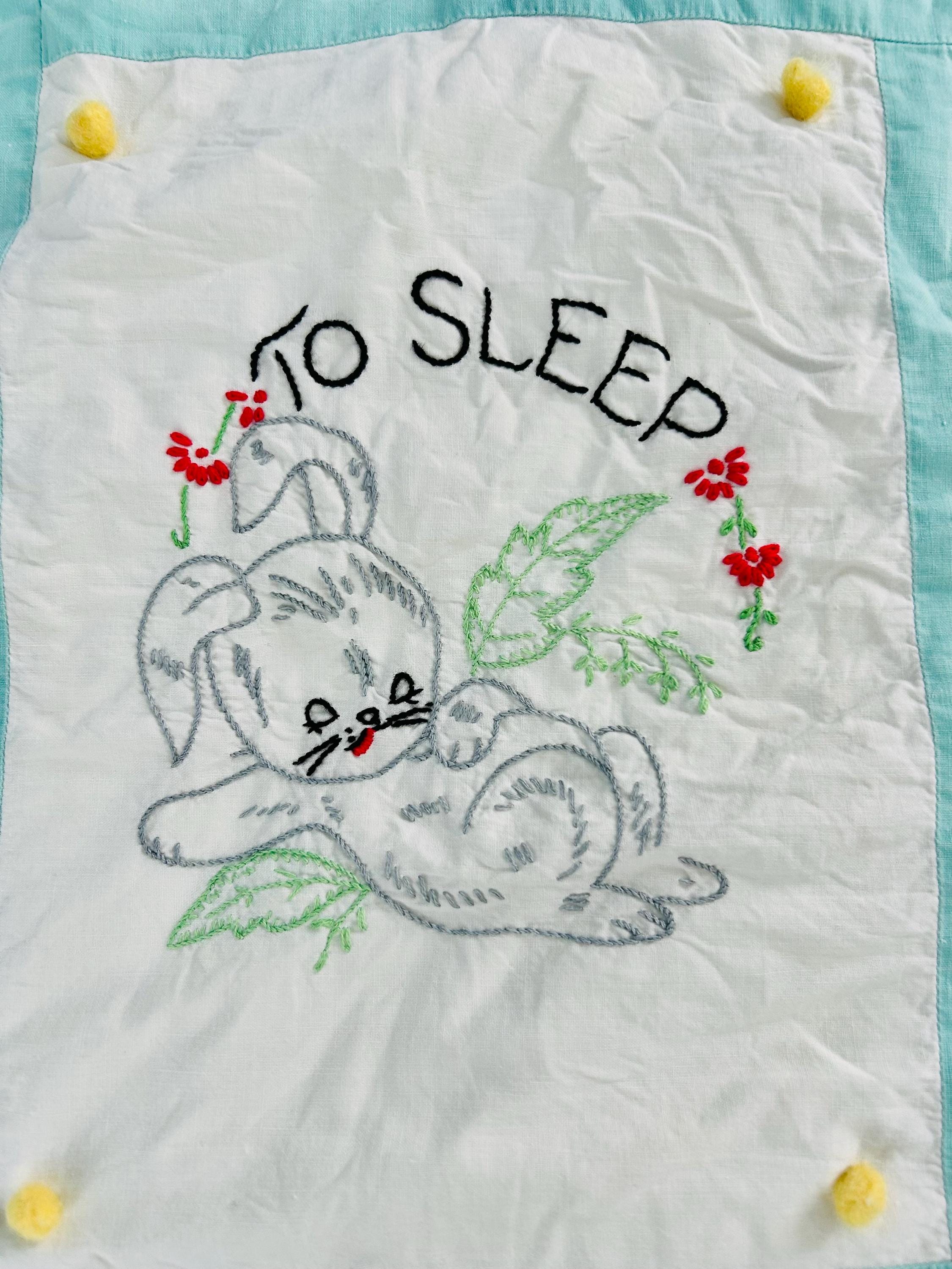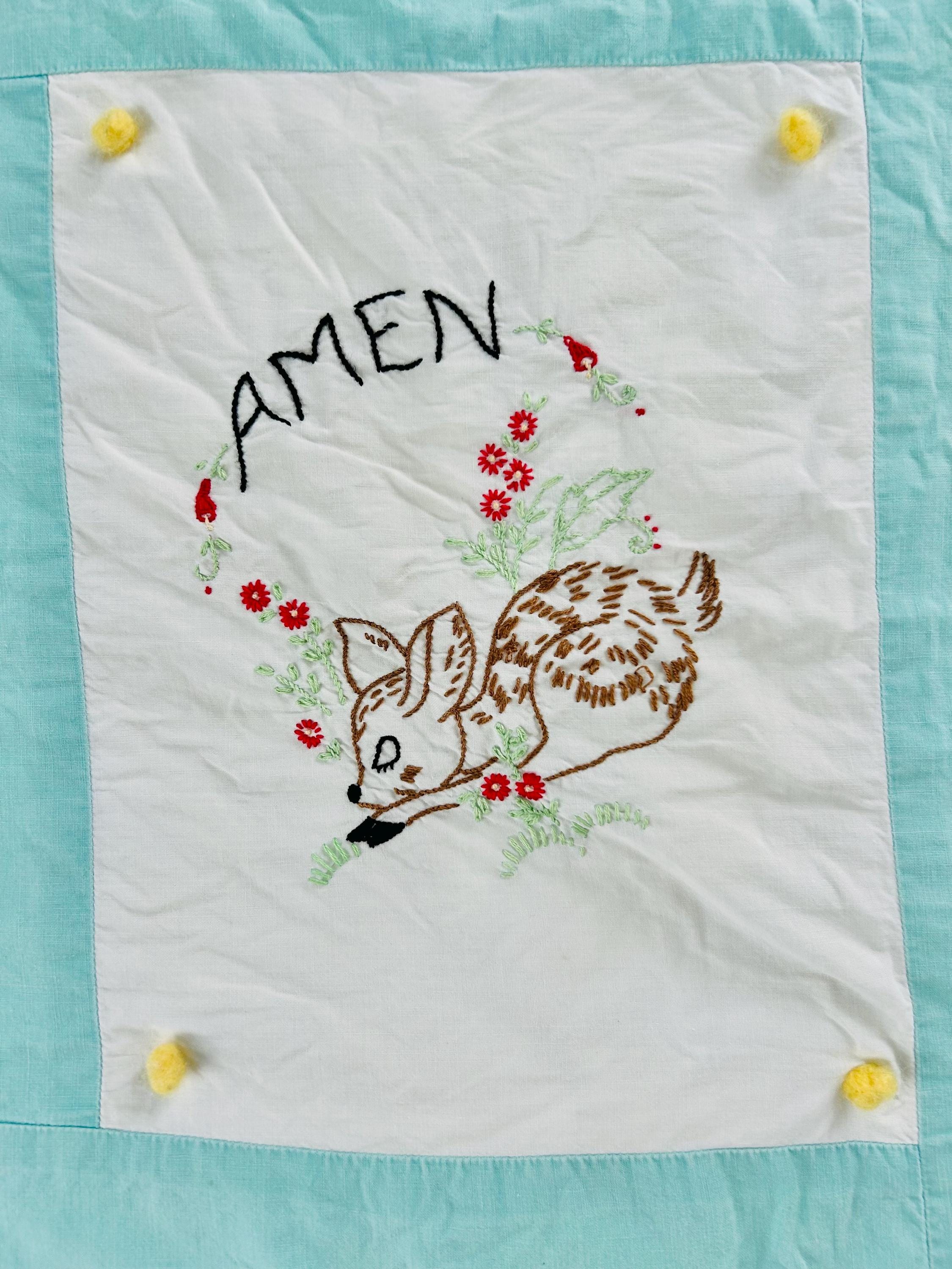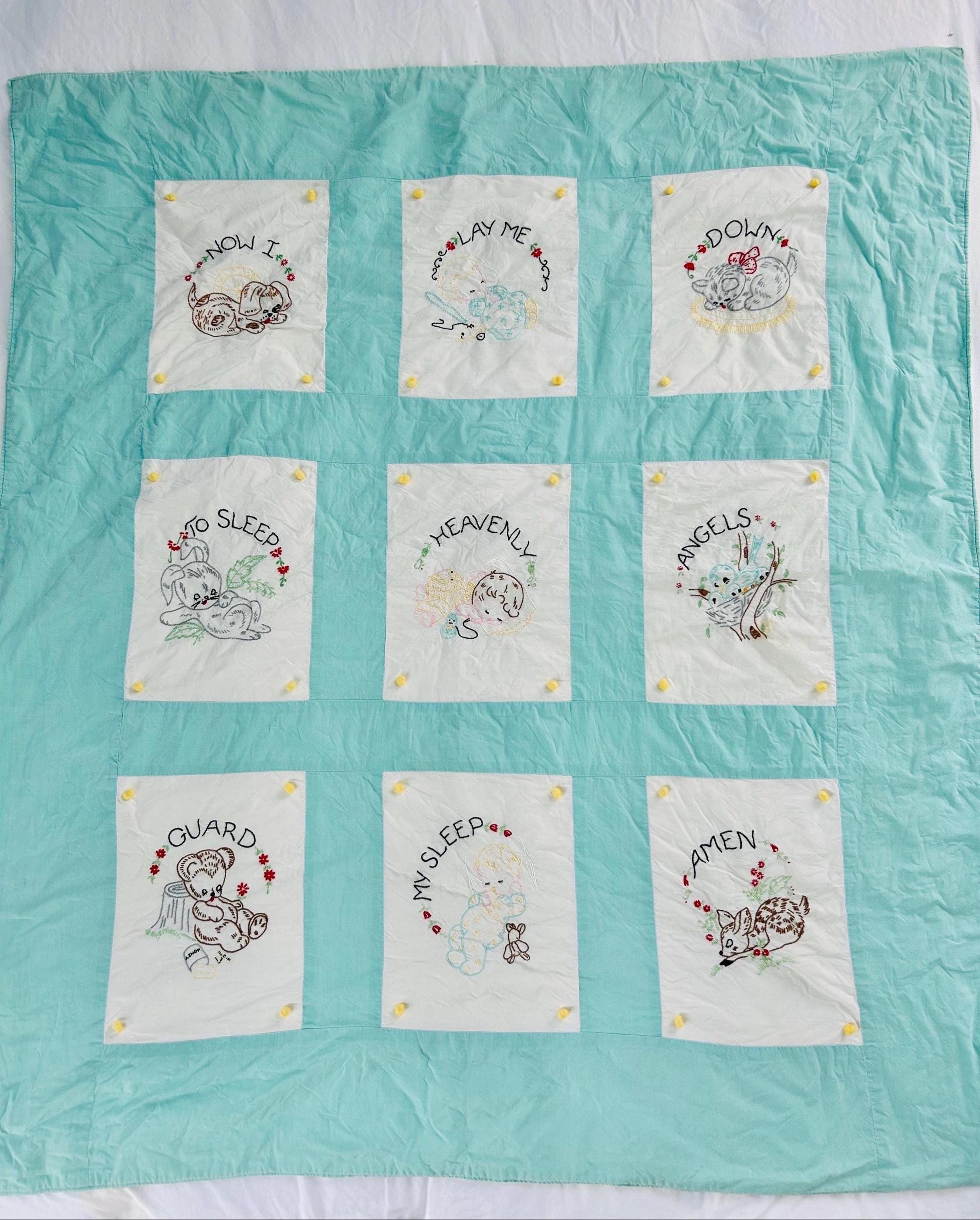 This is a sweet mid-century nursery quilt of the “Now I Lay Me Down to Sleep” prayer, beautifully illustrated across nine embroidered panels. Each block shows a sweet sleeping child or animal — bunny, kitten, teddy bear, birds, and more — stitched in soft pastels with bold black lettering.
