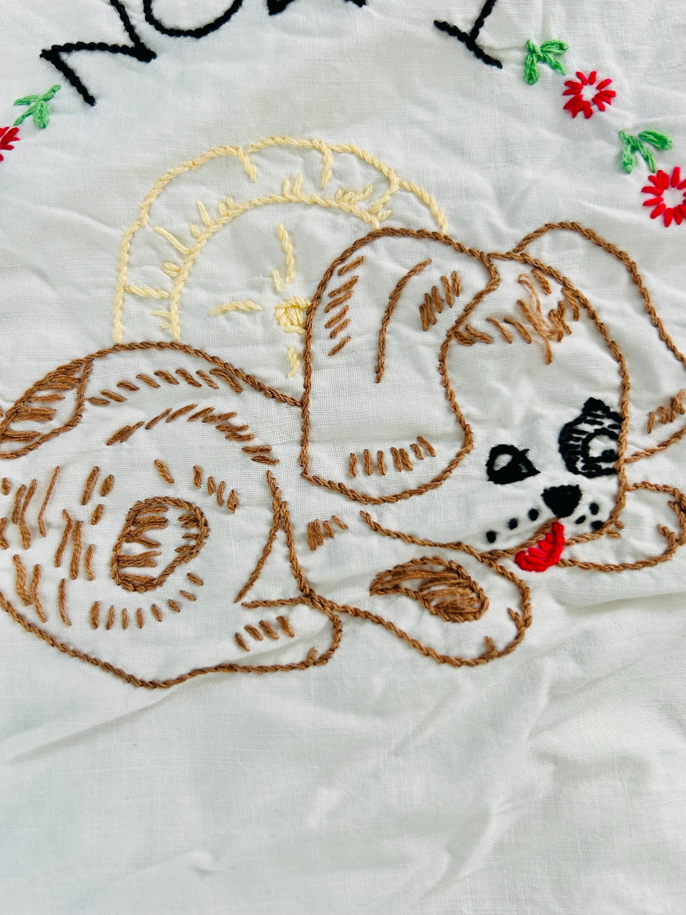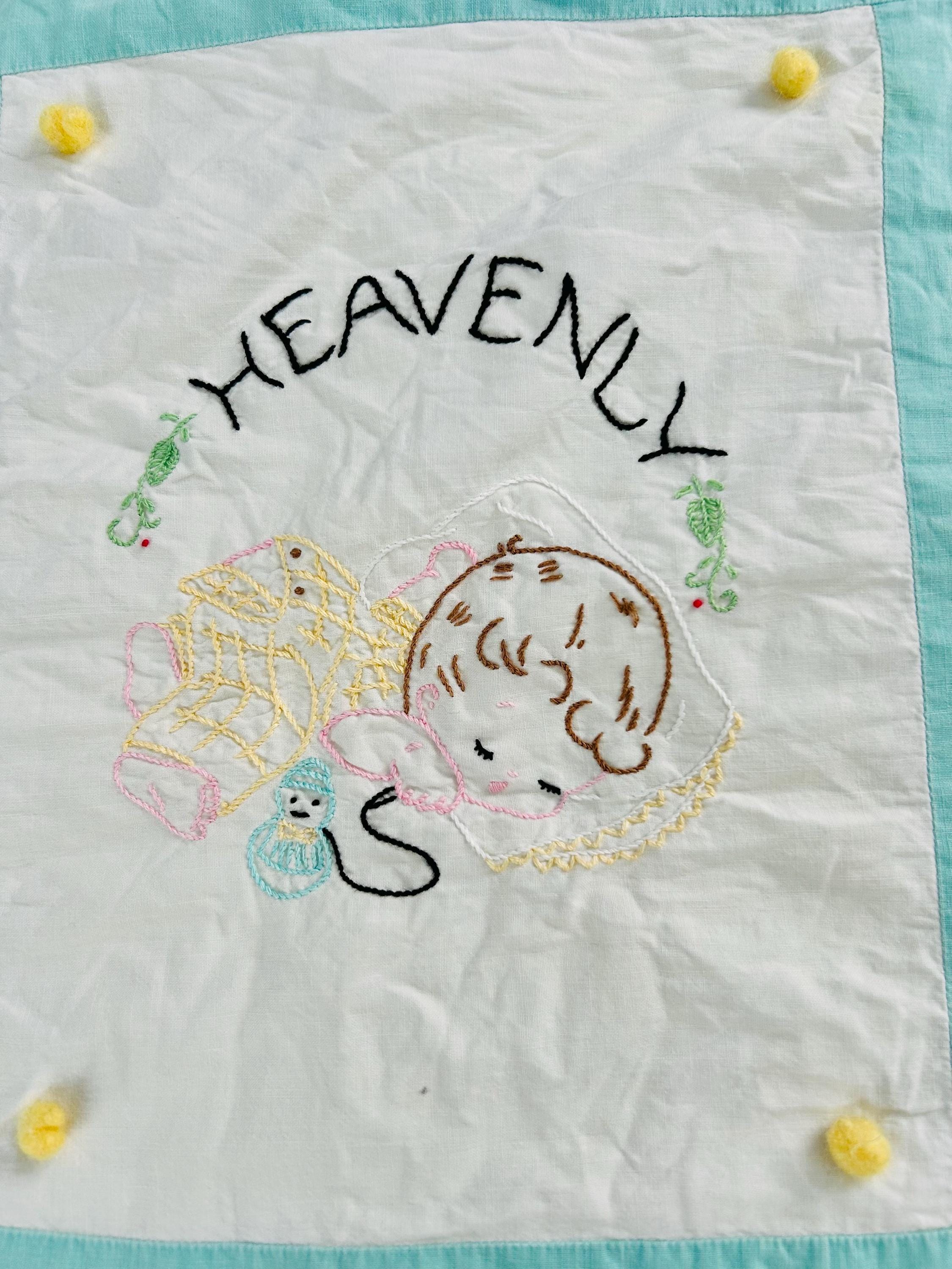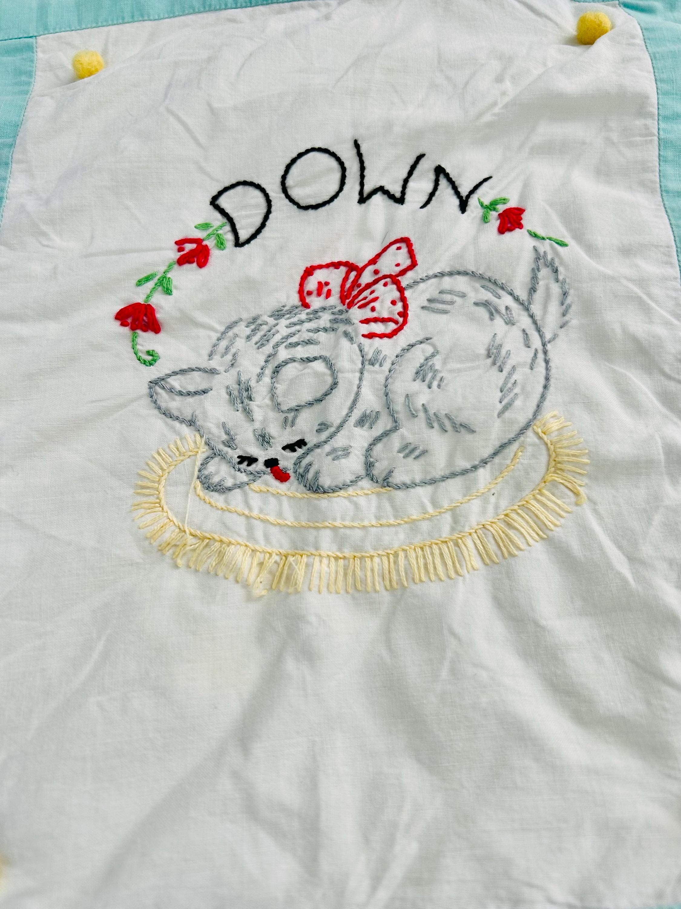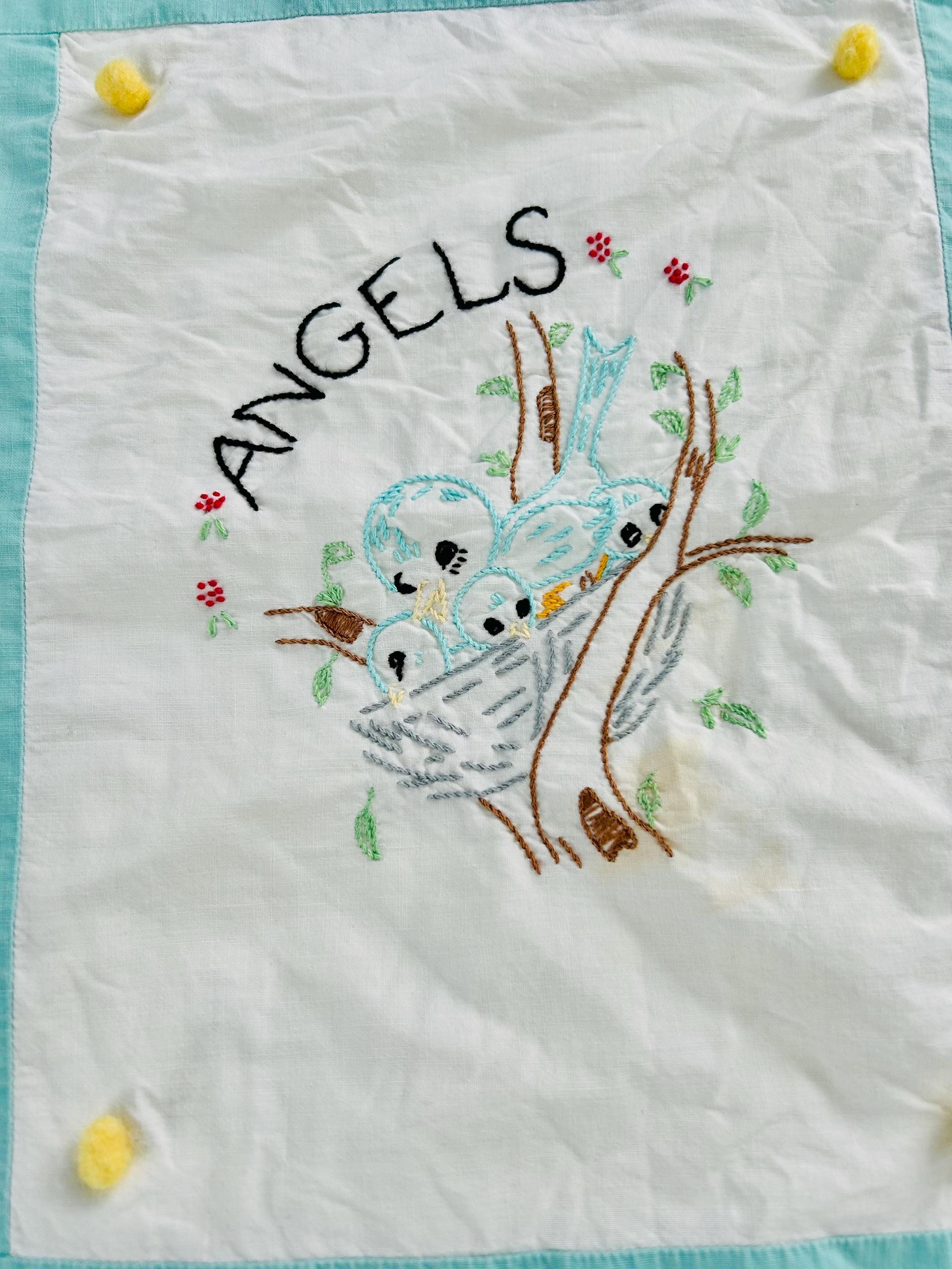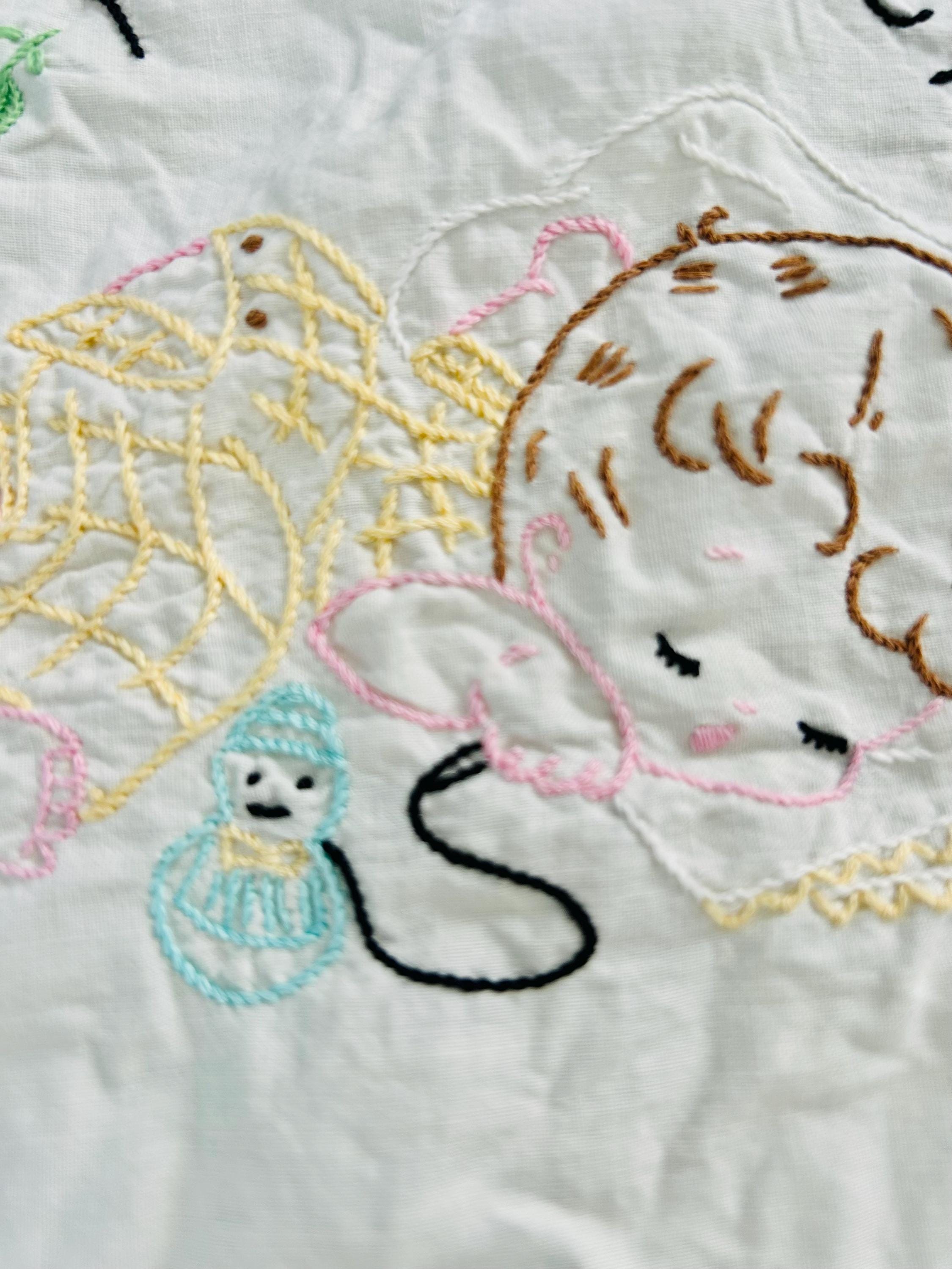 This is a sweet mid-century nursery quilt of the “Now I Lay Me Down to Sleep” prayer, beautifully illustrated across nine embroidered panels. Each block shows a sweet sleeping child or animal — bunny, kitten, teddy bear, birds, and more — stitched in soft pastels with bold black lettering.