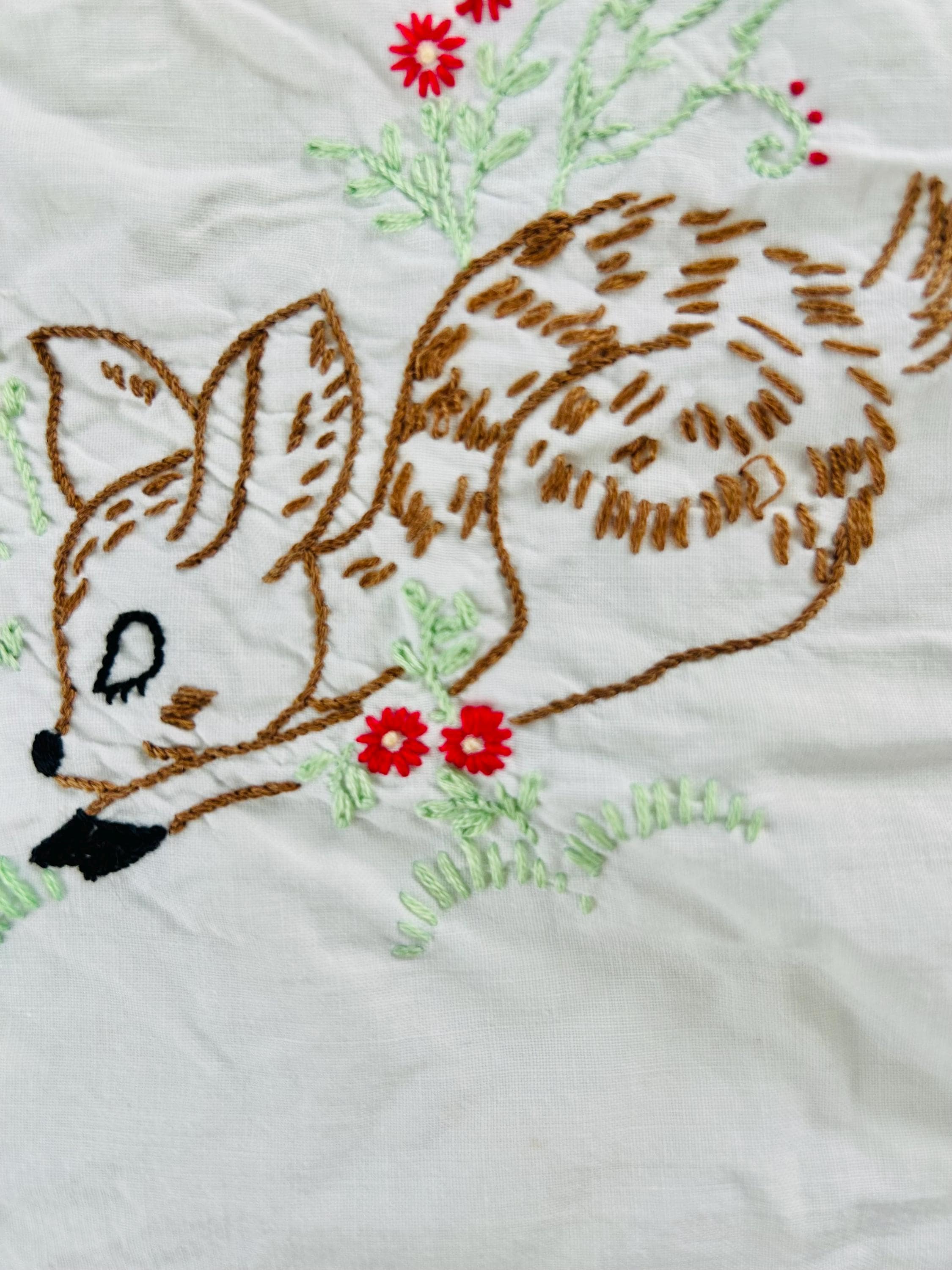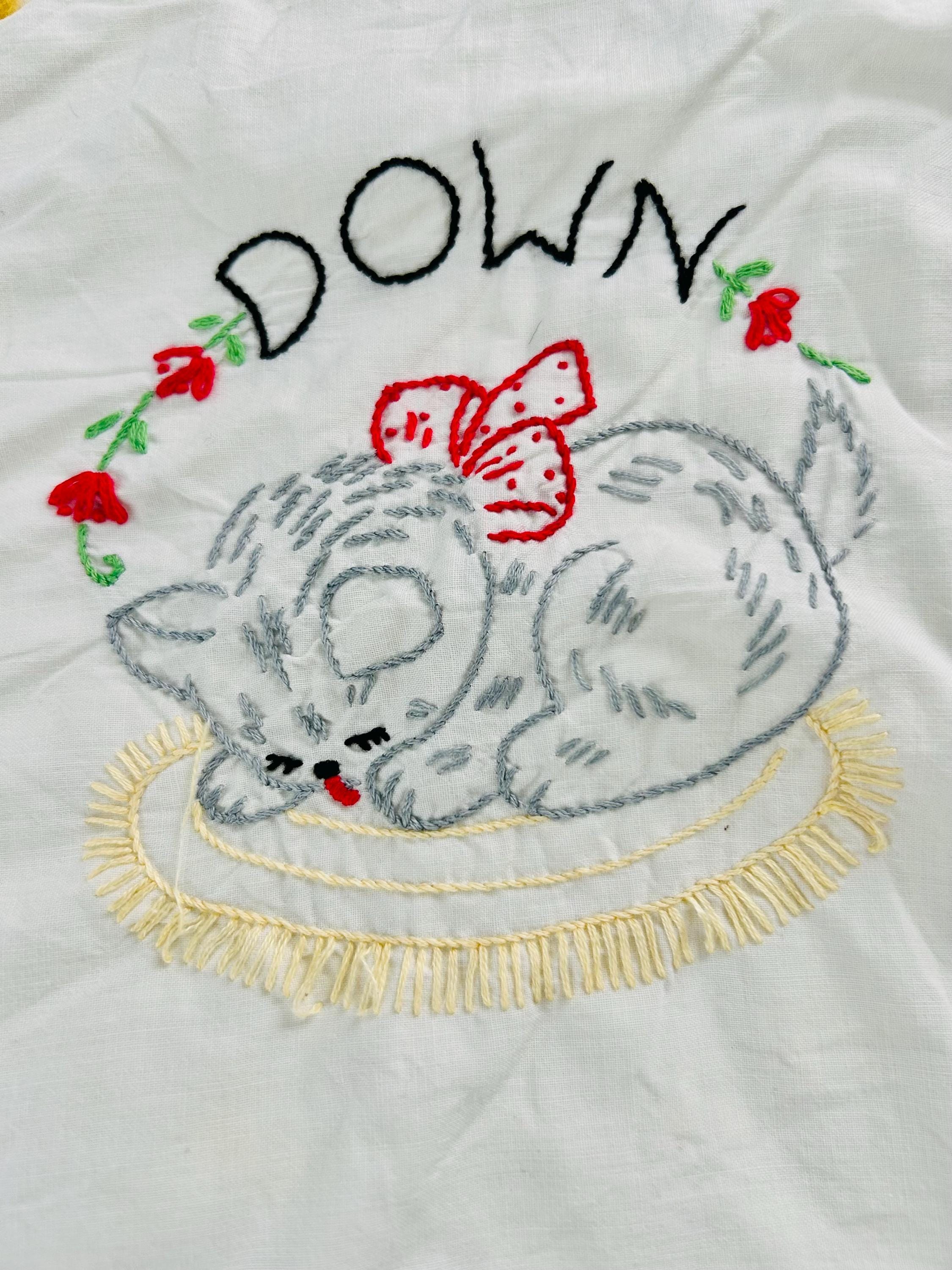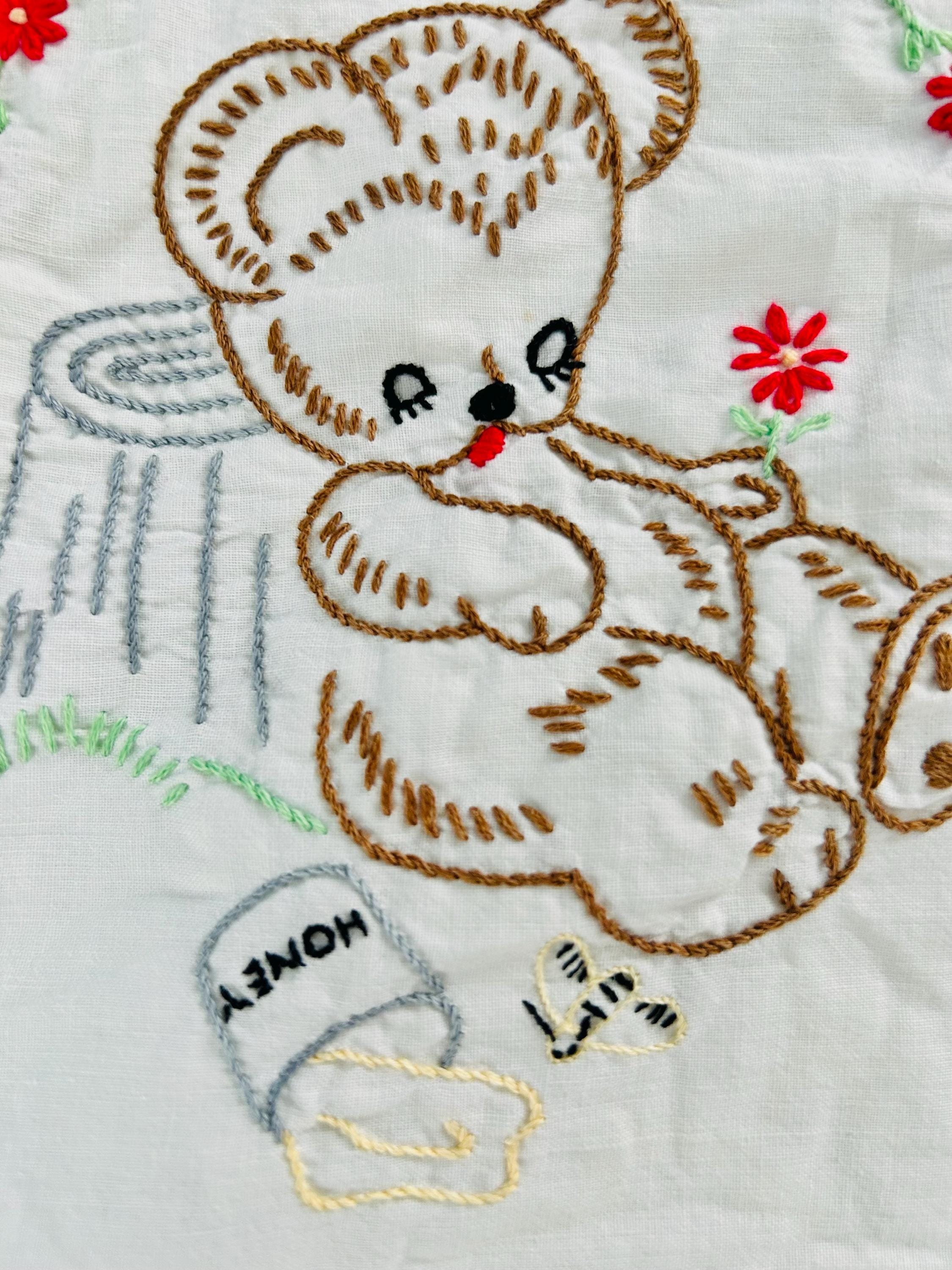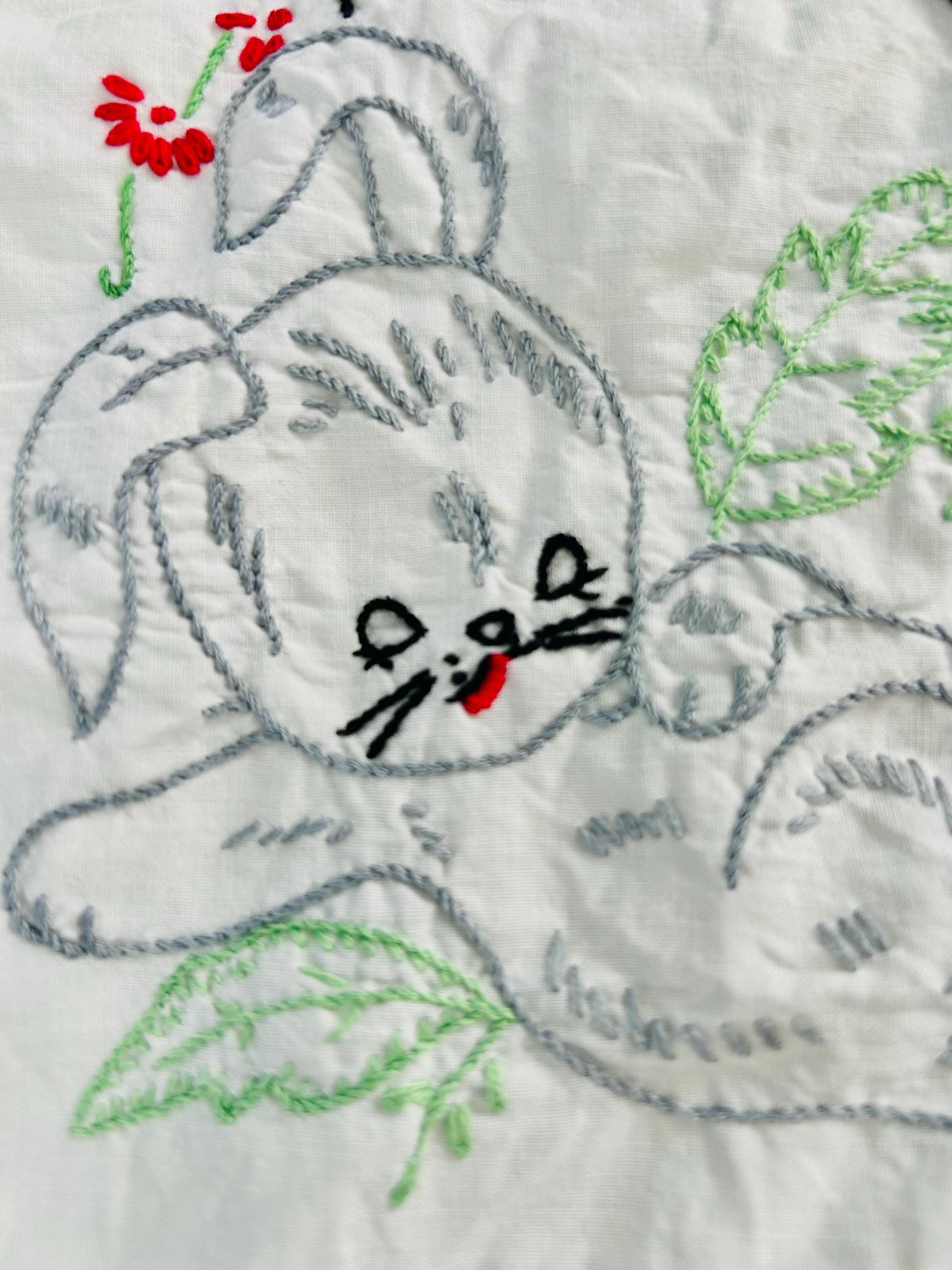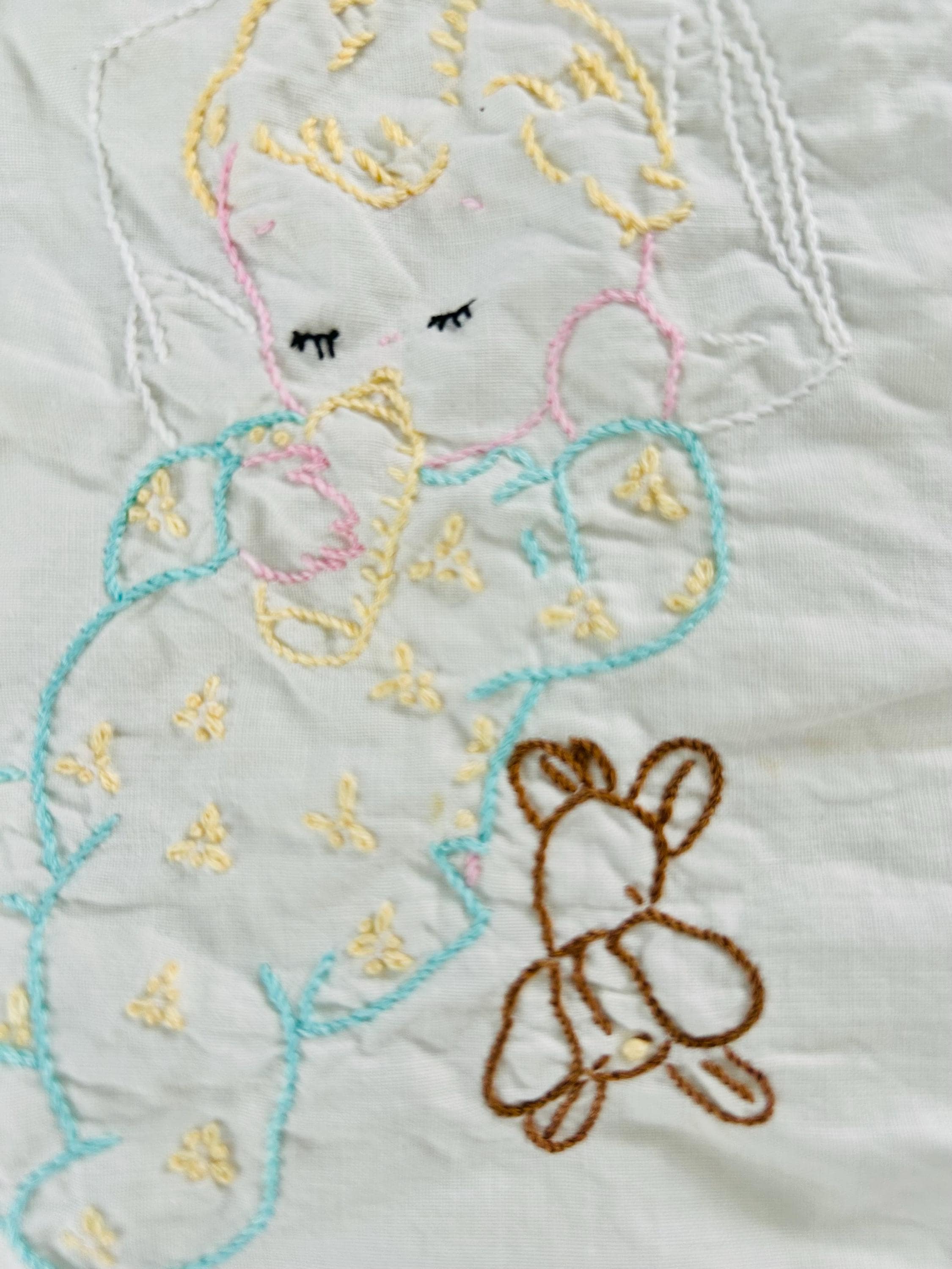 This is a sweet mid-century nursery quilt of the “Now I Lay Me Down to Sleep” prayer, beautifully illustrated across nine embroidered panels. Each block shows a sweet sleeping child or animal — bunny, kitten, teddy bear, birds, and more — stitched in soft pastels with bold black lettering.