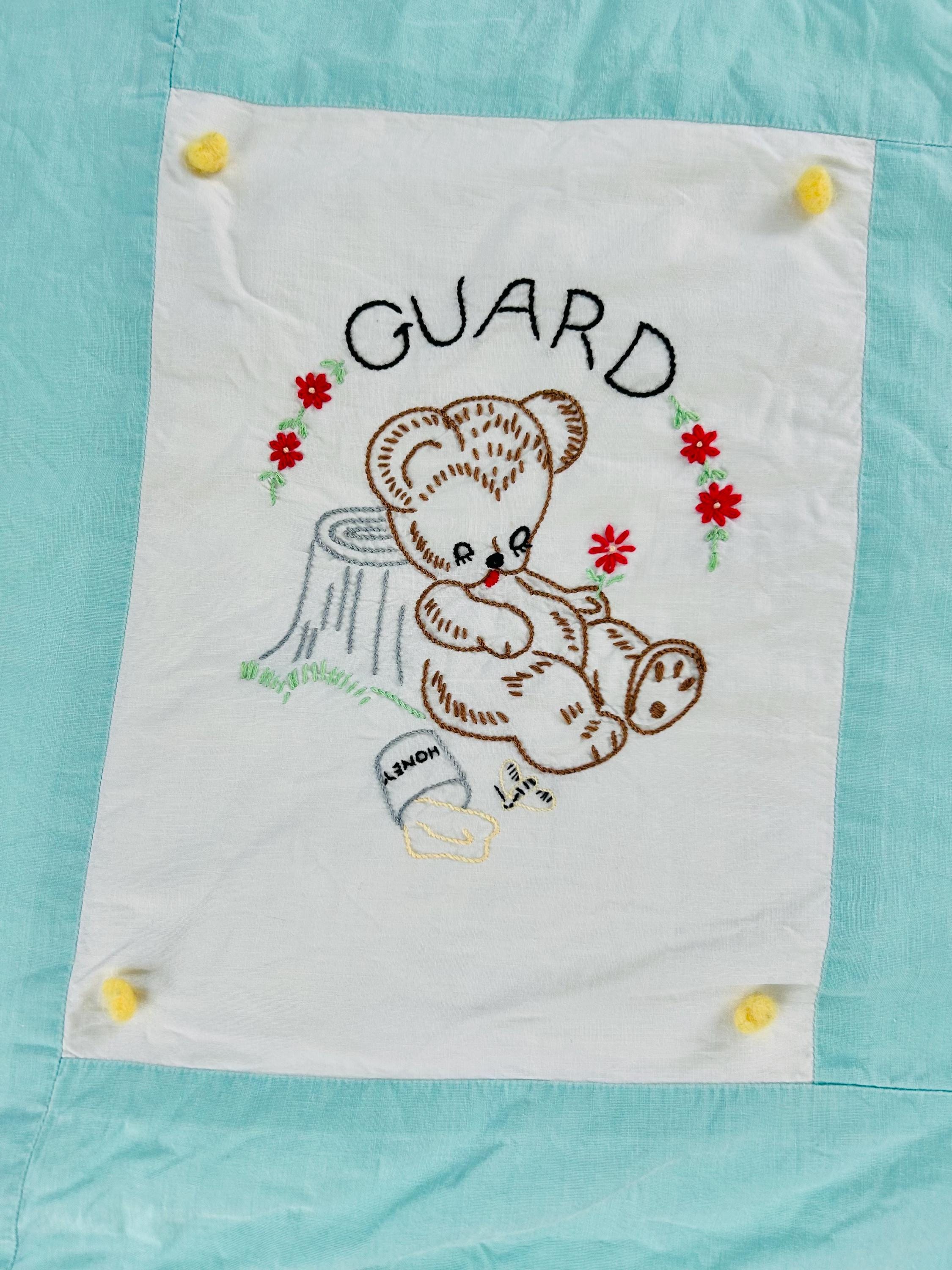 Details • Circa: 1940s • Size: 45” x 40” • Pattern/Theme: “Now I Lay Me Down to Sleep” panels • Technique: Hand embroidered blocks, tied quilt construction • Materials: Cotton fabrics with embroidery floss; yarn ties • Colors: Aqua, white, pastel pink, yellow, blue, brown, red, green • Batting: Lightweight batting
