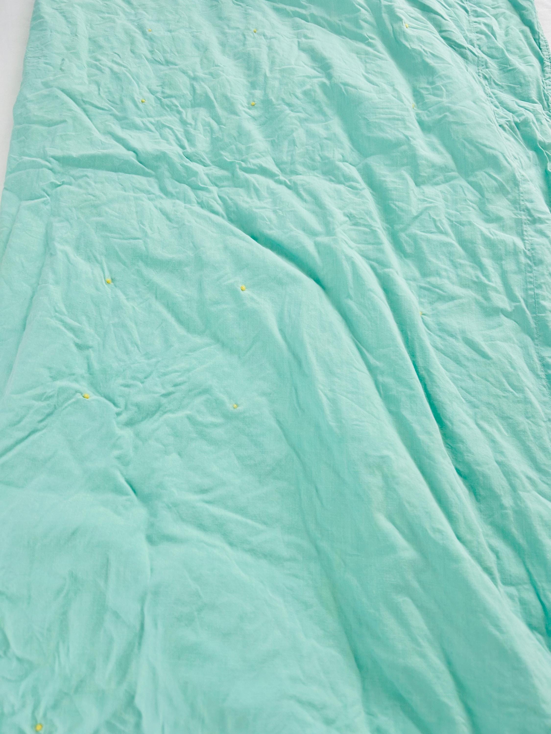 The back is aqua cotton as is the binding that has been machine-stitched to both sides. The batting is lightweight.