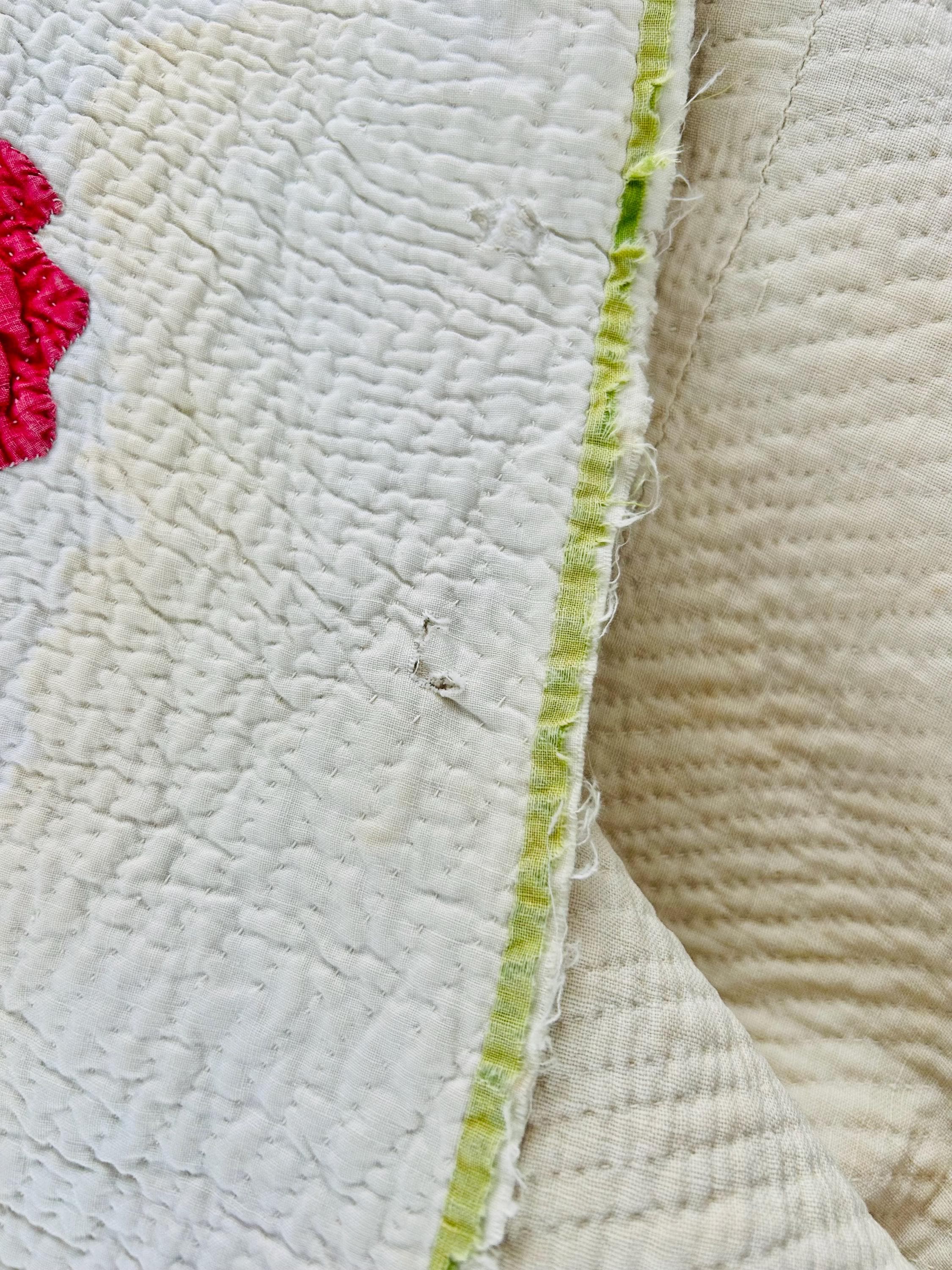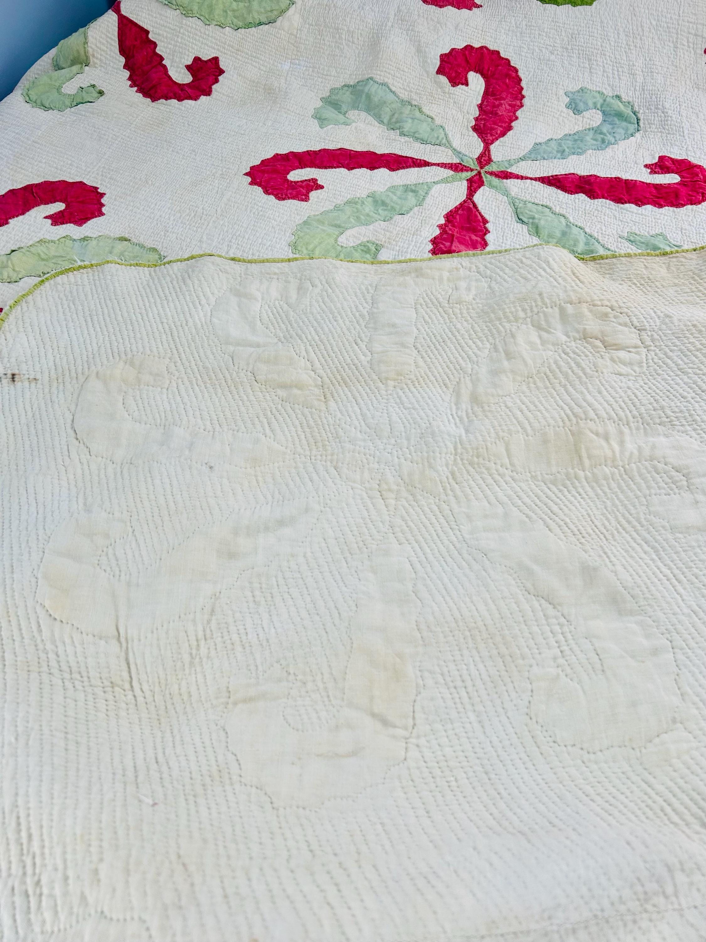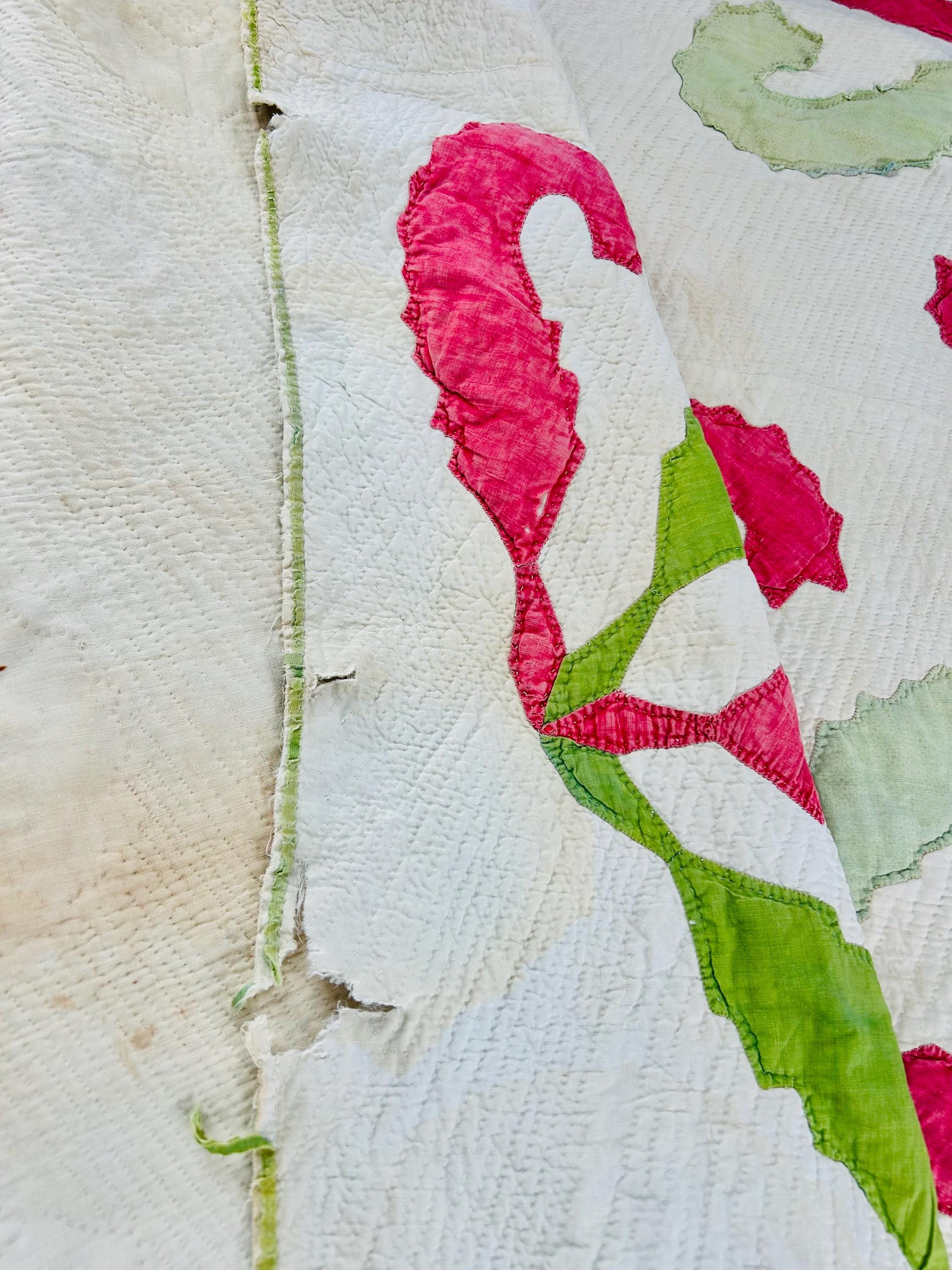 Unfortunately, the quilt has endured some harsh storage conditions and has some tears along the outer edge (see photos), age-related toning, some minor fabric loss in the appliqued feathers and a frayed binding (see photos). • Fabric Loss: There is "shattering" (wear/holes) in the red applique plumes and some green sections, likely due to the mineral content of the original 19th-century dyes. • Staining: While clean, some persistent "ghost" and age spots remain from its time in storage. • Integrity: The stipple quilting has kept the batting and layers remarkably intact. The binding shows wear consistent with age.