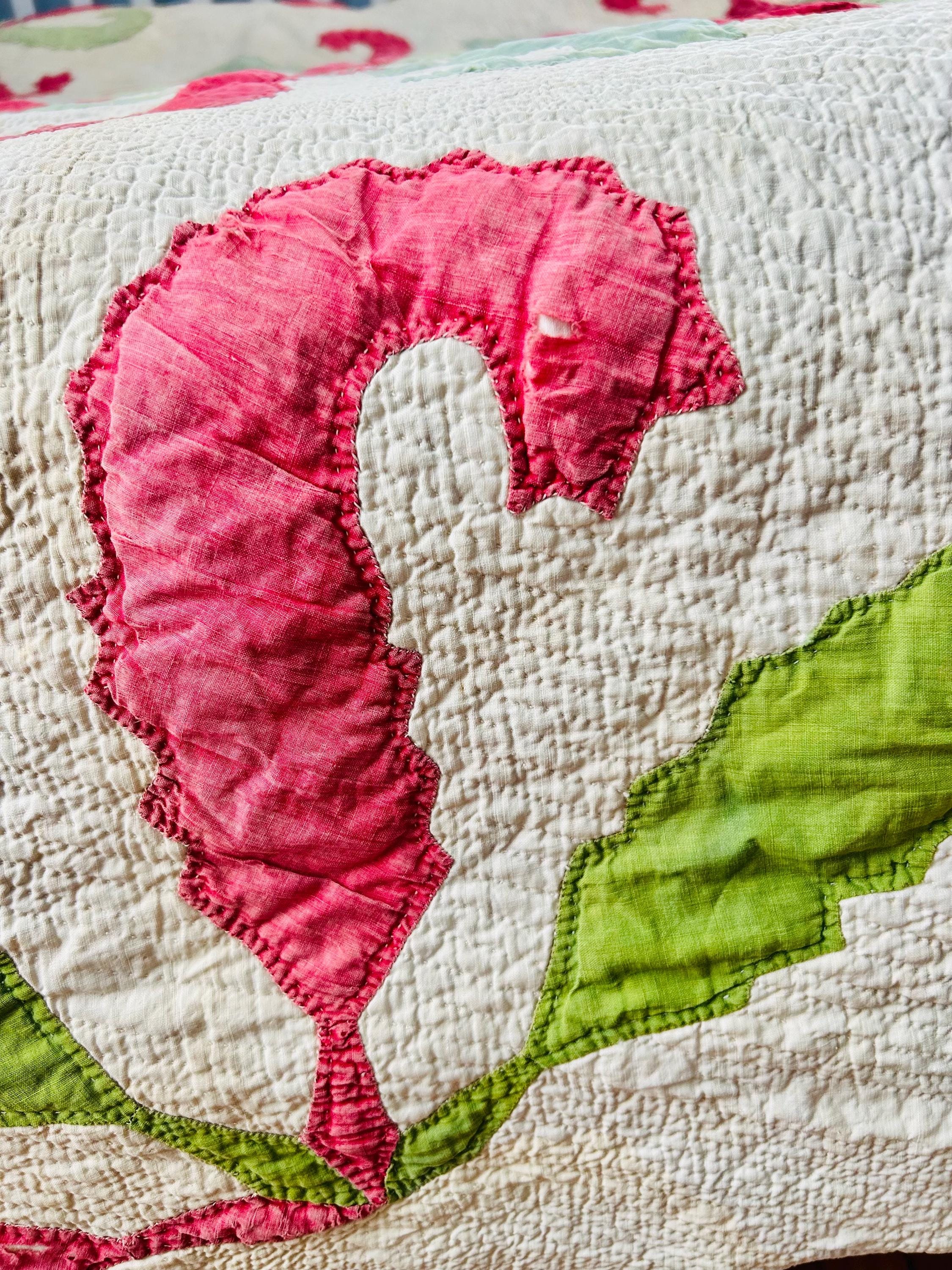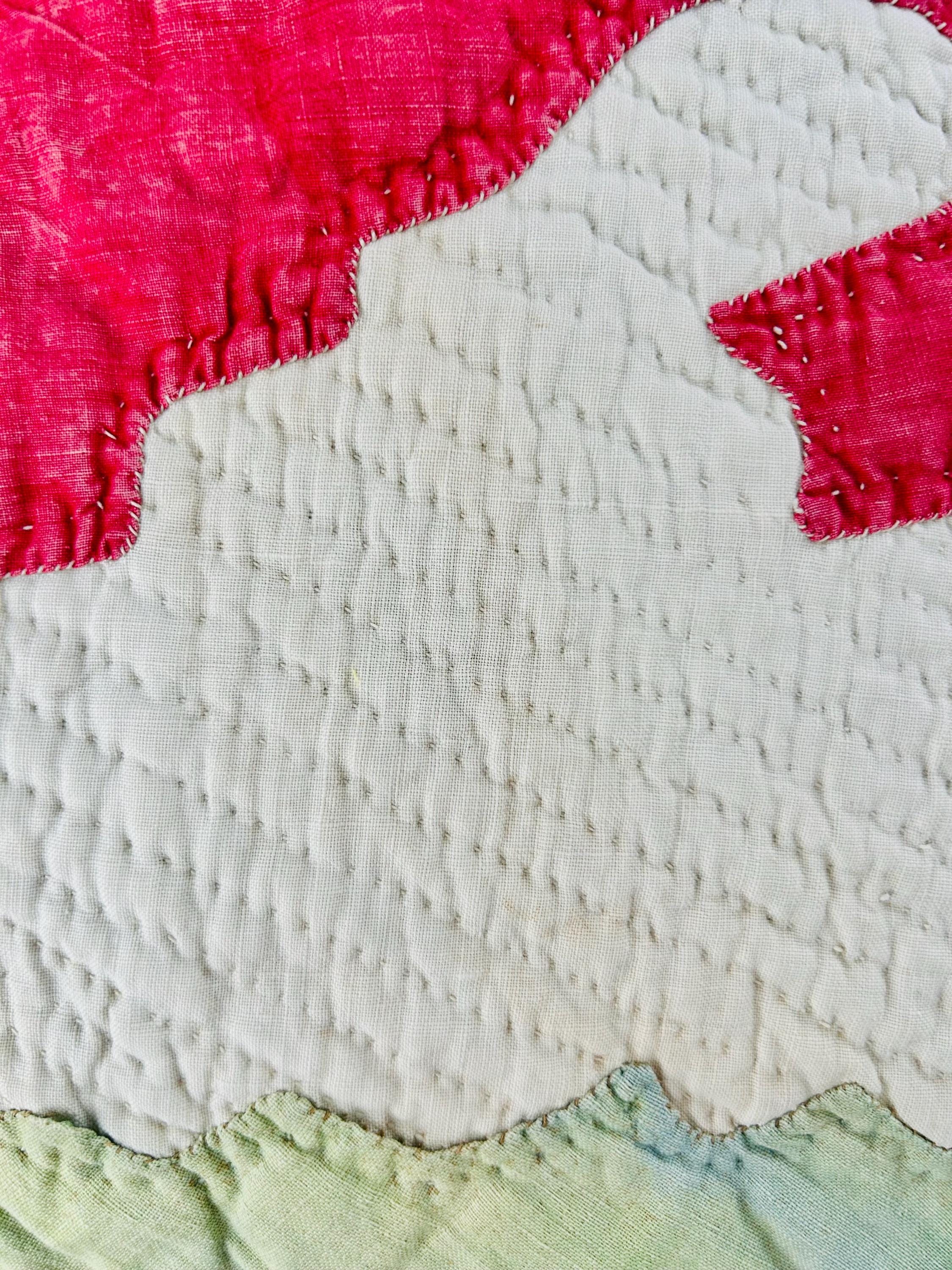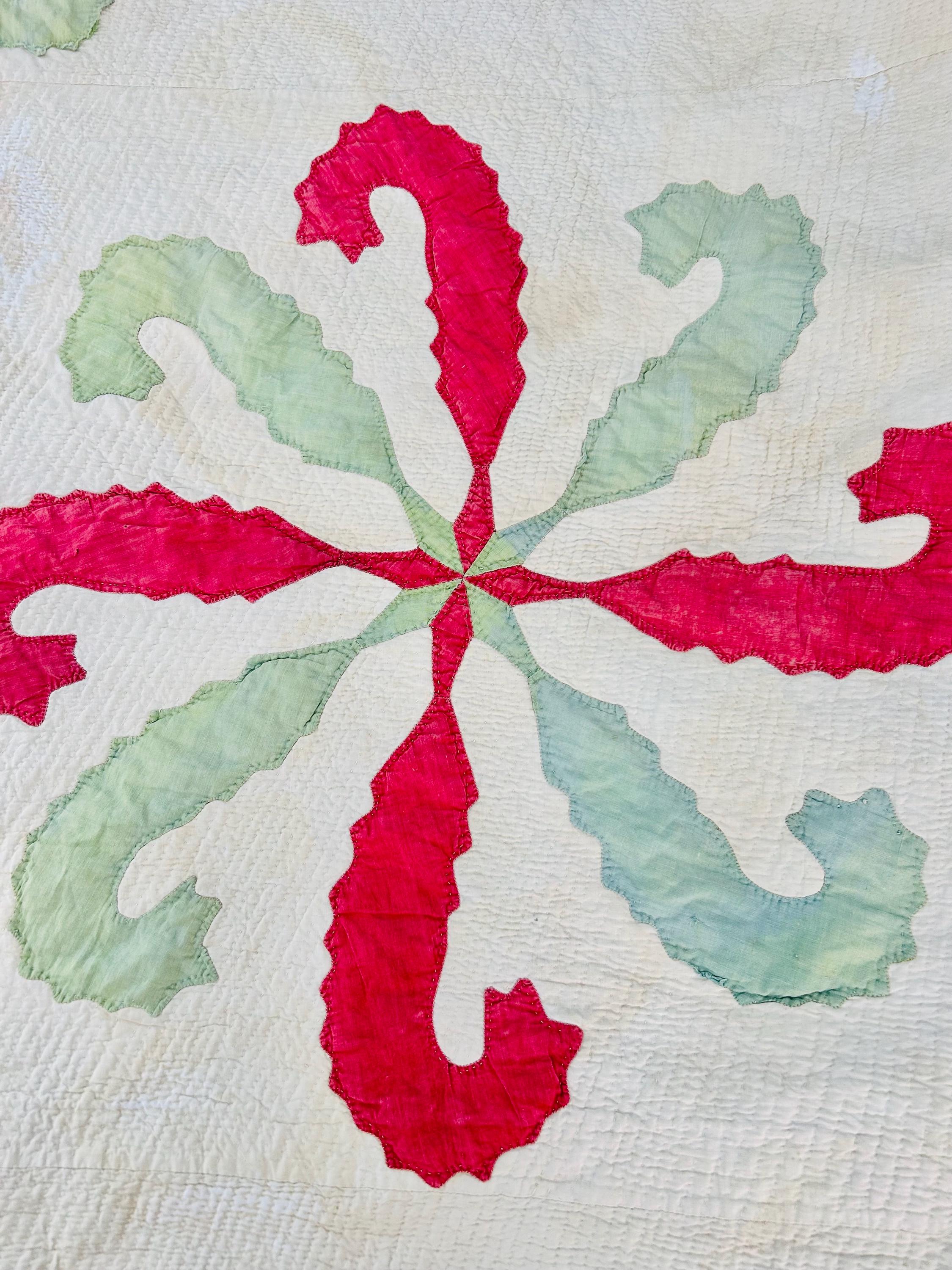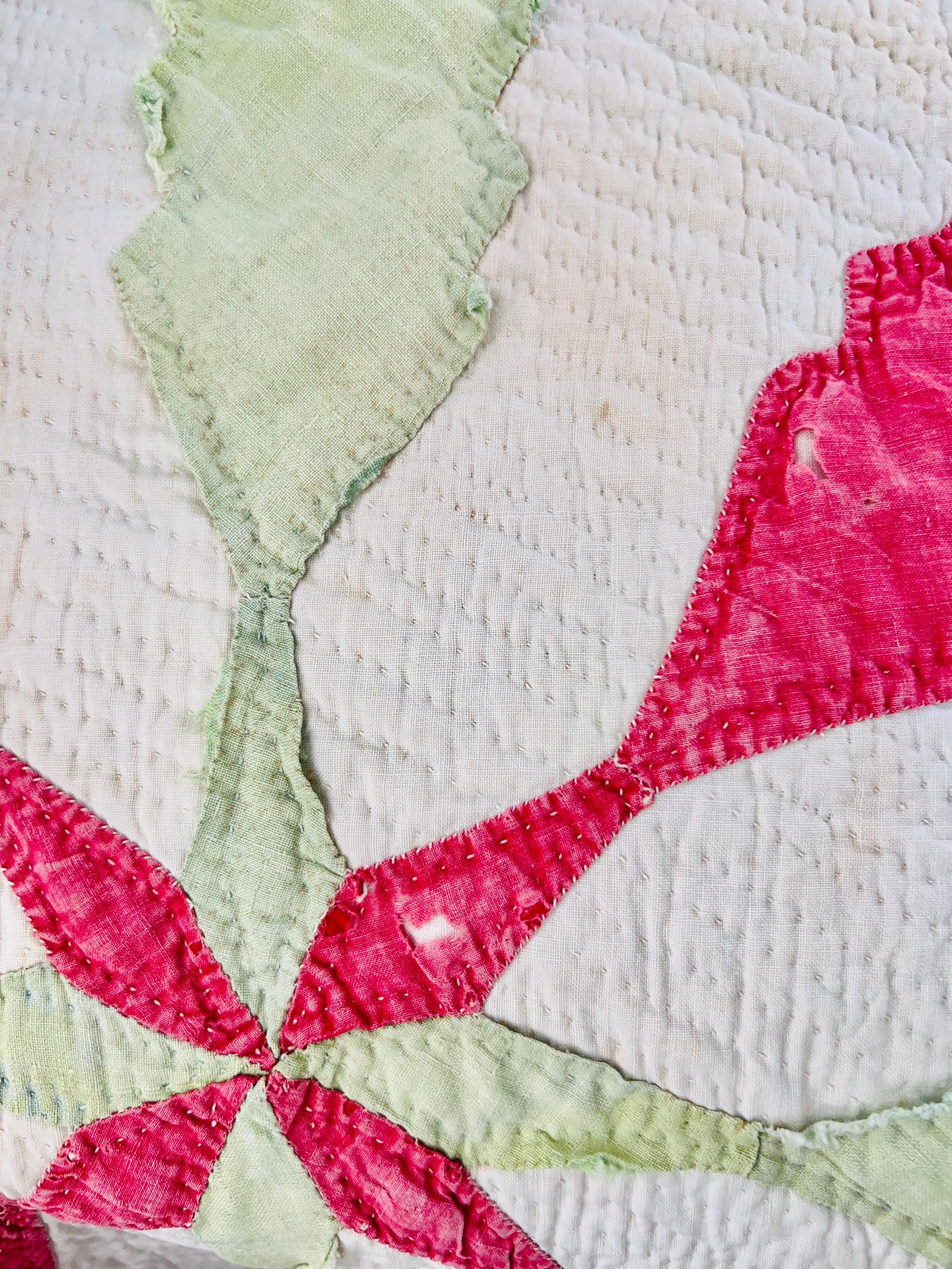 Unfortunately, the quilt has endured some harsh storage conditions and has some tears along the outer edge (see photos), age-related toning, some minor fabric loss in the appliqued feathers and a frayed binding (see photos). • Fabric Loss: There is "shattering" (wear/holes) in the red applique plumes and some green sections, likely due to the mineral content of the original 19th-century dyes. • Staining: While clean, some persistent "ghost" and age spots remain from its time in storage. • Integrity: The stipple quilting has kept the batting and layers remarkably intact. The binding shows wear consistent with age.