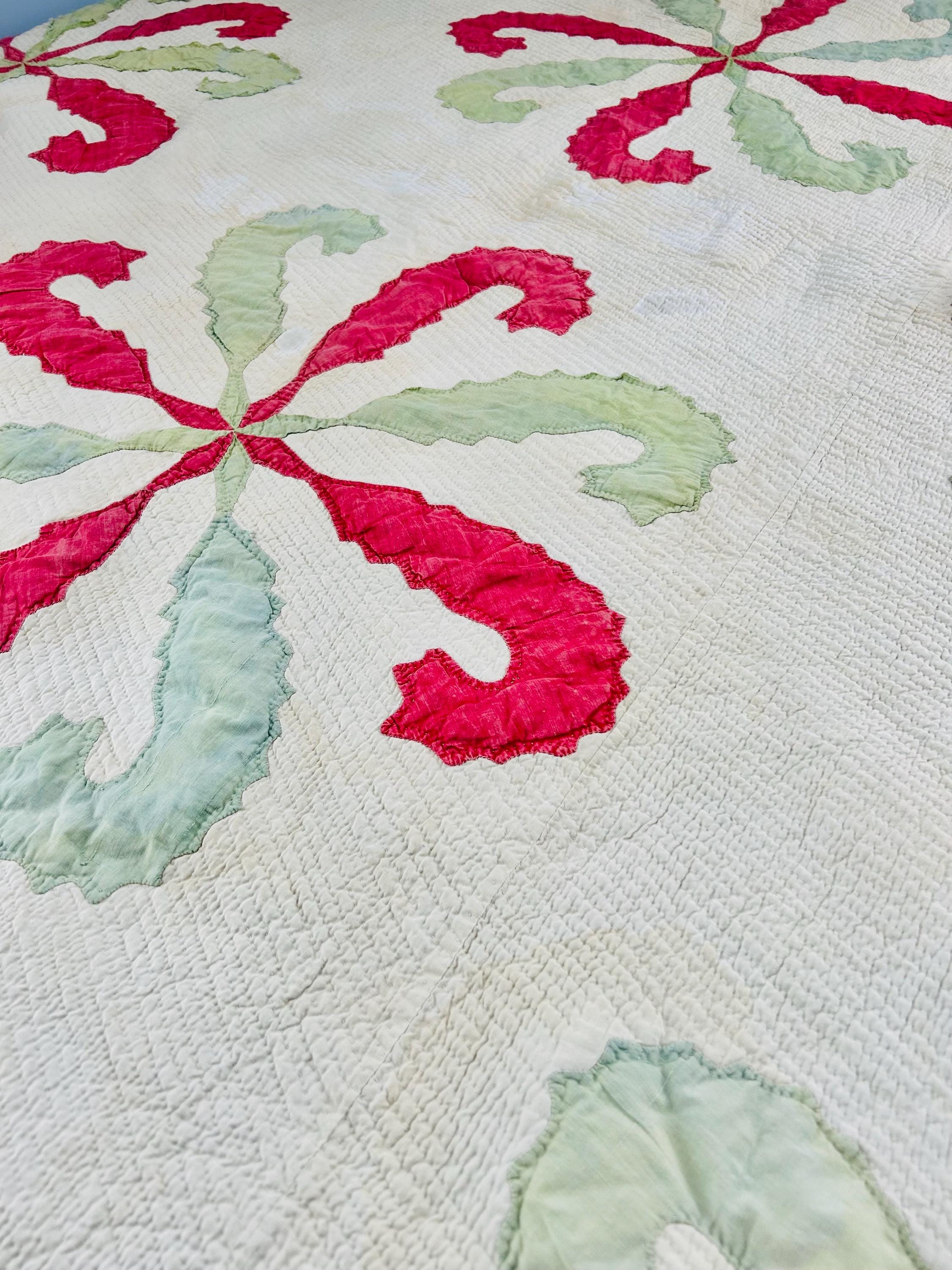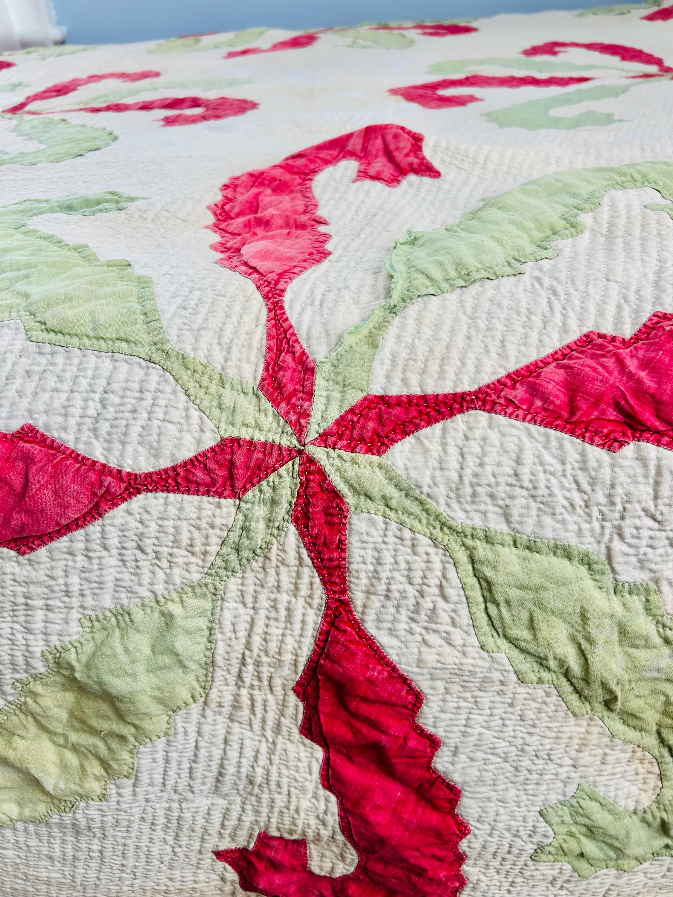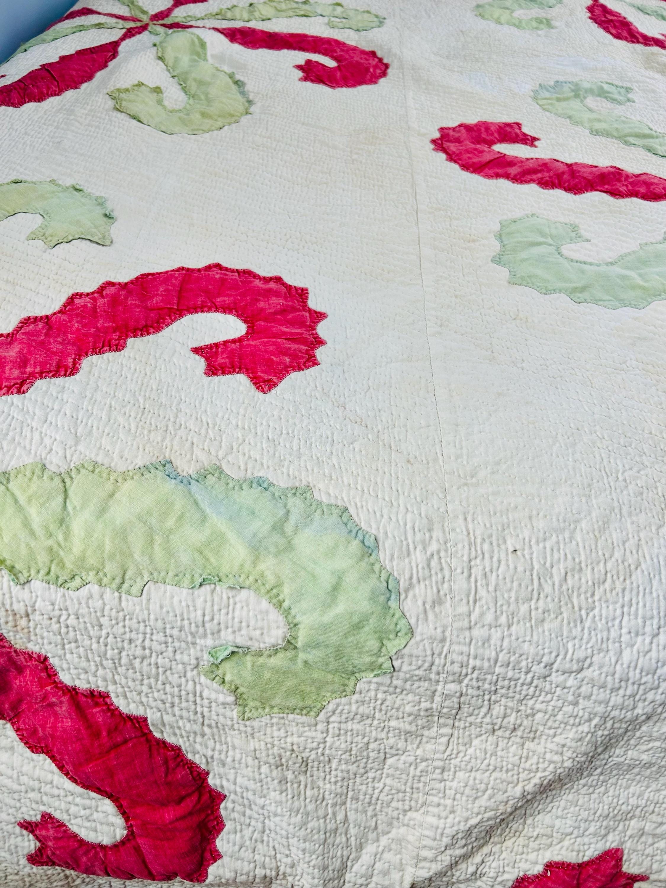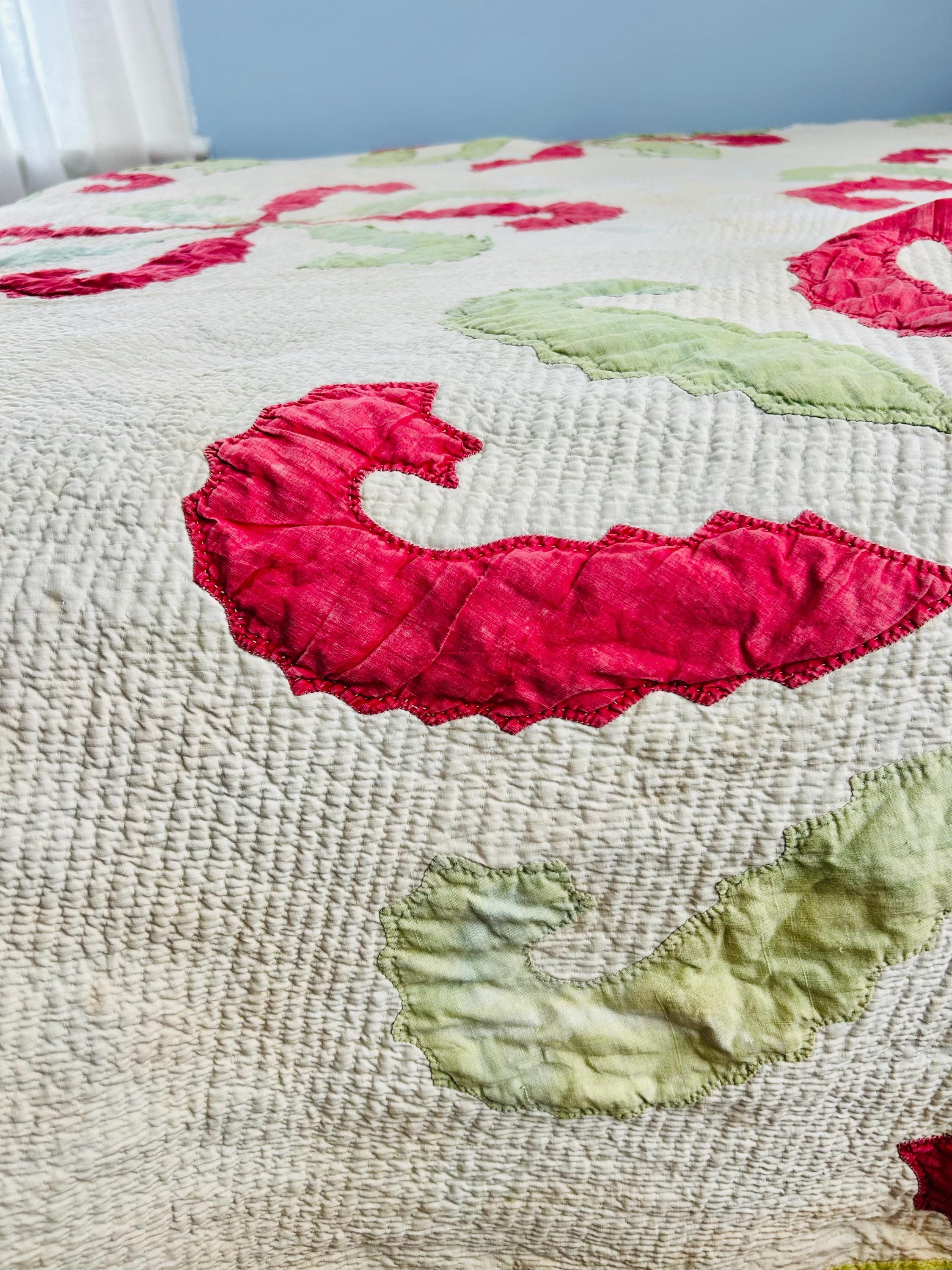 Details: • Circa: 1850–1875 (Antebellum/Civil War Era). • Dyes: Features authentic Turkey Red (notably colorfast) and Overdye Green. You can see the characteristic "blue-to-yellow" fade in the green plumes, a hallmark of 19th-century botanical dyes. • Construction: The white background fabric features a central hand-sewn seam, indicating it was made before the wide availability of double-width loom fabrics. • Size: An impressive 82" x 96"—designed for the high-post grand beds of the Victorian era.