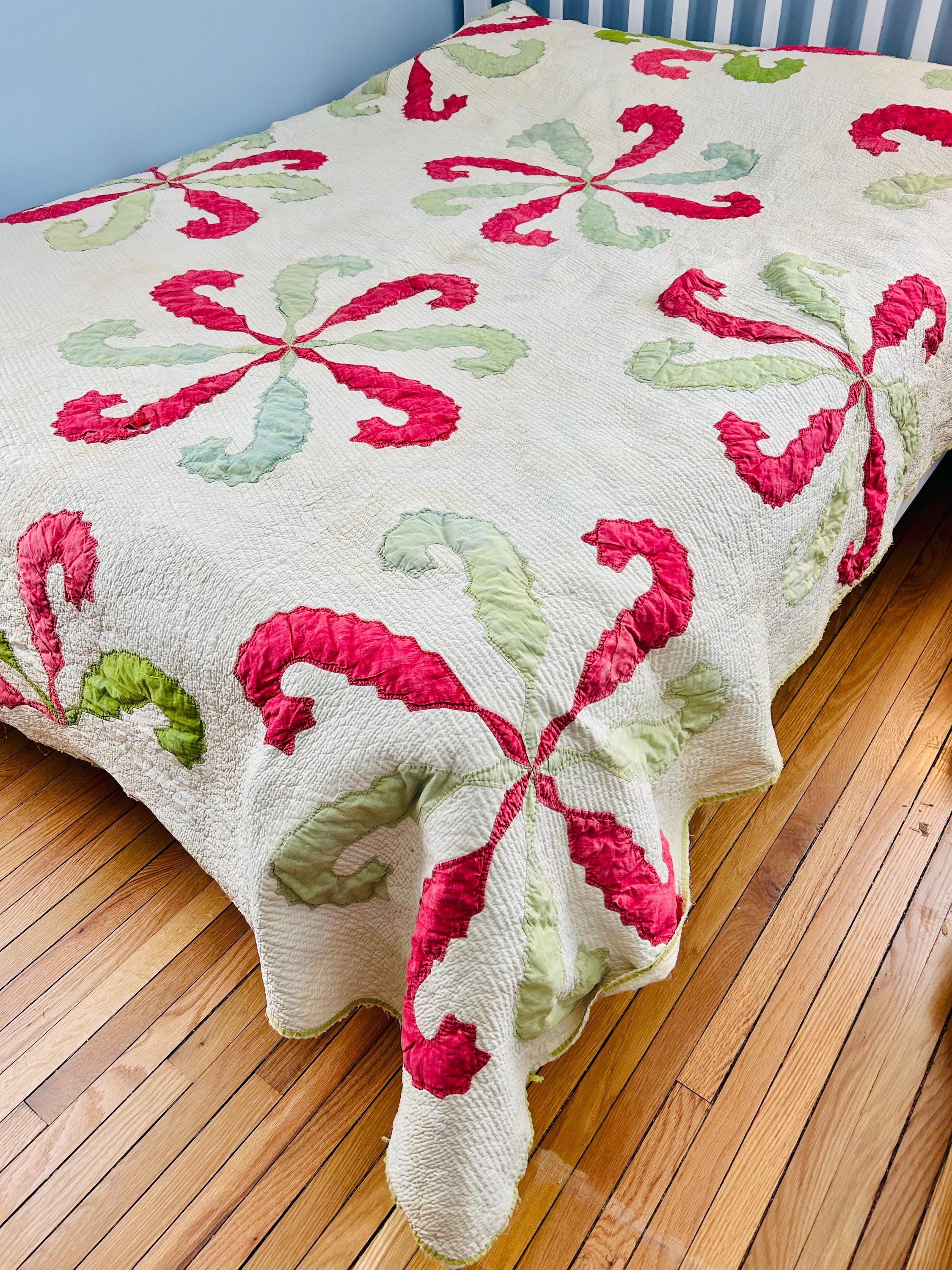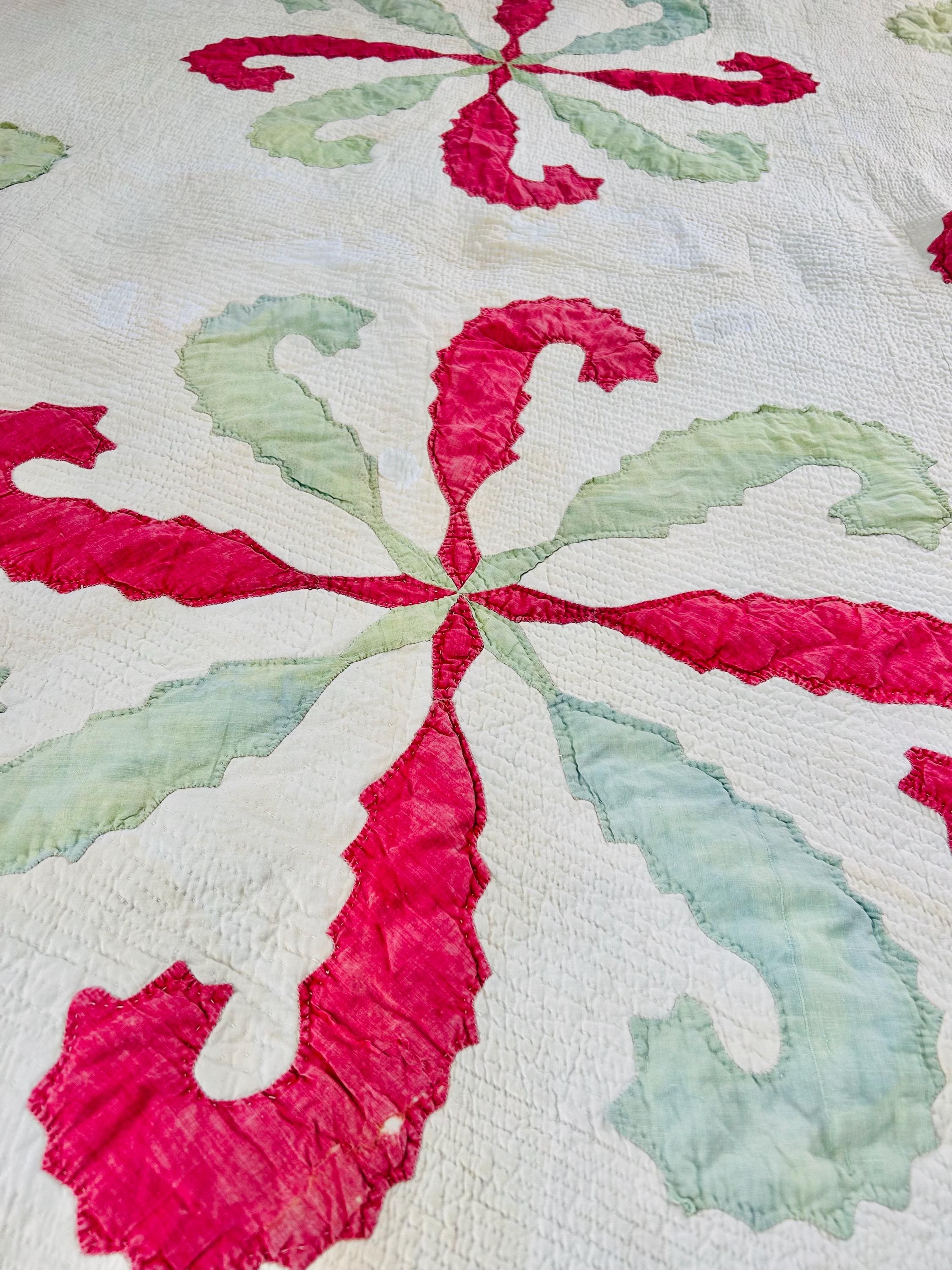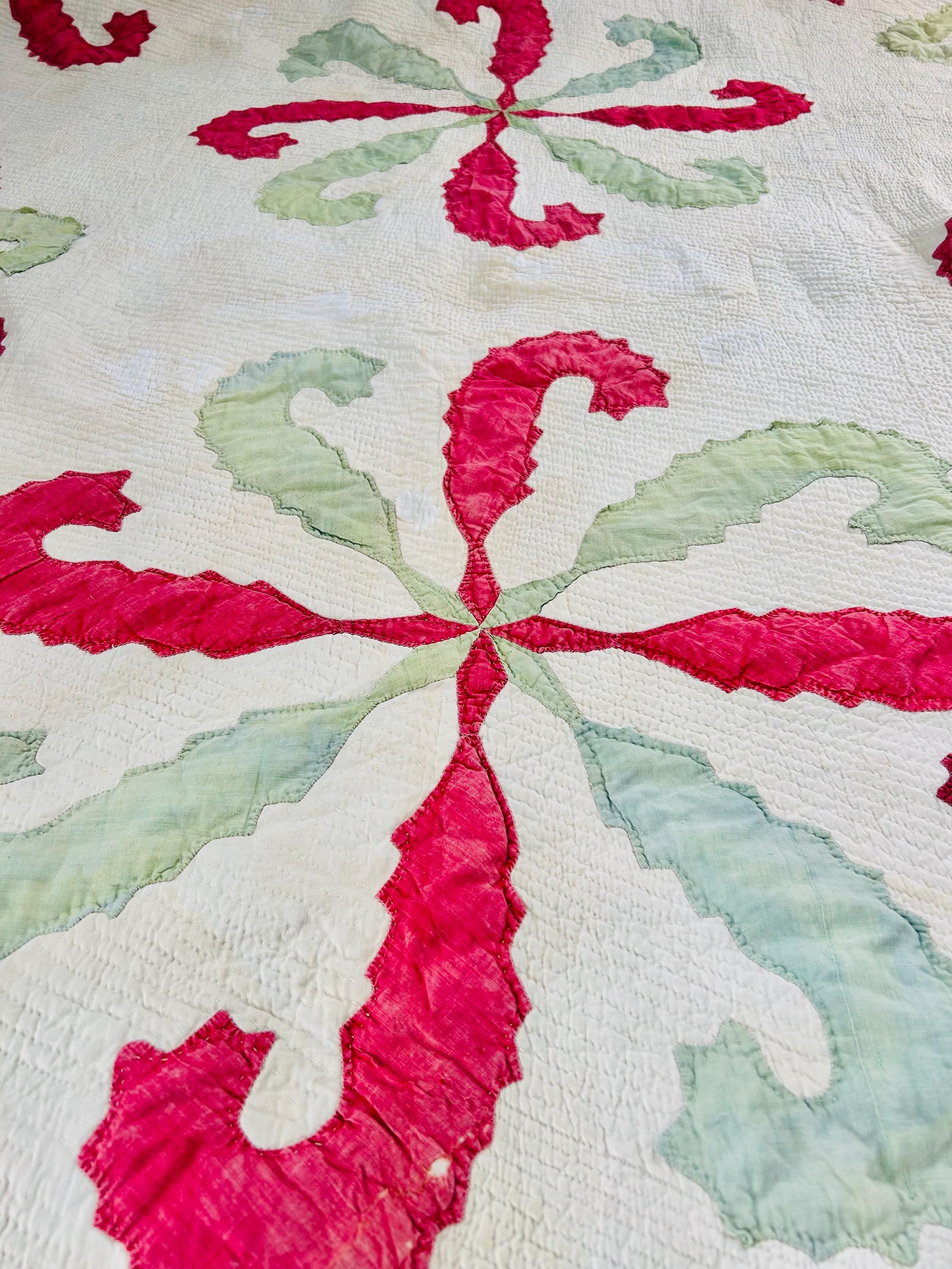 Details: • Circa: 1850–1875 (Antebellum/Civil War Era). • Dyes: Features authentic Turkey Red (notably colorfast) and Overdye Green. You can see the characteristic "blue-to-yellow" fade in the green plumes, a hallmark of 19th-century botanical dyes. • Construction: The white background fabric features a central hand-sewn seam, indicating it was made before the wide availability of double-width loom fabrics. • Size: An impressive 82" x 96"—designed for the high-post grand beds of the Victorian era.