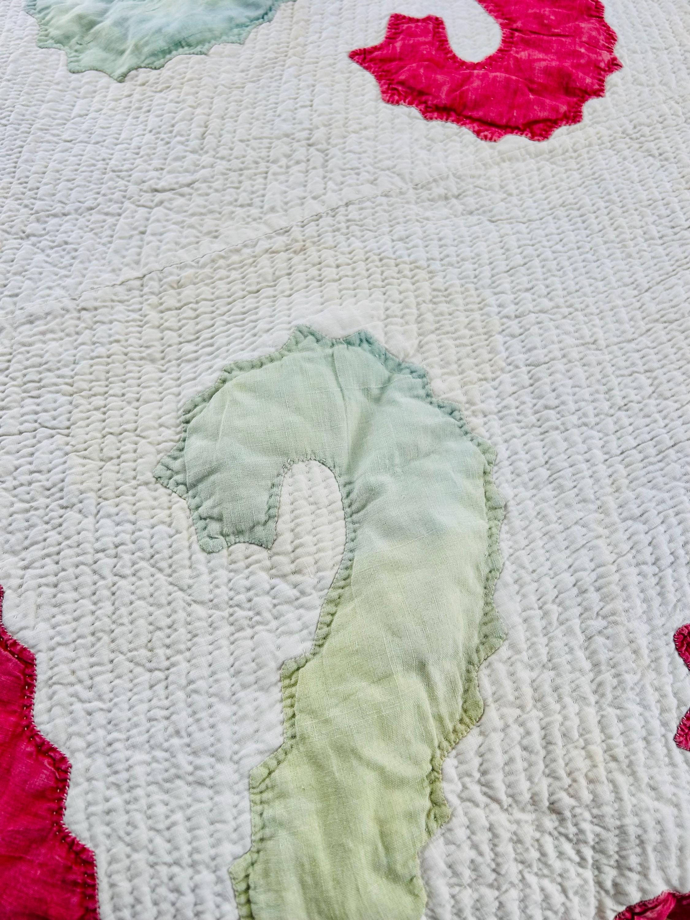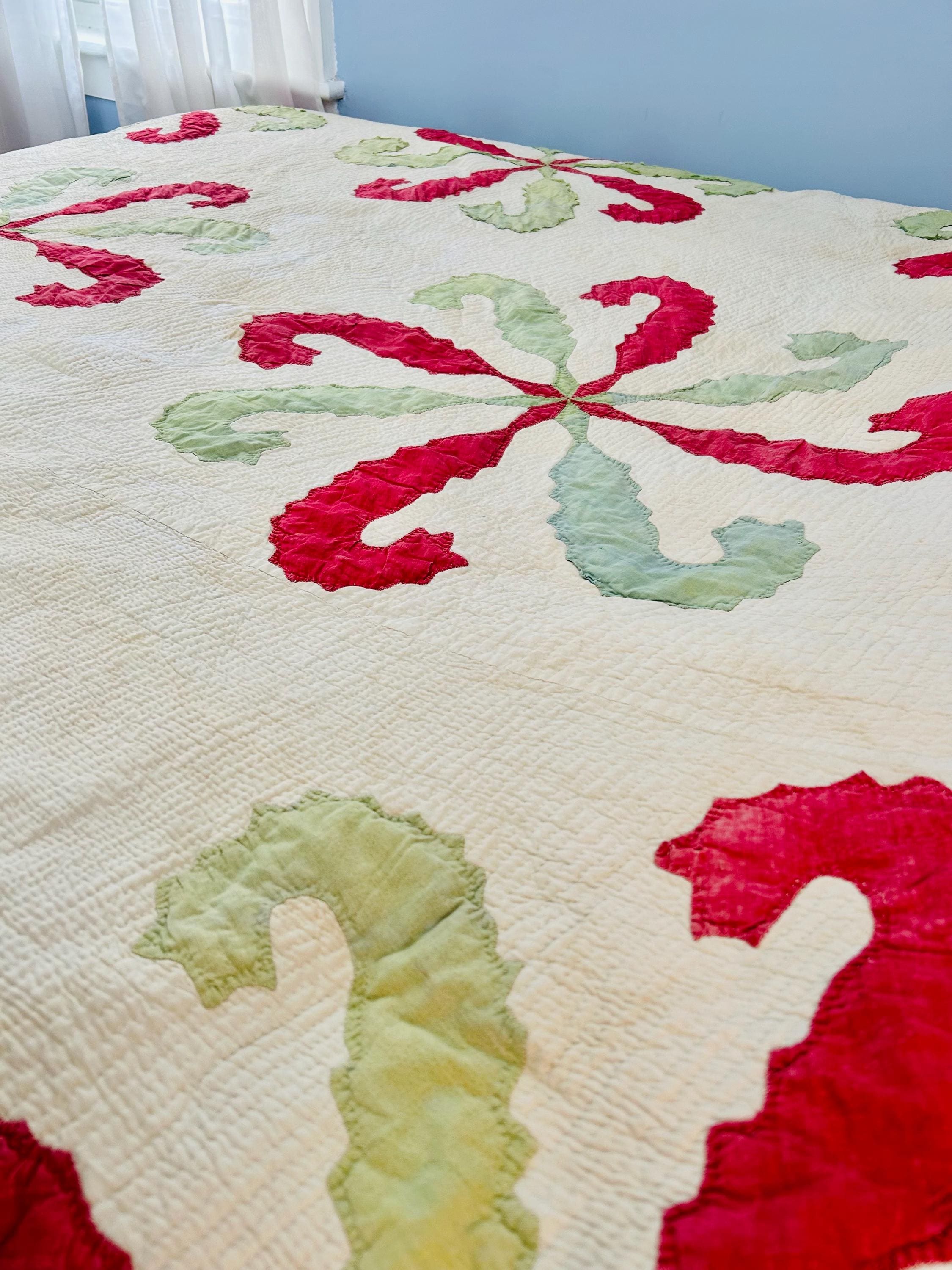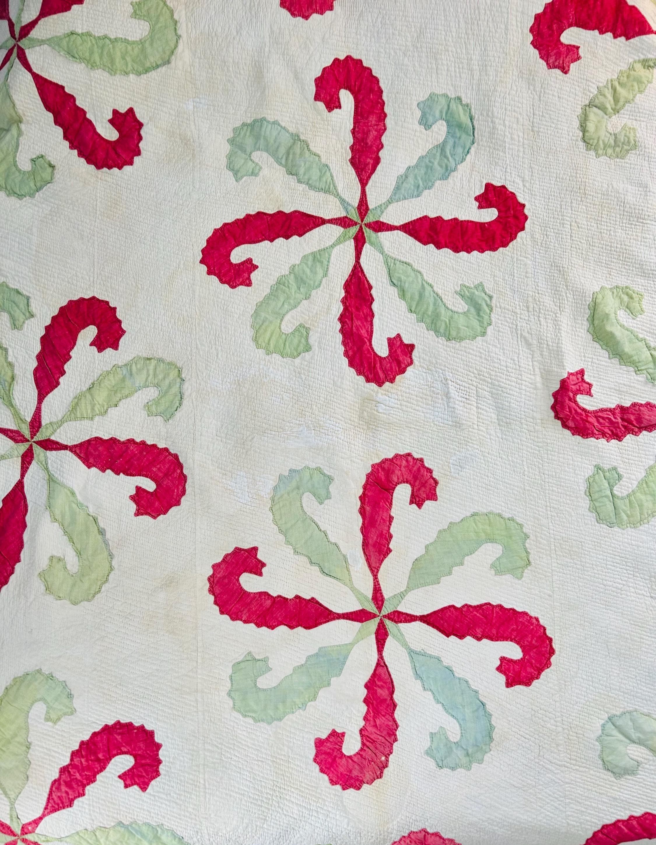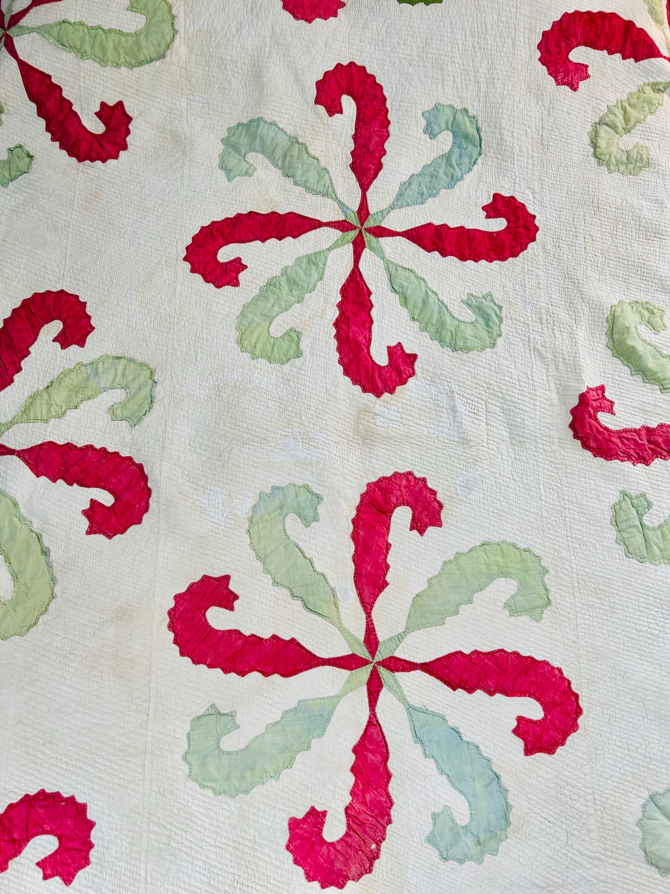 Details: • Circa: 1850–1875 (Antebellum/Civil War Era). • Dyes: Features authentic Turkey Red (notably colorfast) and Overdye Green. You can see the characteristic "blue-to-yellow" fade in the green plumes, a hallmark of 19th-century botanical dyes. • Construction: The white background fabric features a central hand-sewn seam, indicating it was made before the wide availability of double-width loom fabrics. • Size: An impressive 82" x 96"—designed for the high-post grand beds of the Victorian era.