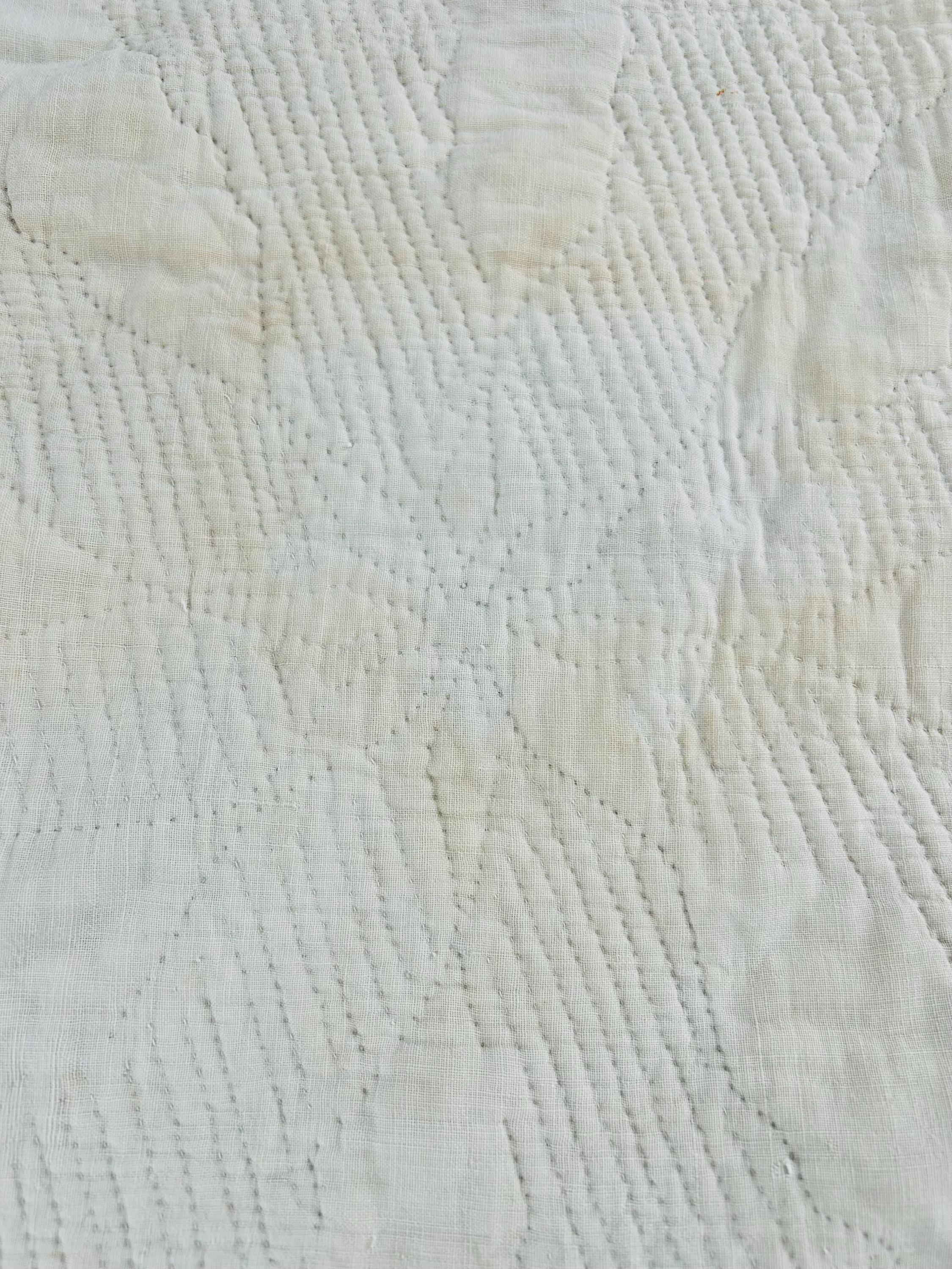 The back is white/cream cotton while the binding is green cotton that has been hand-stitched to both sides. The cotton batting is very lightweight.
